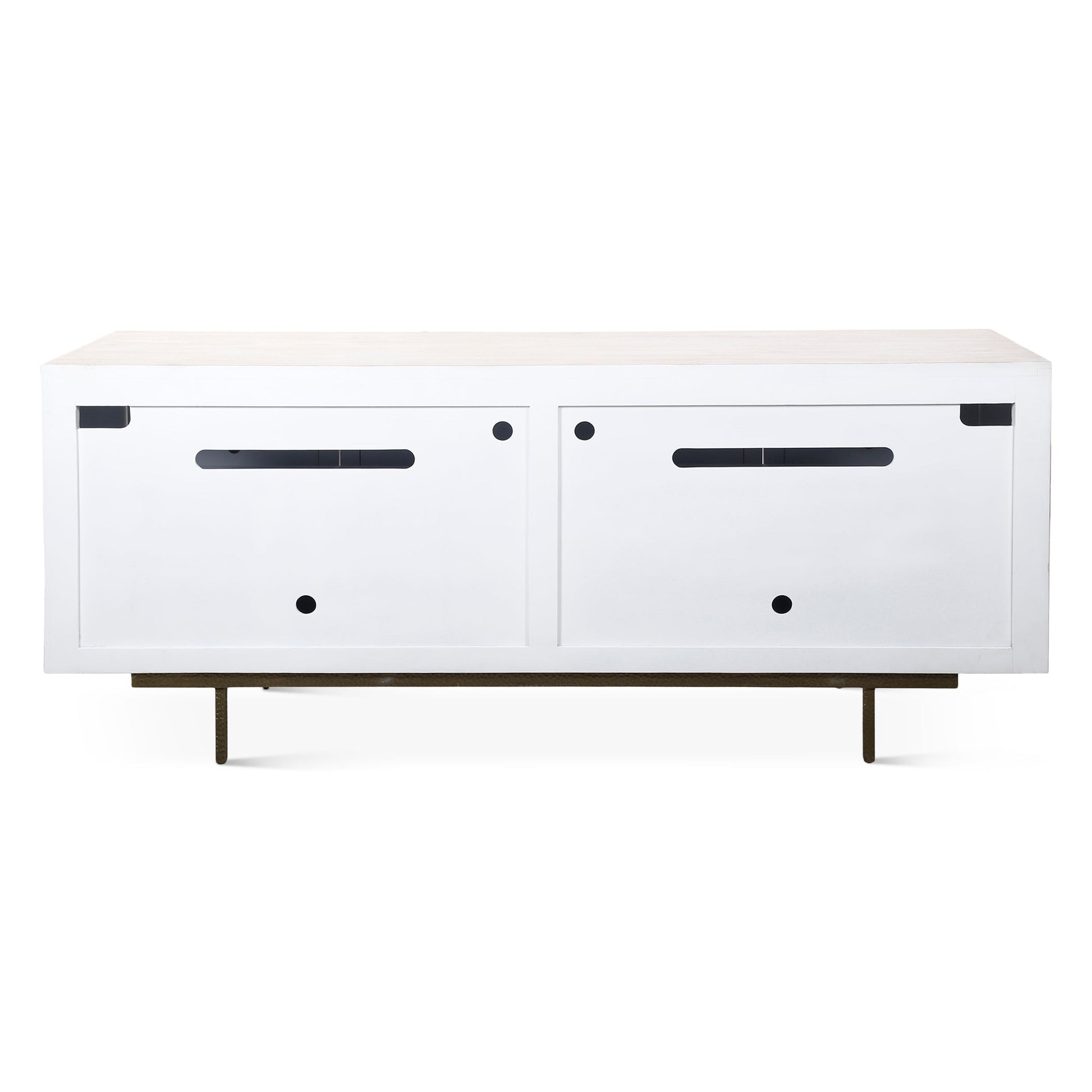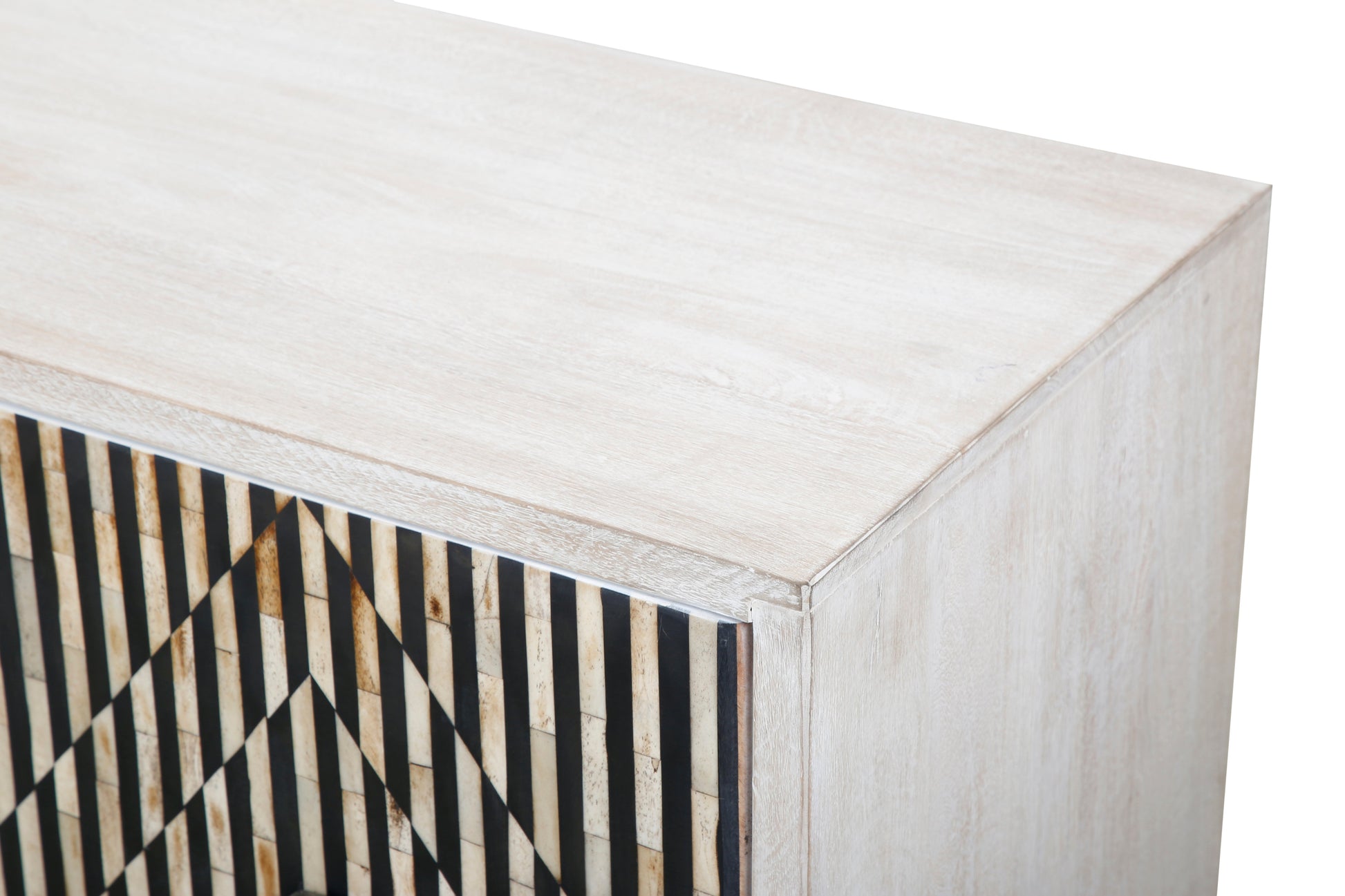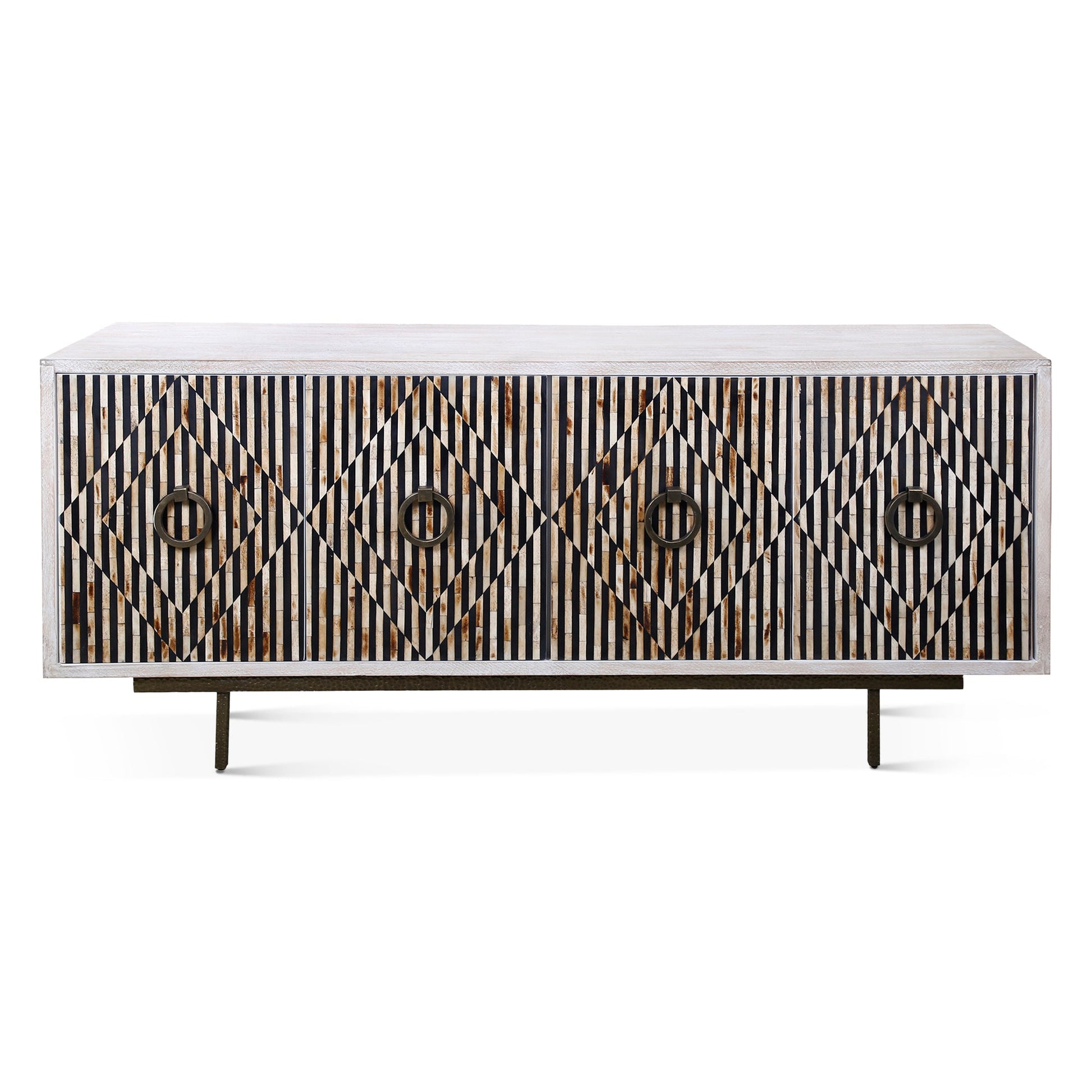 This sideboard blends natural artistry with bold geometric design. Crafted from solid mango wood in a soft whitewash finish, it features a stunning front pattern of natural horn and wood inlay arranged in zebra-like stripes with subtle diamond motifs. The sleek black metal base adds modern balance and durability, while four doors open to generous concealed storage. Perfect for statement interiors, it brings texture, contrast, and refined craftsmanship to any space.