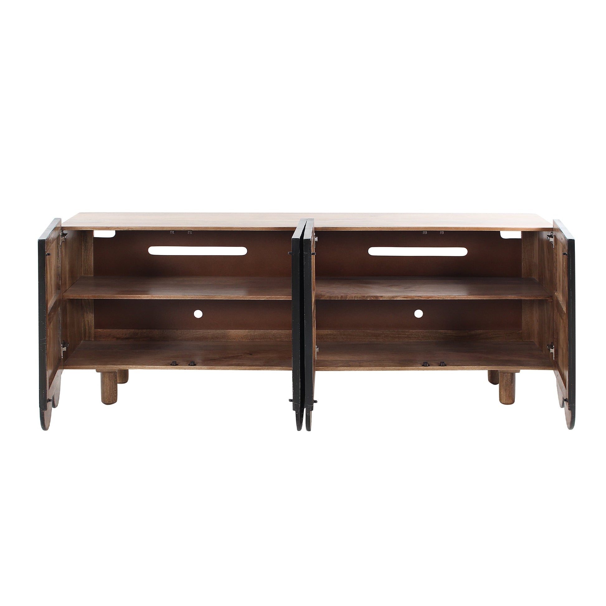 This sideboard captures sculptural elegance through texture and craftsmanship. Handcrafted from solid sustainable mango wood, it features four doors carved in a rhythmic wave pattern that brings depth and movement to its clean, linear form. The blackwash finish enhances the wood’s natural tone, balancing artistry with utility. Perfect for dining rooms, living spaces, or entryways, it offers generous storage and timeless visual appeal.