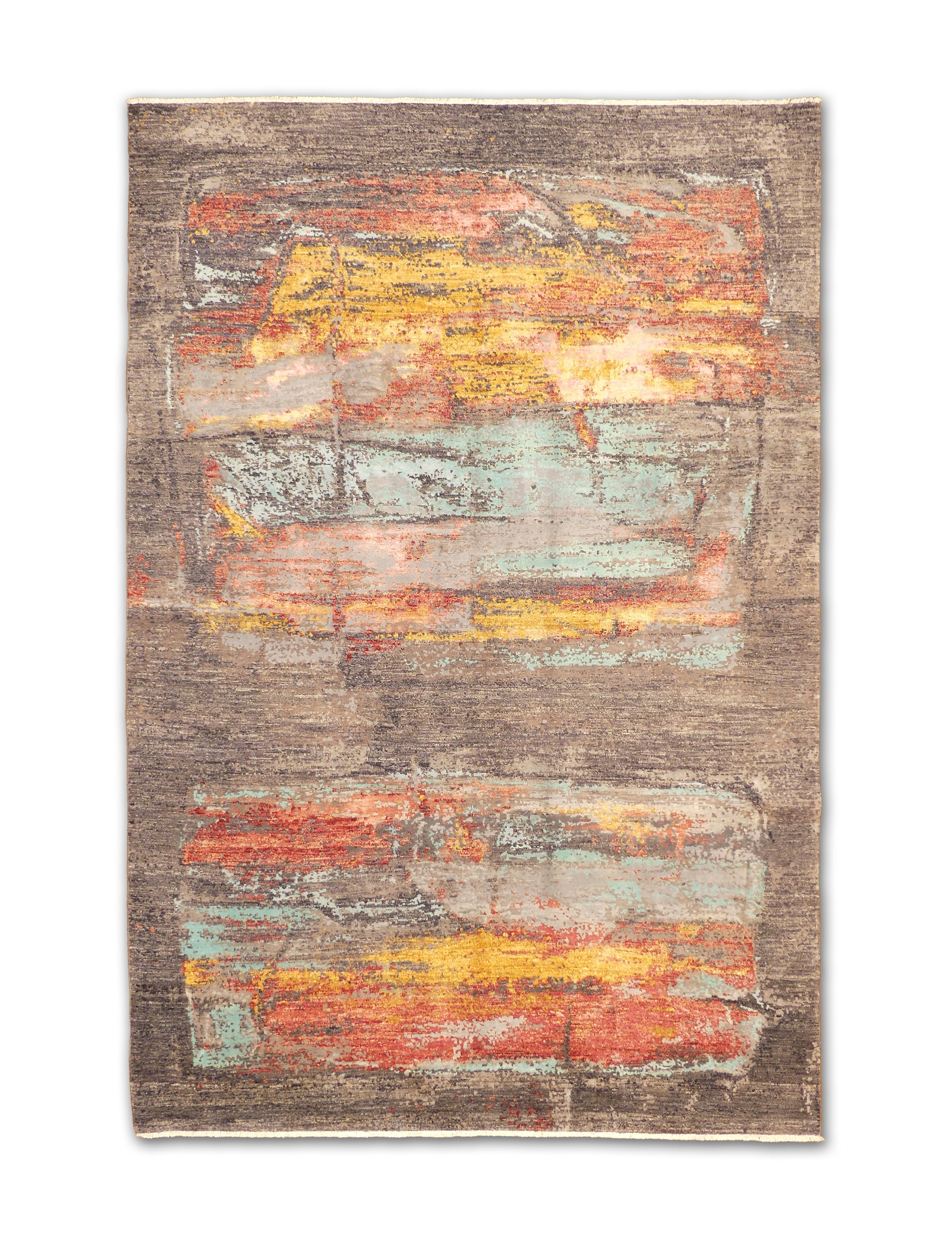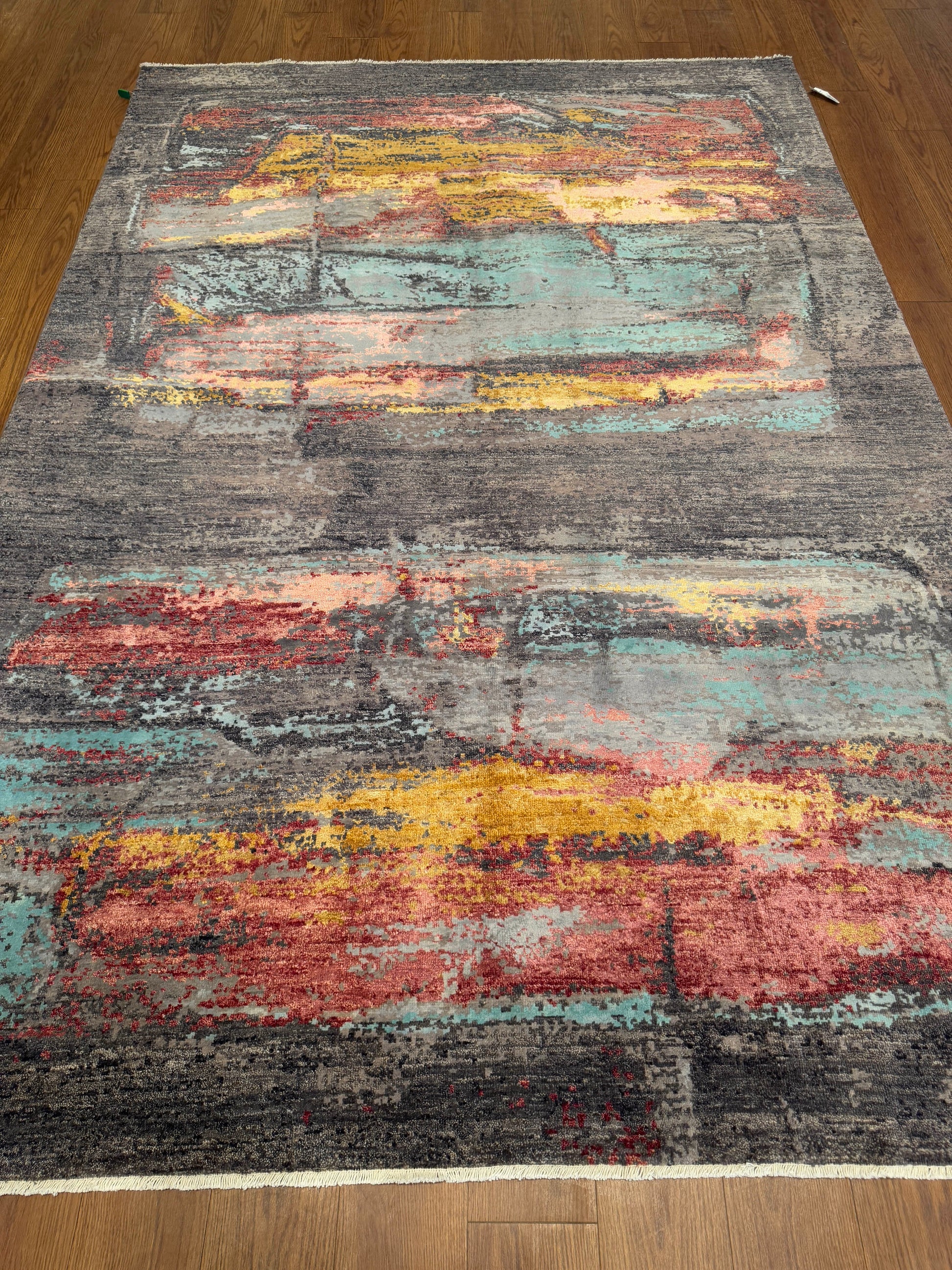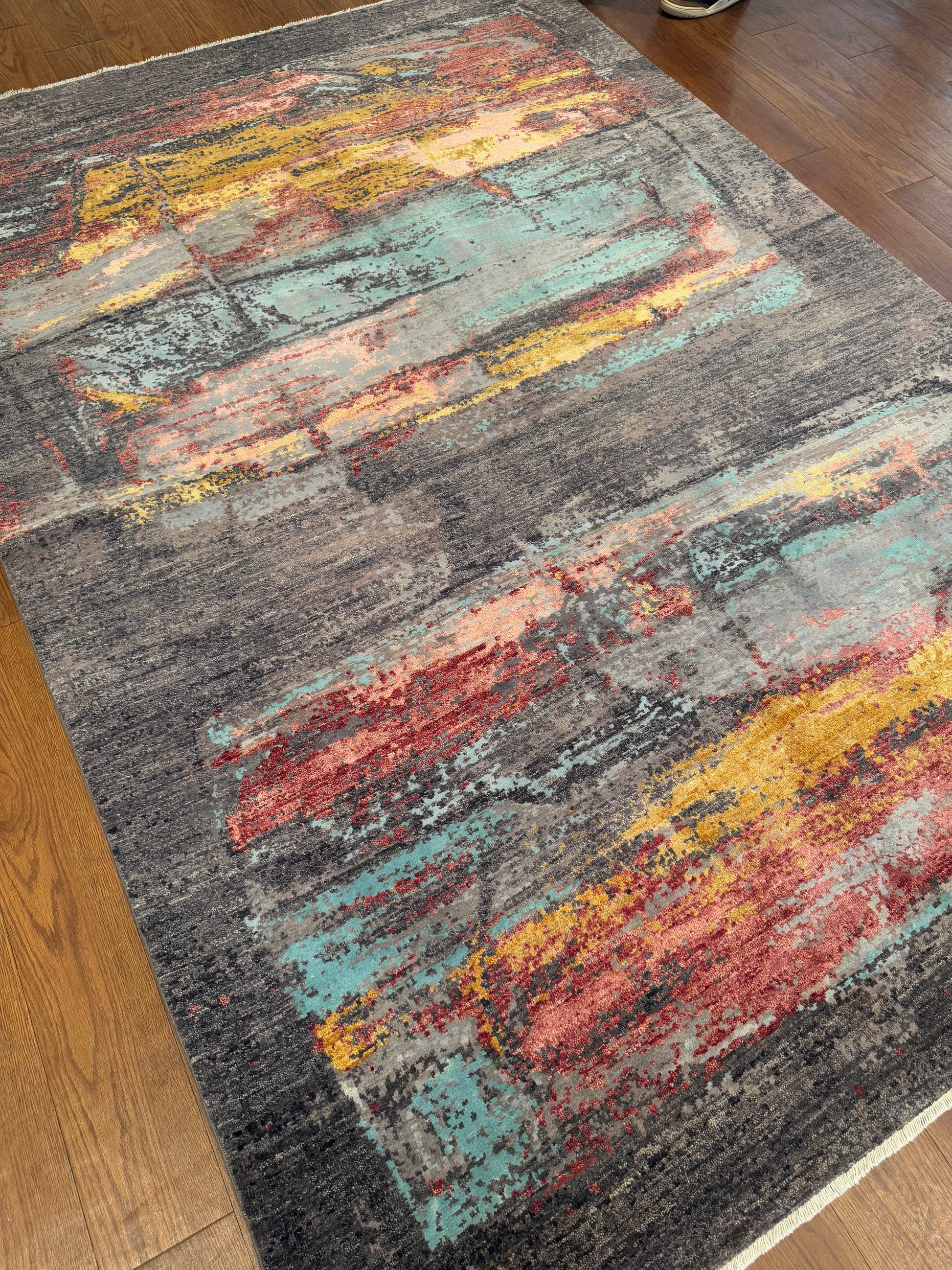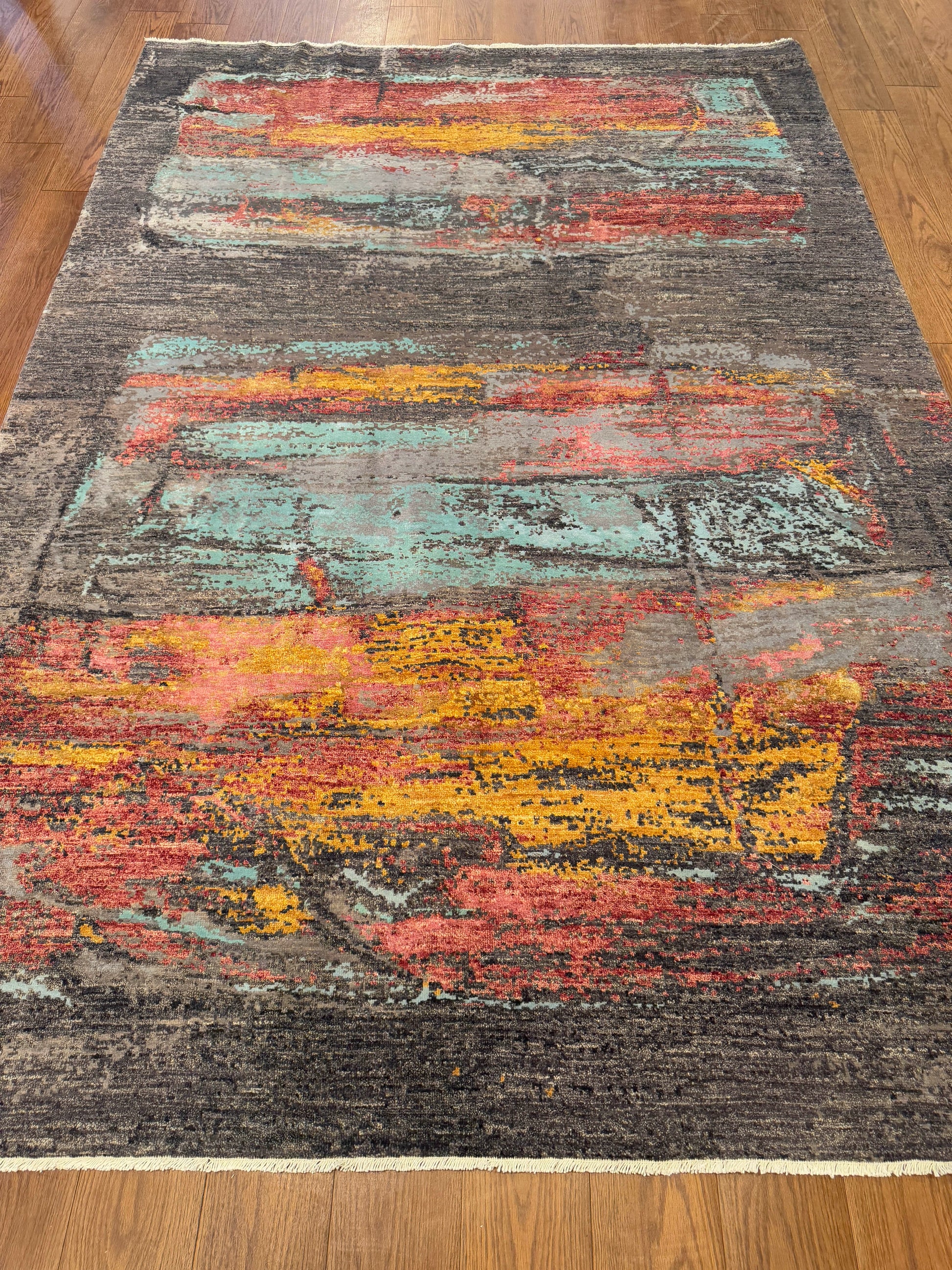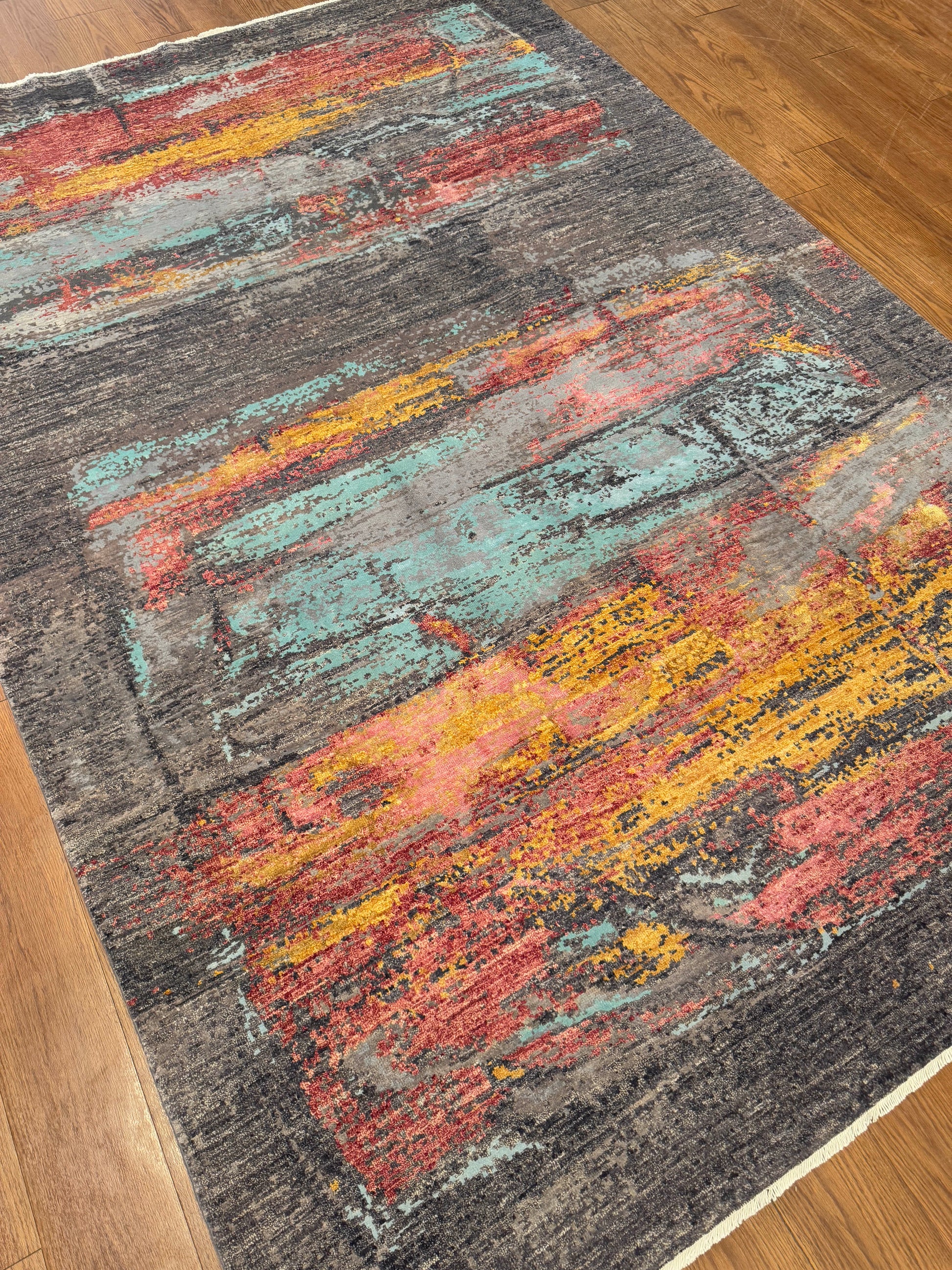 This striking handwoven wool rug embraces a bold, contemporary aesthetic. The deep gray field is energized by vibrant strokes of gold, red, teal, and coral, creating a dynamic abstract composition. A true statement piece, it infuses modern artistry and texture into any space, blending sophistication with expressive color.