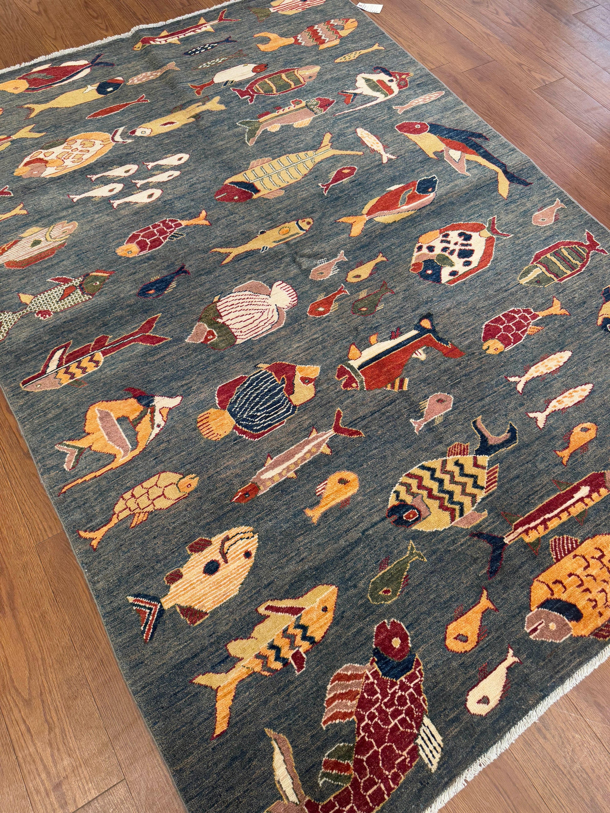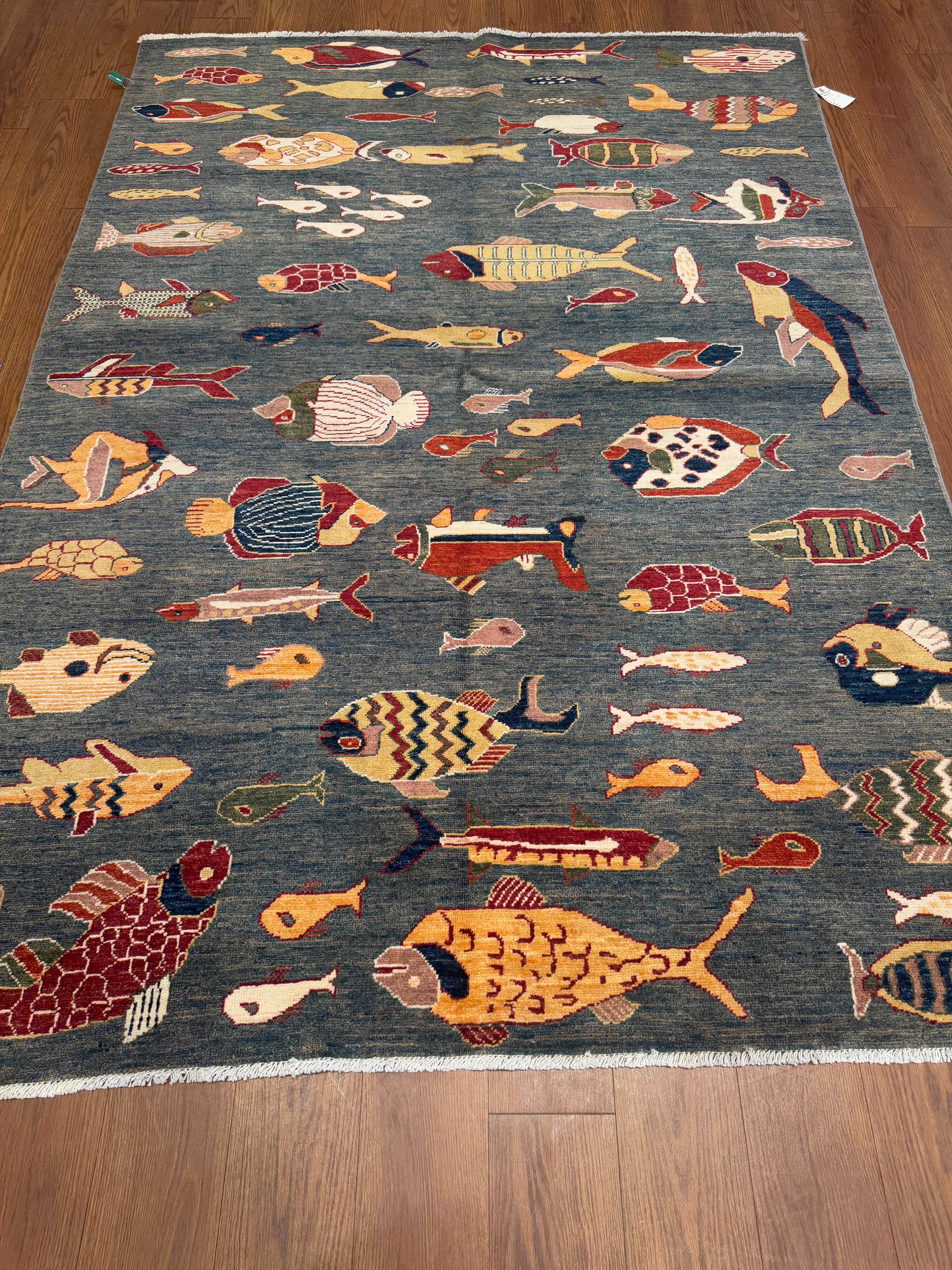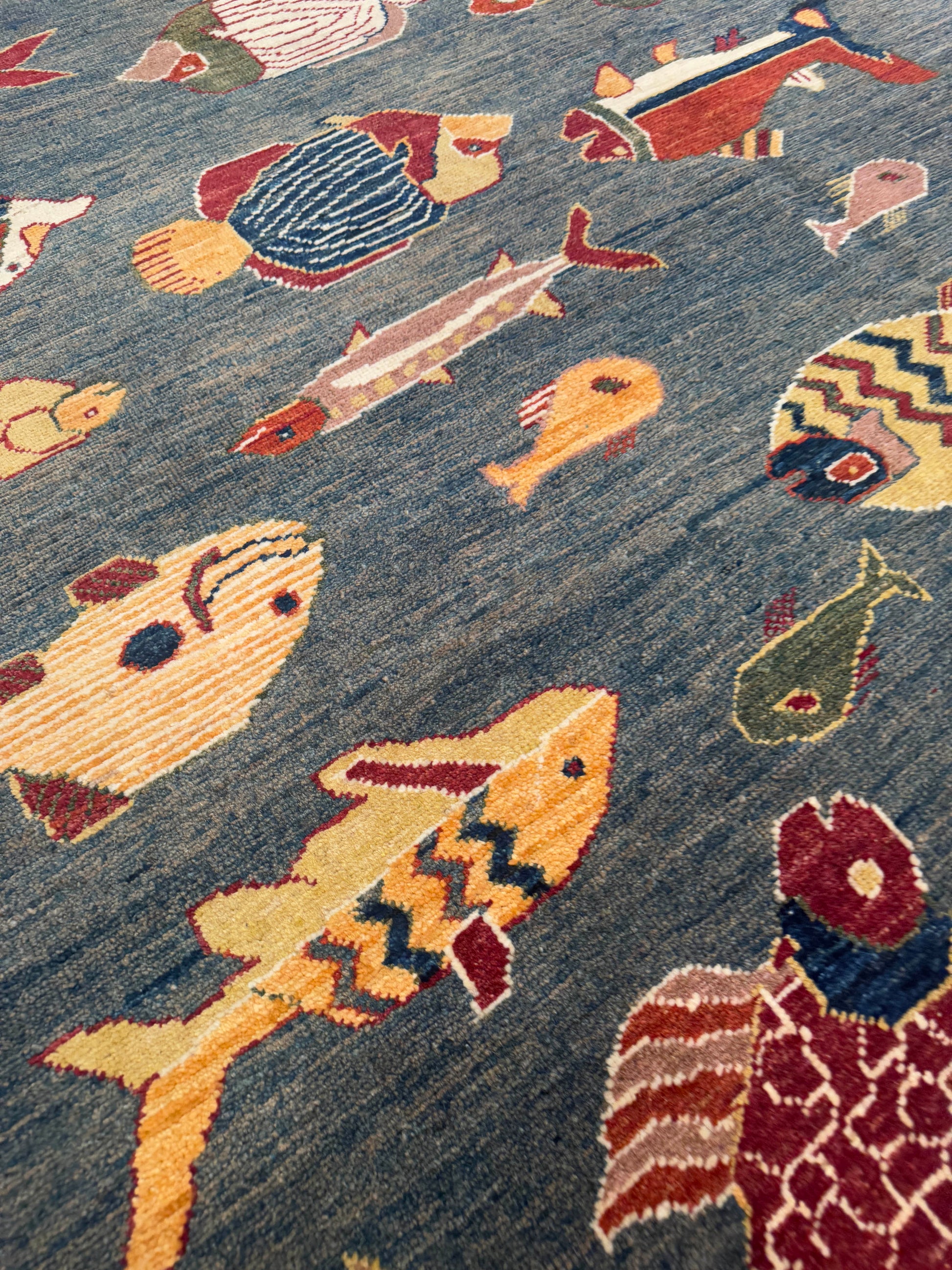 This lively handwoven wool rug bursts with color and charm, showcasing a whimsical sea of fish in a variety of shapes and patterns. The deep blue background creates a striking contrast with the vibrant reds, yellows, oranges, and greens of the fish, making the design come alive with movement and energy. Perfect for adding personality and a touch of fun to any room, this piece beautifully balances artistry and craftsmanship.