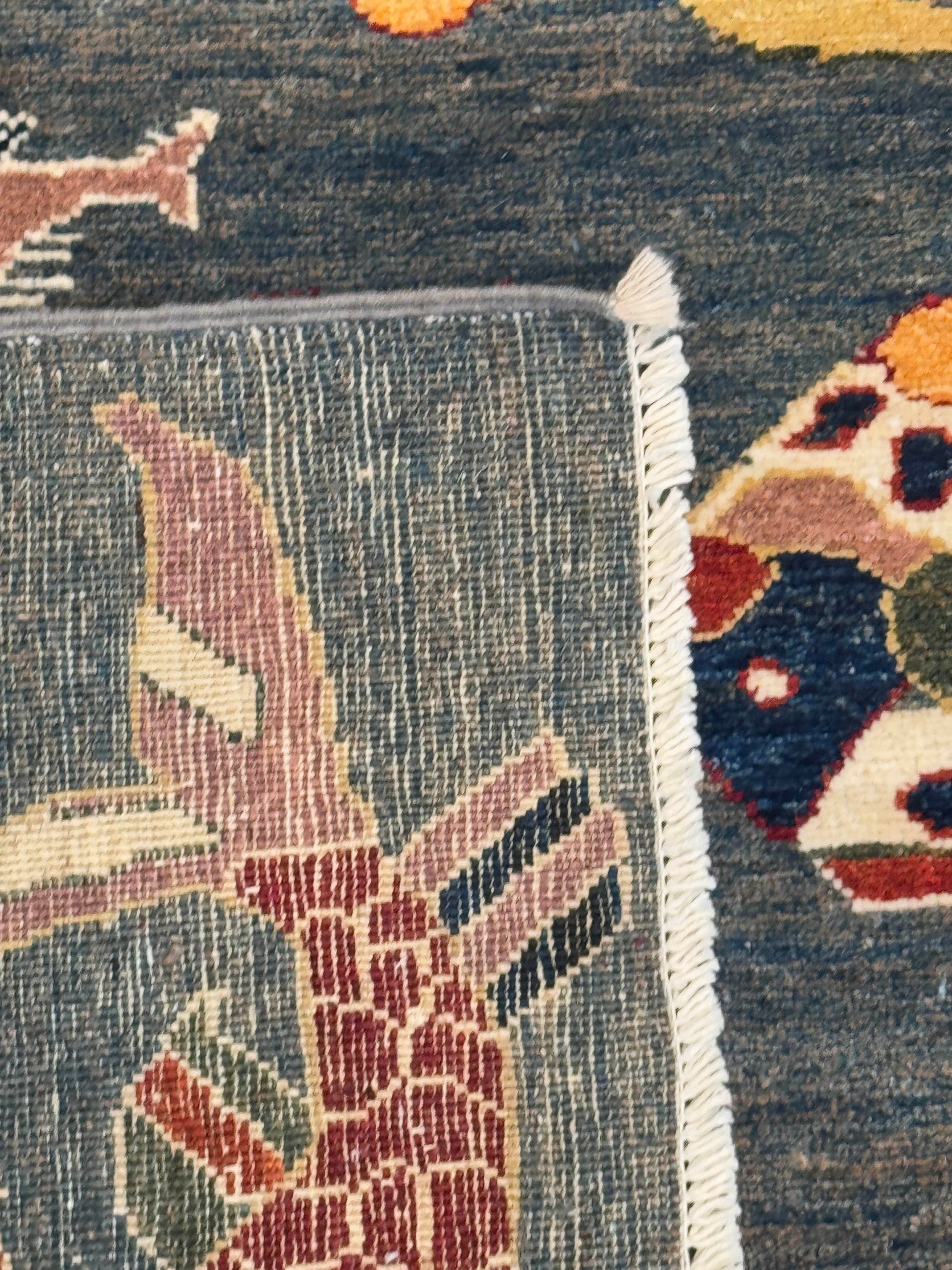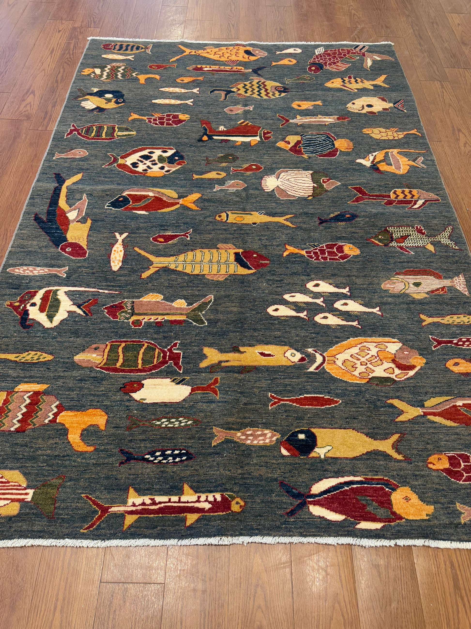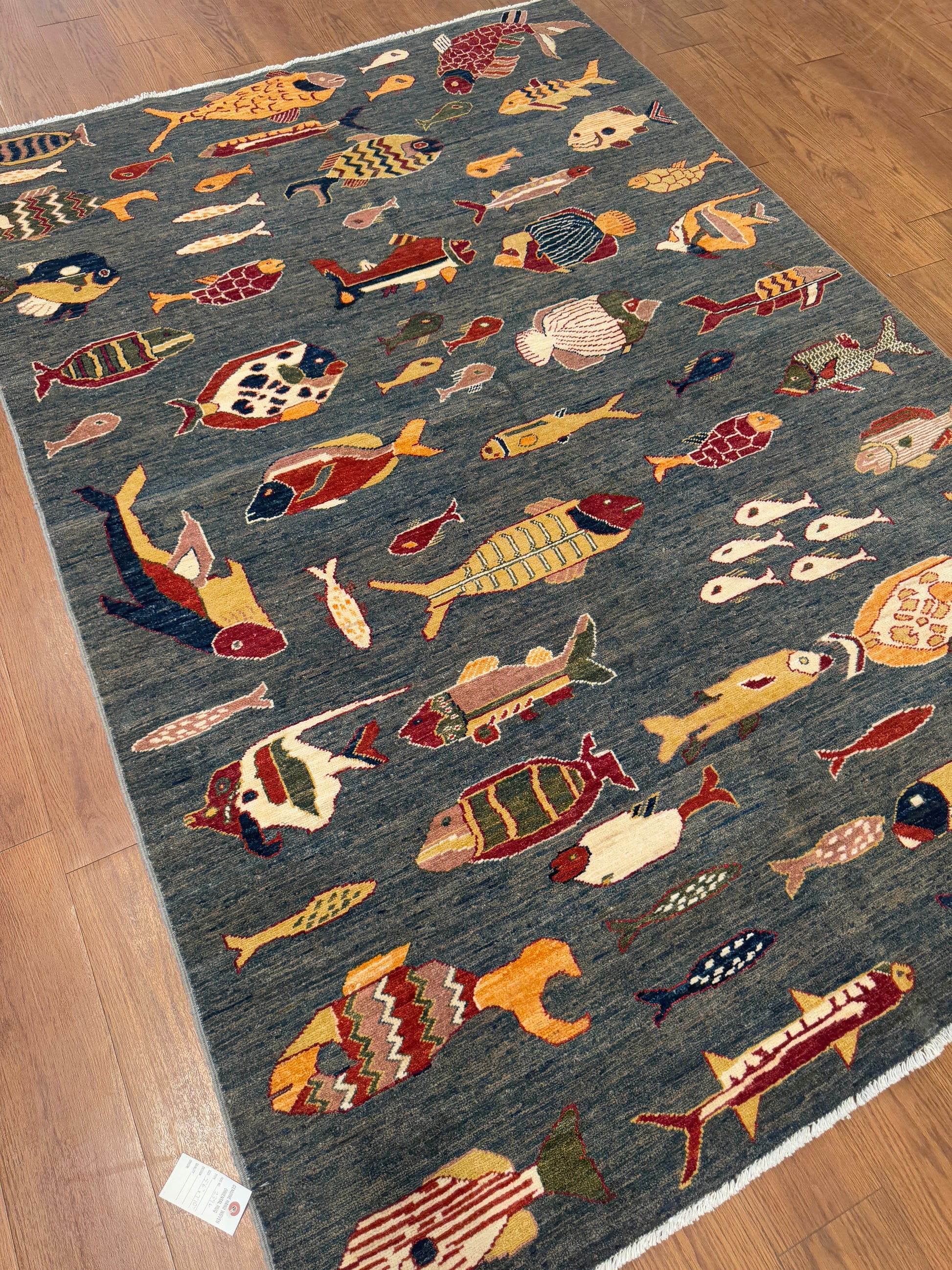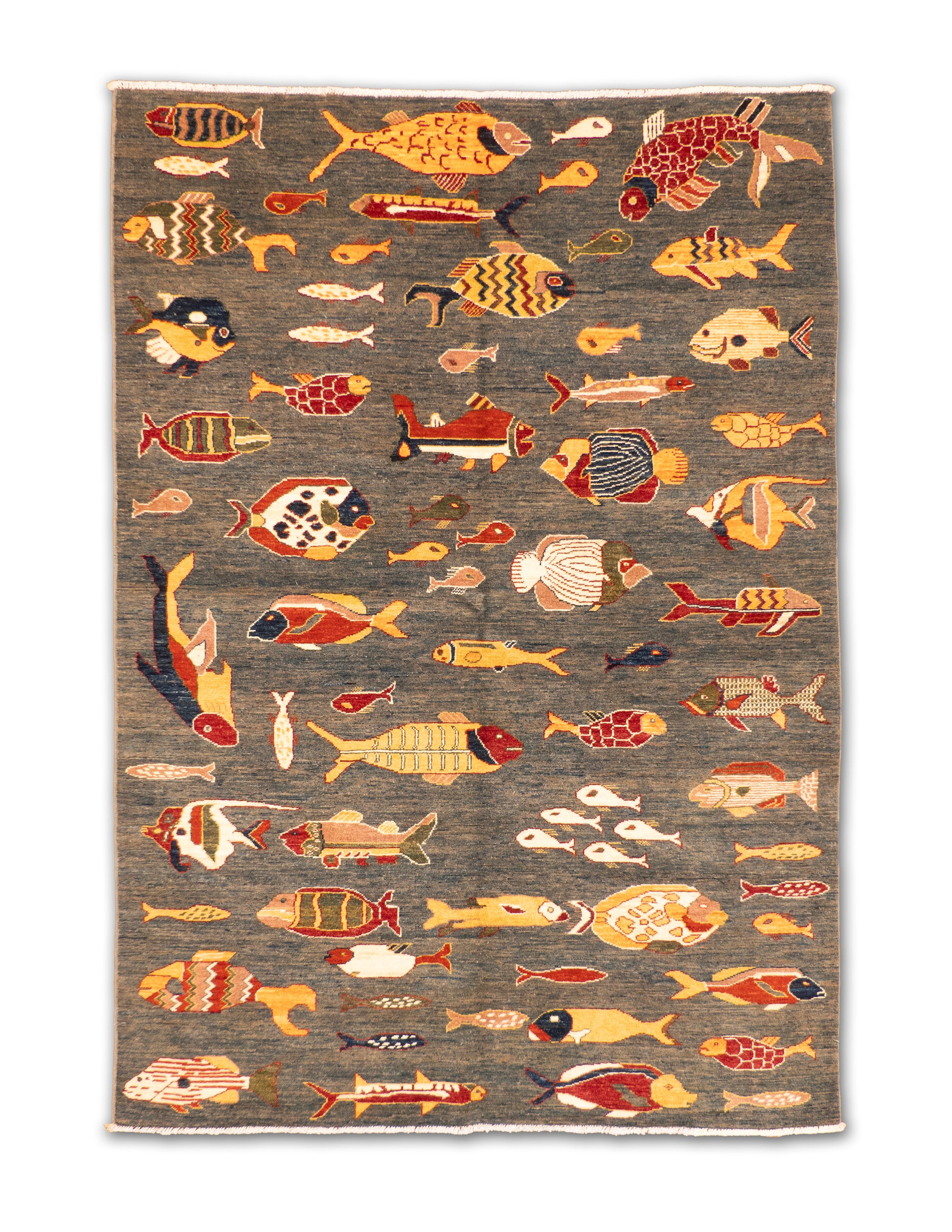 This lively handwoven wool rug bursts with color and charm, showcasing a whimsical sea of fish in a variety of shapes and patterns. The deep blue background creates a striking contrast with the vibrant reds, yellows, oranges, and greens of the fish, making the design come alive with movement and energy. Perfect for adding personality and a touch of fun to any room, this piece beautifully balances artistry and craftsmanship.