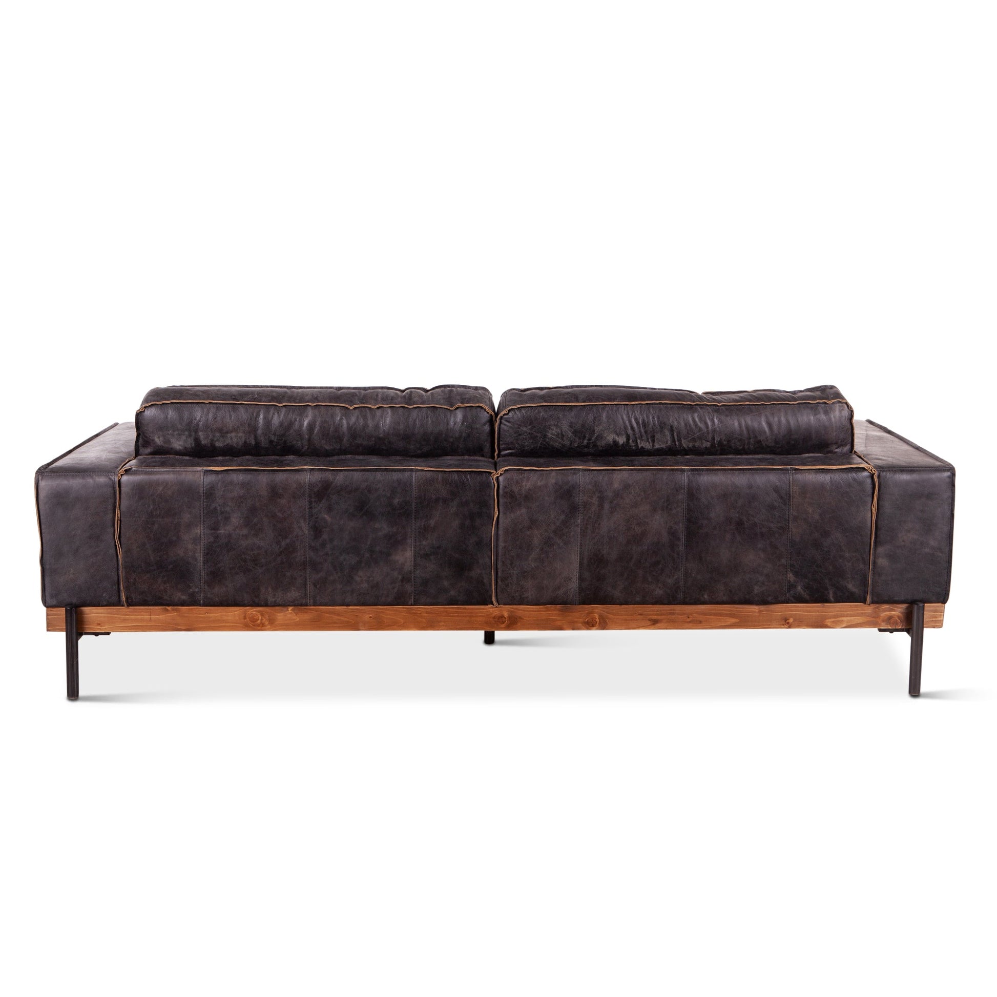This sofa combines mid-century form with rustic refinement. Upholstered in top grain antique ebony leather, it features soft, oversized arms and sleek matte metal legs that provide contrast and balance. The warm walnut wood paneling around the frame enhances its sculptural silhouette, while the generous seat depth offers lasting comfort. Crafted for both design and durability, this piece delivers timeless appeal suited to modern, transitional, and industrial interiors.