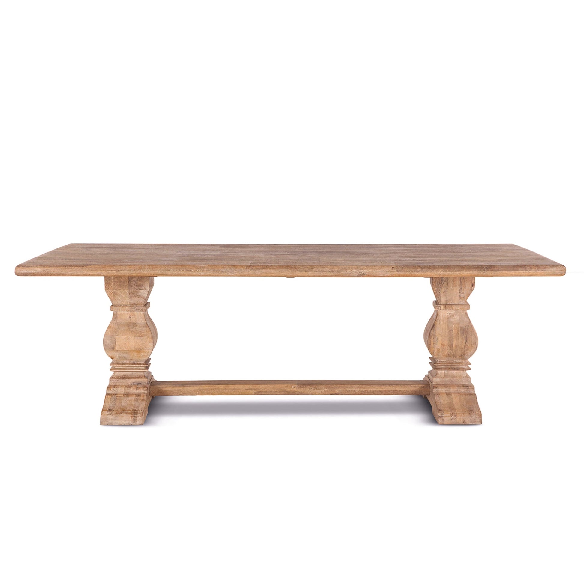 This grand dining table combines coastal charm with timeless craftsmanship. Made from solid mango wood in an antique oak finish, it features a spacious rectangular top supported by two hand-carved pedestal bases that bring sculptural presence and balance. The multi-step finish enhances the natural beauty of the wood grain while adding depth and character. Perfect for large dining rooms, estate homes, or refined hospitality settings, it offers both durability and elegance in a commanding form.