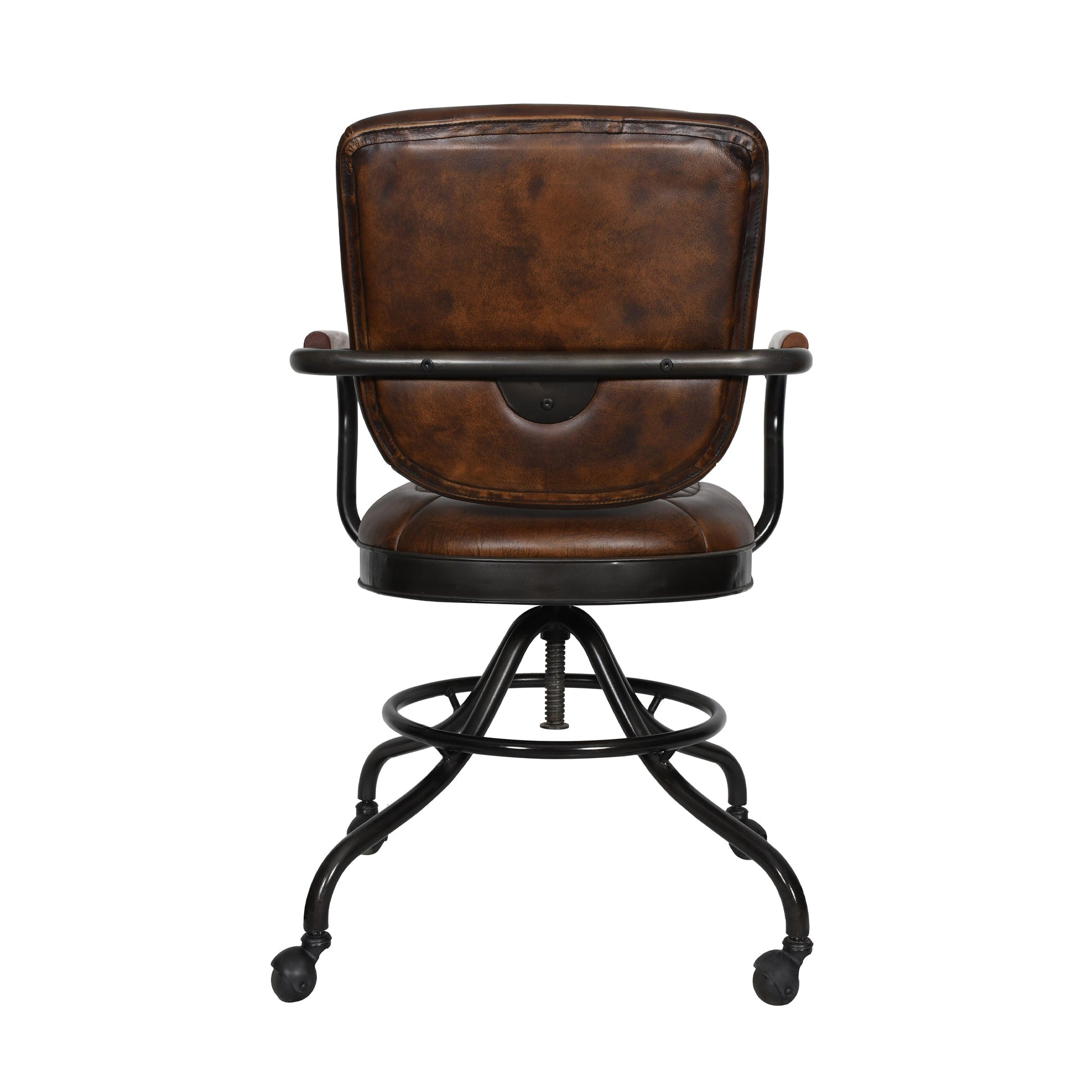 This desk chair blends refined craftsmanship with modern comfort, featuring upholstery in warm antique whiskey top grain leather. The padded seat and backrest provide supportive comfort, while the powder-coated black metal legs offer stability and sleek contrast. Natural variations in color and texture highlight the character of genuine leather, giving each piece its own unique personality. Designed for durability and style, it complements both professional offices and curated home workspaces.