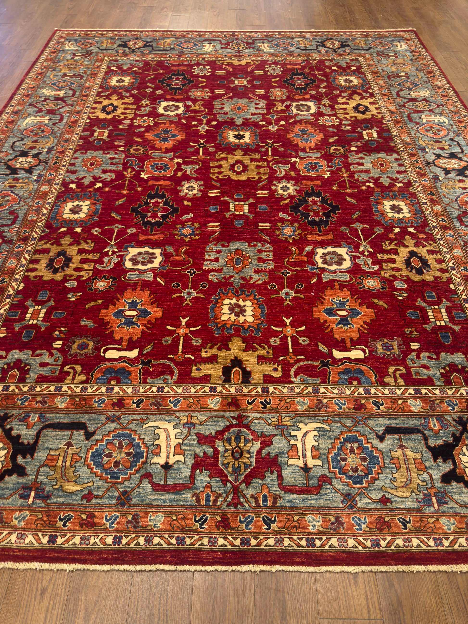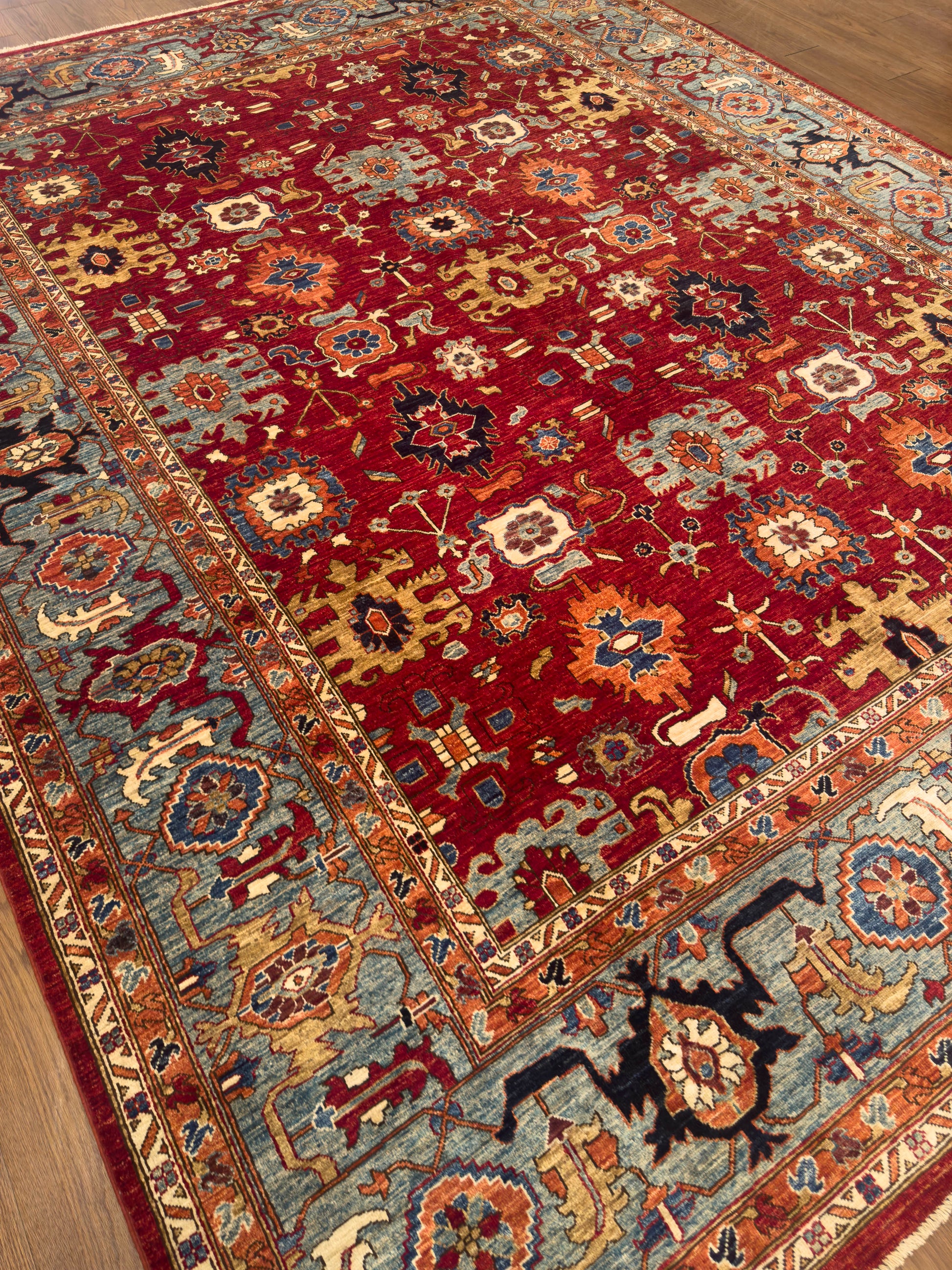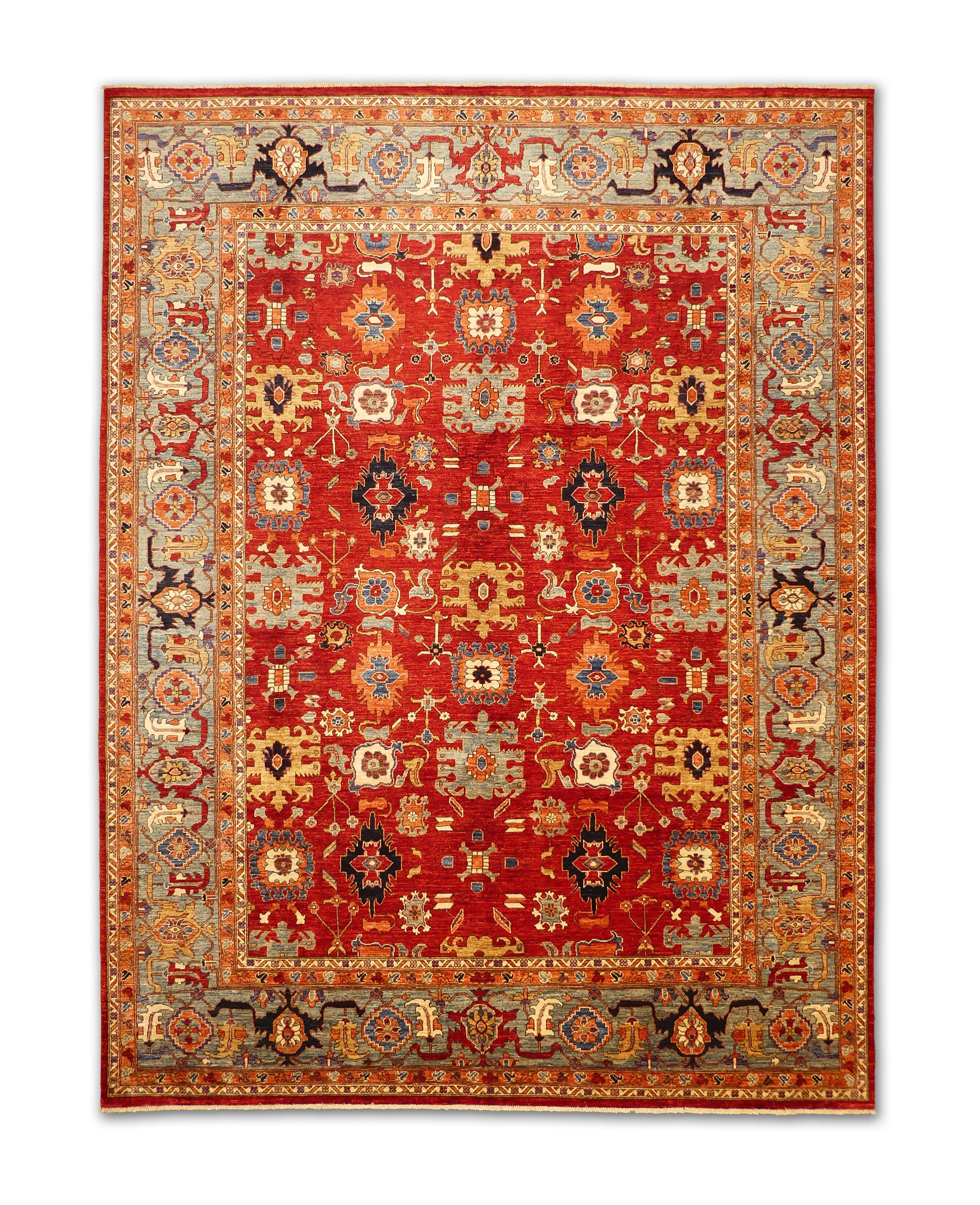 This handmade rug features a radiant red field adorned with bold geometric floral motifs in gold, blue, ivory, and deep navy. The intricate detailing and vibrant palette evoke a timeless elegance, while the wide sky-blue border adds balance and visual depth. With its strong symmetry and regal charm, this piece brings warmth and sophistication to both classic and transitional interiors.
