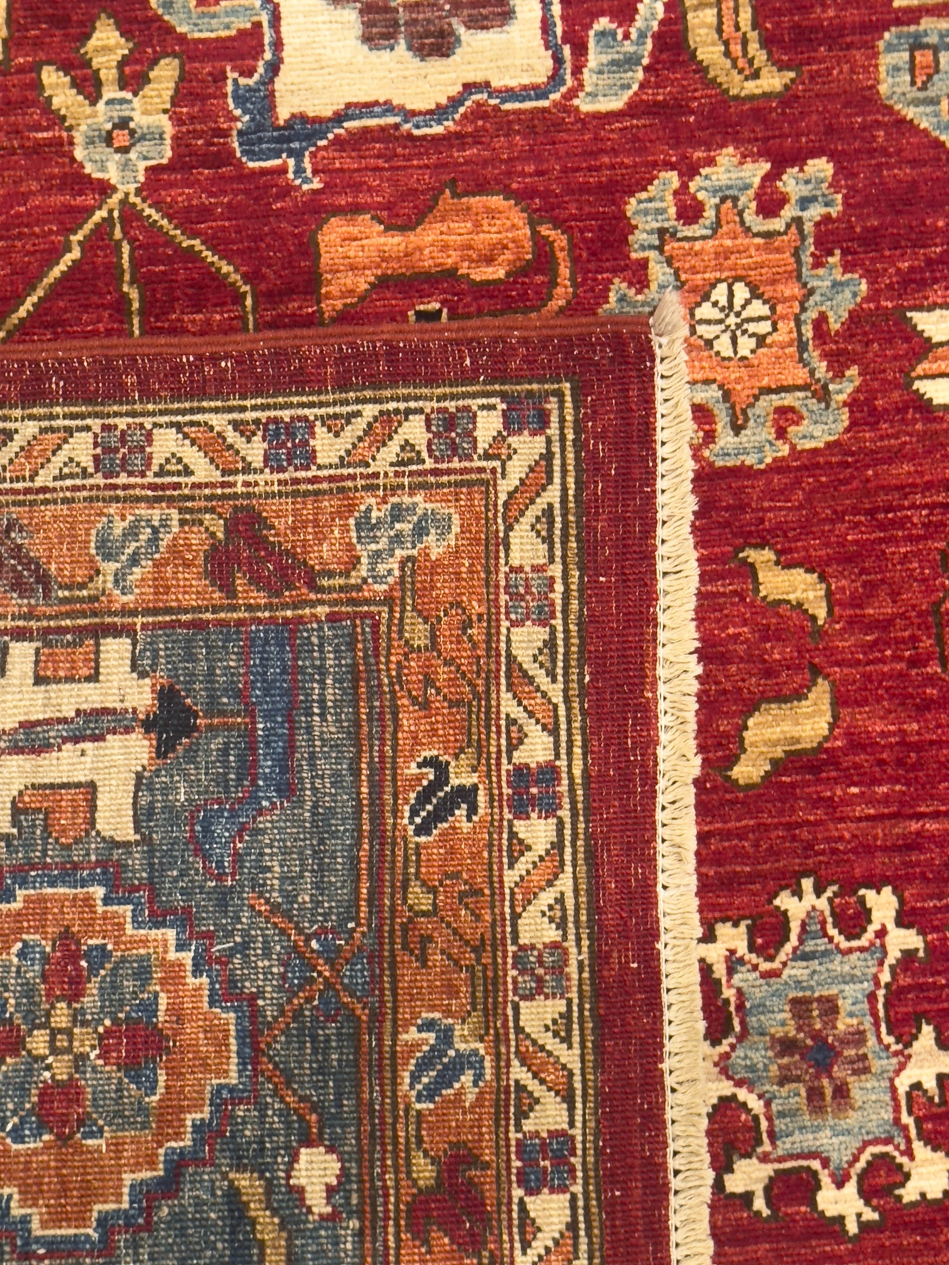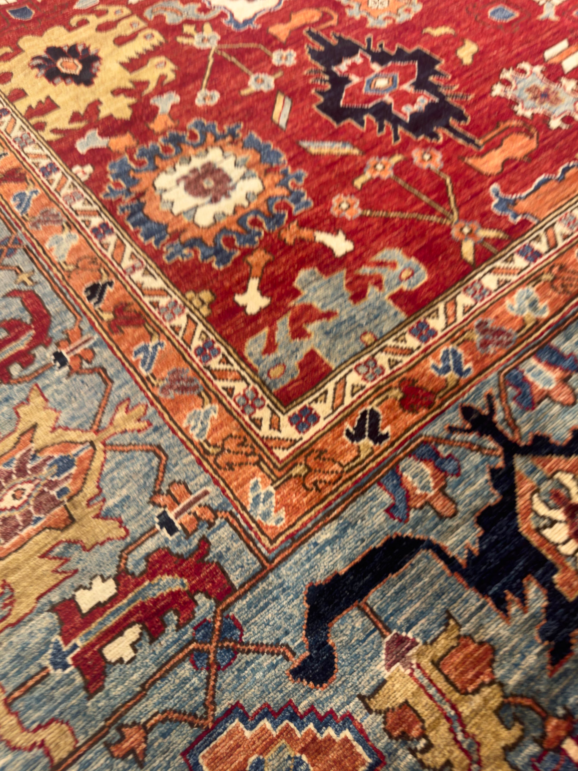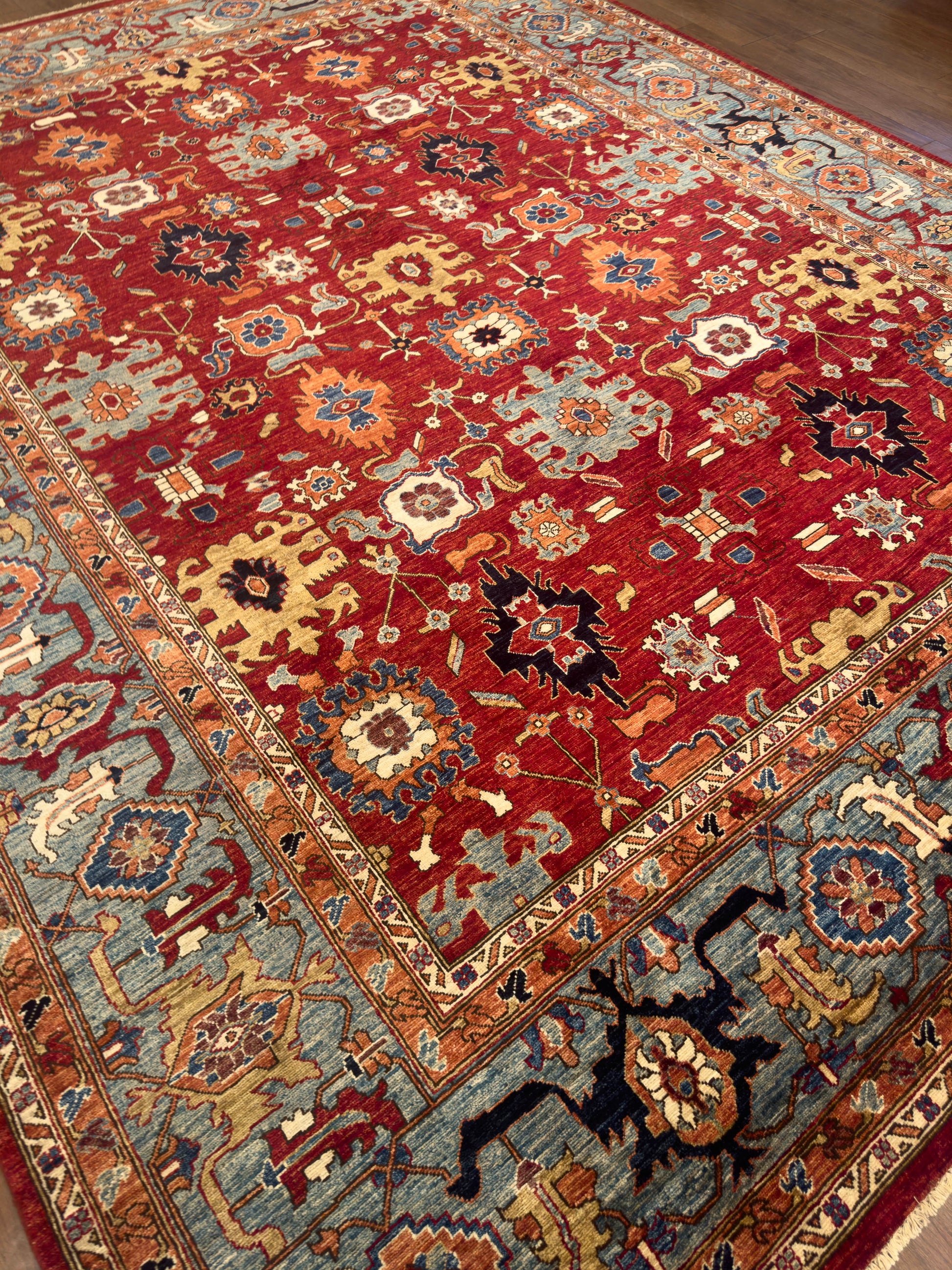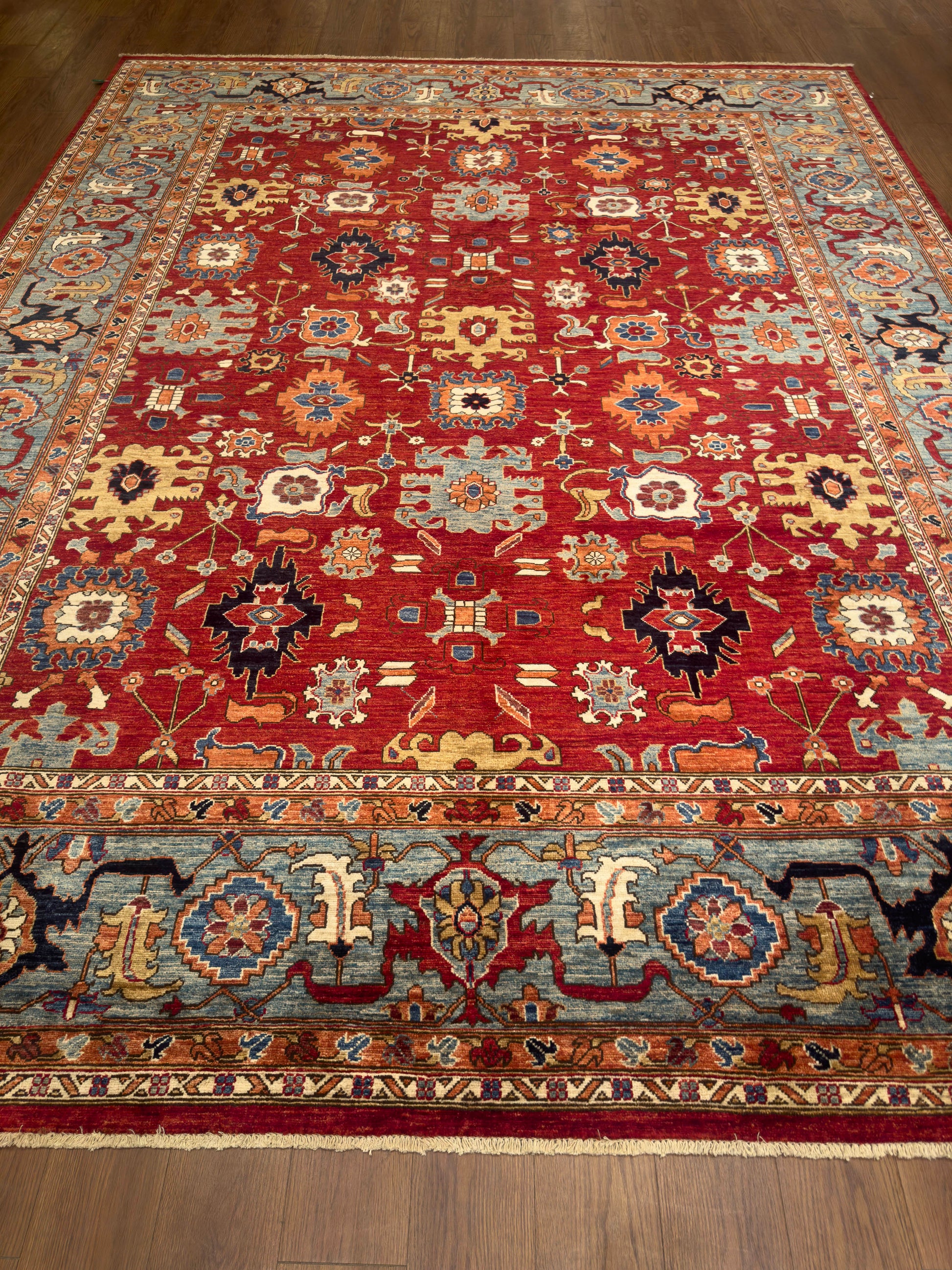 This handmade rug features a radiant red field adorned with bold geometric floral motifs in gold, blue, ivory, and deep navy. The intricate detailing and vibrant palette evoke a timeless elegance, while the wide sky-blue border adds balance and visual depth. With its strong symmetry and regal charm, this piece brings warmth and sophistication to both classic and transitional interiors.