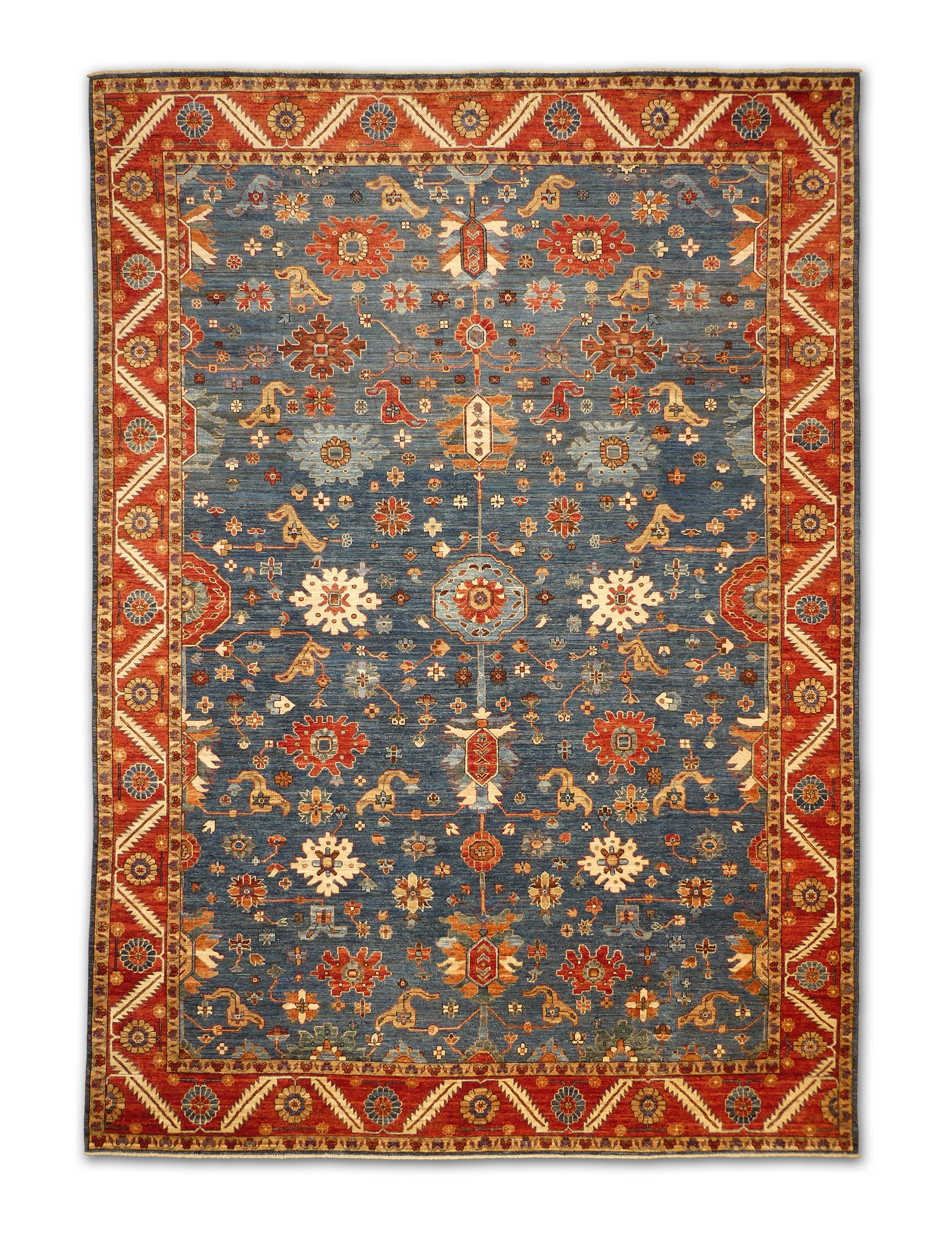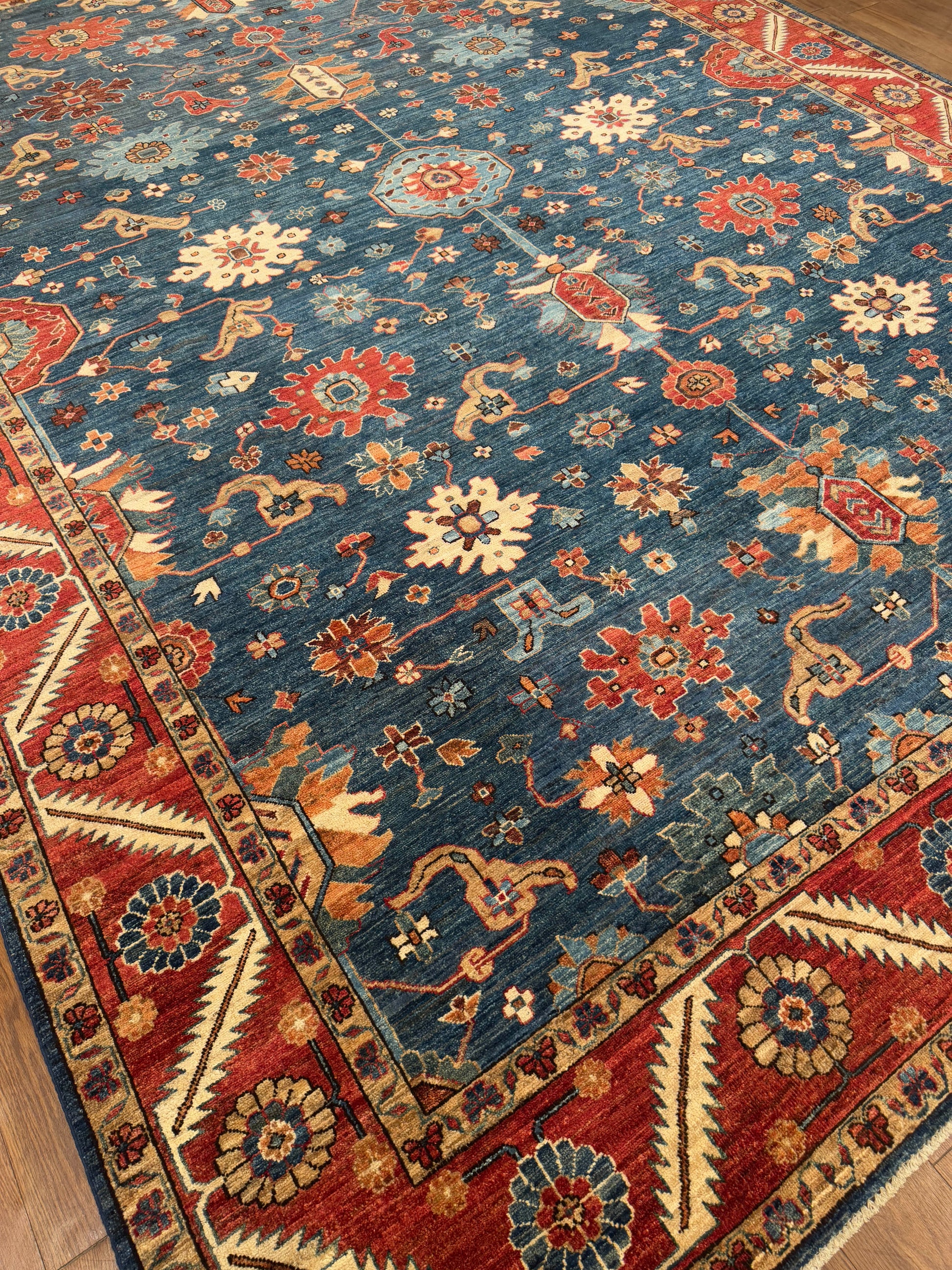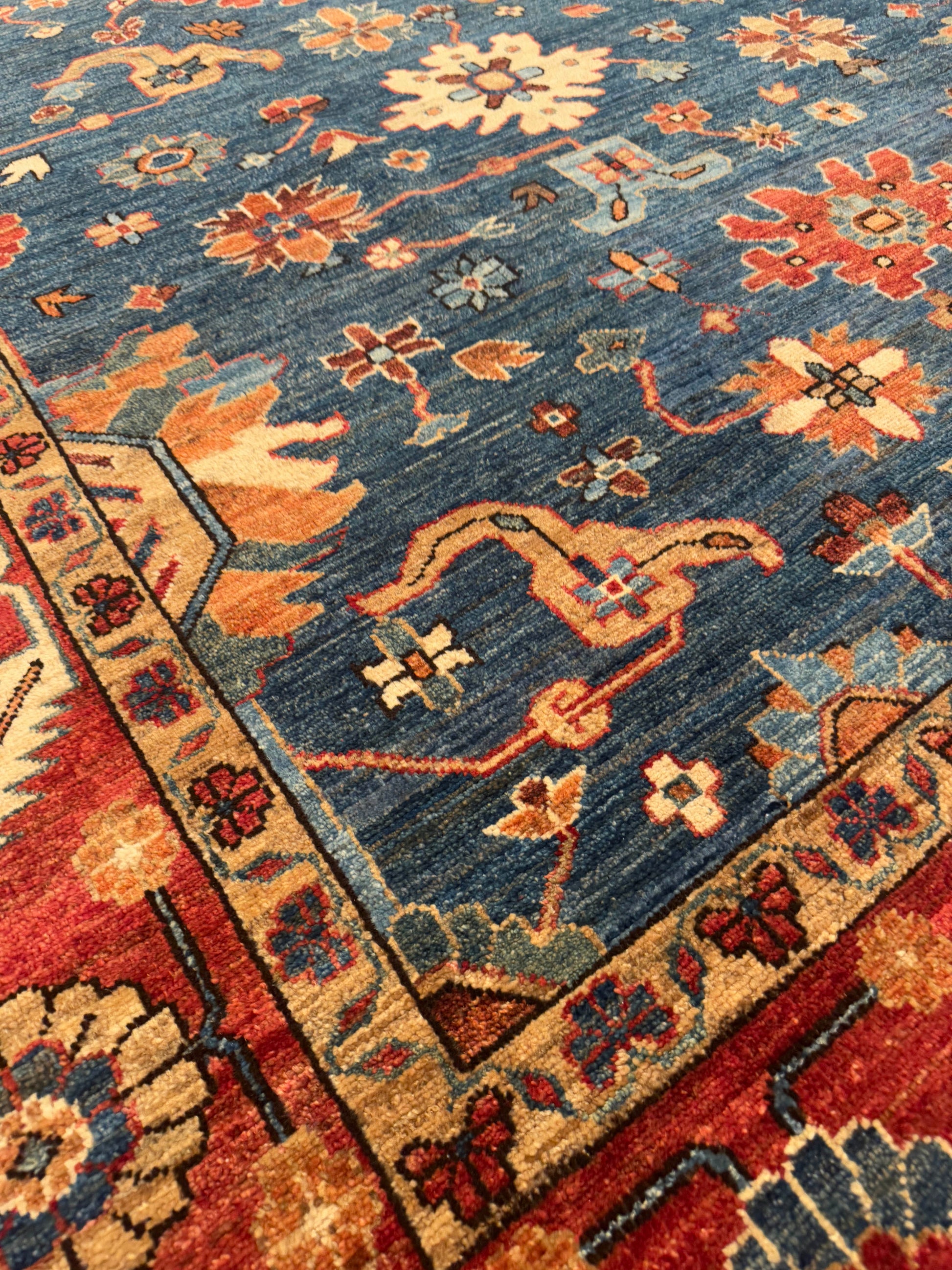 This exquisite handwoven rug features a rich blue field beautifully balanced by warm tones of red, gold, and ivory. The symmetrical pattern of floral and geometric motifs creates a lively yet harmonious composition, framed by a striking red border with intricate detailing. Its luxurious wool texture and timeless palette make it an ideal piece for both traditional and transitional interiors.
