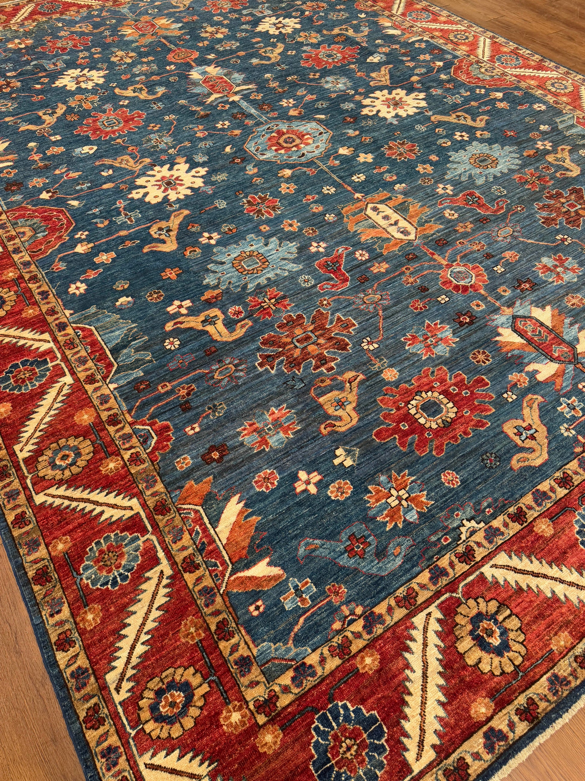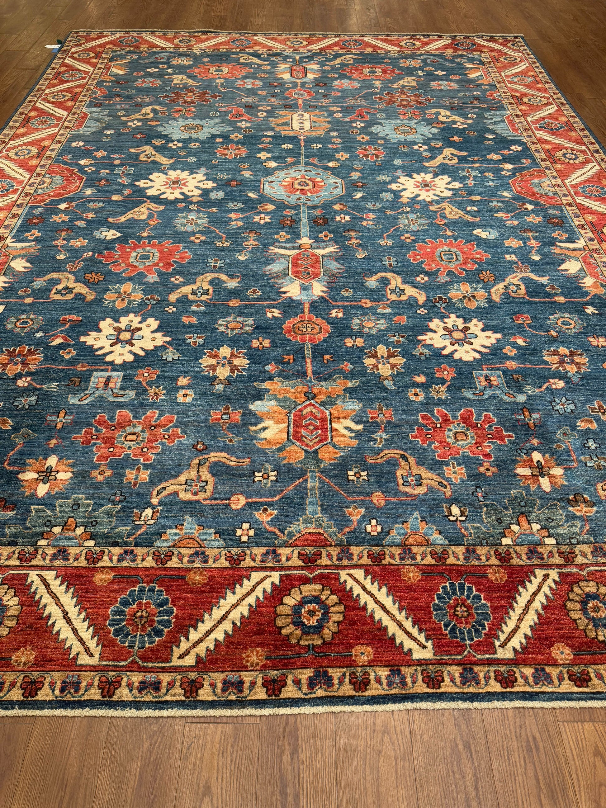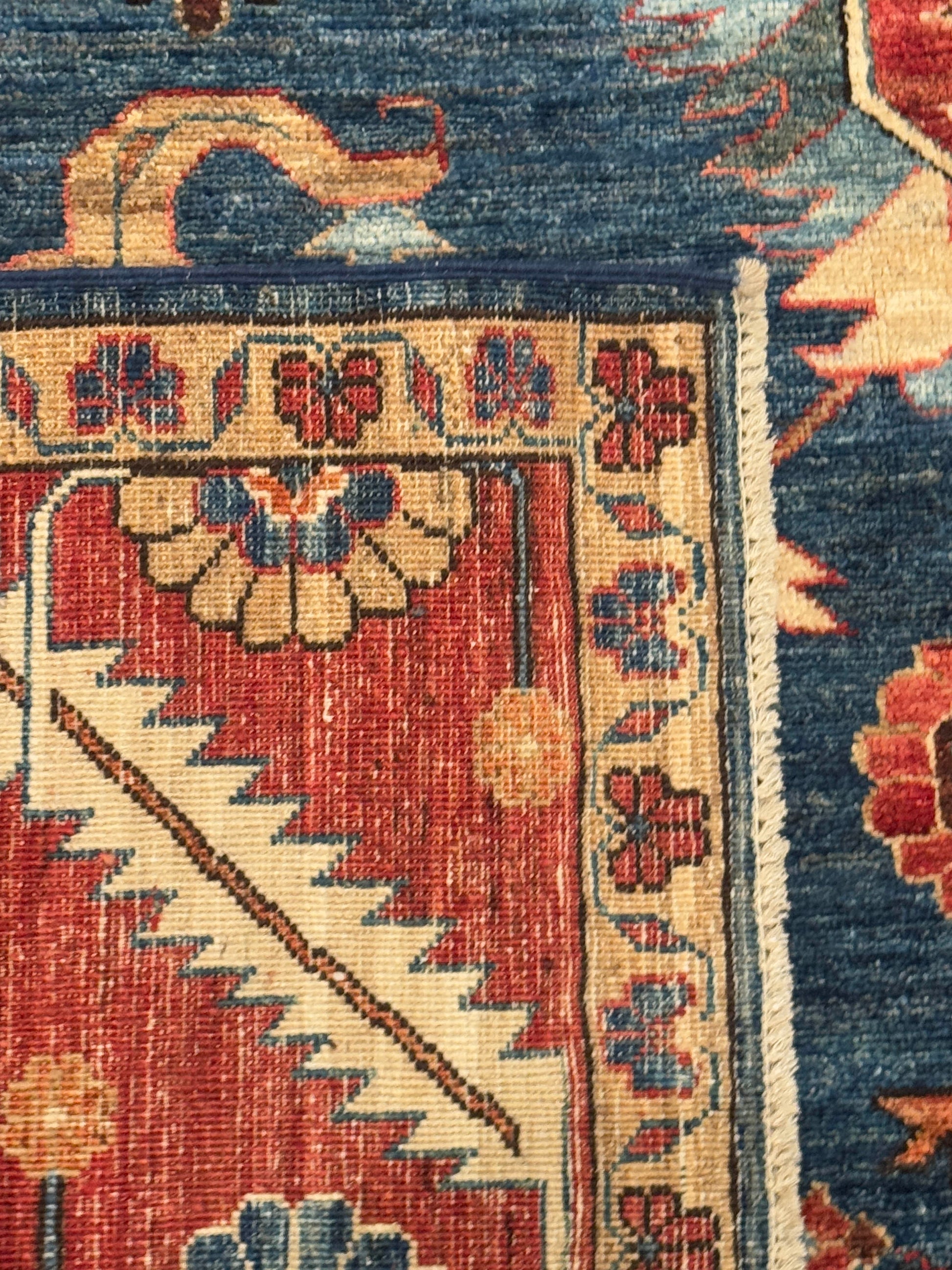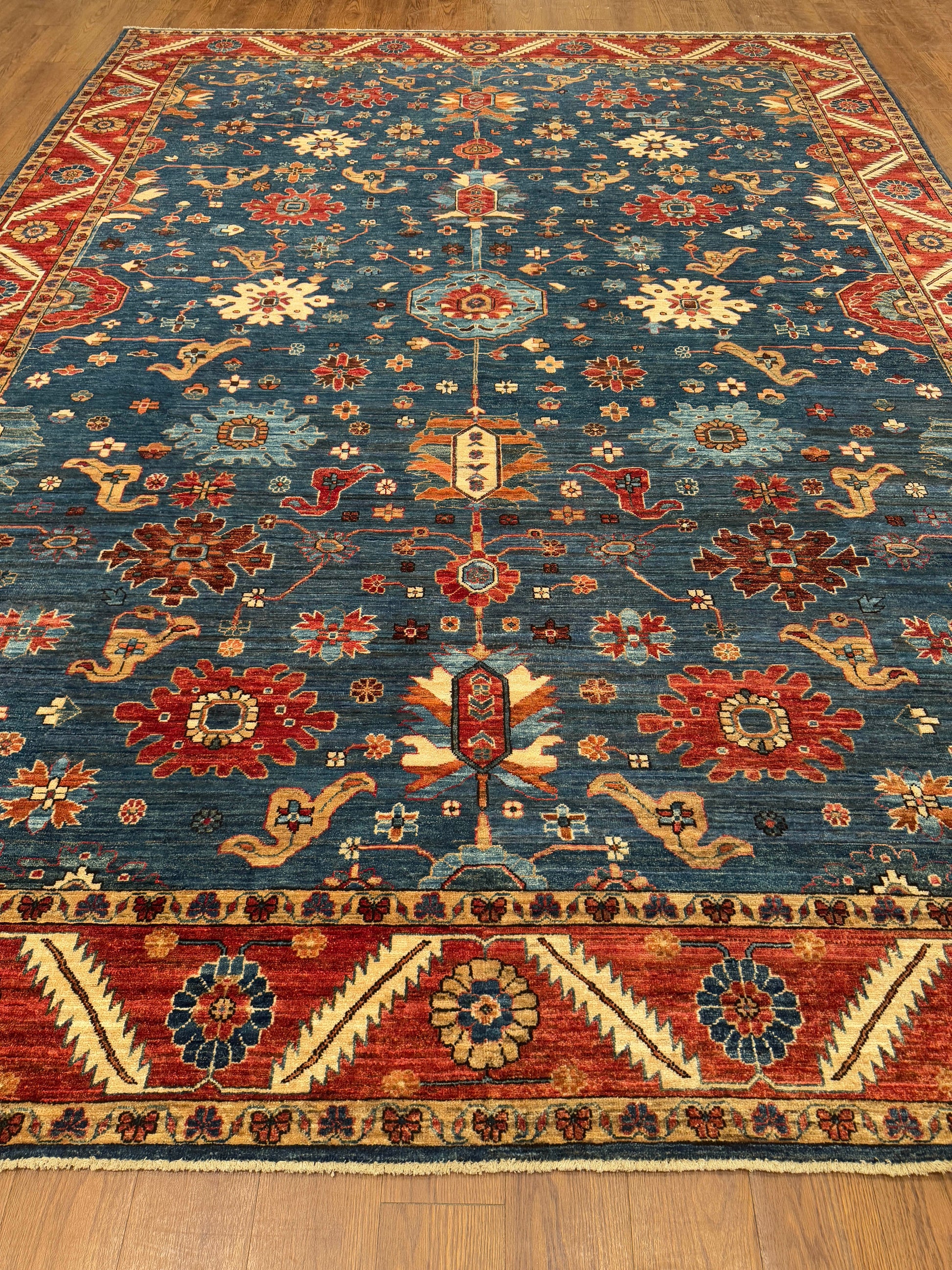 This exquisite handwoven rug features a rich blue field beautifully balanced by warm tones of red, gold, and ivory. The symmetrical pattern of floral and geometric motifs creates a lively yet harmonious composition, framed by a striking red border with intricate detailing. Its luxurious wool texture and timeless palette make it an ideal piece for both traditional and transitional interiors.
