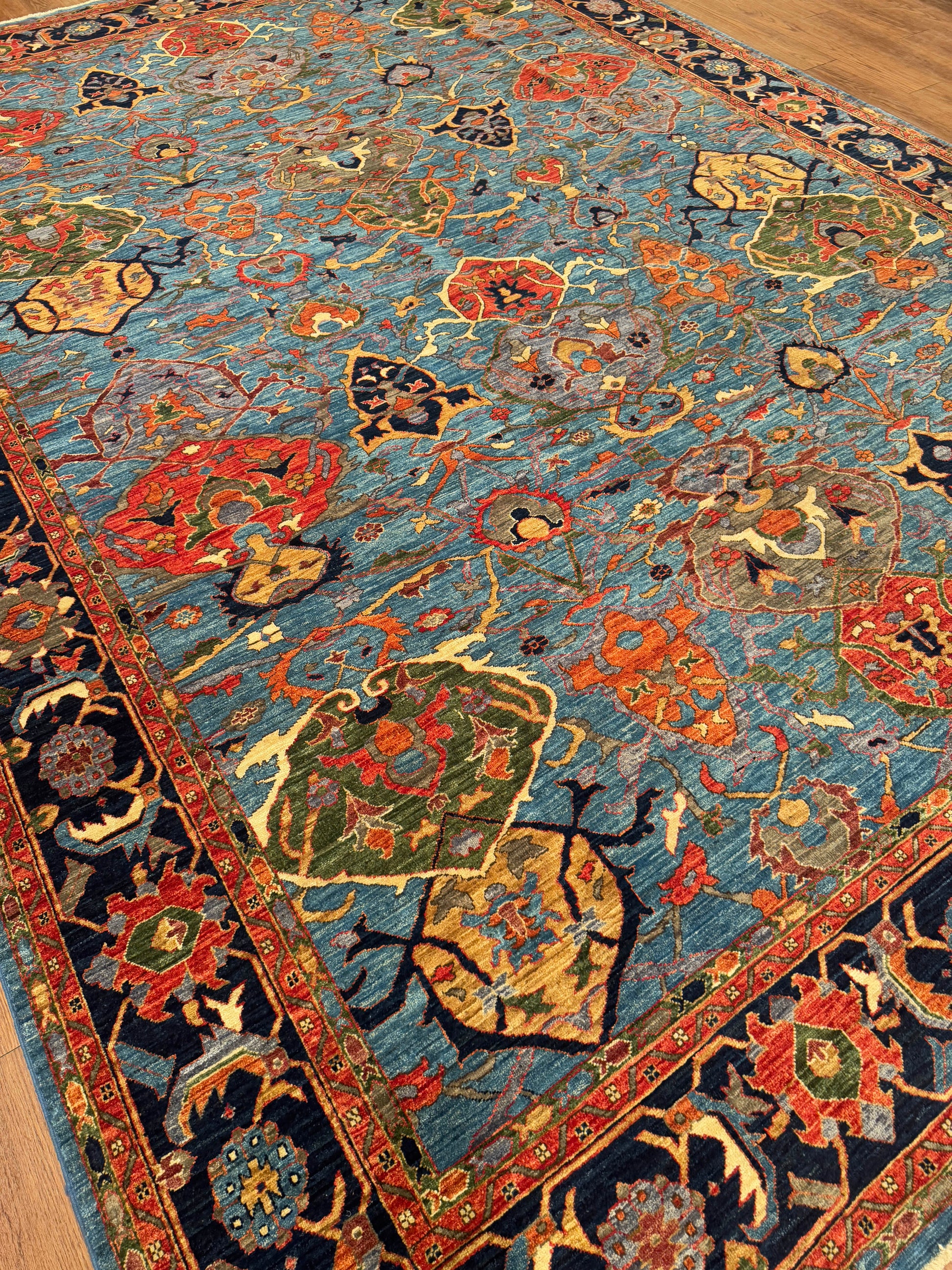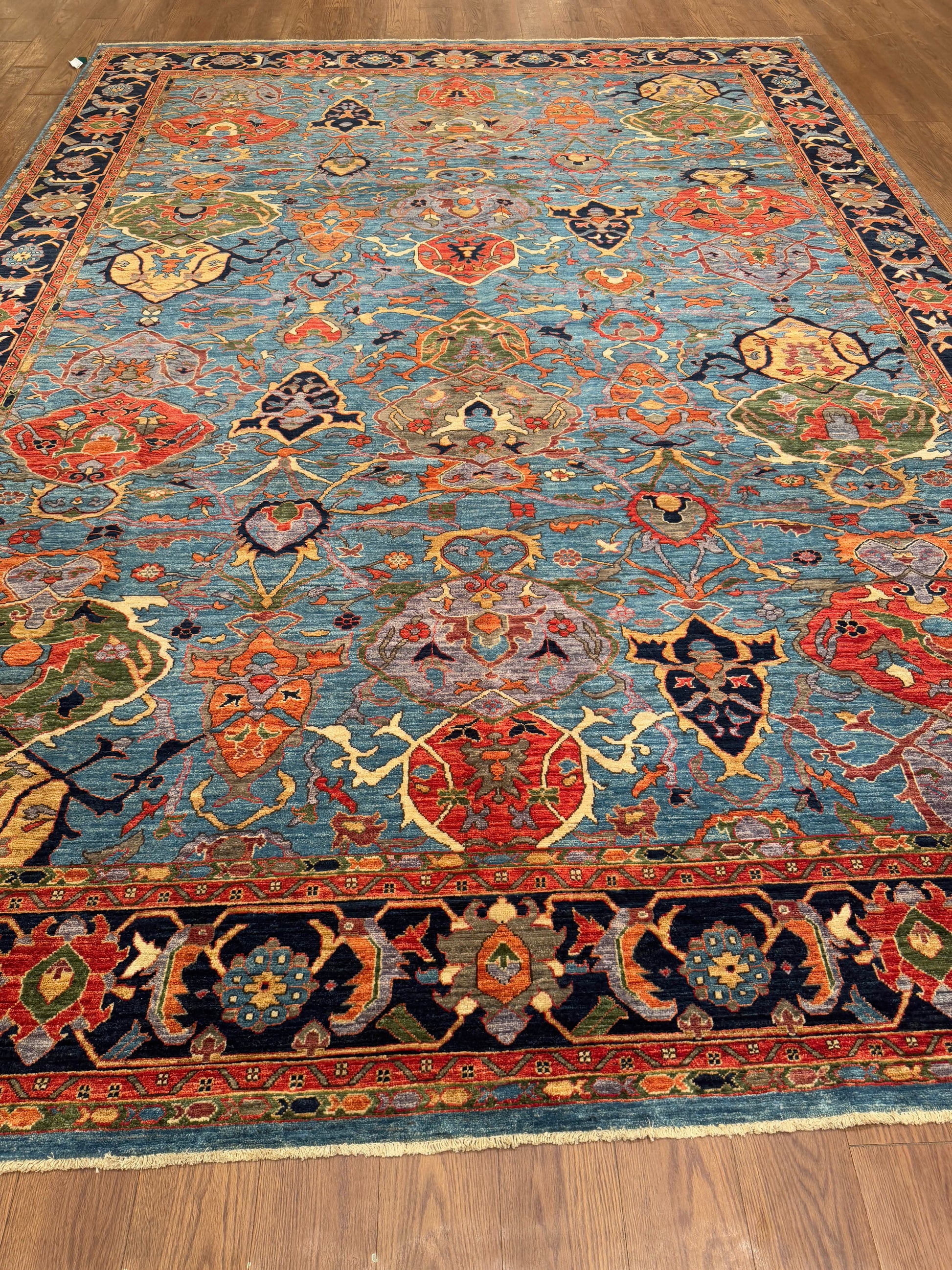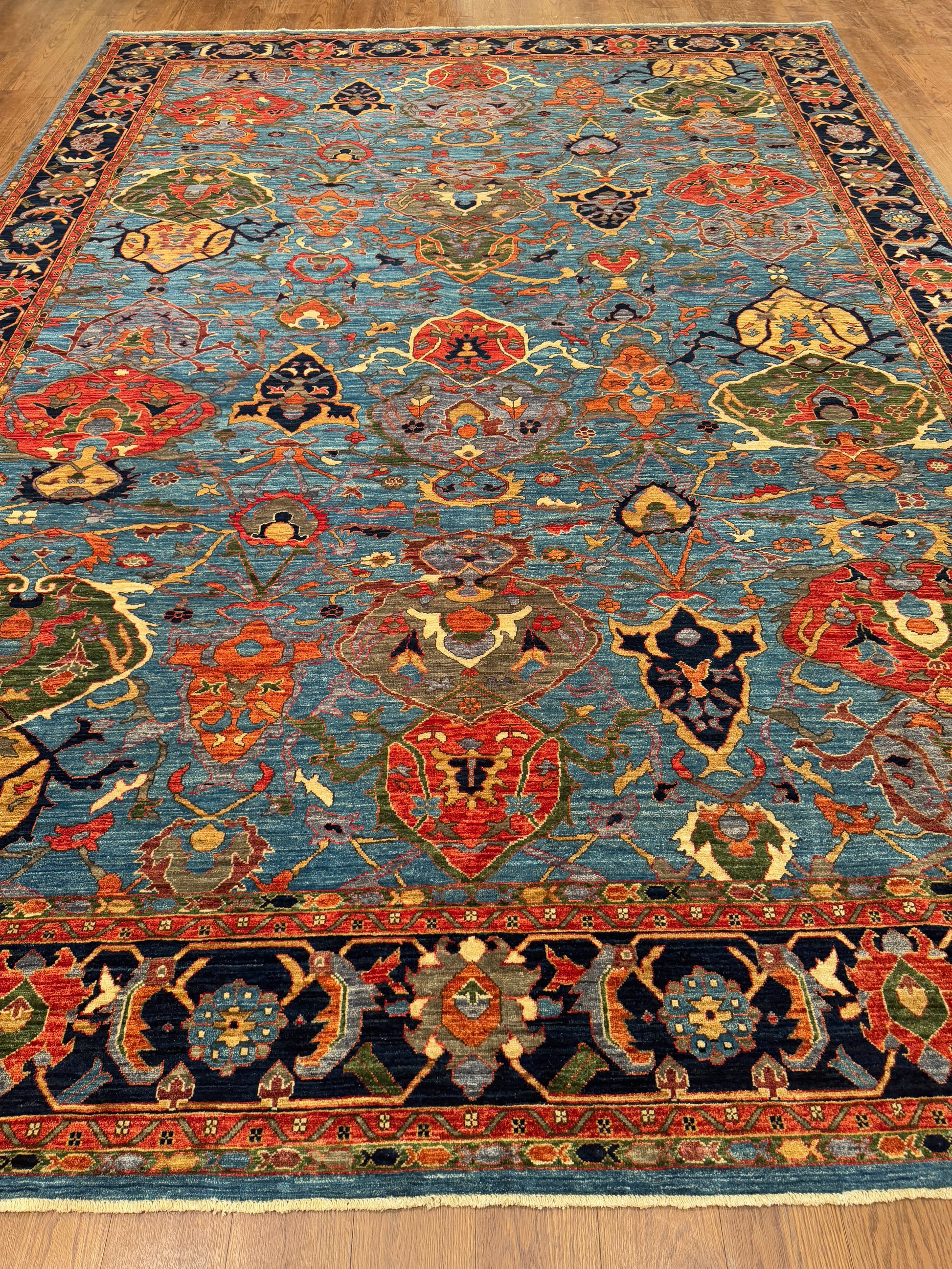 This handmade rug features a vivid allover design of stylized palmettes and floral motifs woven in brilliant shades of turquoise blue, rust, gold, navy, and olive. The intricate detailing and layered colors create a lively yet balanced composition that embodies traditional craftsmanship with a modern spirit. Woven from premium wool, this rug adds warmth, richness, and artistic flair to any room.