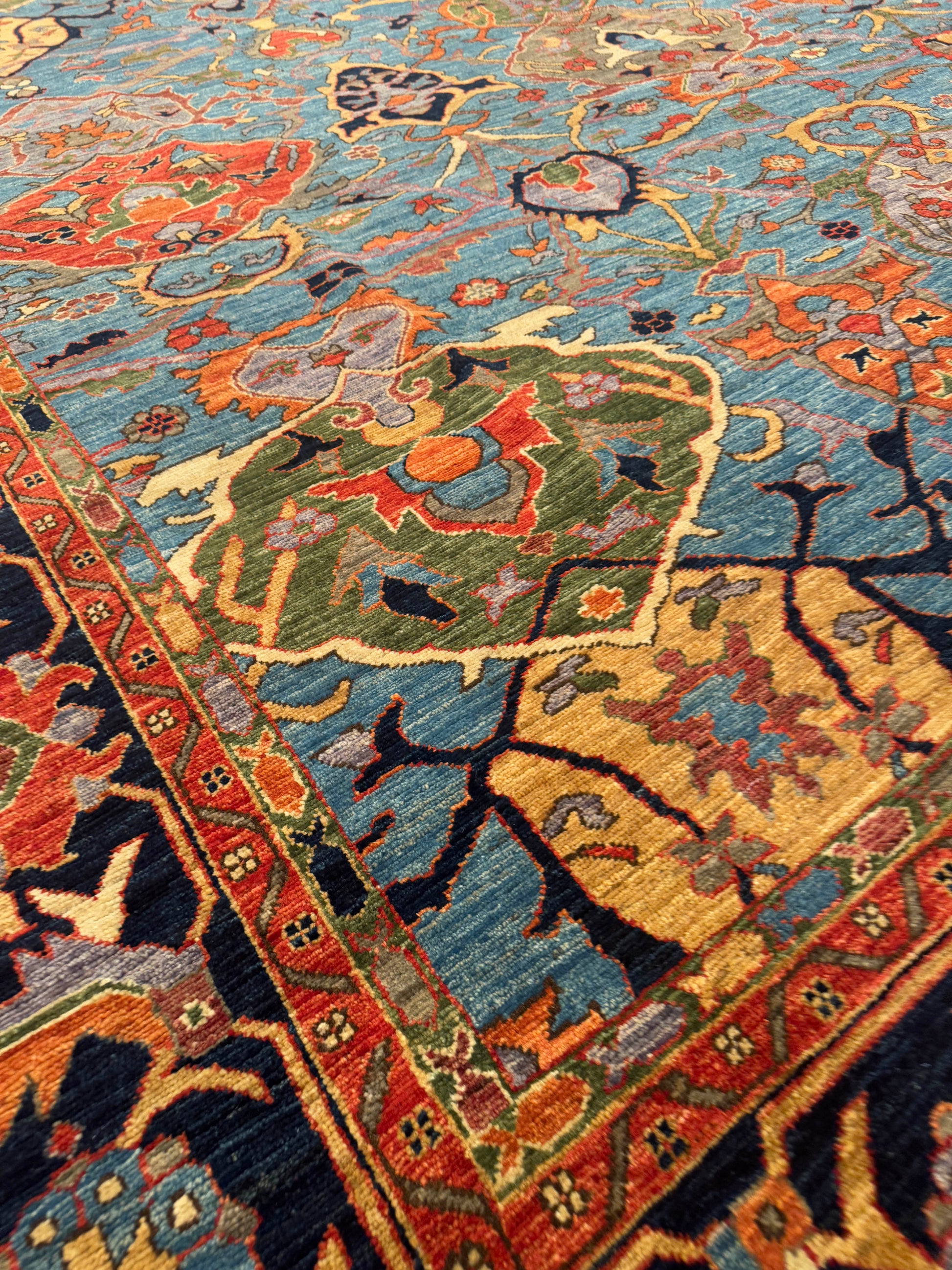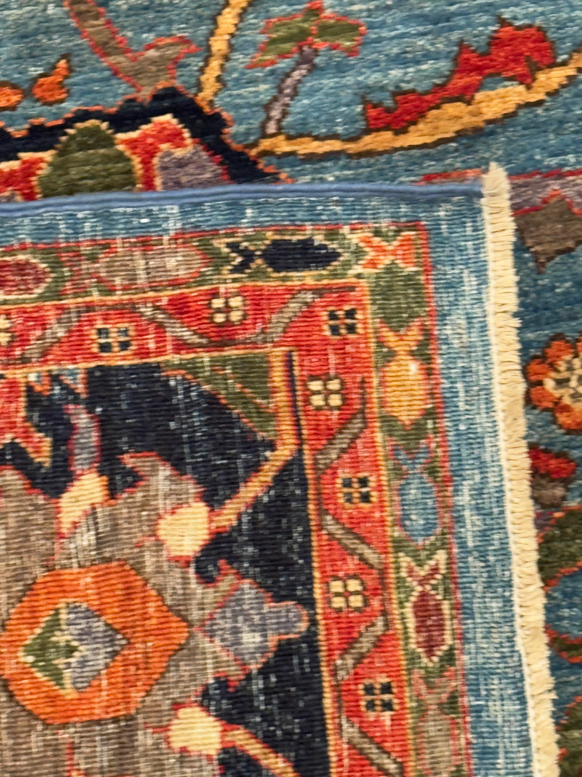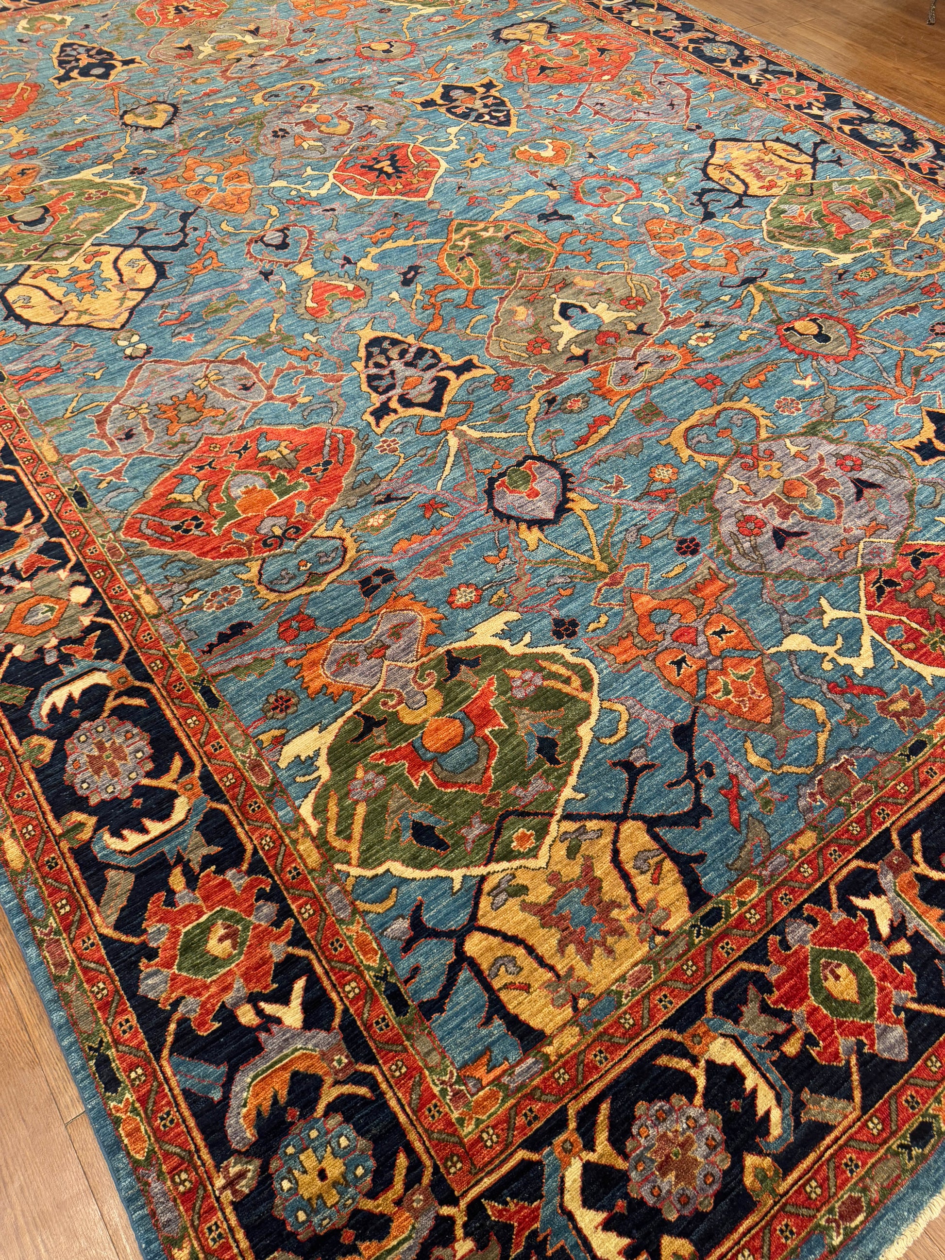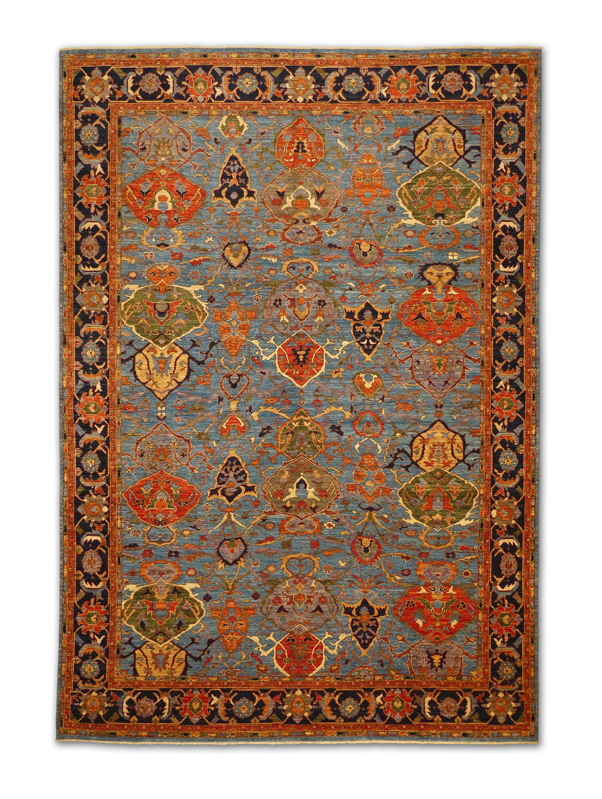 This handmade rug features a vivid allover design of stylized palmettes and floral motifs woven in brilliant shades of turquoise blue, rust, gold, navy, and olive. The intricate detailing and layered colors create a lively yet balanced composition that embodies traditional craftsmanship with a modern spirit. Woven from premium wool, this rug adds warmth, richness, and artistic flair to any room.