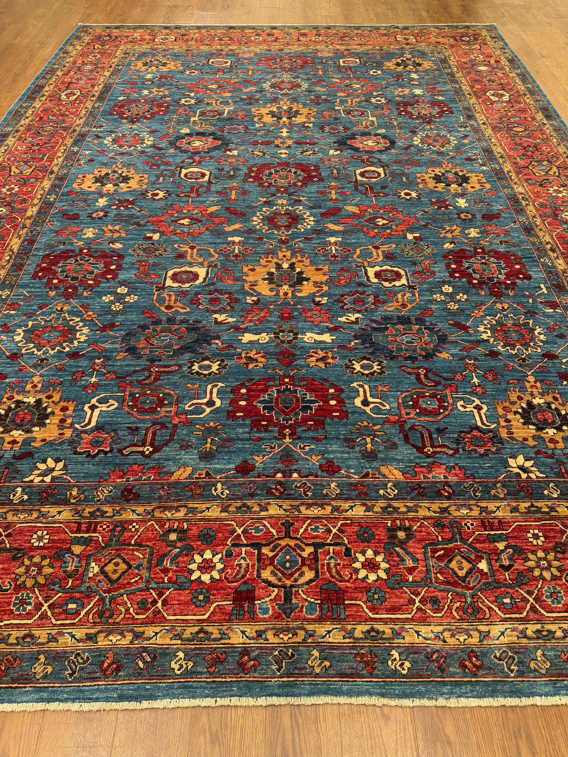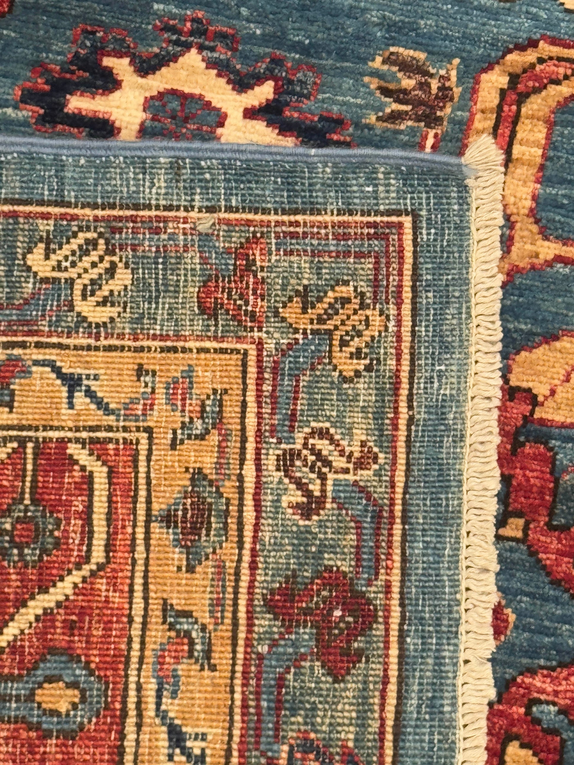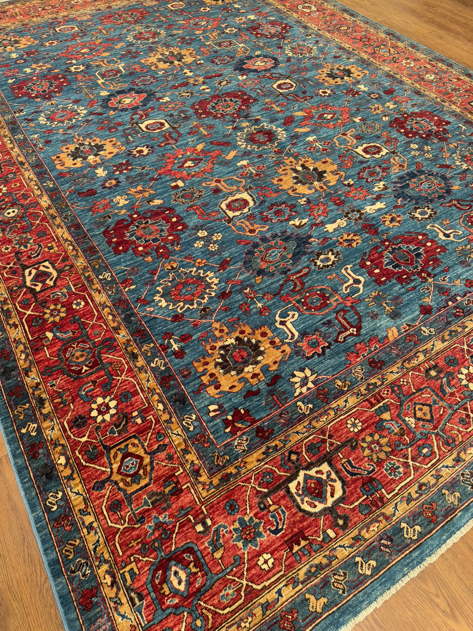 This handmade rug features an exquisite floral medallion pattern on a striking turquoise-blue field. The design is enriched with crimson, gold, ivory, and soft navy tones that create a vibrant yet balanced composition. Meticulously woven from fine wool, this rug combines traditional artistry with bold color harmony, adding depth and personality to any refined living space.