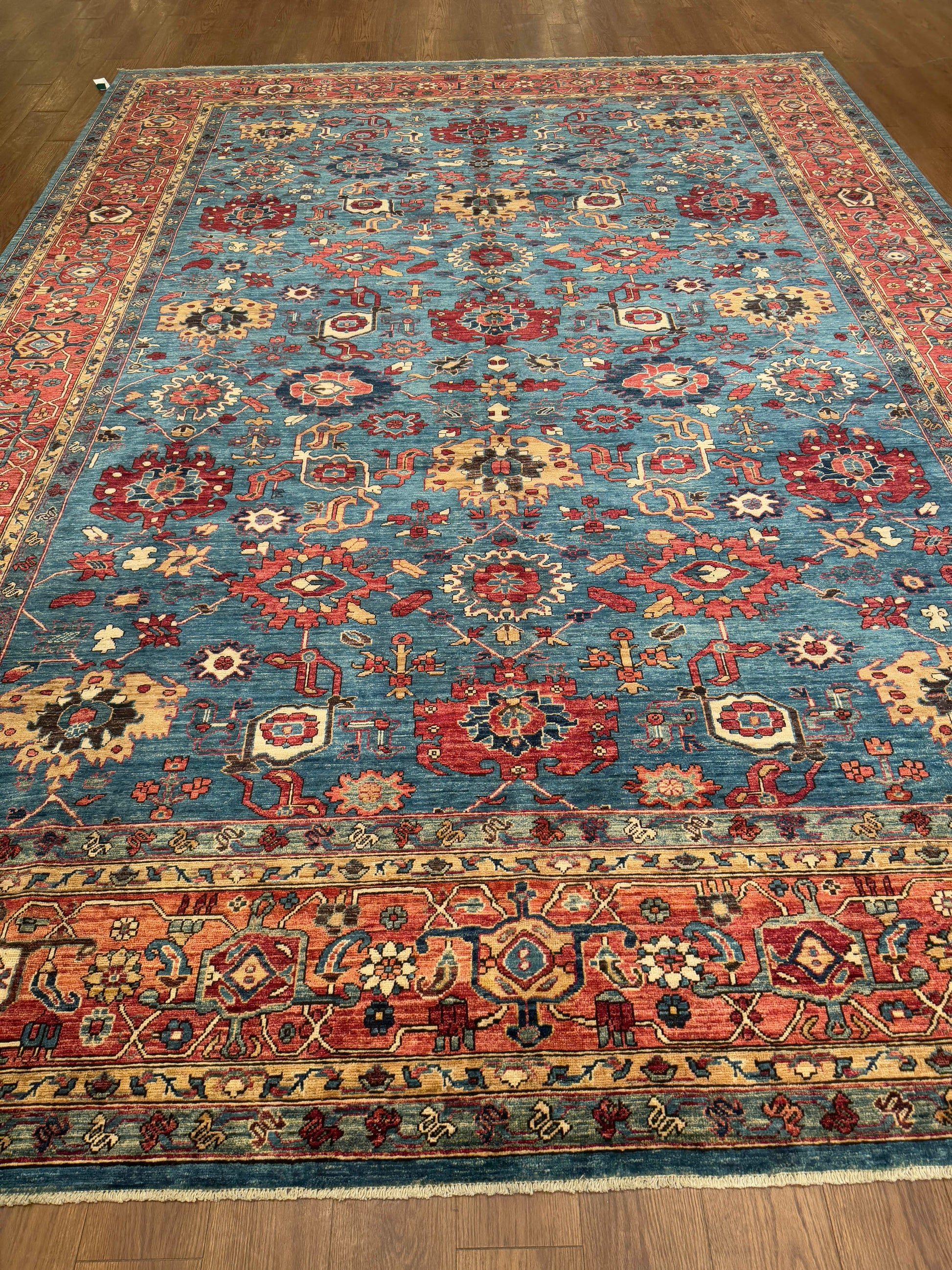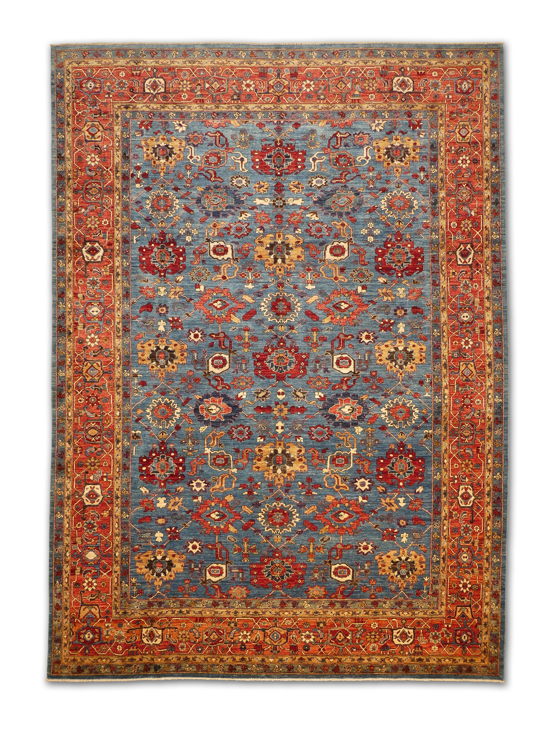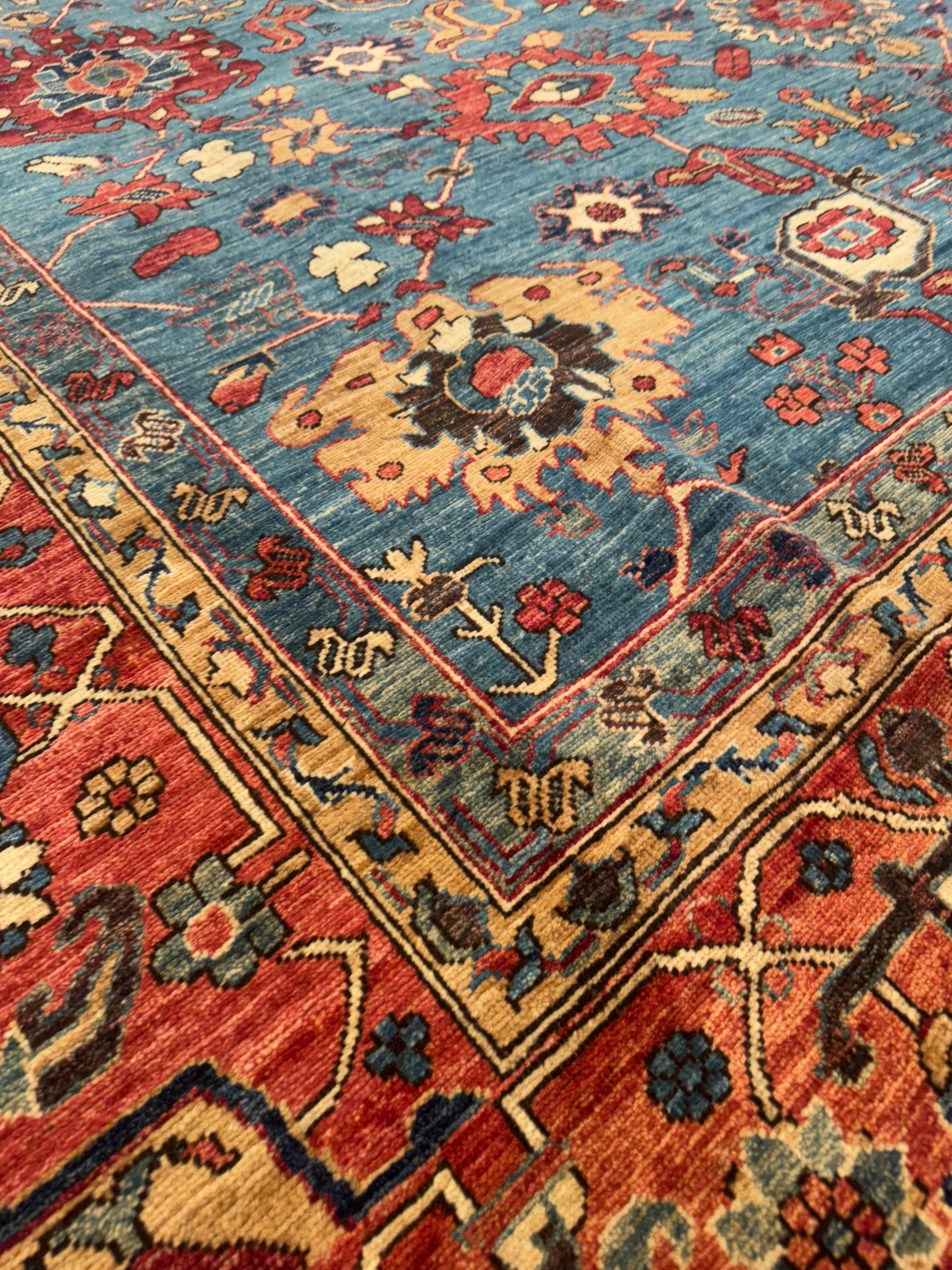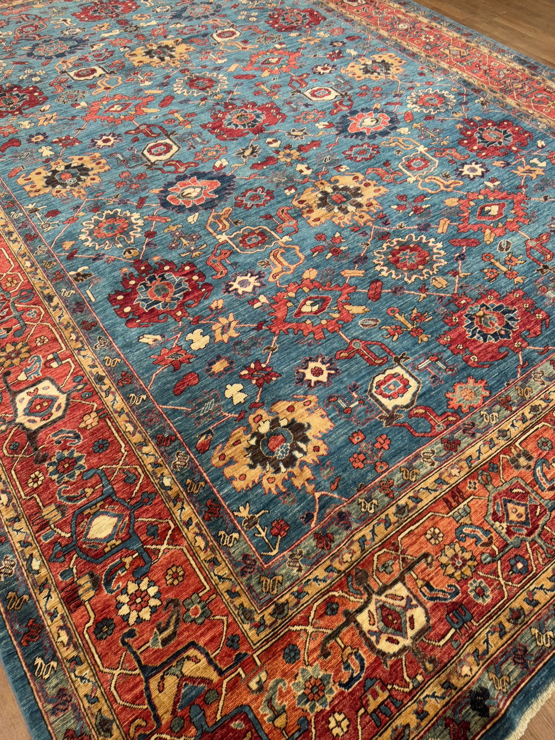 This handmade rug features an exquisite floral medallion pattern on a striking turquoise-blue field. The design is enriched with crimson, gold, ivory, and soft navy tones that create a vibrant yet balanced composition. Meticulously woven from fine wool, this rug combines traditional artistry with bold color harmony, adding depth and personality to any refined living space.