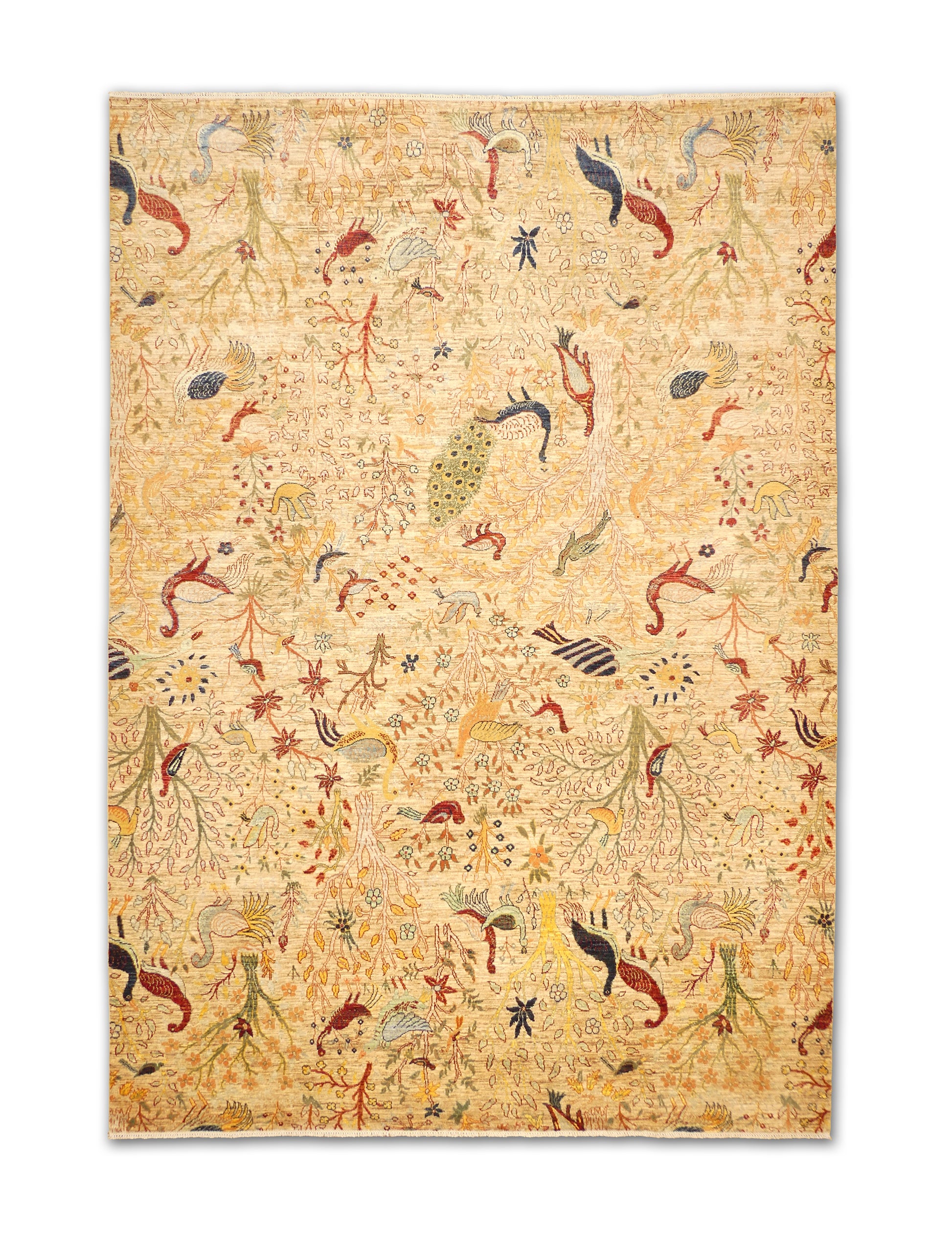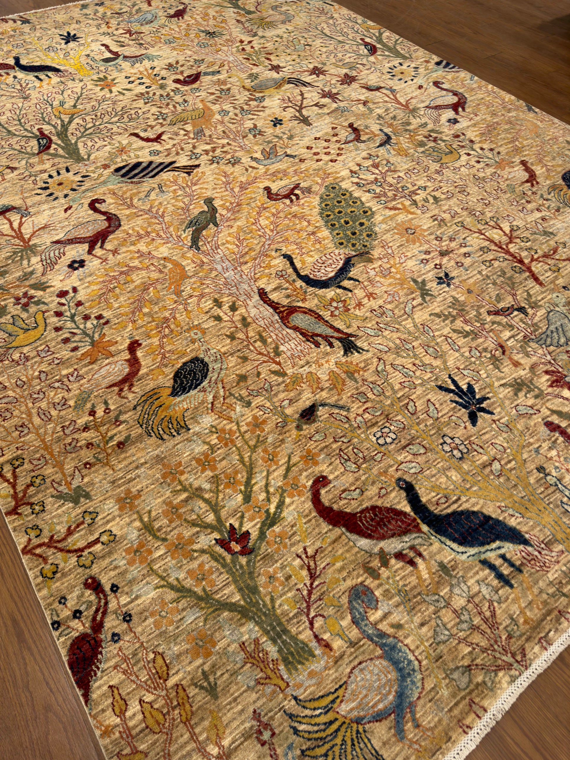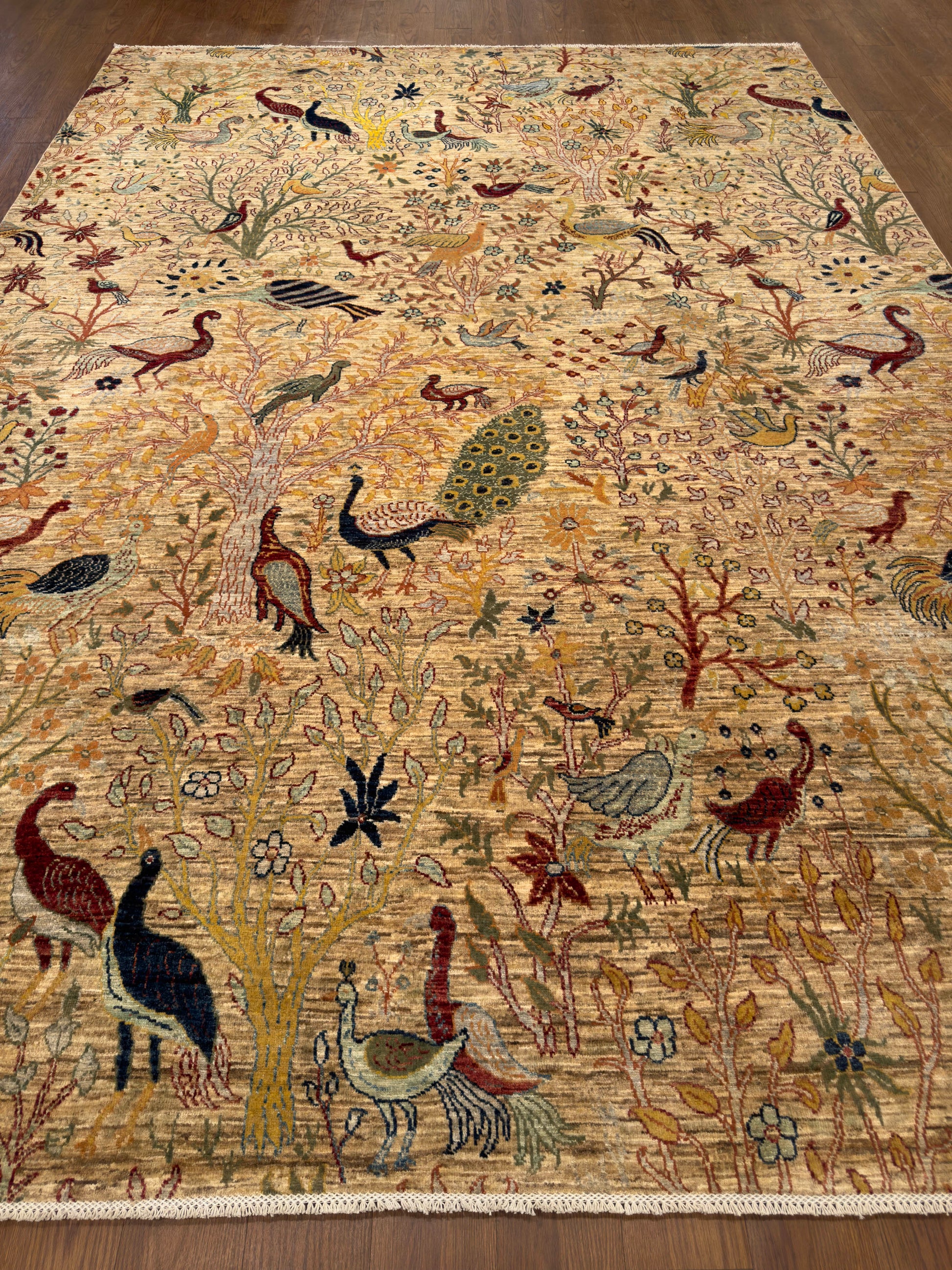This enchanting hand-knotted rug is alive with artistry, featuring a golden sand field richly decorated with playful birds, delicate branches, and blossoming florals in a tapestry-like design. Shades of deep indigo, soft sage, brick red, and gentle ochre add depth and movement, creating a lively rhythm across the surface. The whimsical, nature-inspired motifs bring a joyful character to the piece, making it both an elegant statement and a warm conversation starter. Perfect for eclectic living rooms, creative studios, or sunlit spaces that call for a touch of charm and vibrancy.