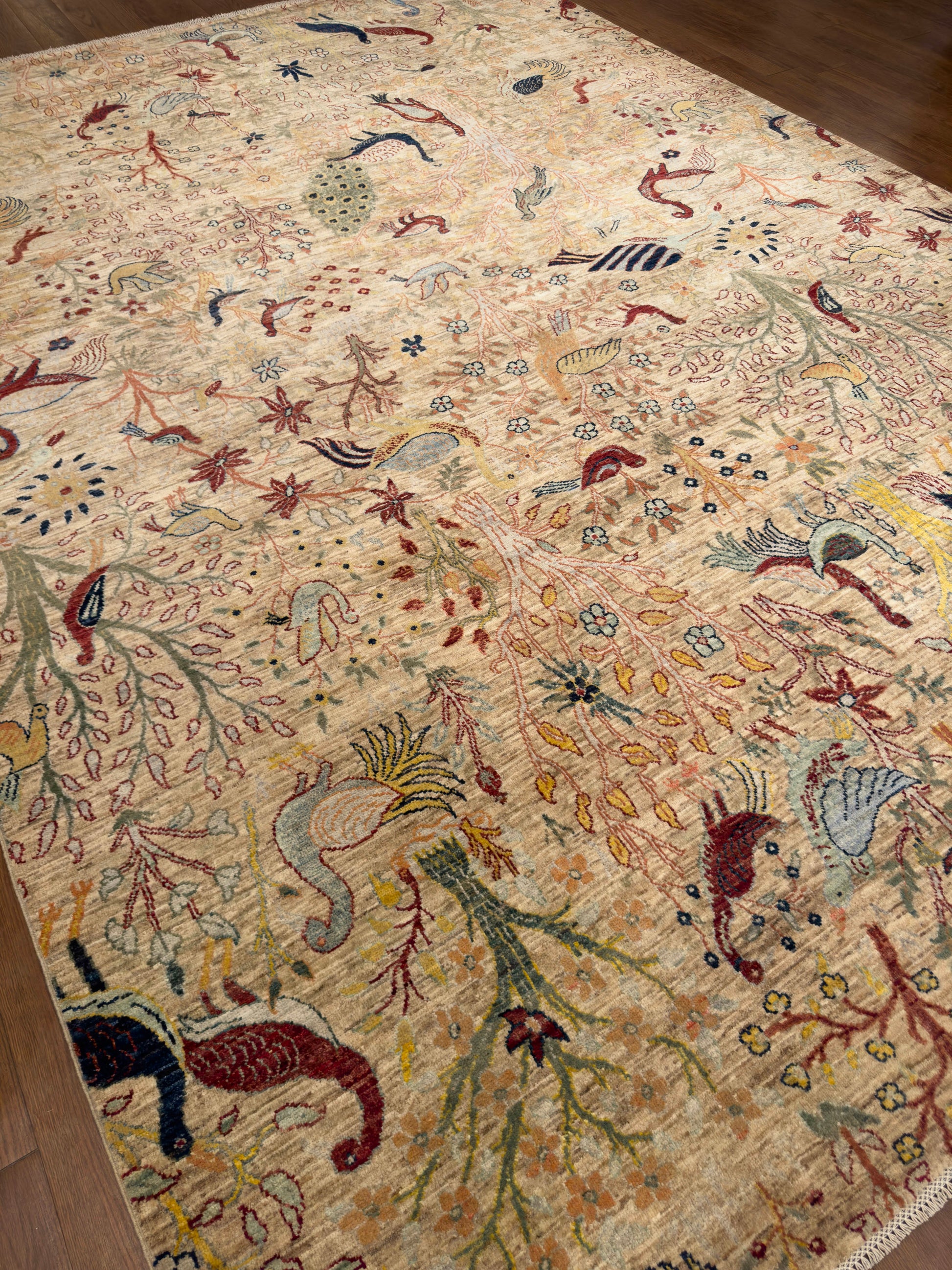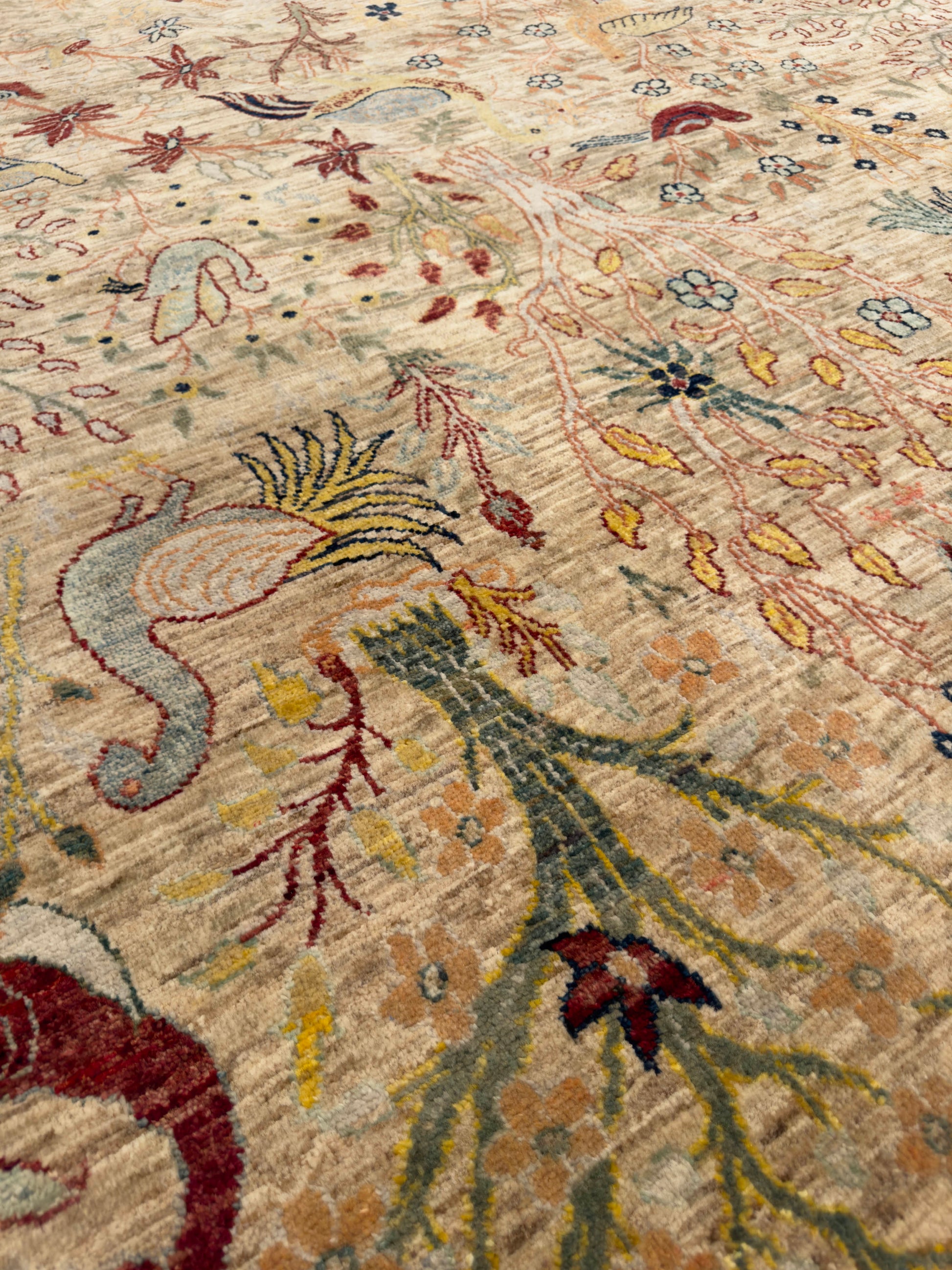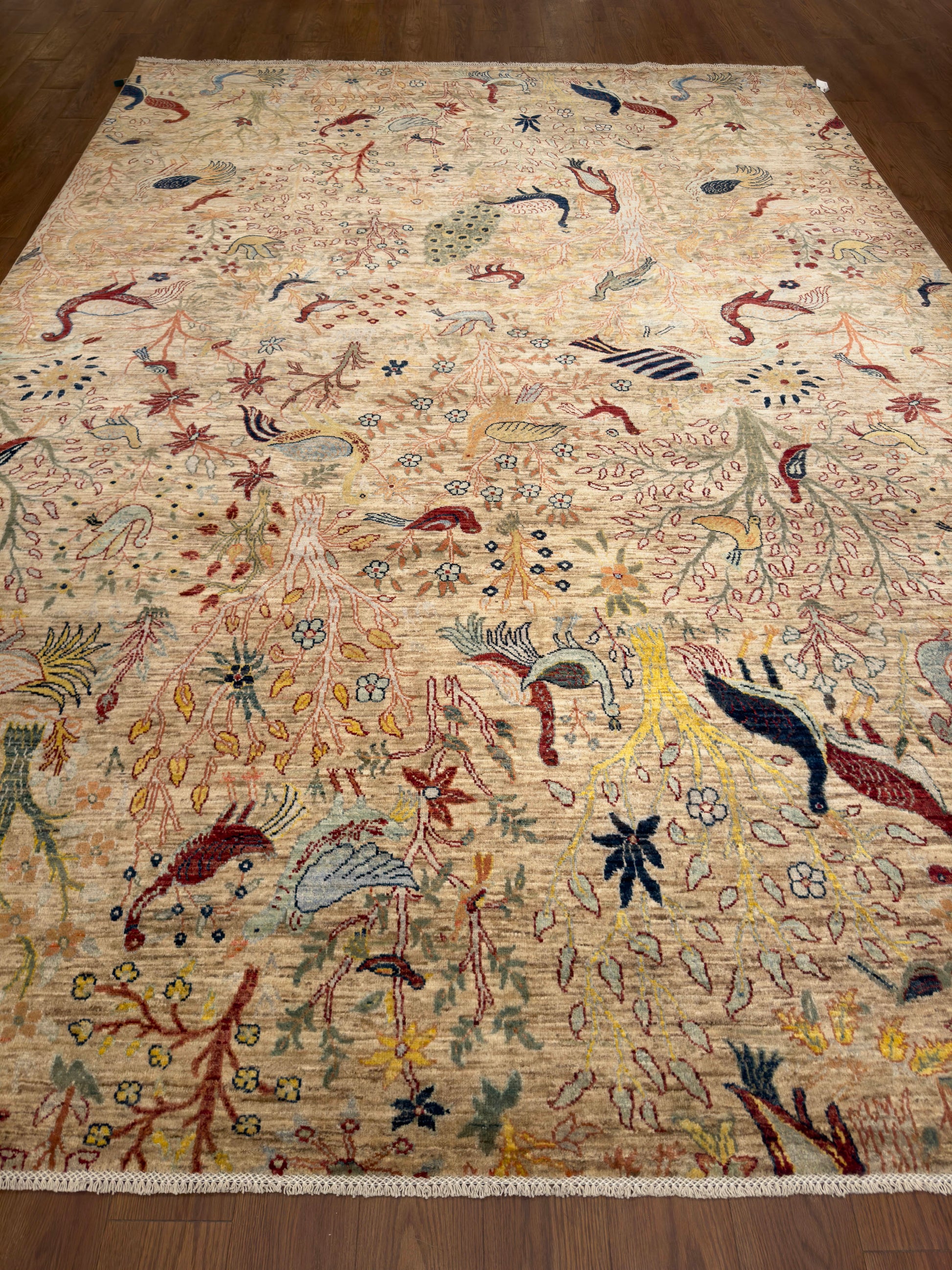This enchanting hand-knotted rug is alive with artistry, featuring a golden sand field richly decorated with playful birds, delicate branches, and blossoming florals in a tapestry-like design. Shades of deep indigo, soft sage, brick red, and gentle ochre add depth and movement, creating a lively rhythm across the surface. The whimsical, nature-inspired motifs bring a joyful character to the piece, making it both an elegant statement and a warm conversation starter. Perfect for eclectic living rooms, creative studios, or sunlit spaces that call for a touch of charm and vibrancy.