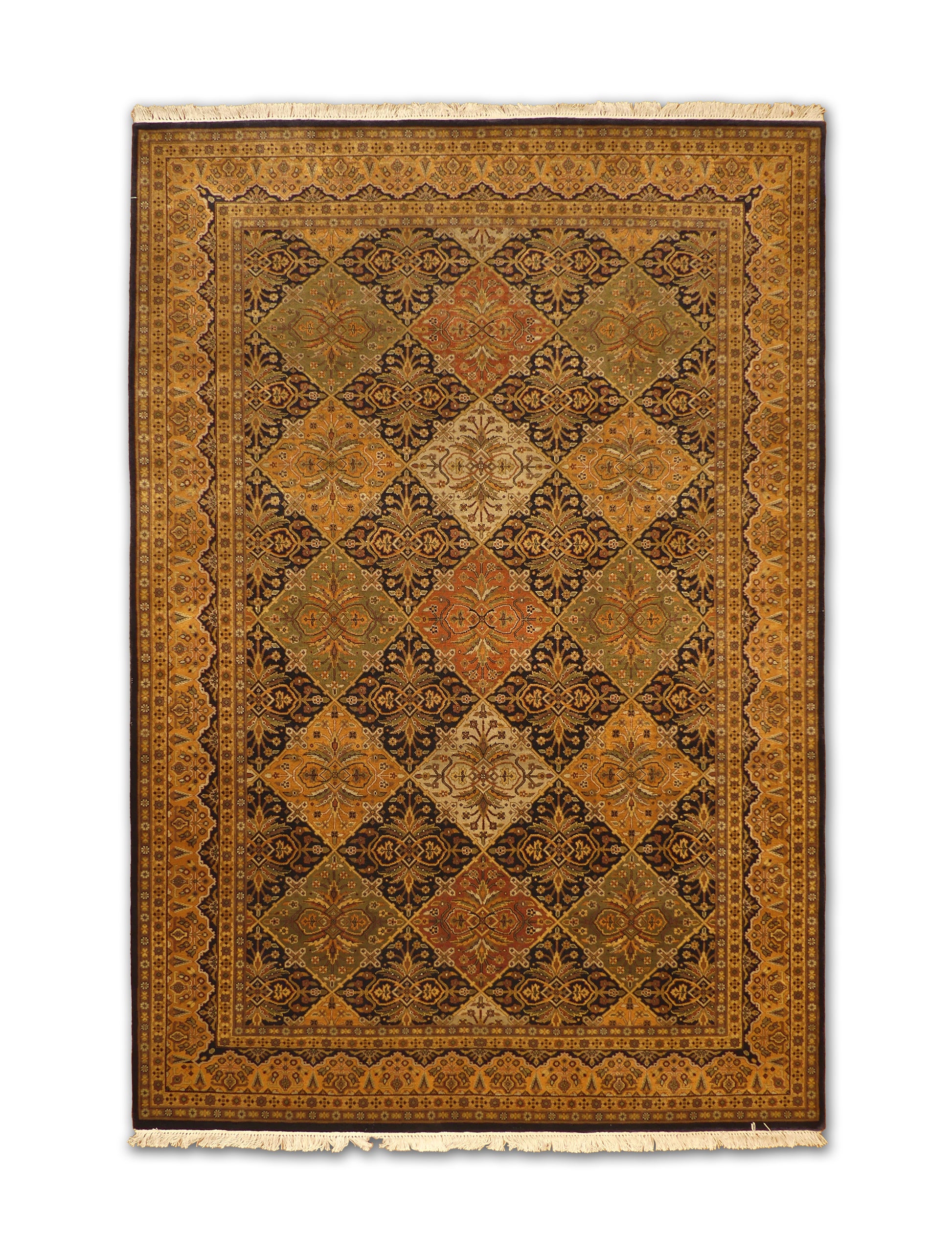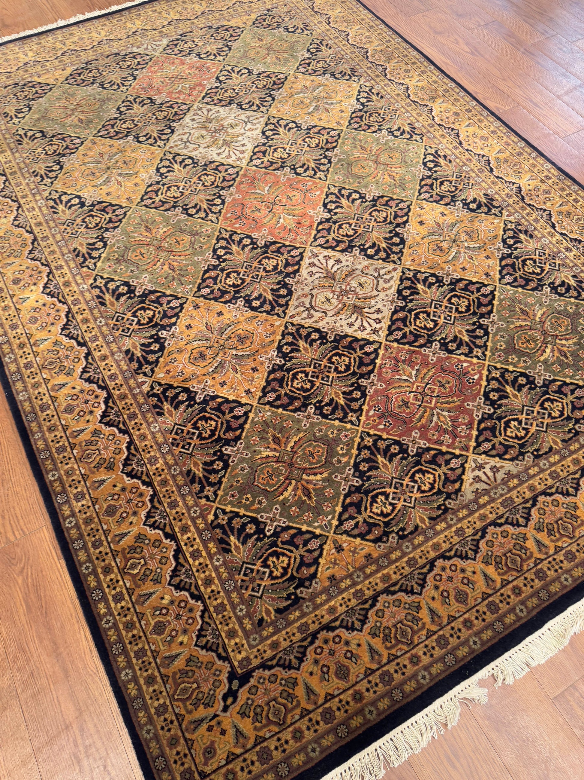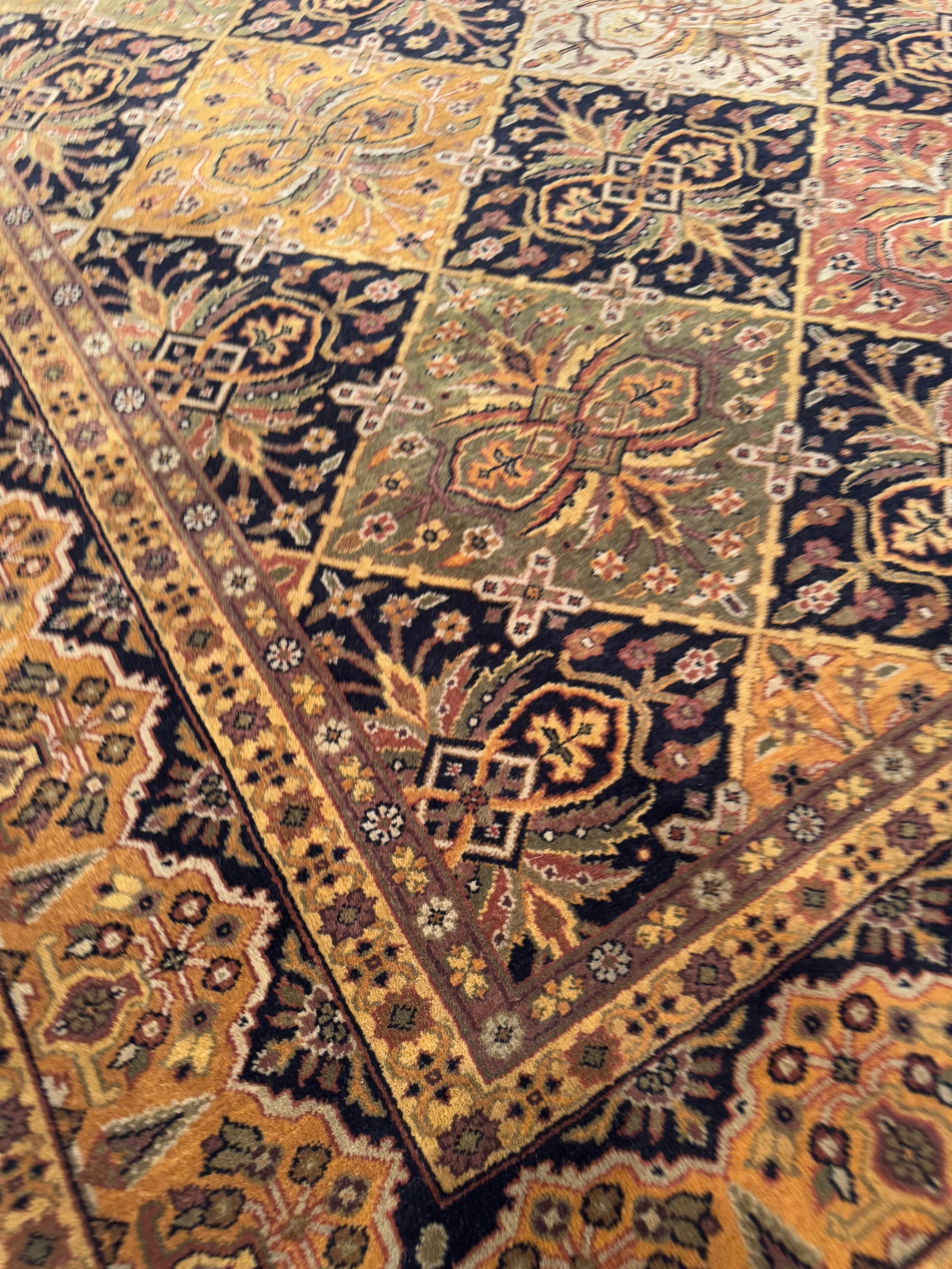 This hand-knotted rug showcases a striking lattice of diamond medallions, each filled with intricate floral motifs that alternate in soft tones of gold, green, rust, and ivory against a deep navy backdrop. The overall design creates a sense of symmetry and rhythm, while the layered border of palmettes and vine scrolls frames the piece with refined elegance. Its palette balances richness with subtlety, making it both decorative and versatile.