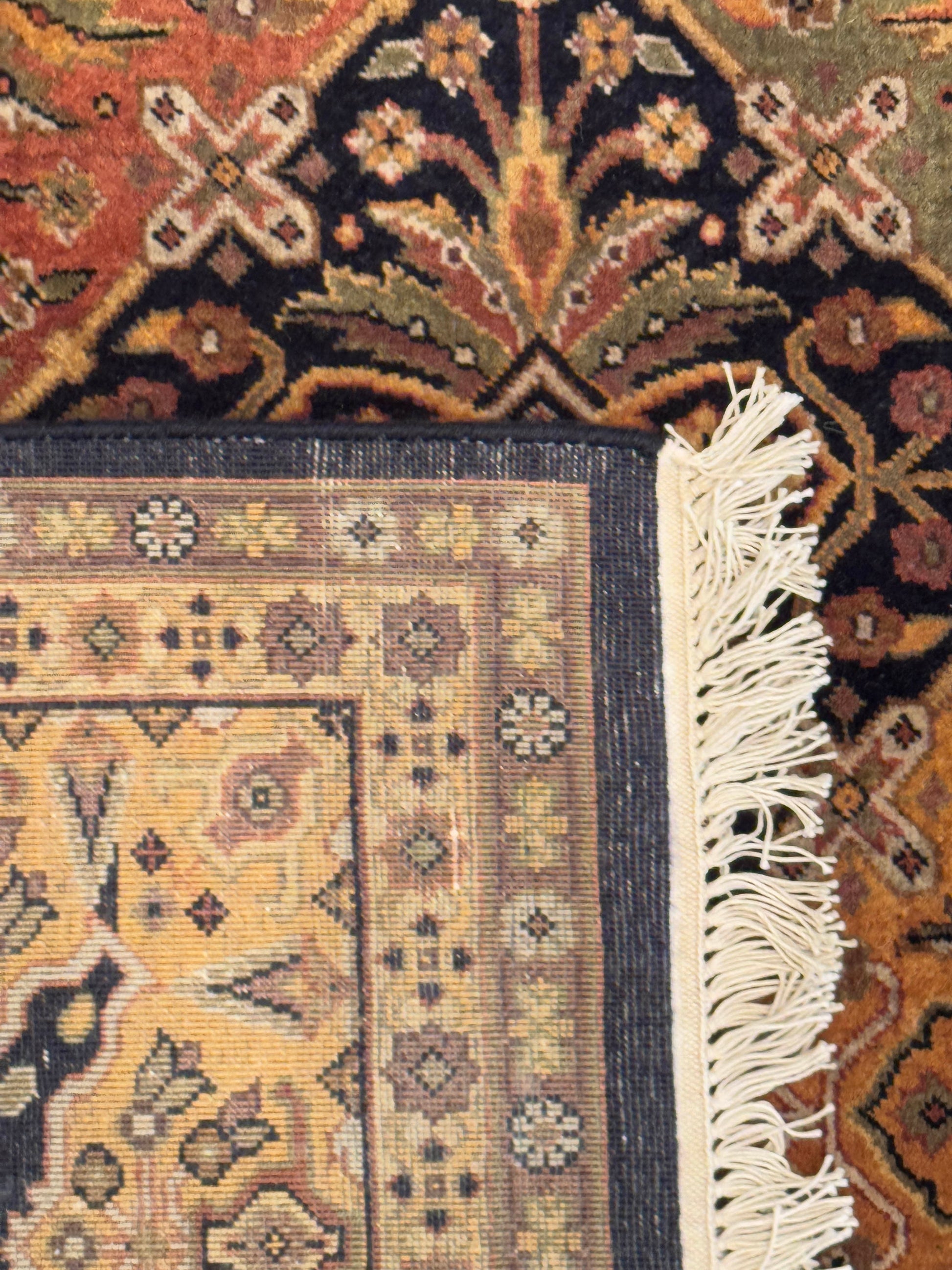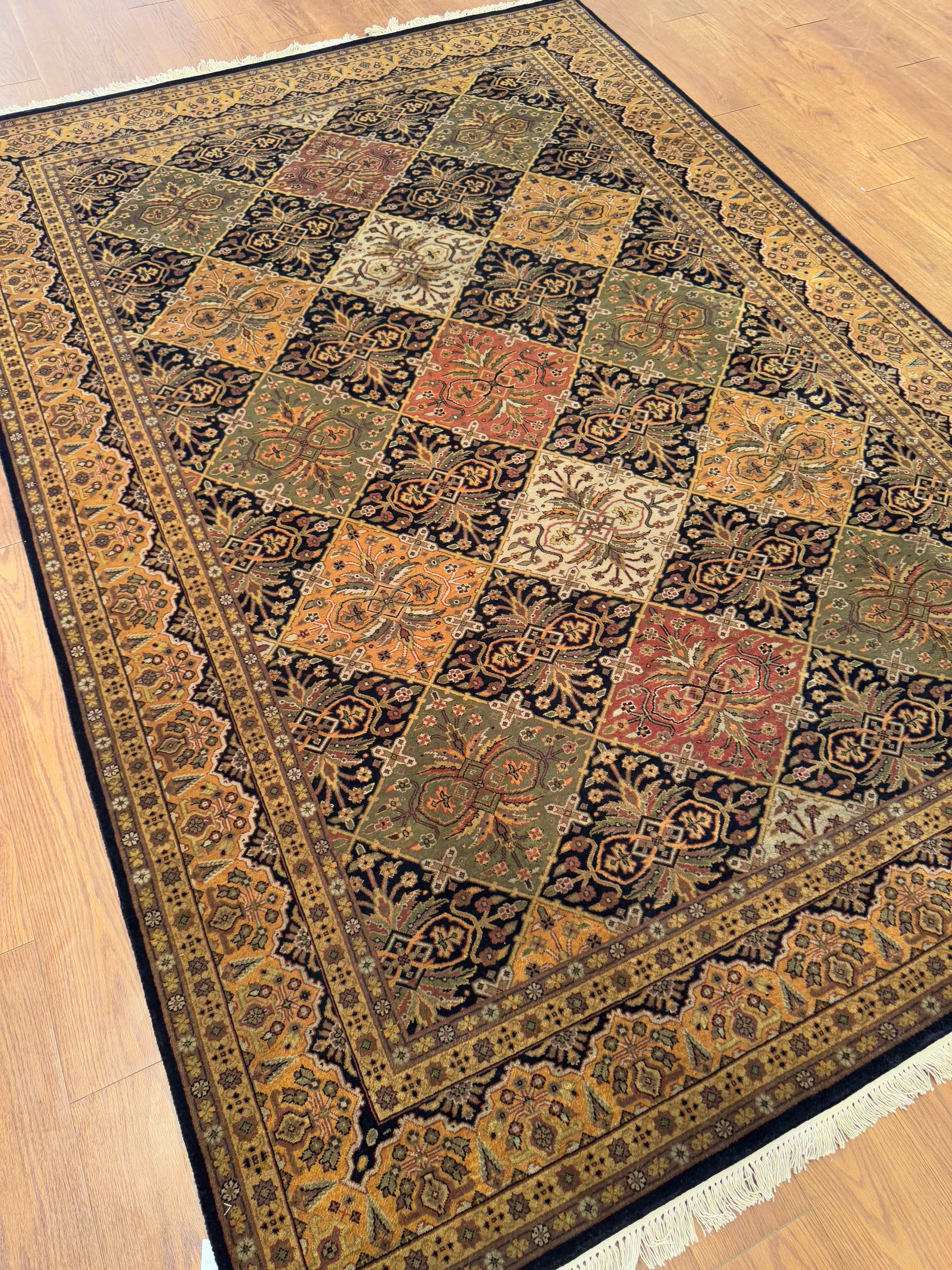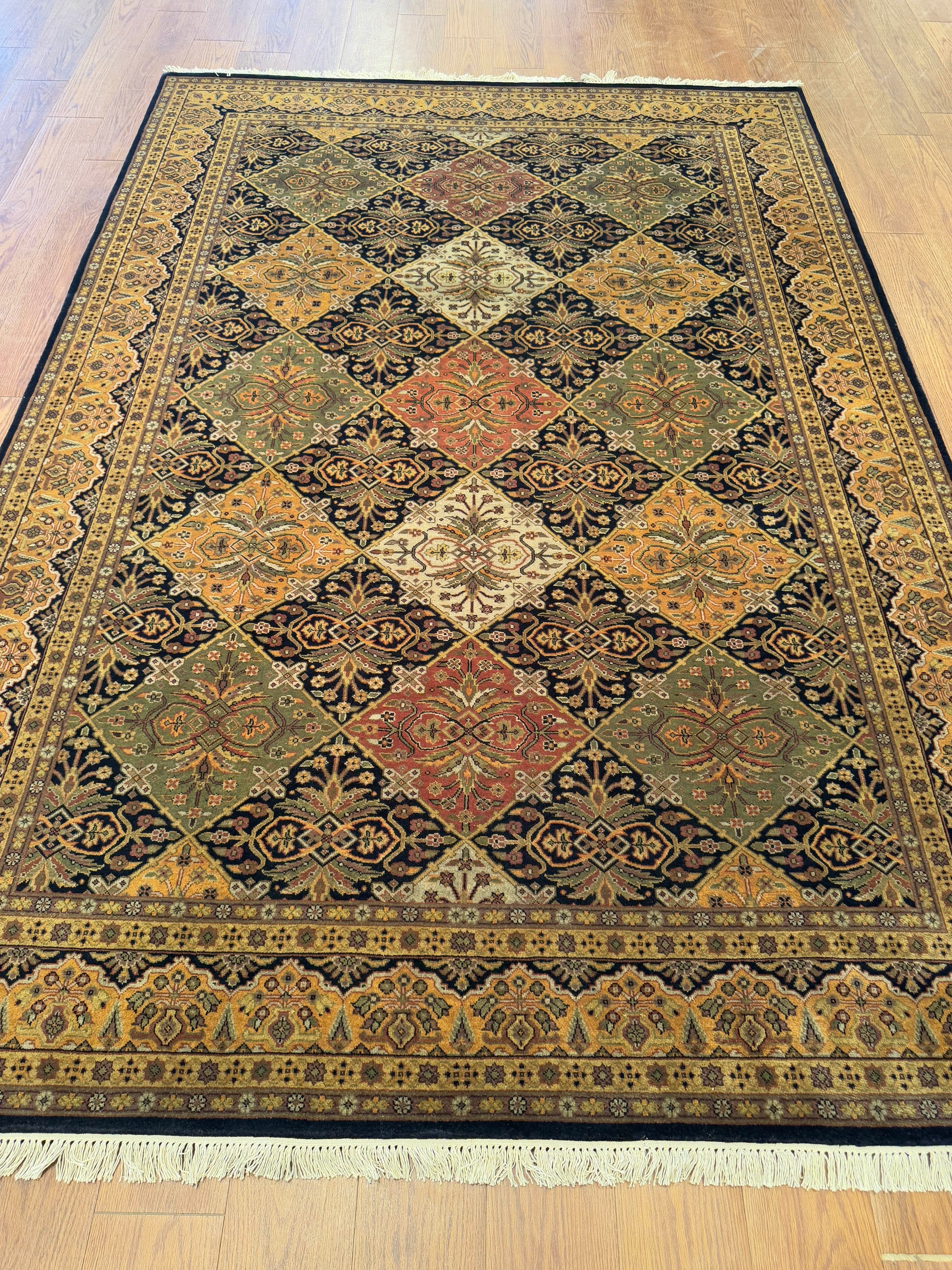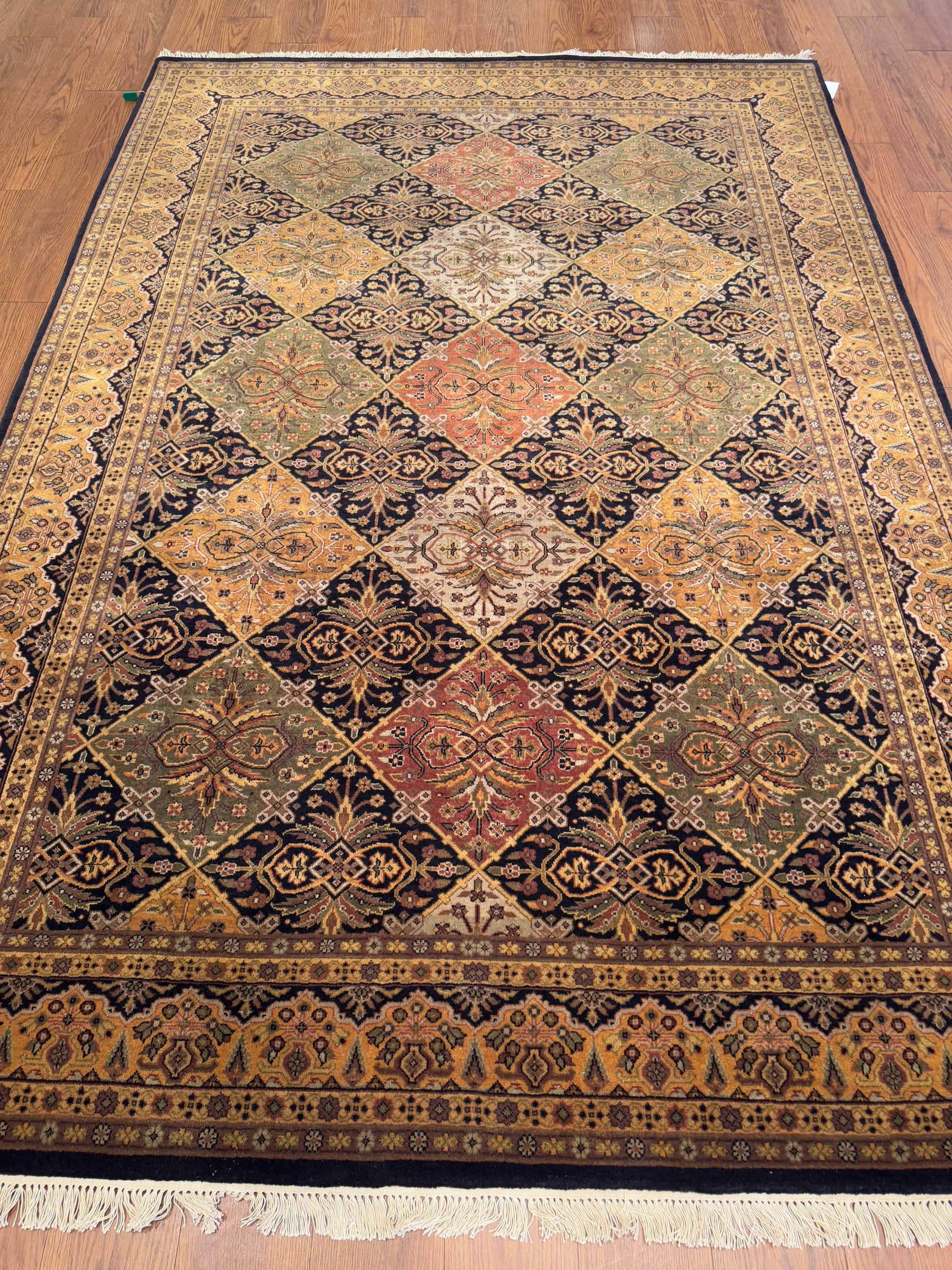 This hand-knotted rug showcases a striking lattice of diamond medallions, each filled with intricate floral motifs that alternate in soft tones of gold, green, rust, and ivory against a deep navy backdrop. The overall design creates a sense of symmetry and rhythm, while the layered border of palmettes and vine scrolls frames the piece with refined elegance. Its palette balances richness with subtlety, making it both decorative and versatile.