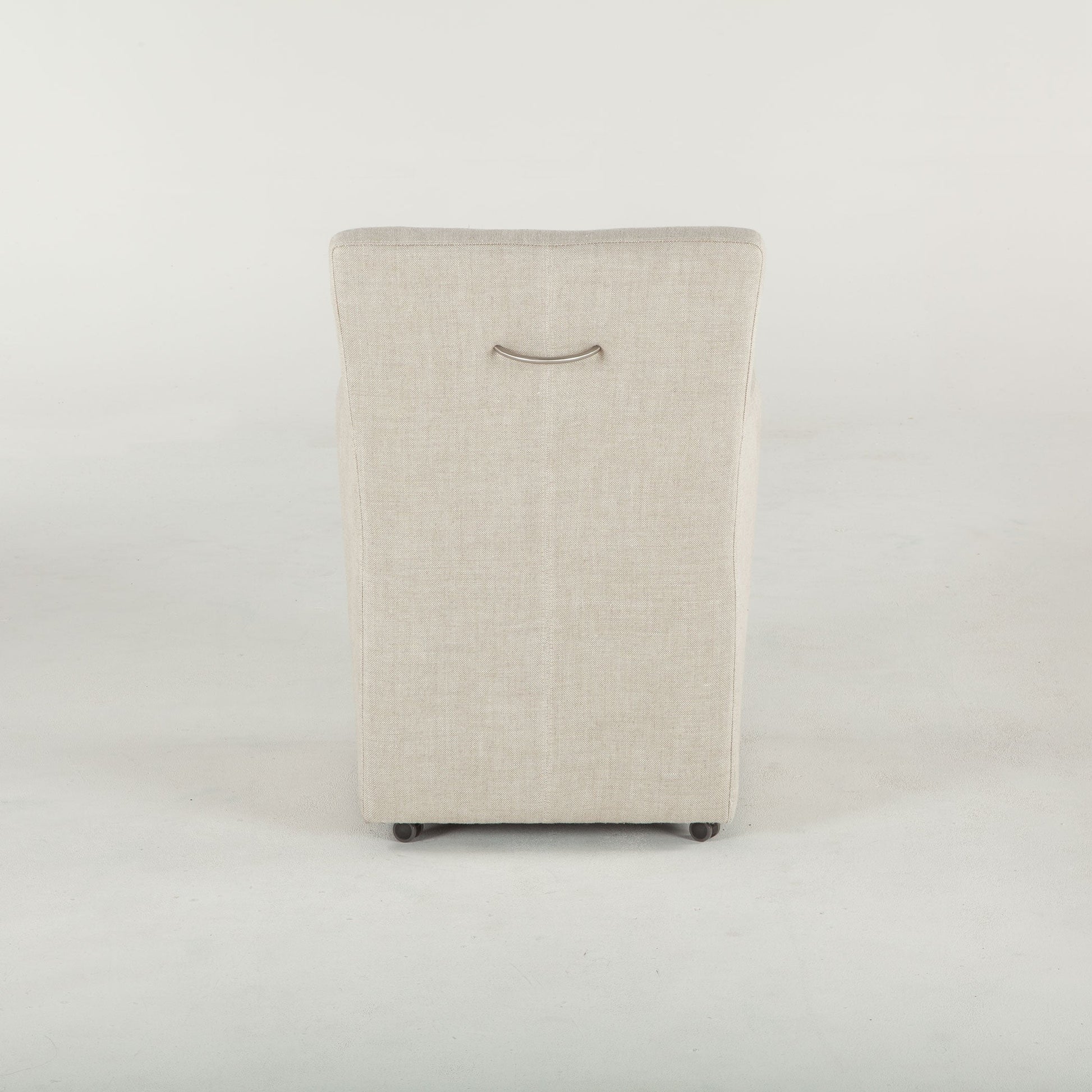 This upholstered armchair blends classic tailoring with modern versatility. Wrapped in soft beige linen, it features a gracefully curved backrest and refined stitching that enhance both comfort and elegance. The sturdy birch wood frame ensures durability, while discreet rolling casters allow for effortless mobility. Ideal for dining rooms, offices, or boutique interiors, it offers timeless style with functional sophistication.