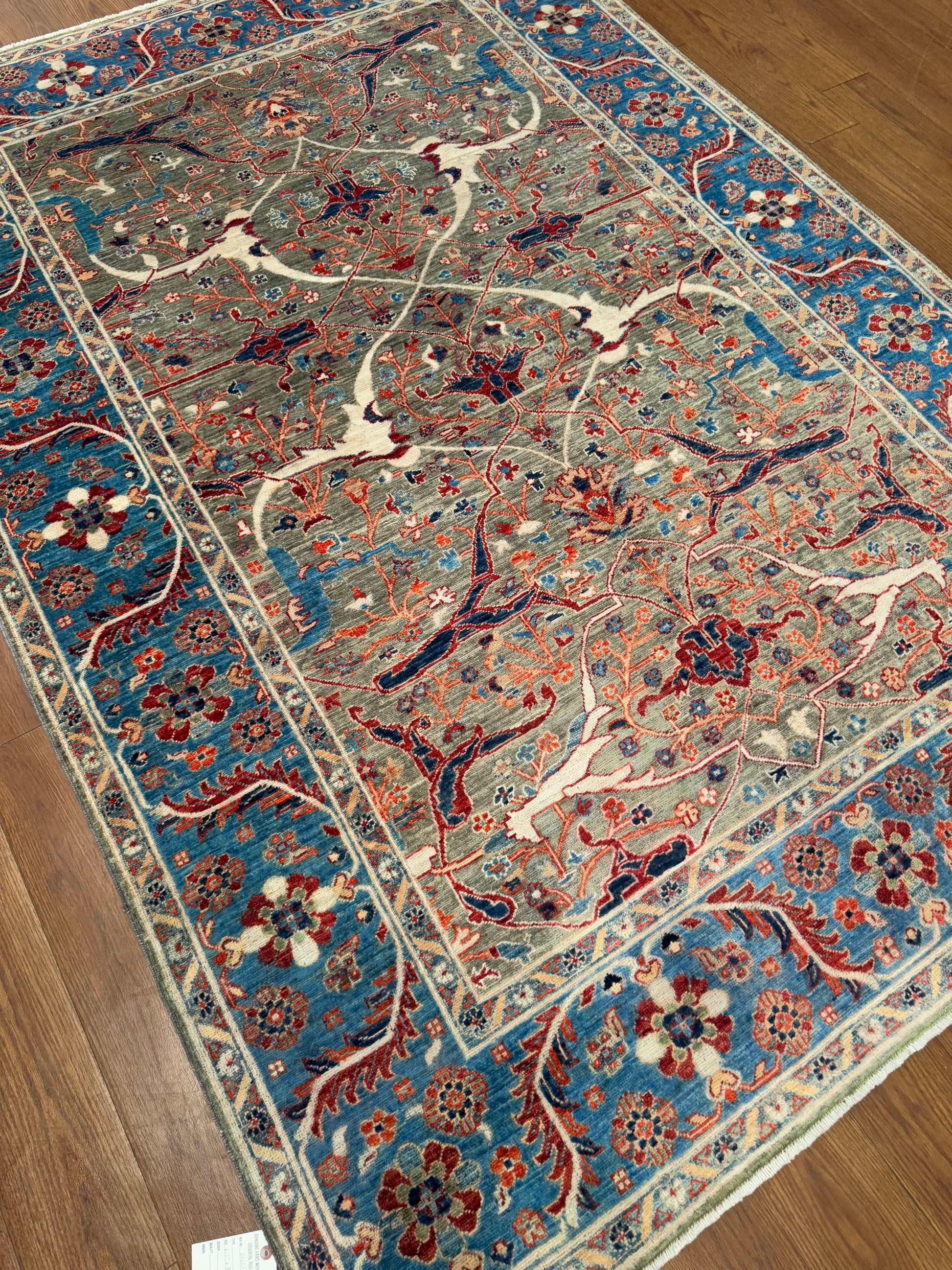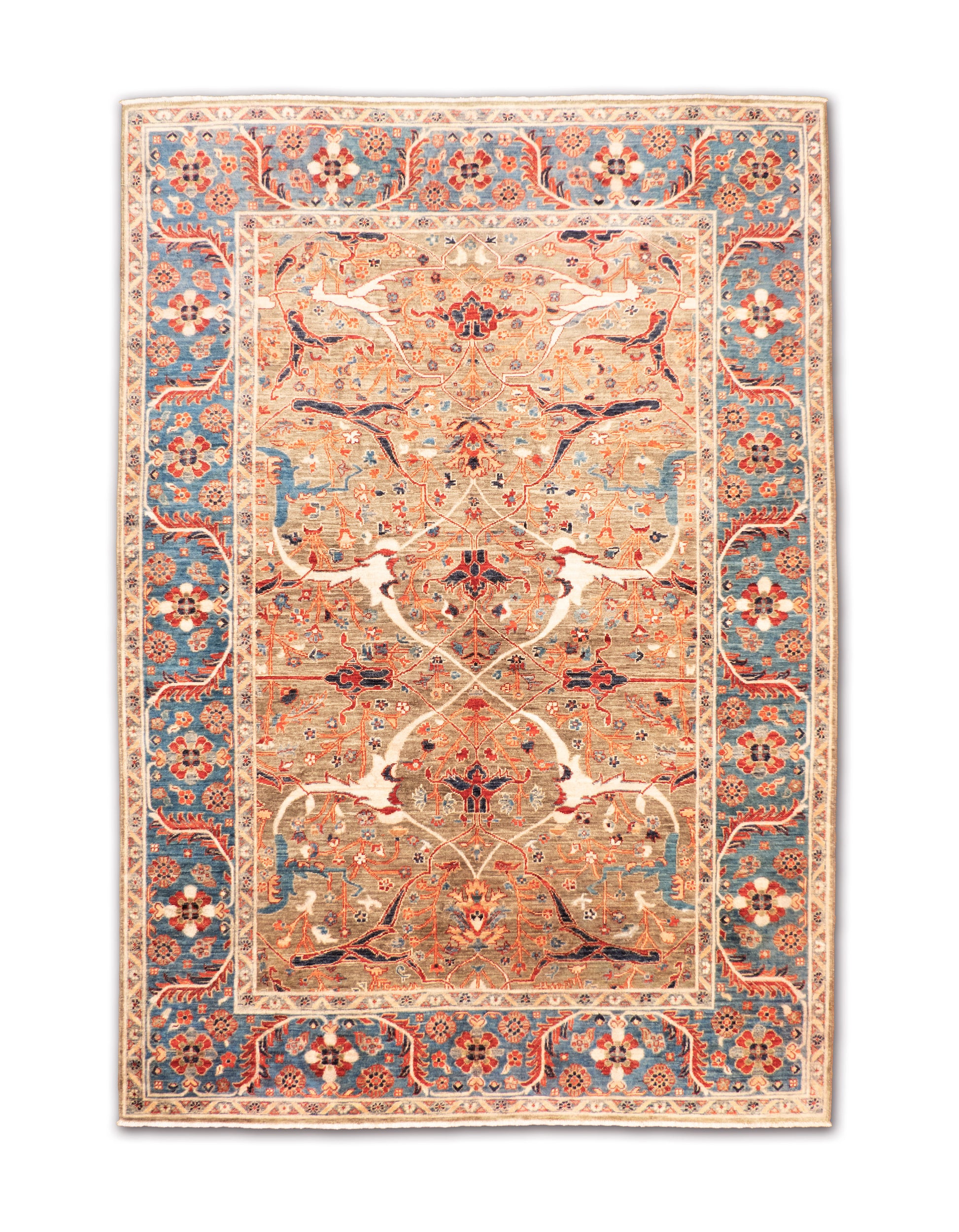 This refined hand-knotted rug showcases an intricate floral medallion design, beautifully balanced across a soft beige and slate-gray field. Accented with vibrant tones of red, blue, and ivory, the detailed border frames the central motifs with elegance and harmony. A timeless piece that blends traditional artistry with rich, luminous colors.
