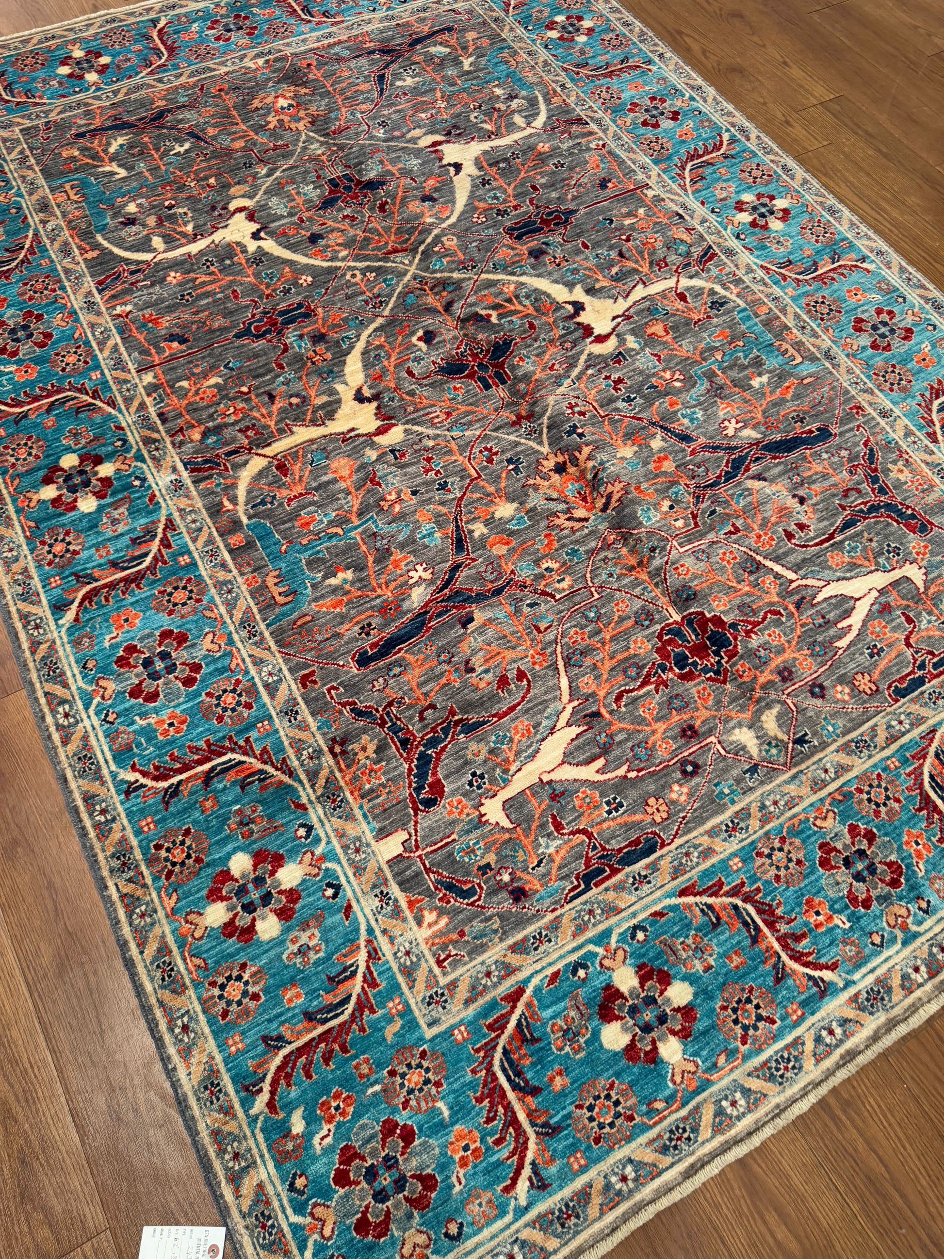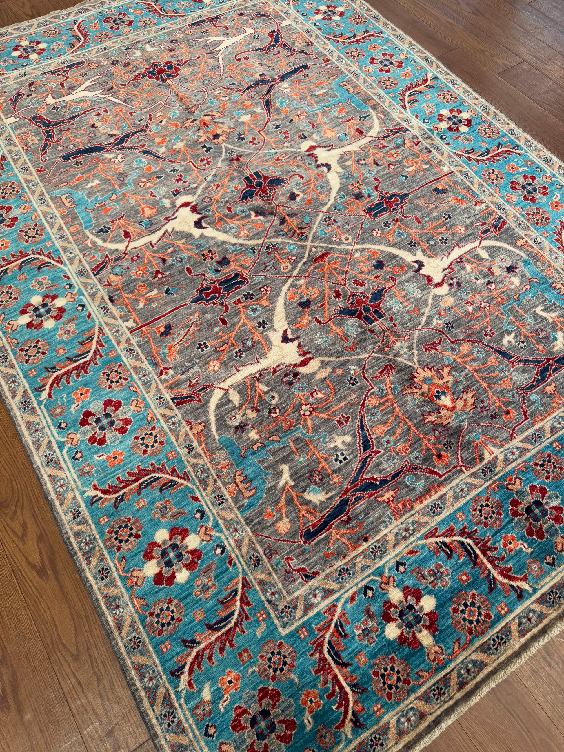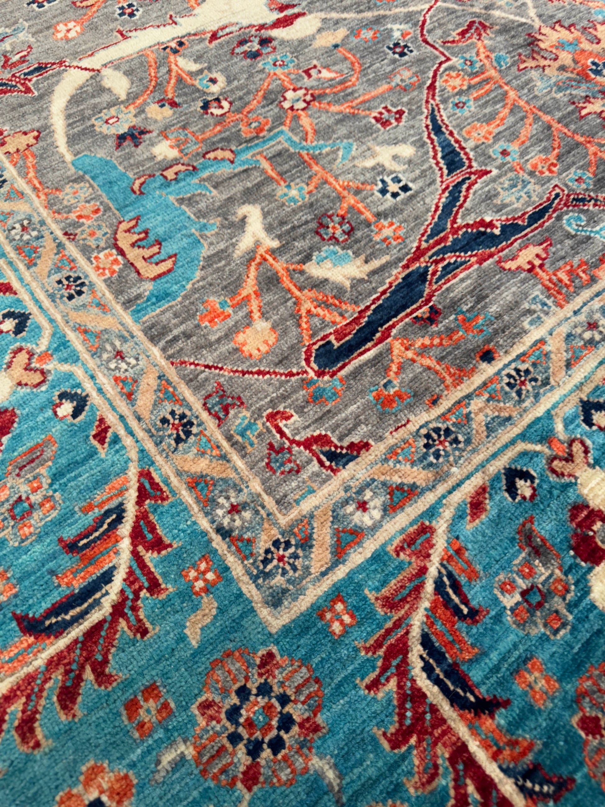 This exquisite hand-knotted rug features a bold central medallion framed by intricate floral and vine motifs. The striking turquoise border contrasts beautifully with the gray and deep red field, while ivory and navy accents bring balance and depth to the design. Its fine detailing and vibrant color palette make it an elegant statement piece for both traditional and transitional interiors.