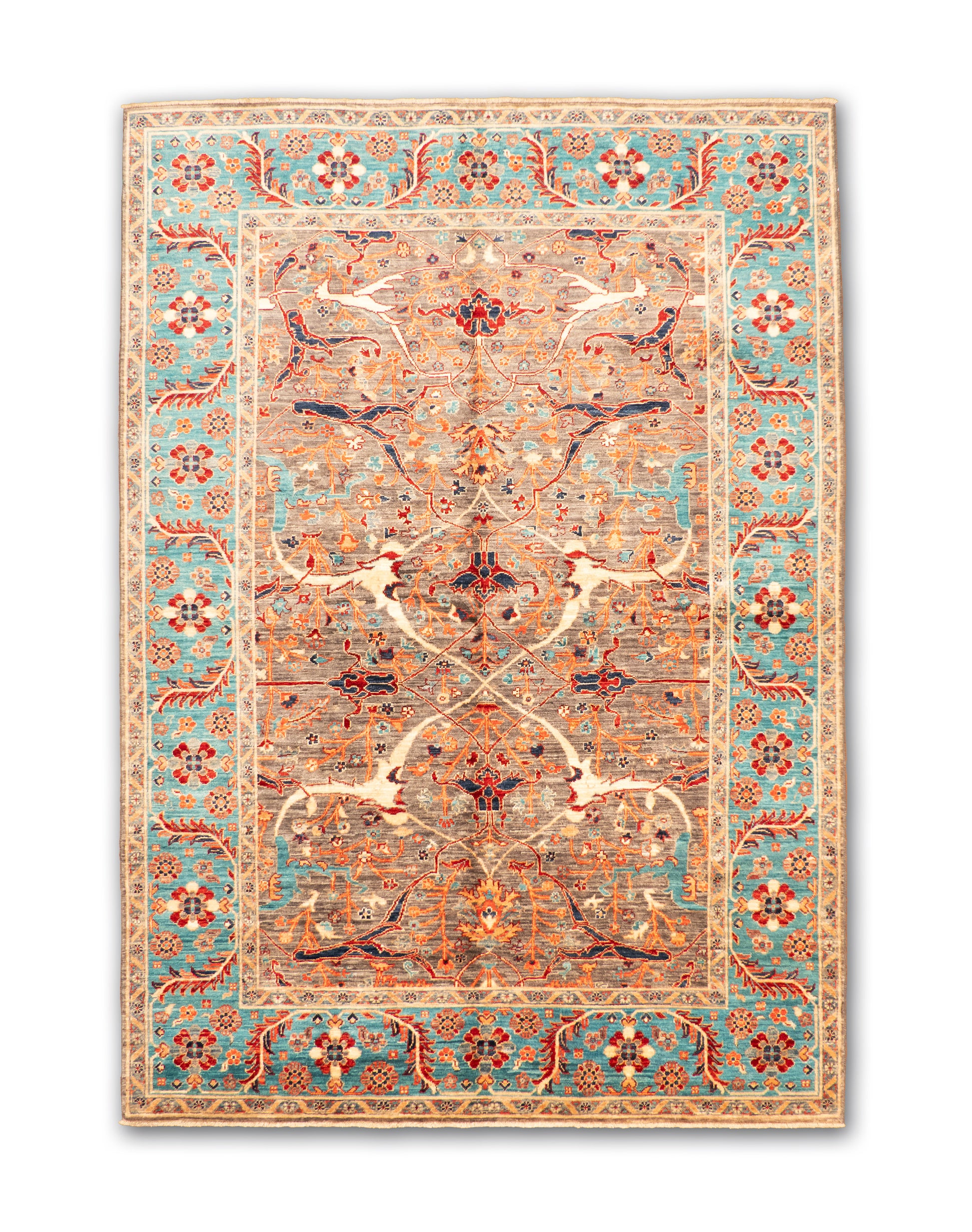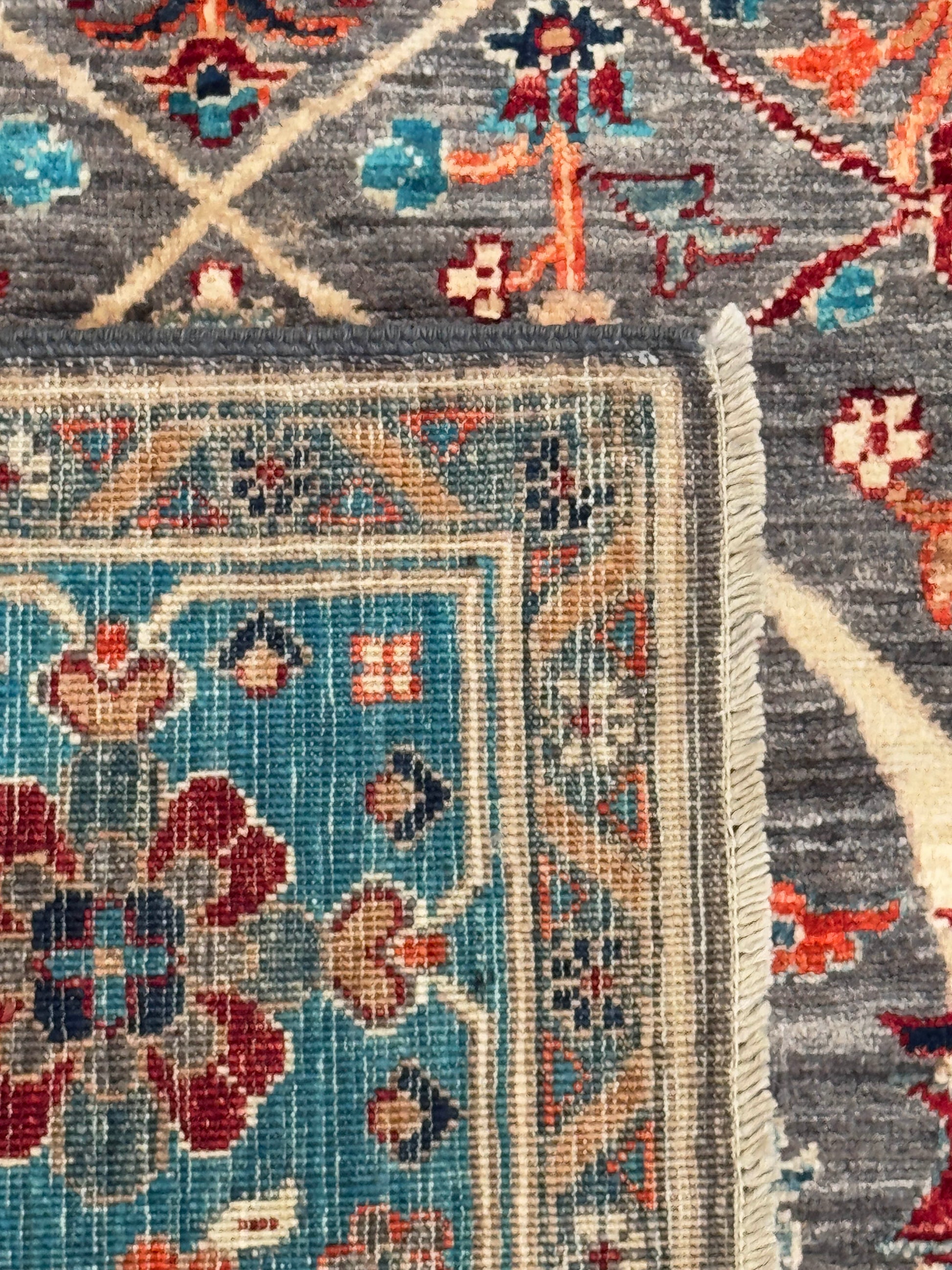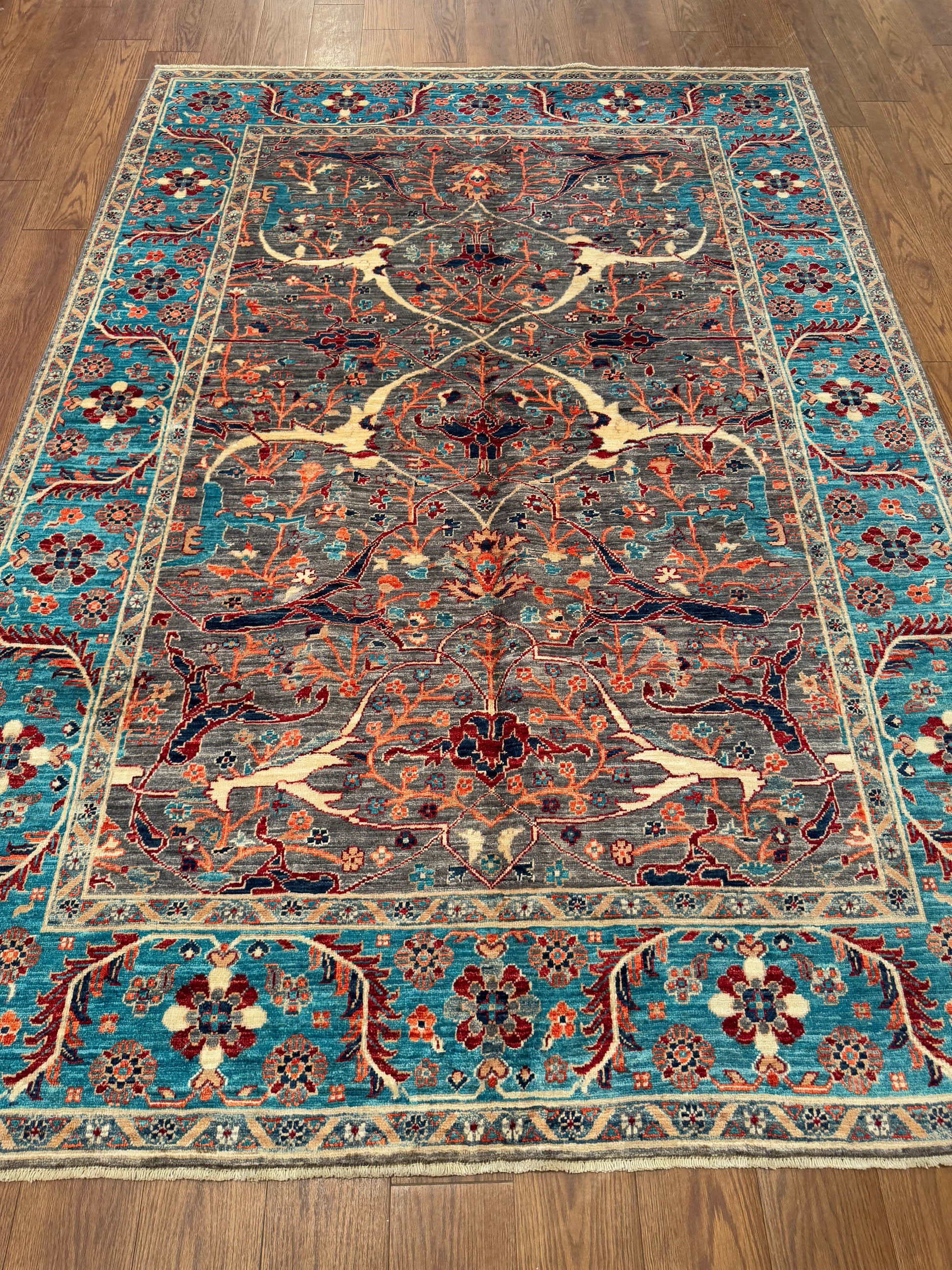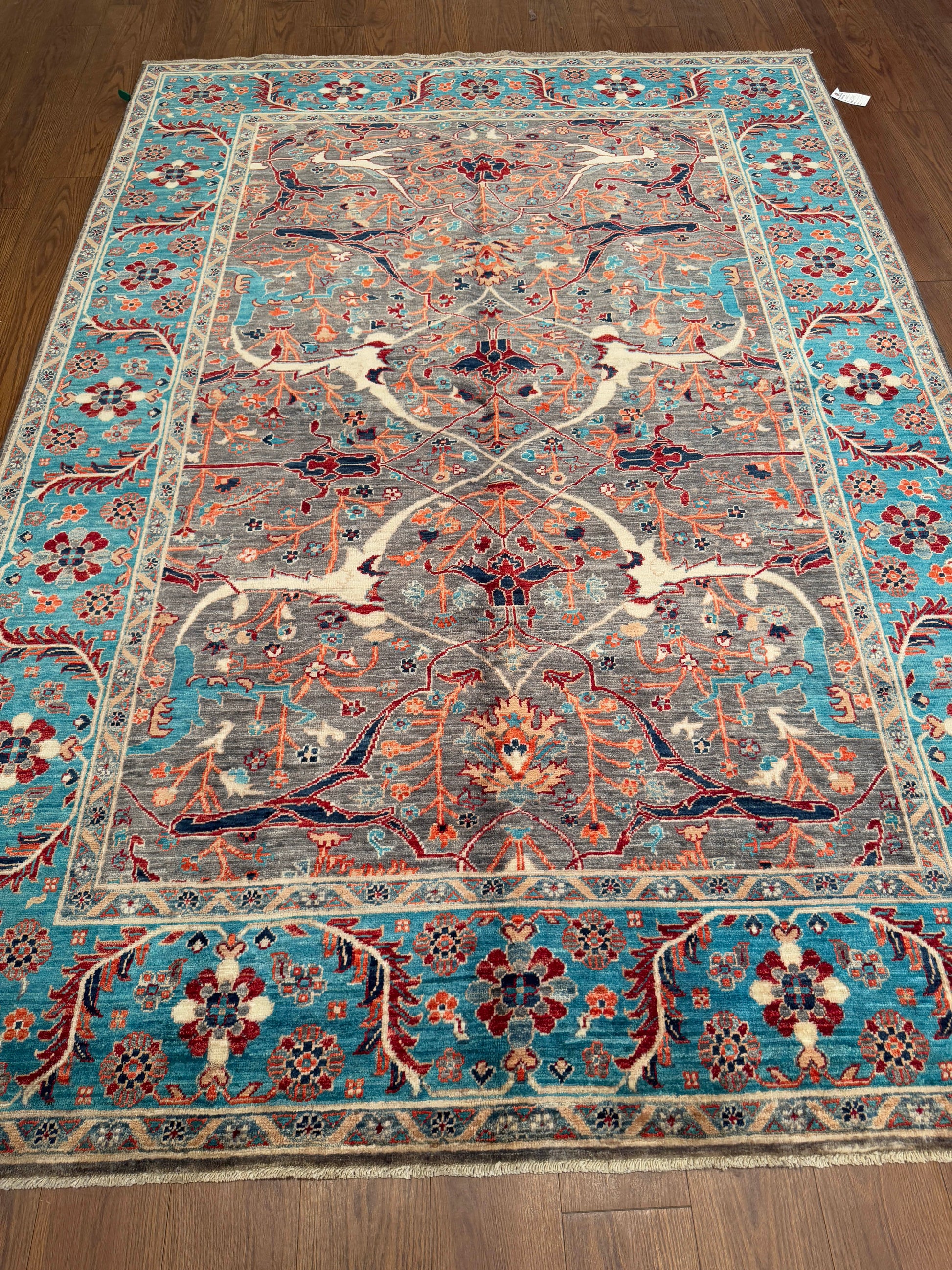 This exquisite hand-knotted rug features a bold central medallion framed by intricate floral and vine motifs. The striking turquoise border contrasts beautifully with the gray and deep red field, while ivory and navy accents bring balance and depth to the design. Its fine detailing and vibrant color palette make it an elegant statement piece for both traditional and transitional interiors.