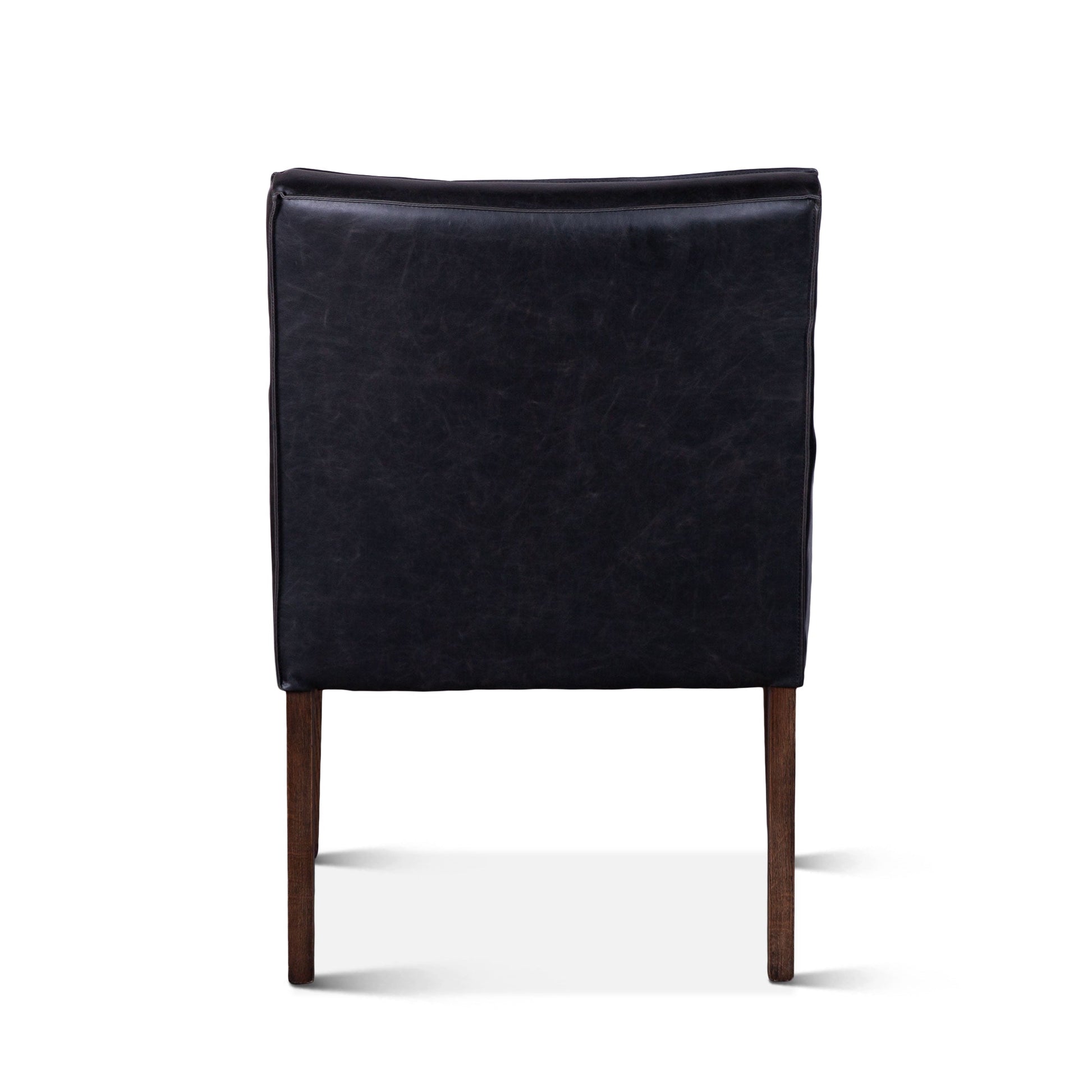 This dining armchair combines bold modern style with sustainable design. Upholstered in eco-friendly black leather, it features a stitched square backrest that adds depth and texture. The solid hardwood frame and dark-finished legs provide strength and contrast, complementing both industrial and contemporary interiors. Perfect for refined dining spaces or boutique hospitality settings, it offers comfort, durability, and timeless sophistication.