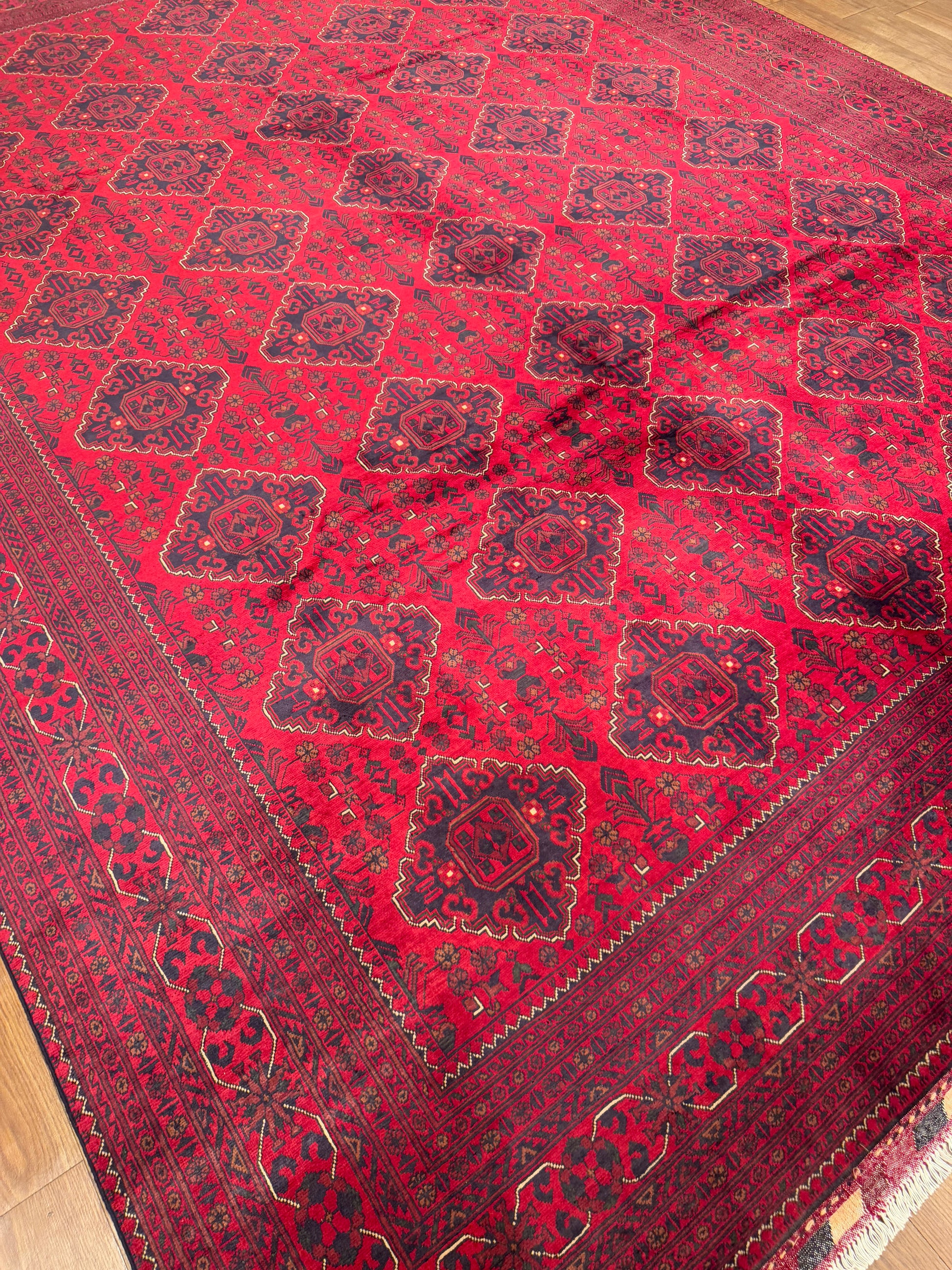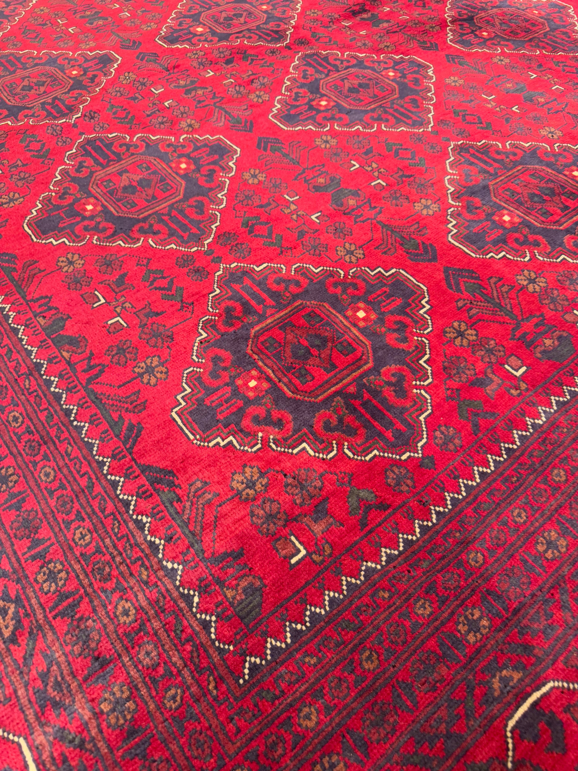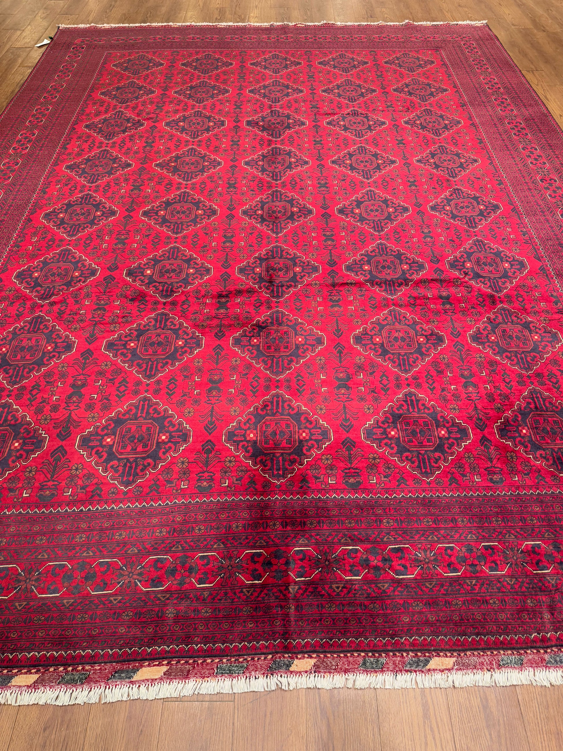 This stunning handwoven rug commands attention with its deep crimson field, adorned with repeating diamond-shaped medallions in dark navy and black. The rich contrast of colors creates an atmosphere of bold sophistication, while the intricate border adds rhythm and balance. Its enduring design and deep hues bring warmth and structure to any interior setting.