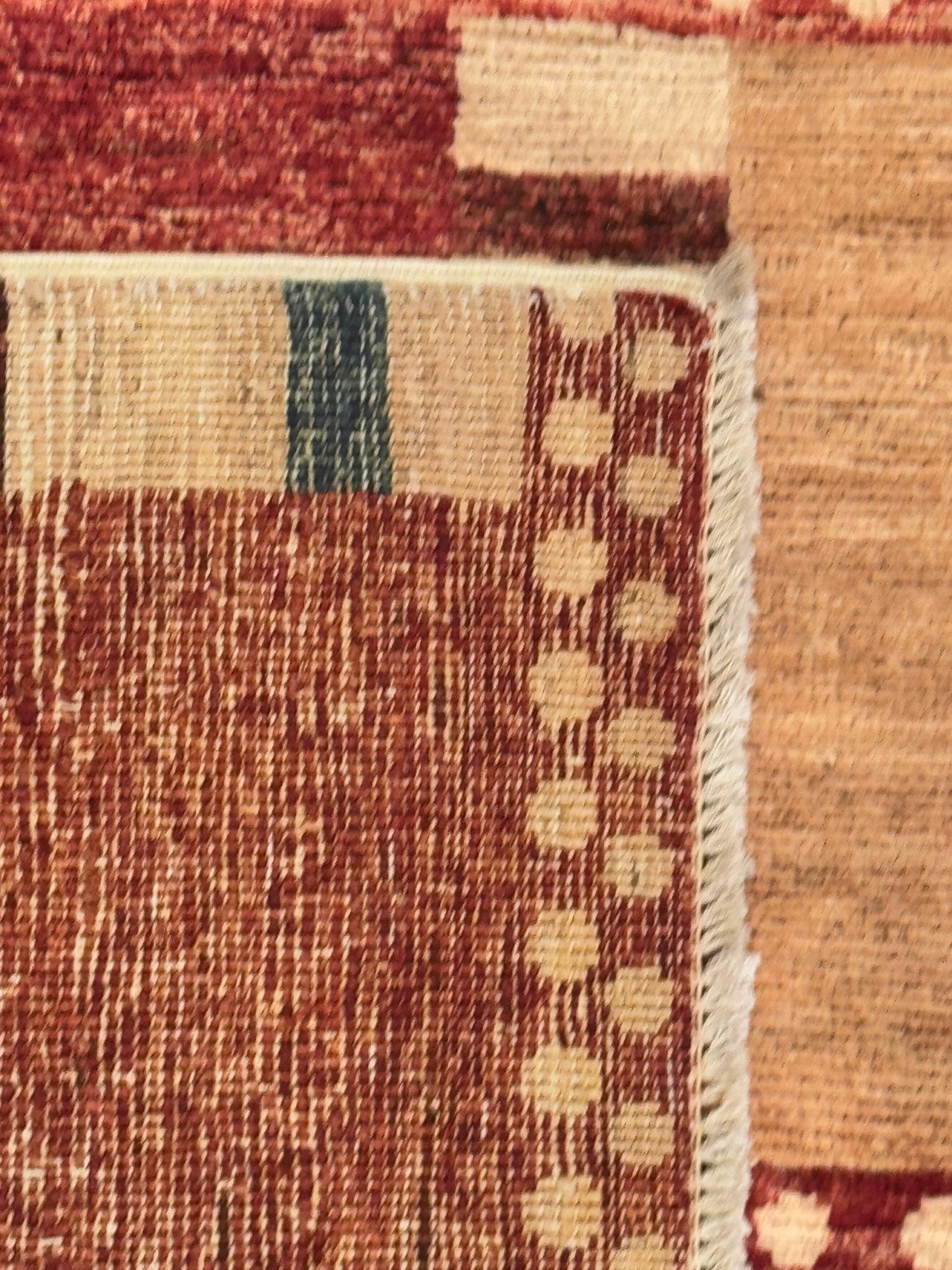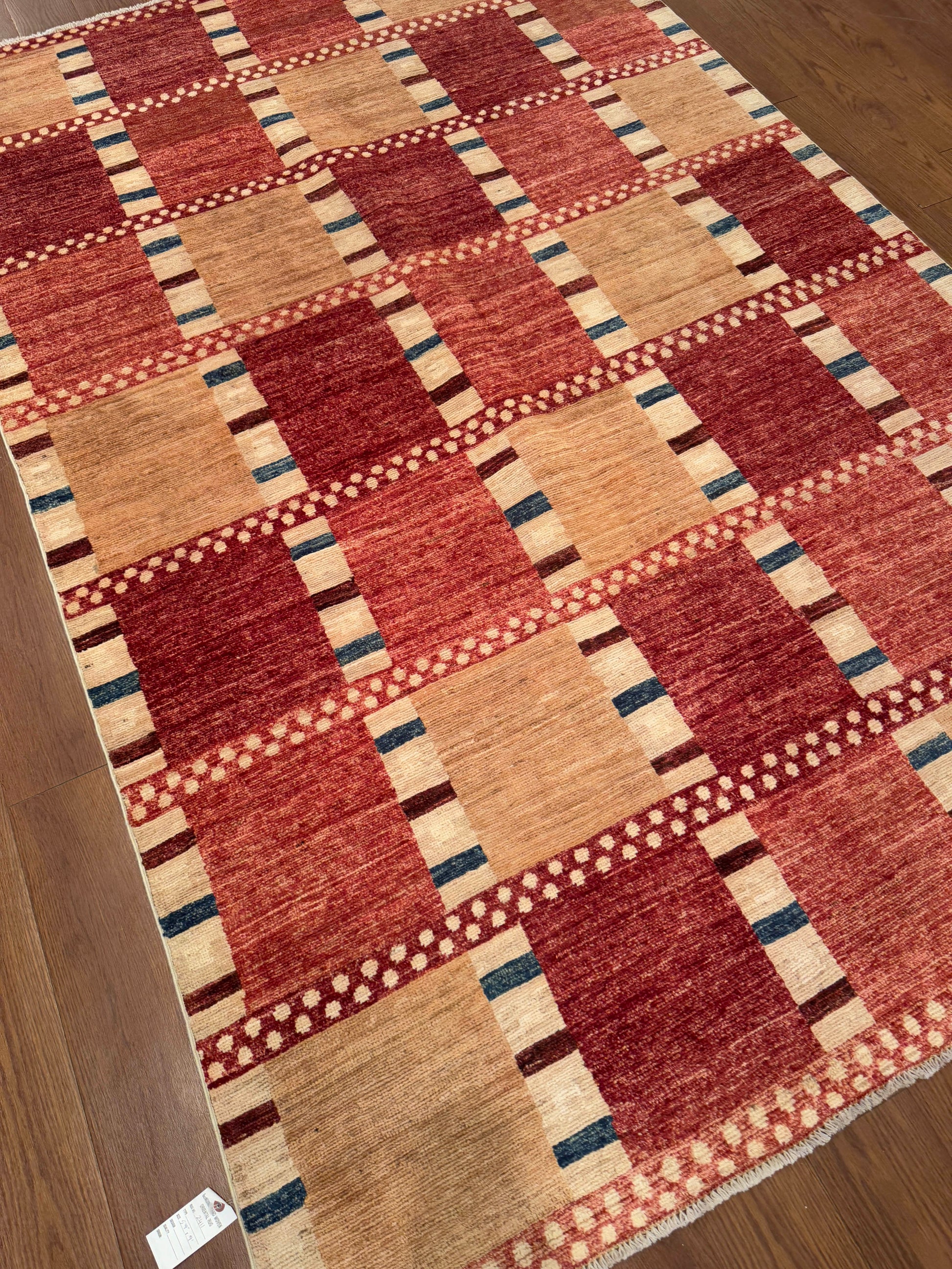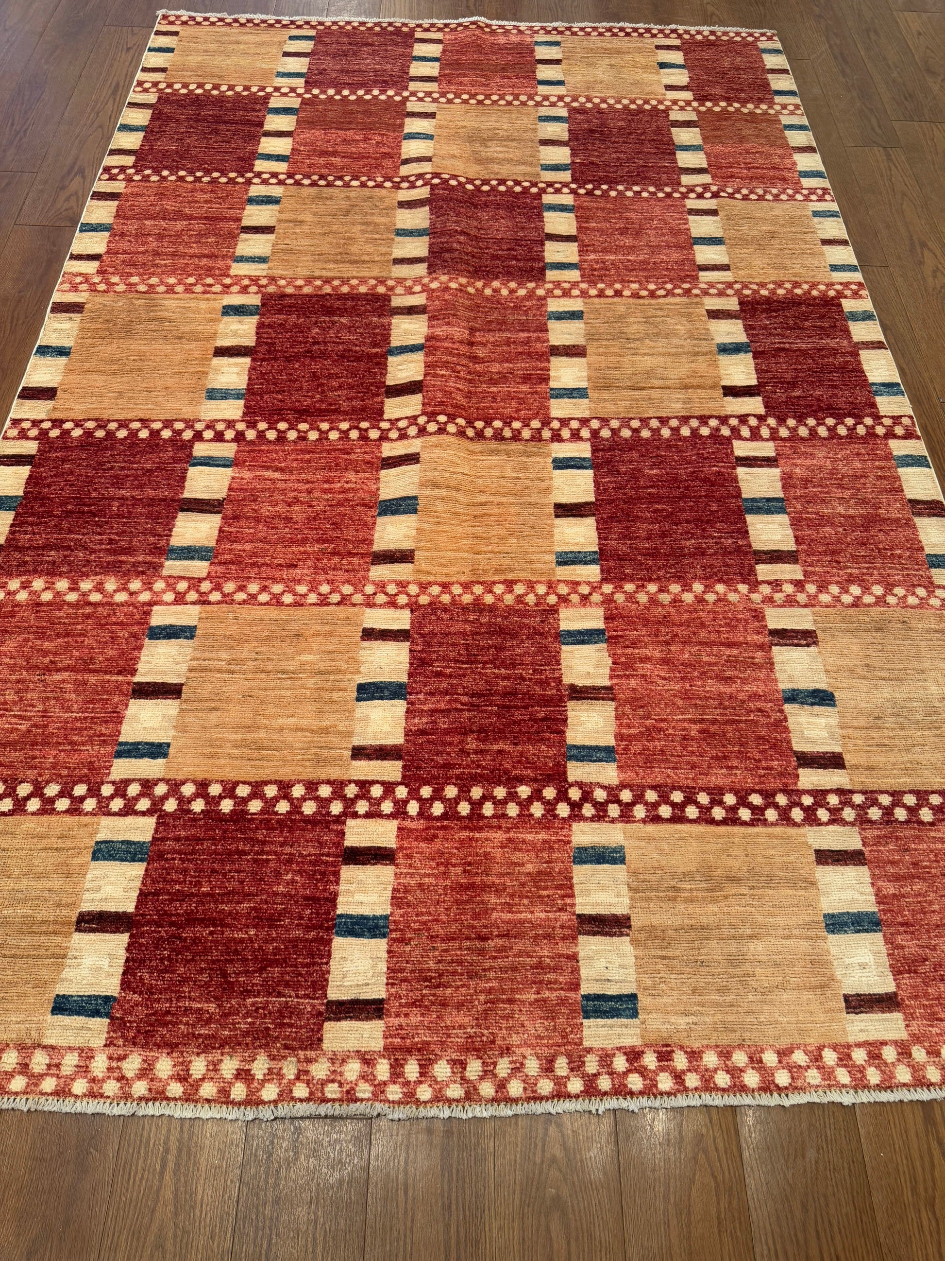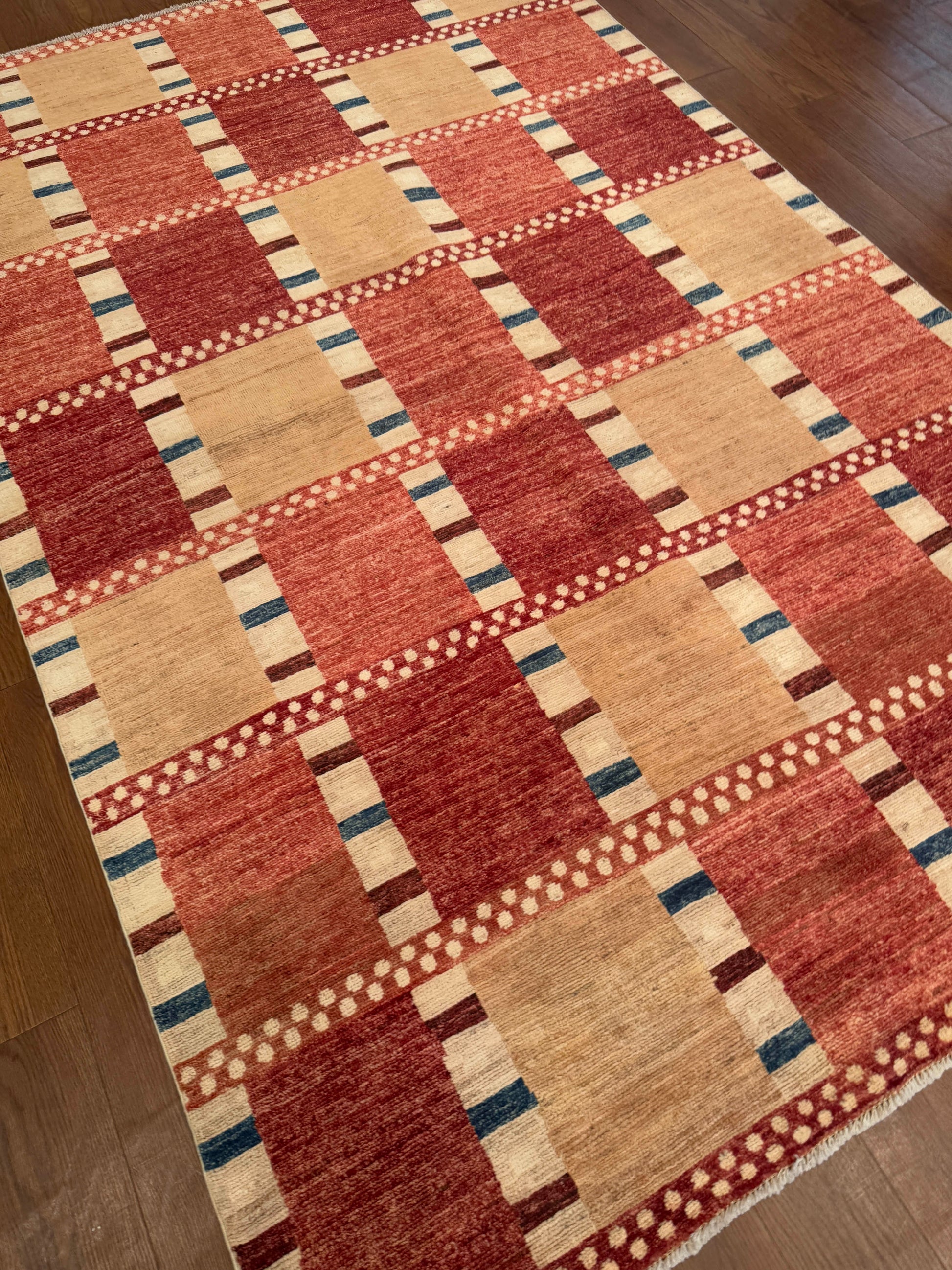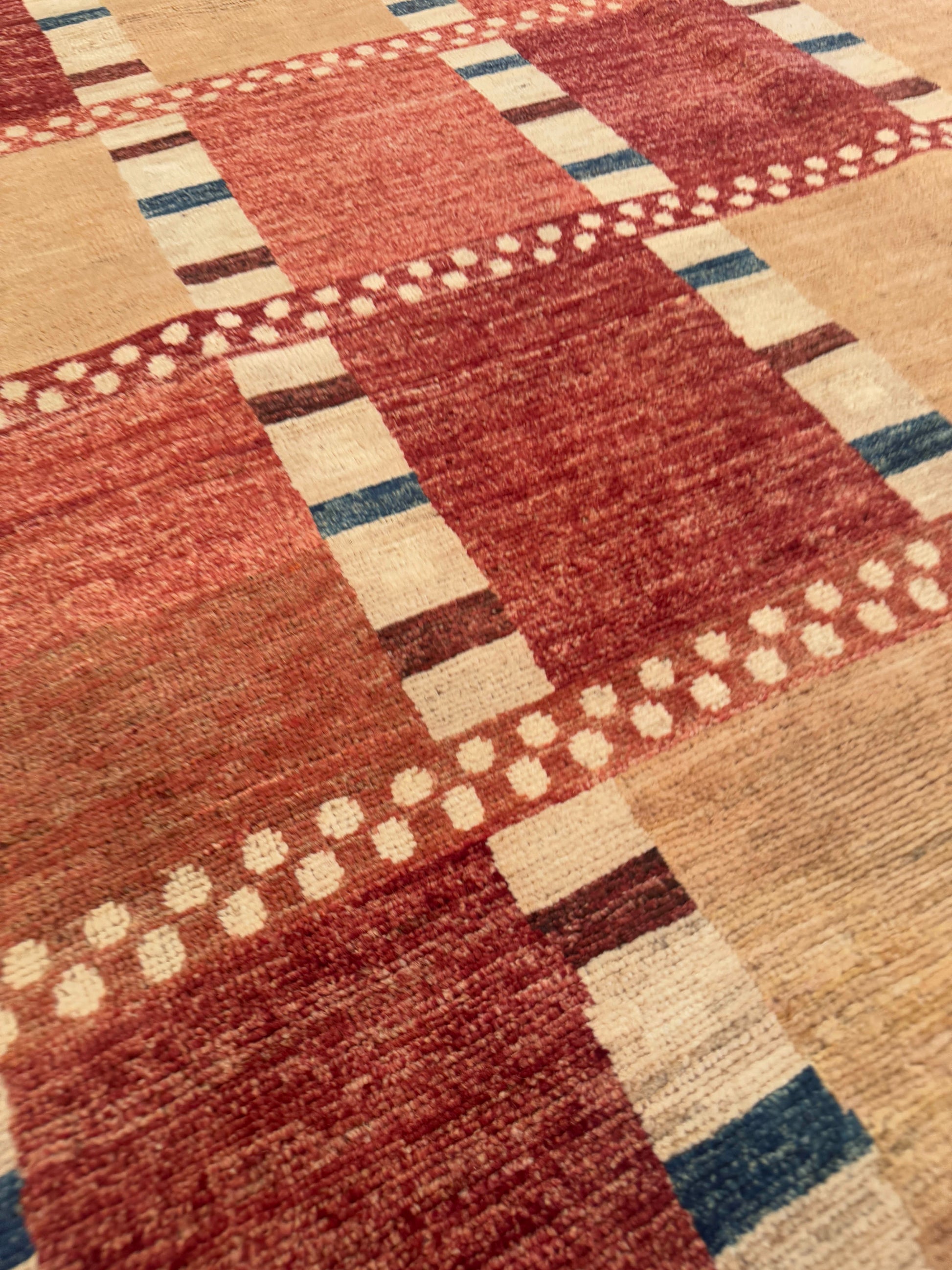 This vibrant handwoven rug features a playful checkerboard pattern in alternating warm red and golden tones. Subtle striped accents in ivory, blue, and brown add contrast and dimension, while dotted borders bring a whimsical touch. Perfect for contemporary or eclectic interiors, this rug offers both durability and artistic flair.