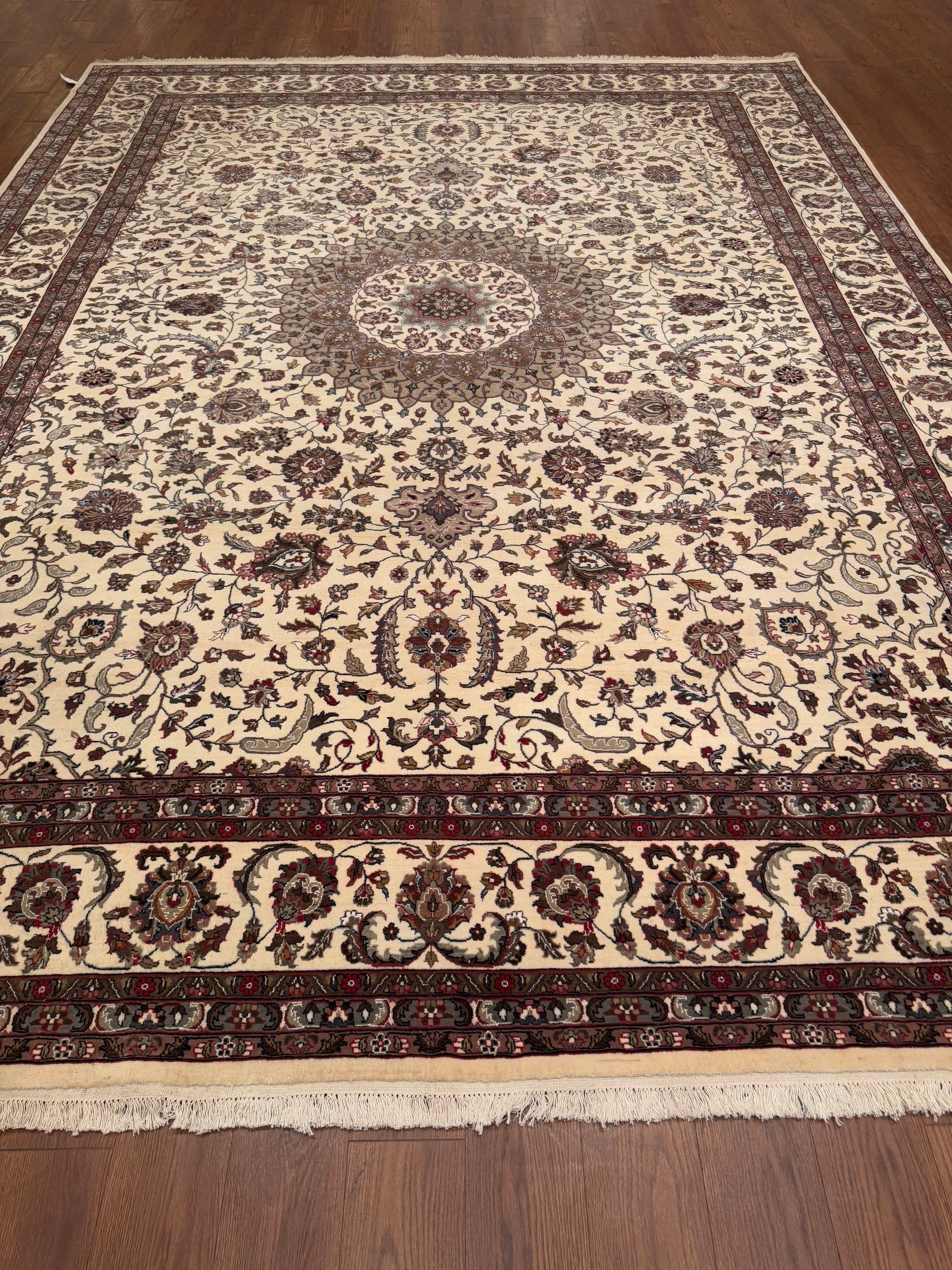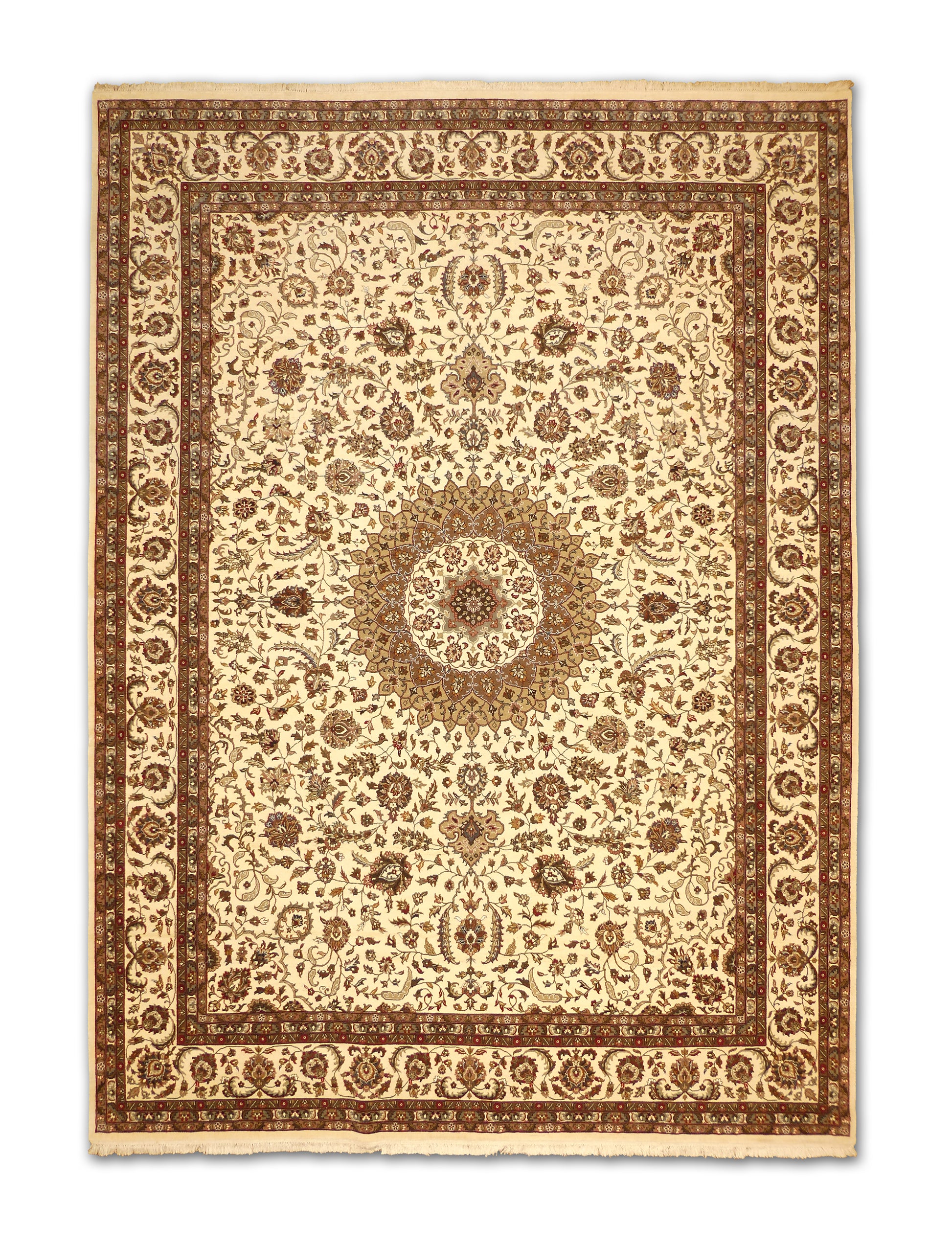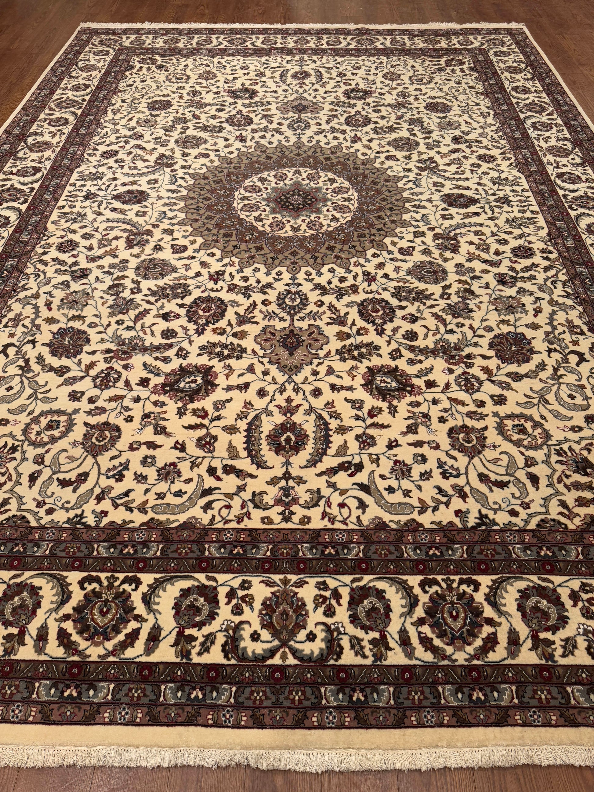 - Design: Central medallion with intricate floral and vine motifs