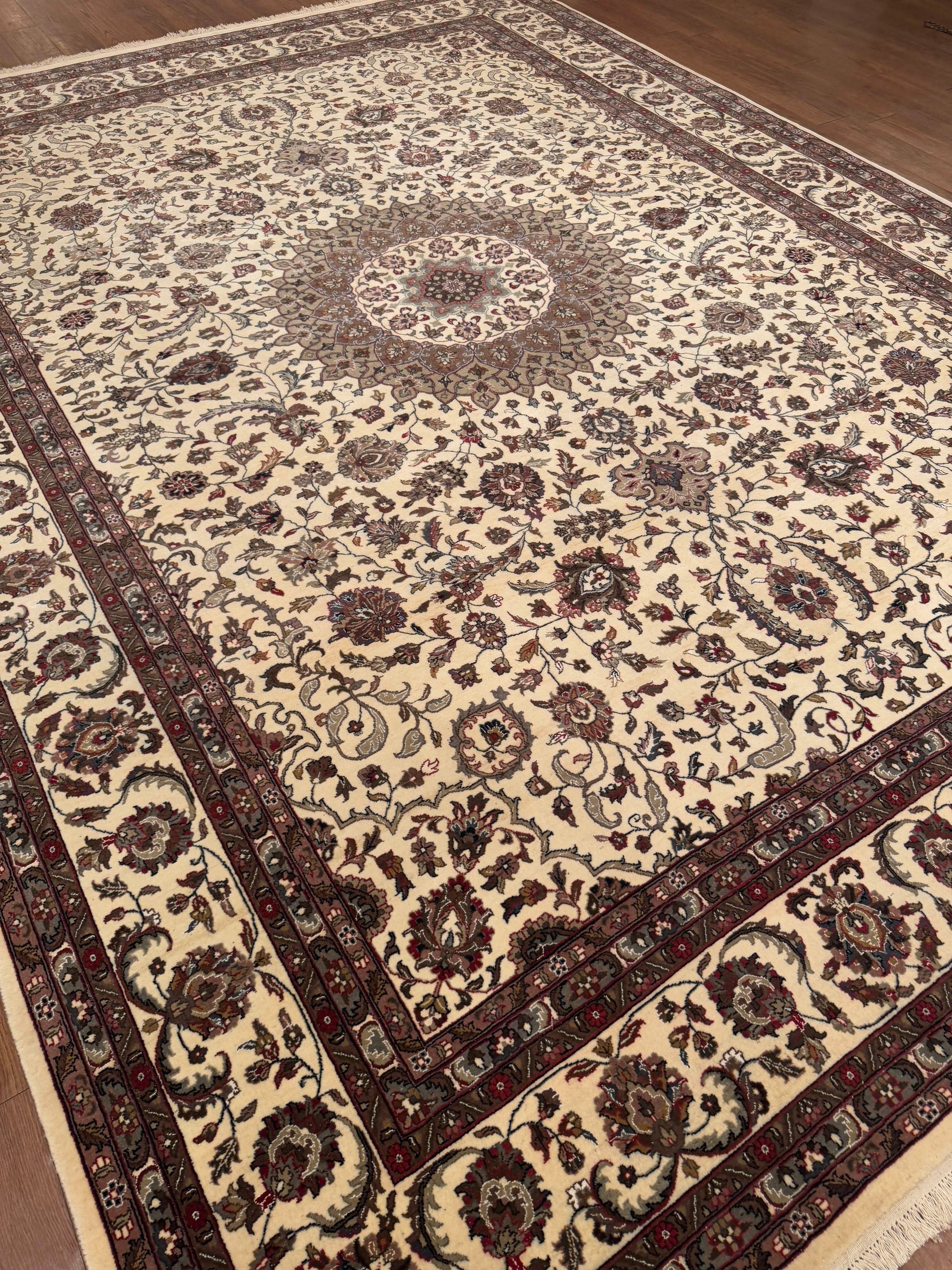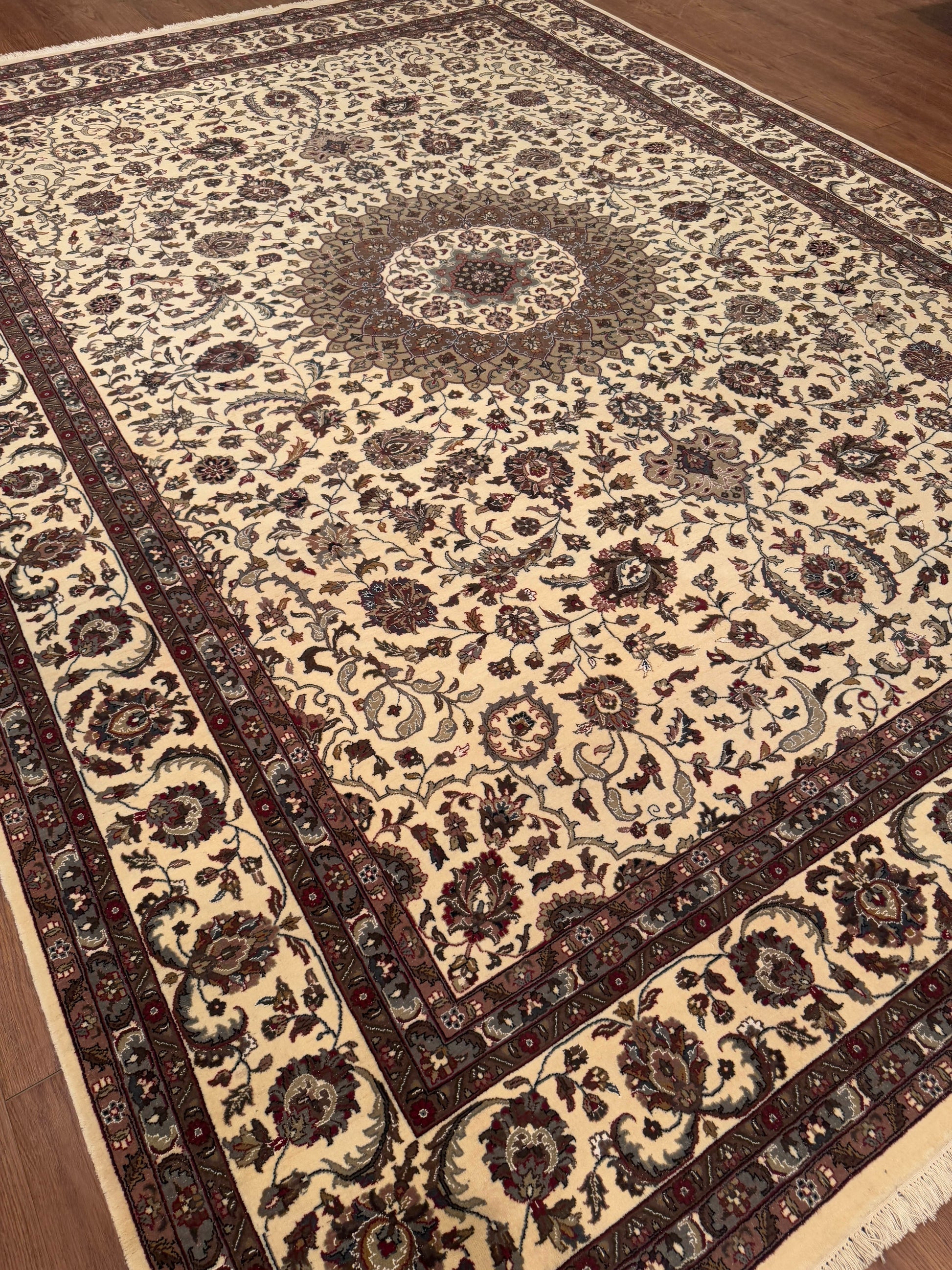This elegant handwoven rug showcases a refined medallion pattern surrounded by an intricate floral and vine motif. Set against a warm ivory field, the symmetrical design features soft tones of burgundy, taupe, beige, and hints of sage, creating a timeless balance of luxury and grace. The detailed border adds structure and contrast, making this rug a sophisticated statement for classic or contemporary interiors alike.
