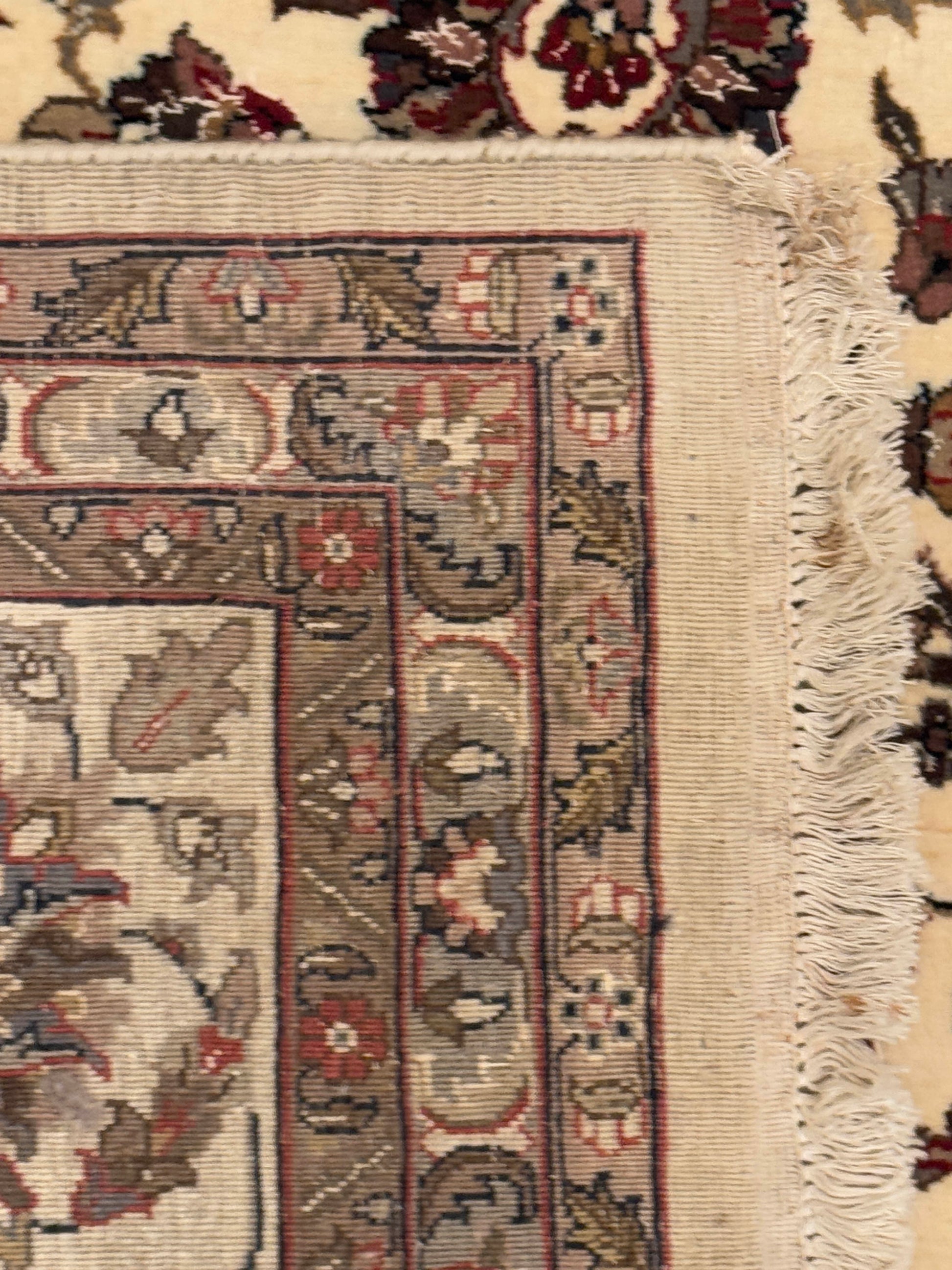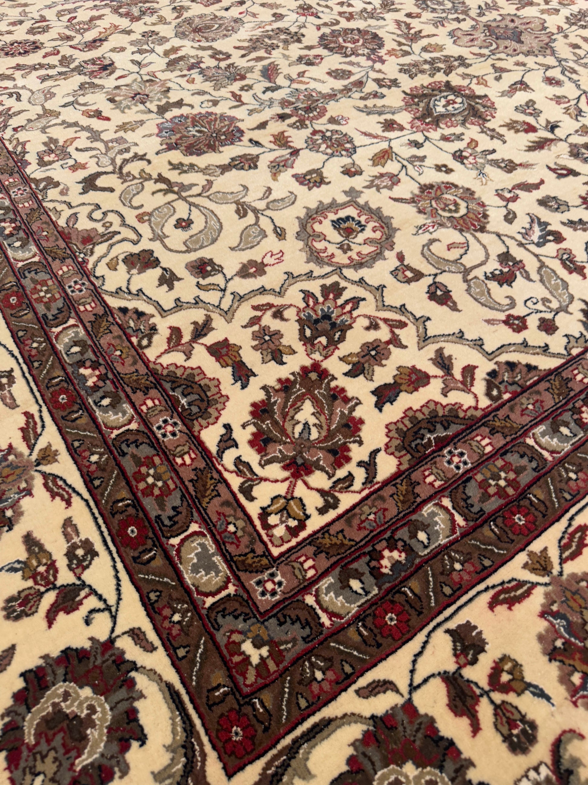 - Color: Ivory field with burgundy, taupe, beige, and sage accents