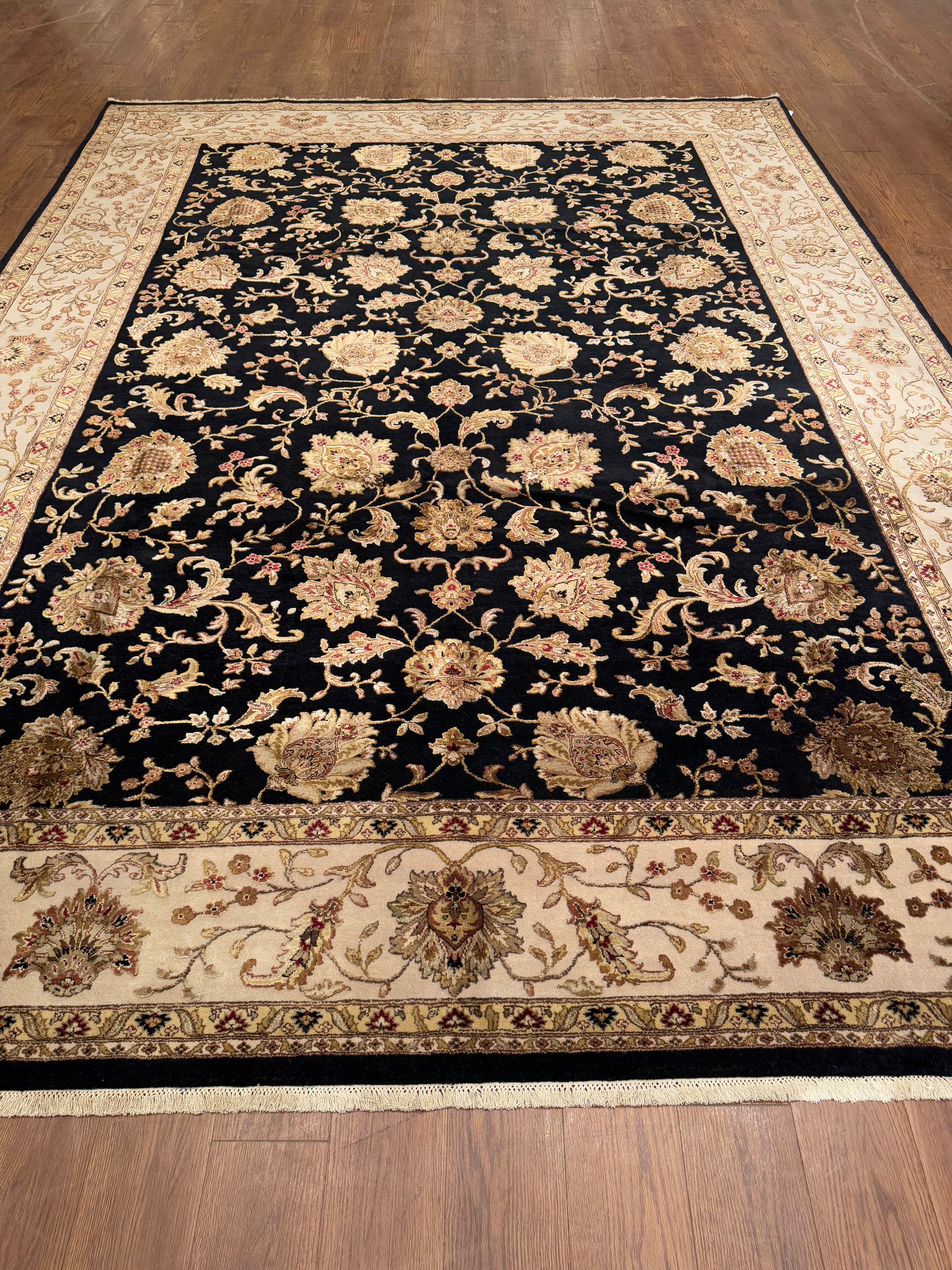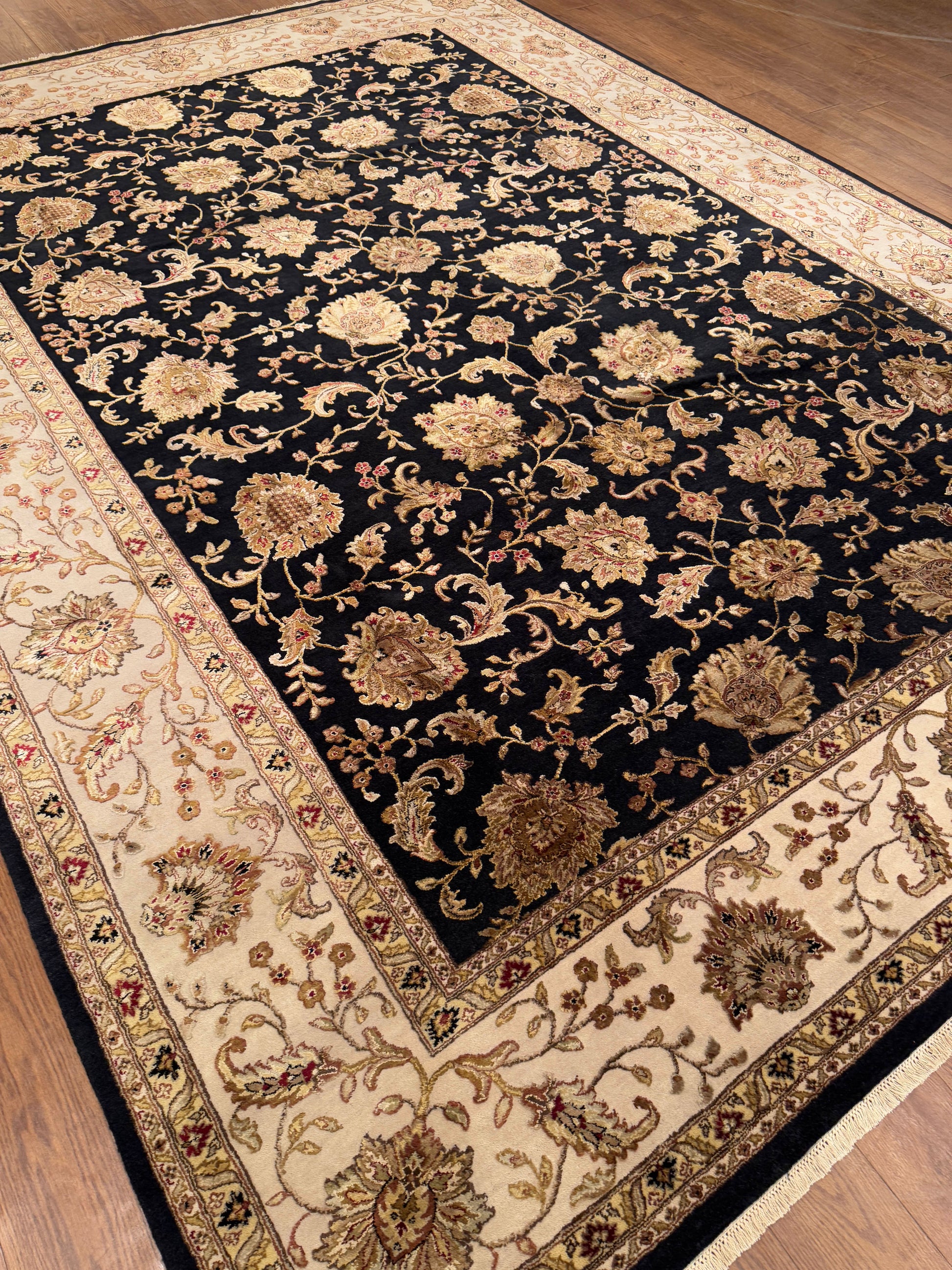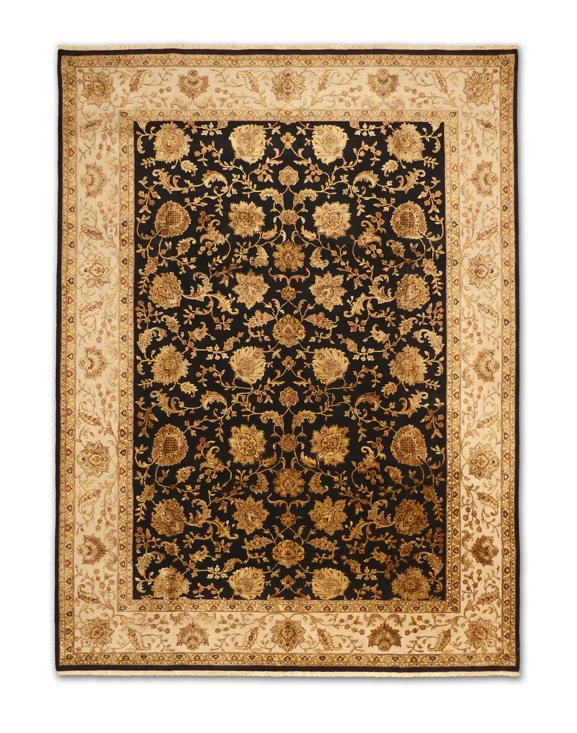 This elegant handmade rug presents a timeless floral motif set against a deep black field, beautifully contrasted by a soft ivory border. The intricate vine and palmette patterns, woven in shades of gold, beige, and subtle burgundy, exude classic refinement and warmth. Its balanced design and luxurious wool texture make it a stunning centerpiece for formal or traditional interiors.