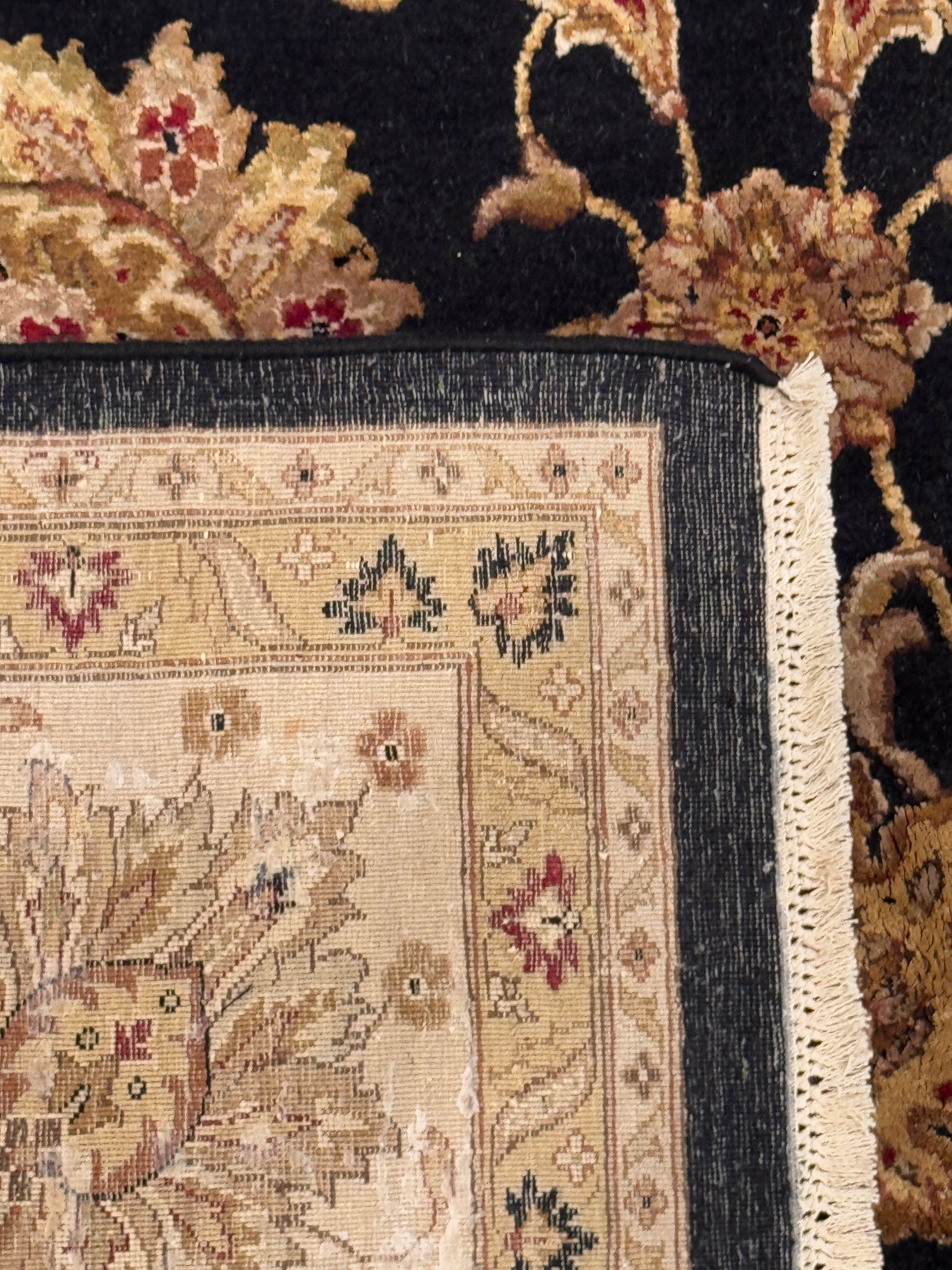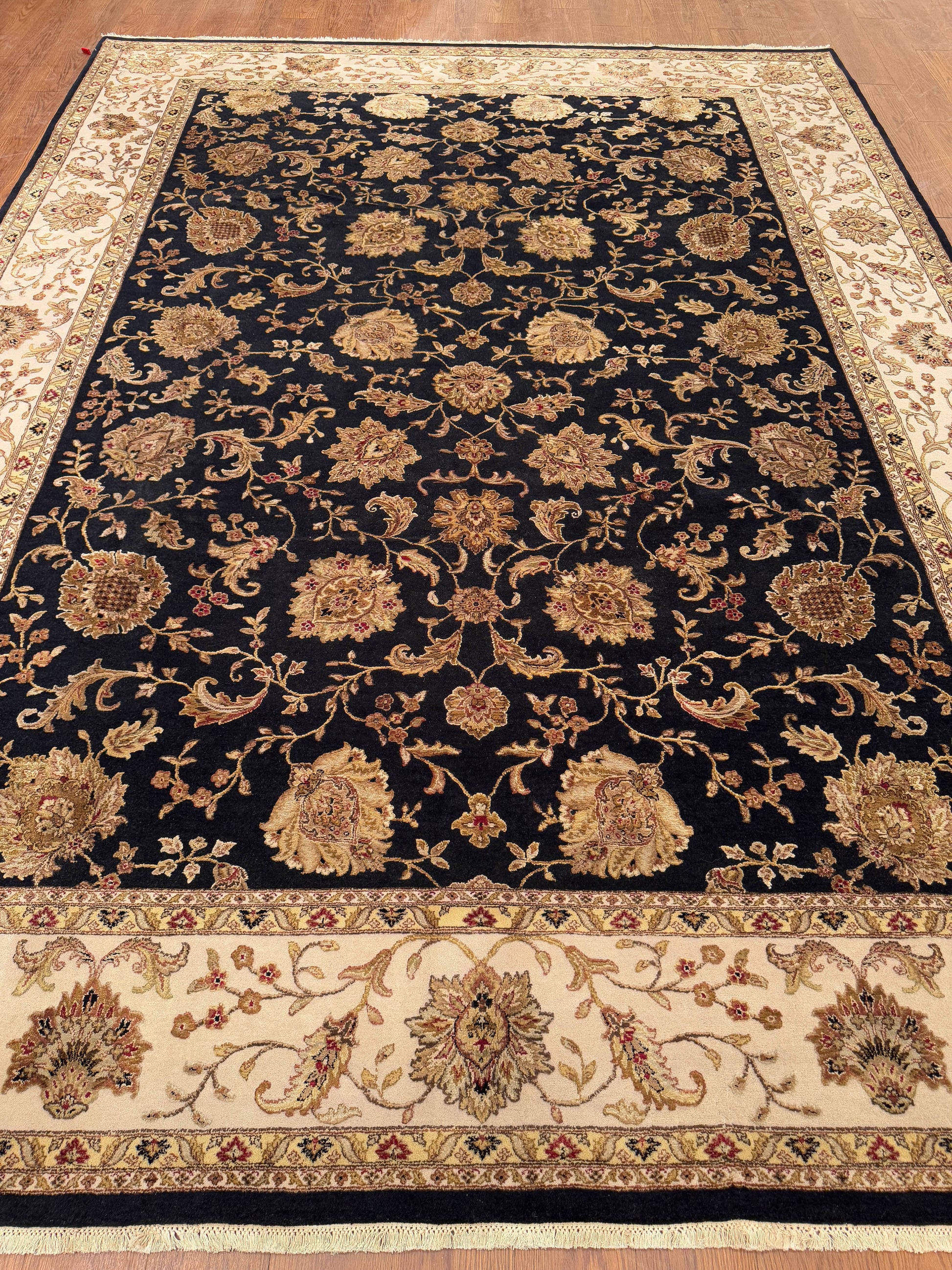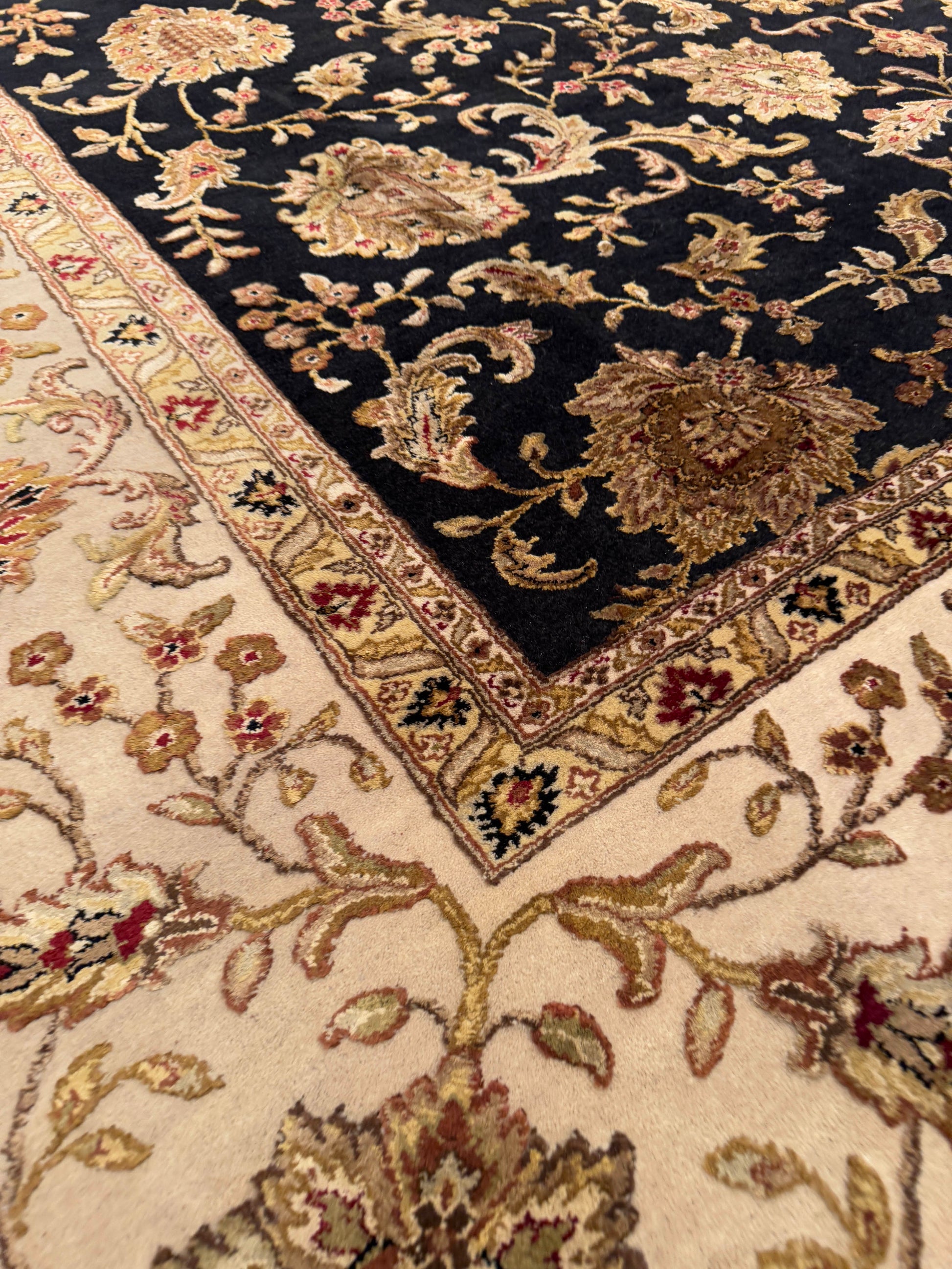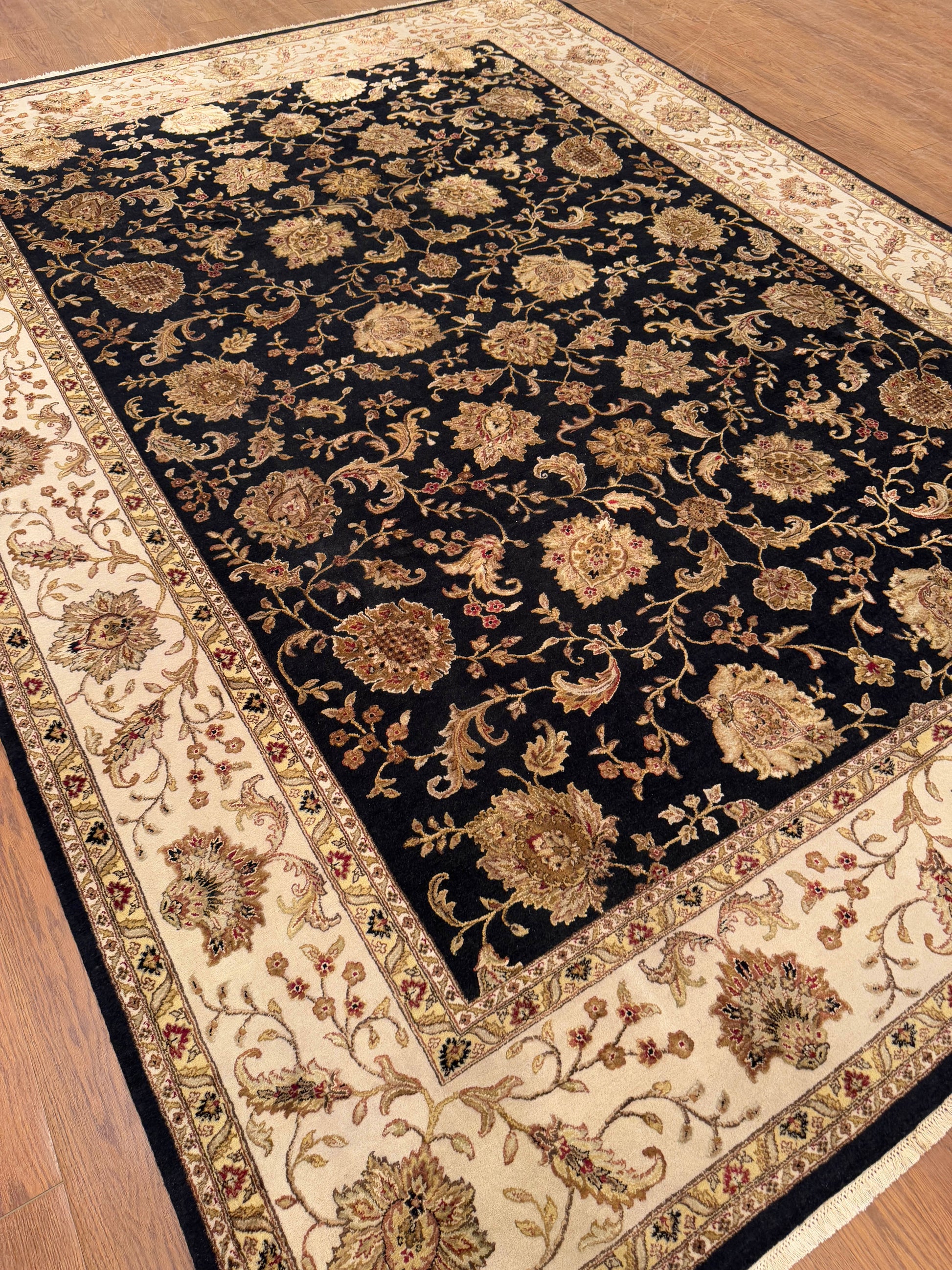 This elegant handmade rug presents a timeless floral motif set against a deep black field, beautifully contrasted by a soft ivory border. The intricate vine and palmette patterns, woven in shades of gold, beige, and subtle burgundy, exude classic refinement and warmth. Its balanced design and luxurious wool texture make it a stunning centerpiece for formal or traditional interiors.