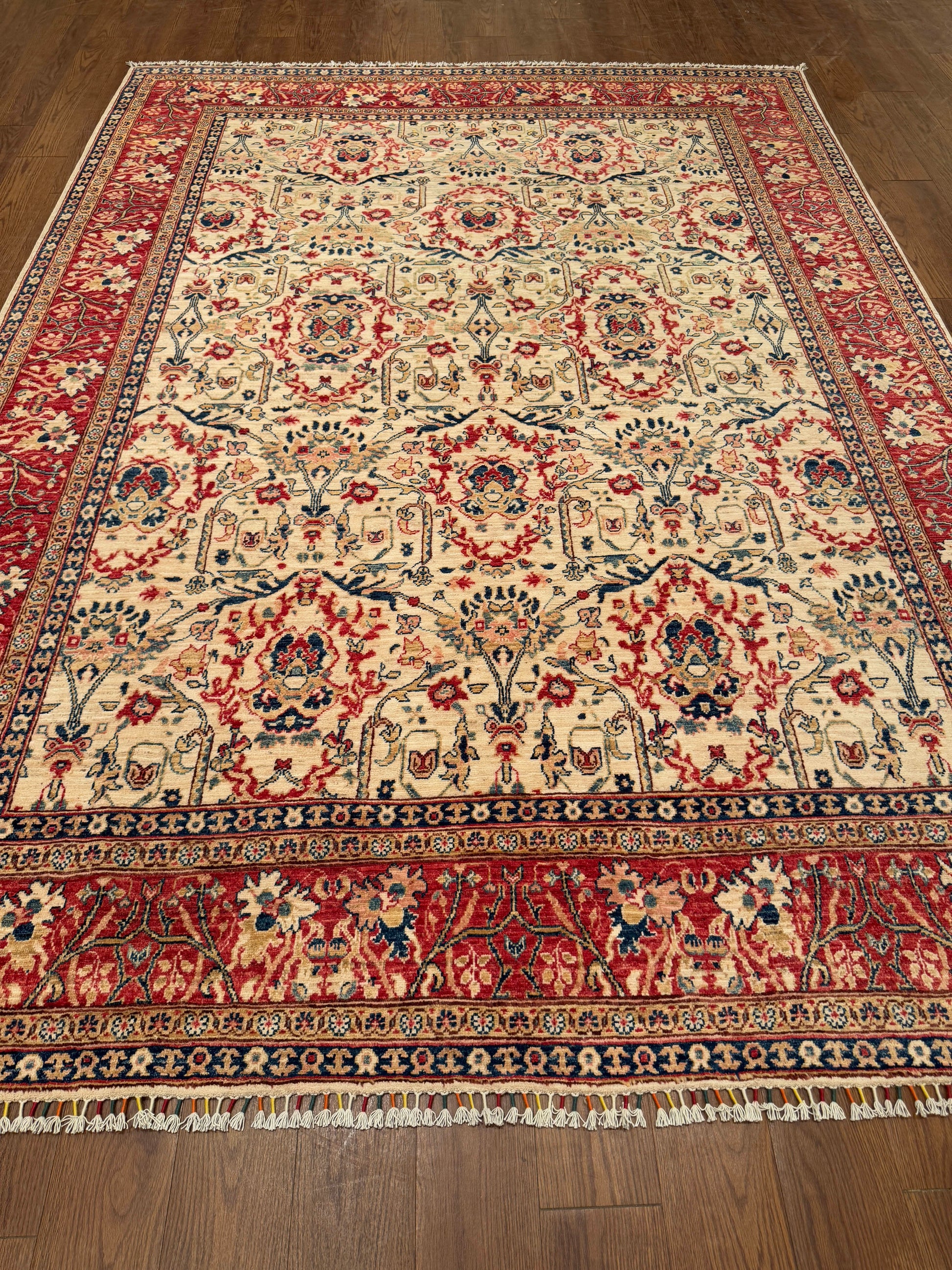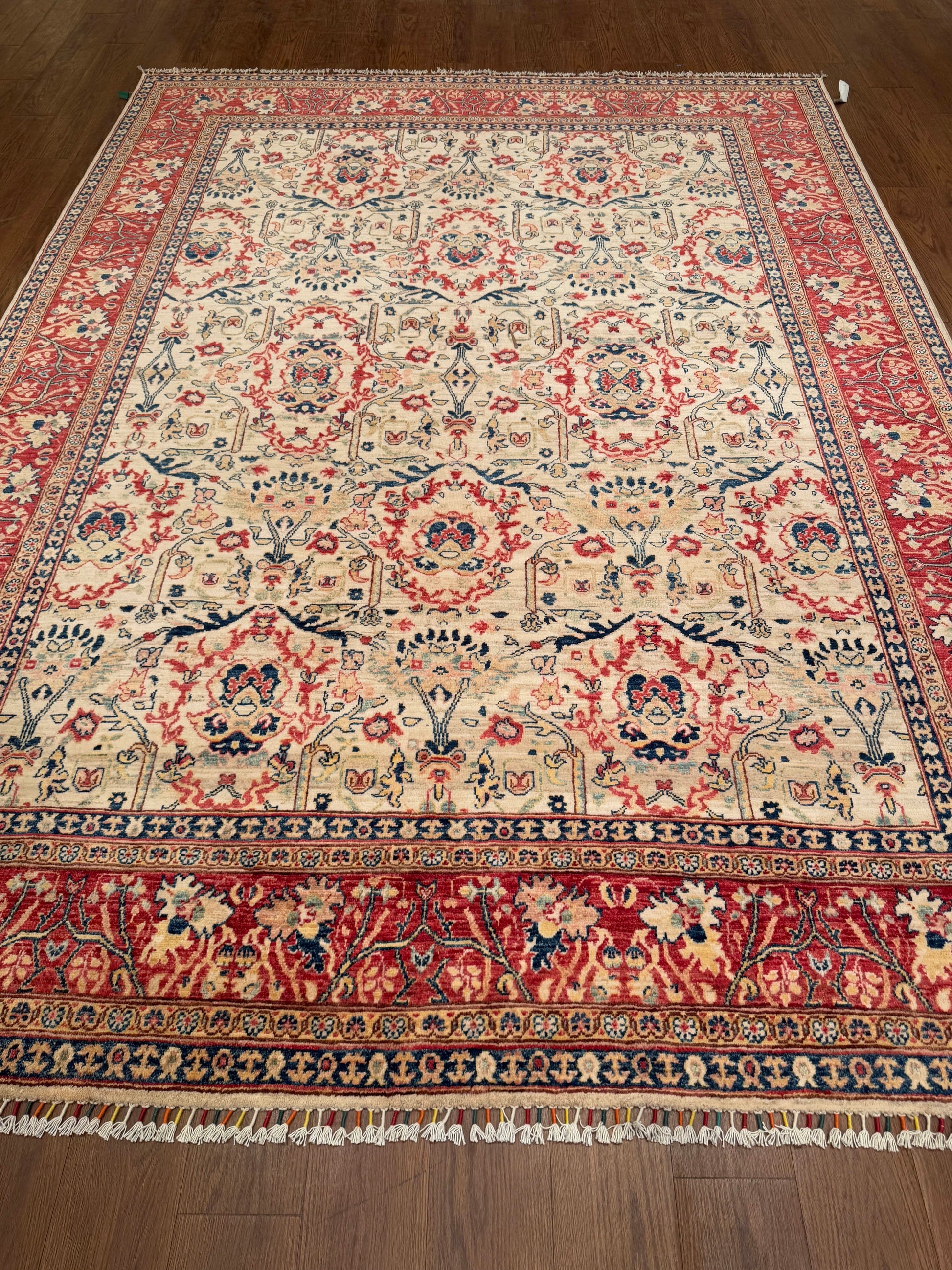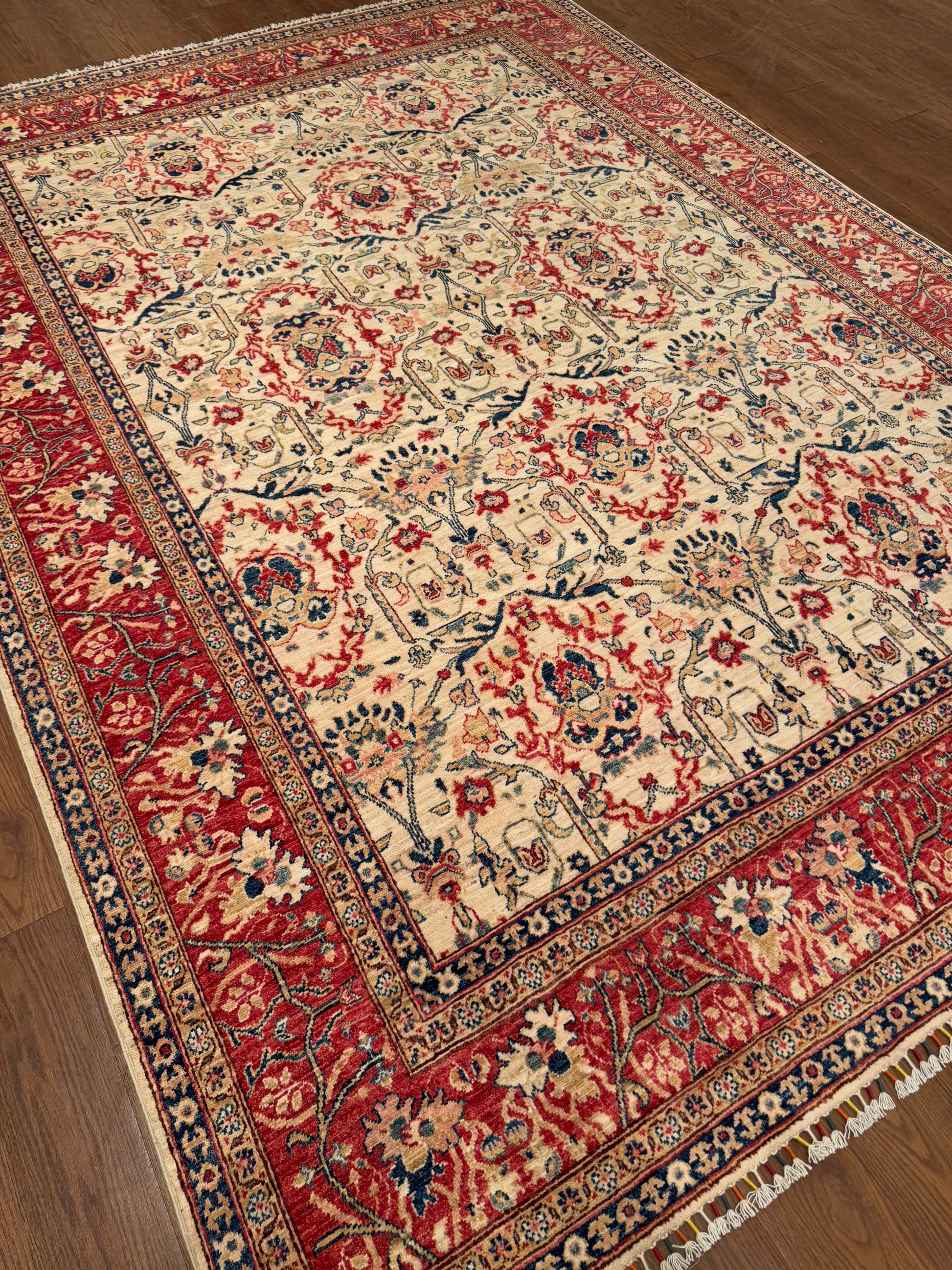 This handmade rug showcases a beautifully refined floral design arranged in a repeating medallion pattern. The ivory background highlights the intricate motifs in coral red, navy, and light blue, creating an elegant yet vibrant composition. The richly detailed red border frames the design perfectly, balancing warmth and sophistication. Ideal for both classic and transitional interiors, this rug adds timeless charm and visual harmony to any space.