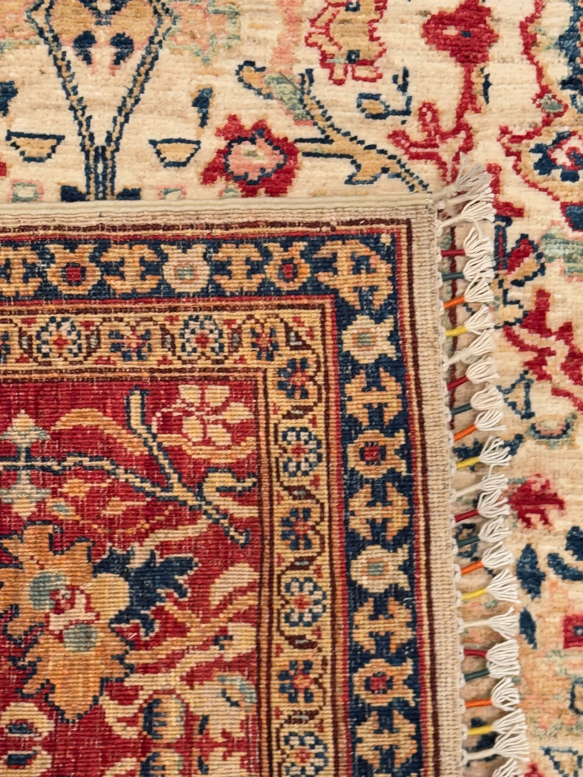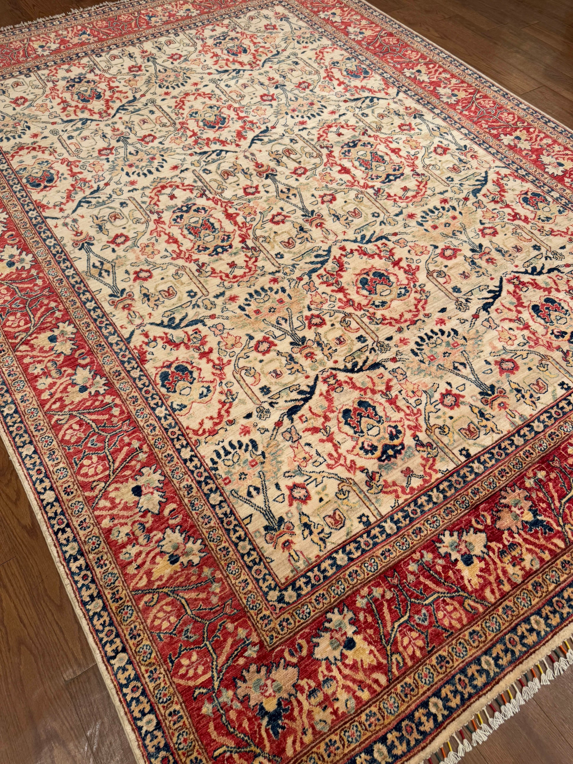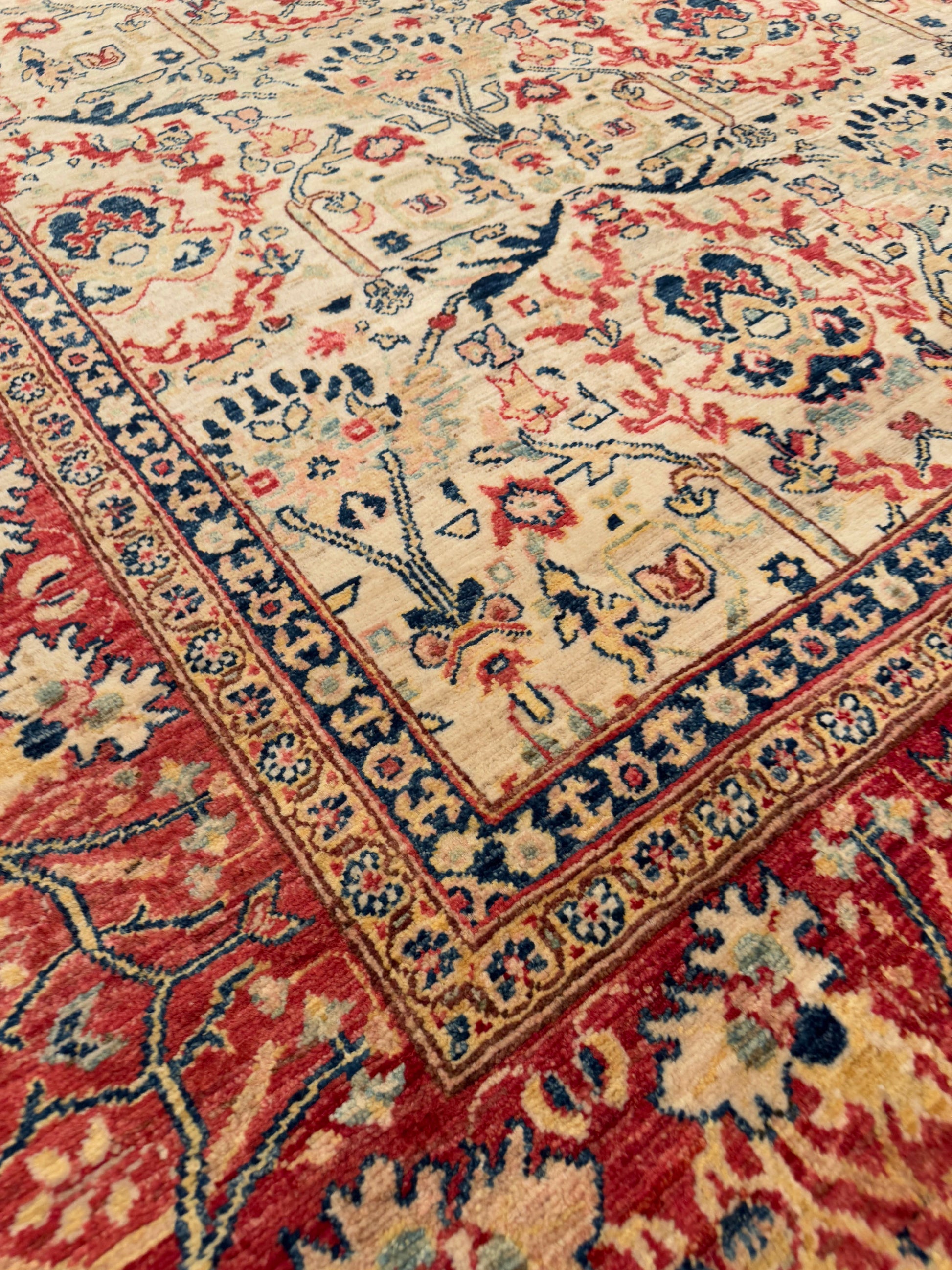 This handmade rug showcases a beautifully refined floral design arranged in a repeating medallion pattern. The ivory background highlights the intricate motifs in coral red, navy, and light blue, creating an elegant yet vibrant composition. The richly detailed red border frames the design perfectly, balancing warmth and sophistication. Ideal for both classic and transitional interiors, this rug adds timeless charm and visual harmony to any space.