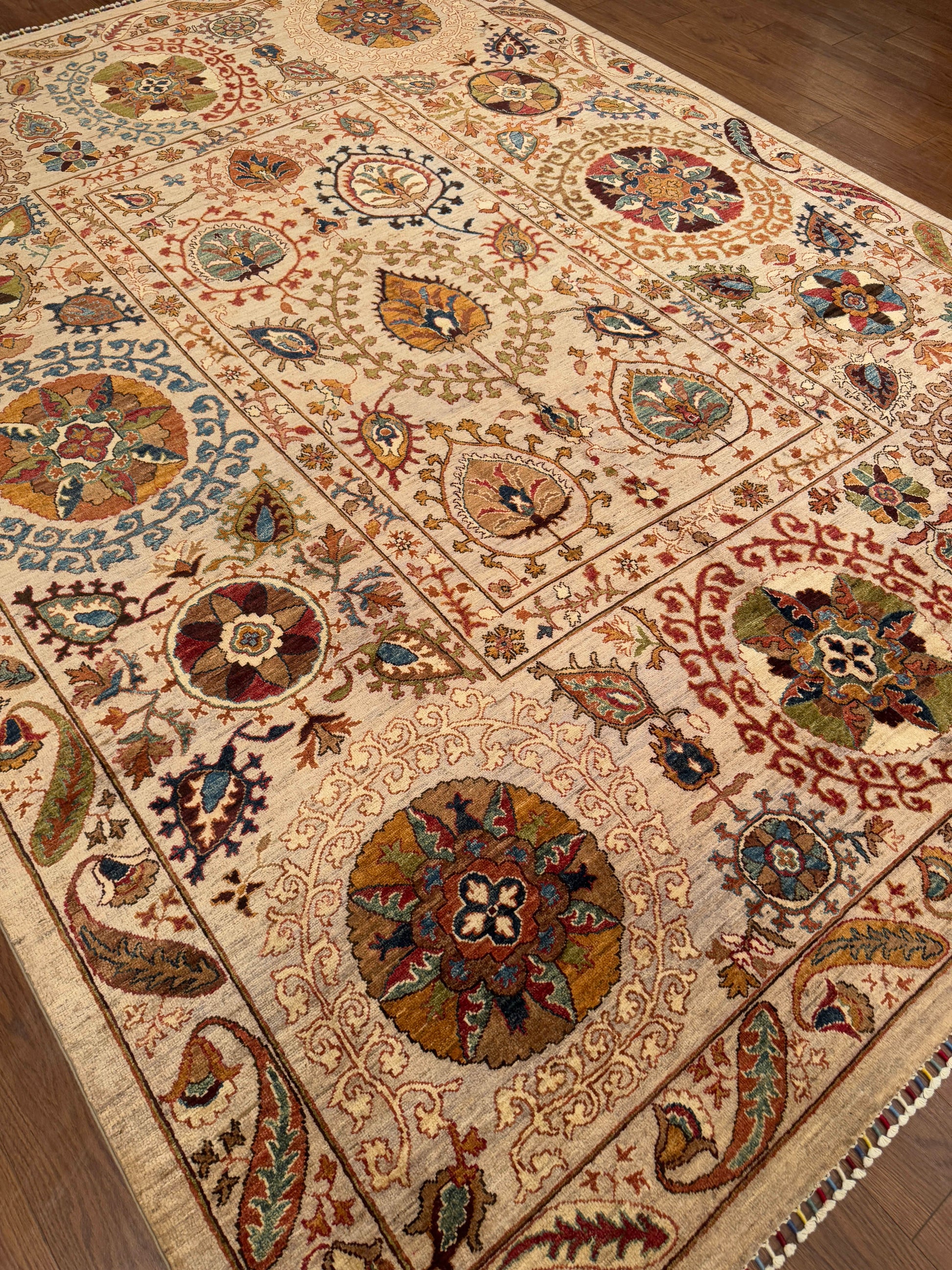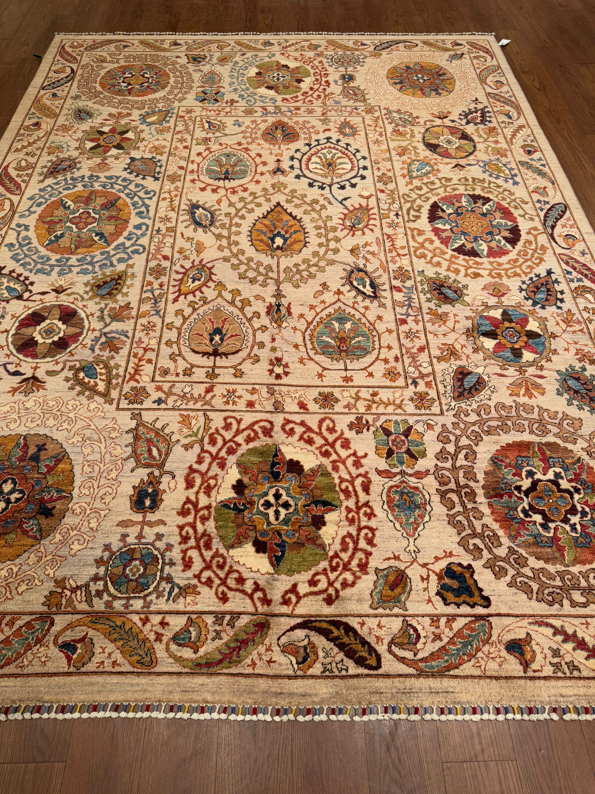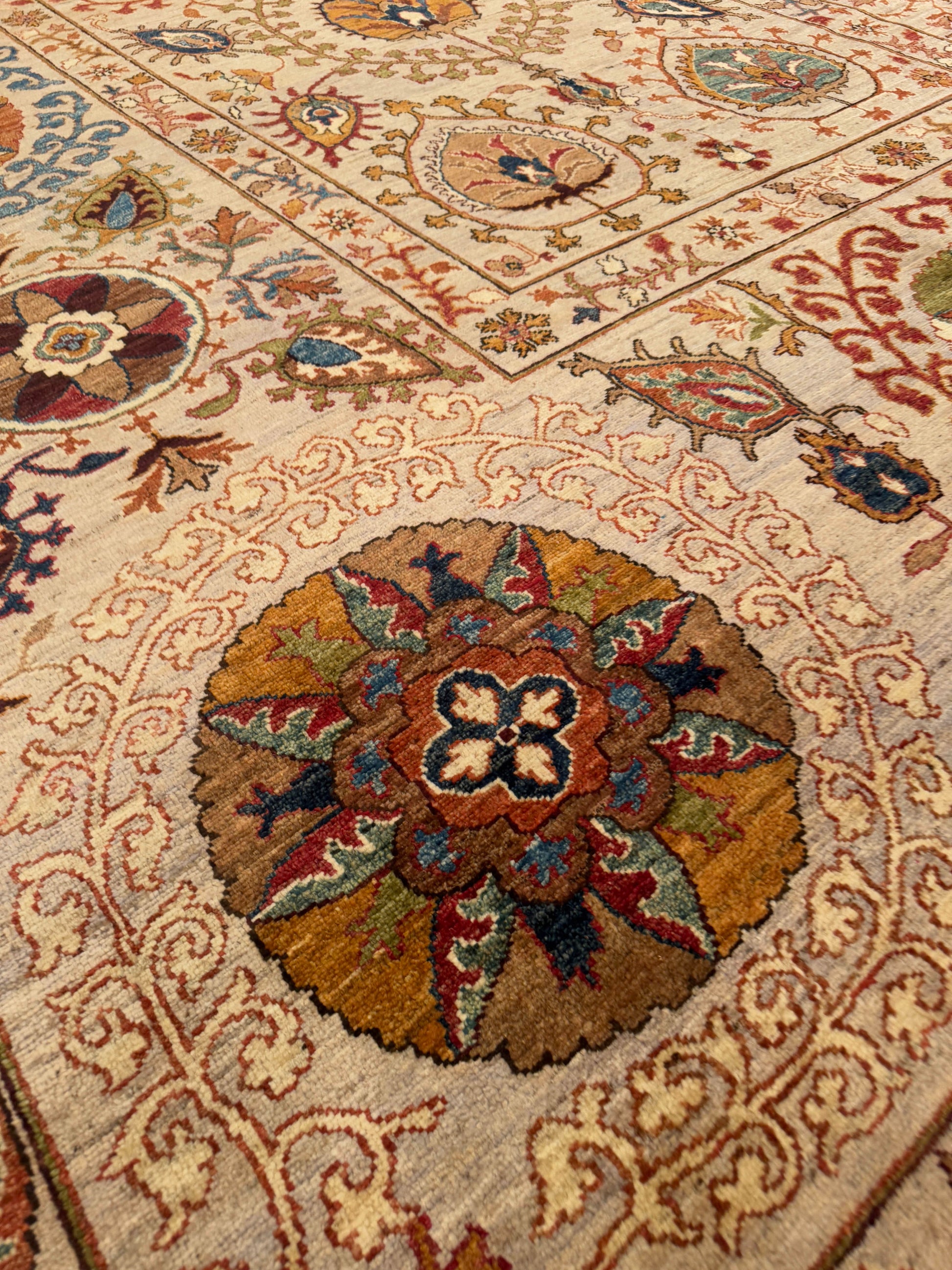 This handmade rug features a striking allover medallion and palmette pattern arranged within an elegant ivory field. The intricate motifs in shades of rust, gold, blue, olive, and soft red bring an inviting warmth balanced by refined detailing. The border showcases complementary floral and vine elements, giving the piece a timeless harmony perfect for both classic and transitional interiors.