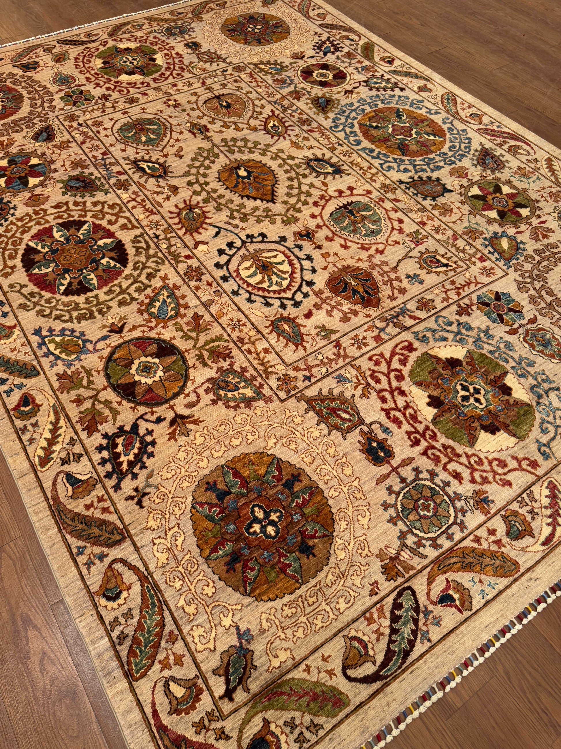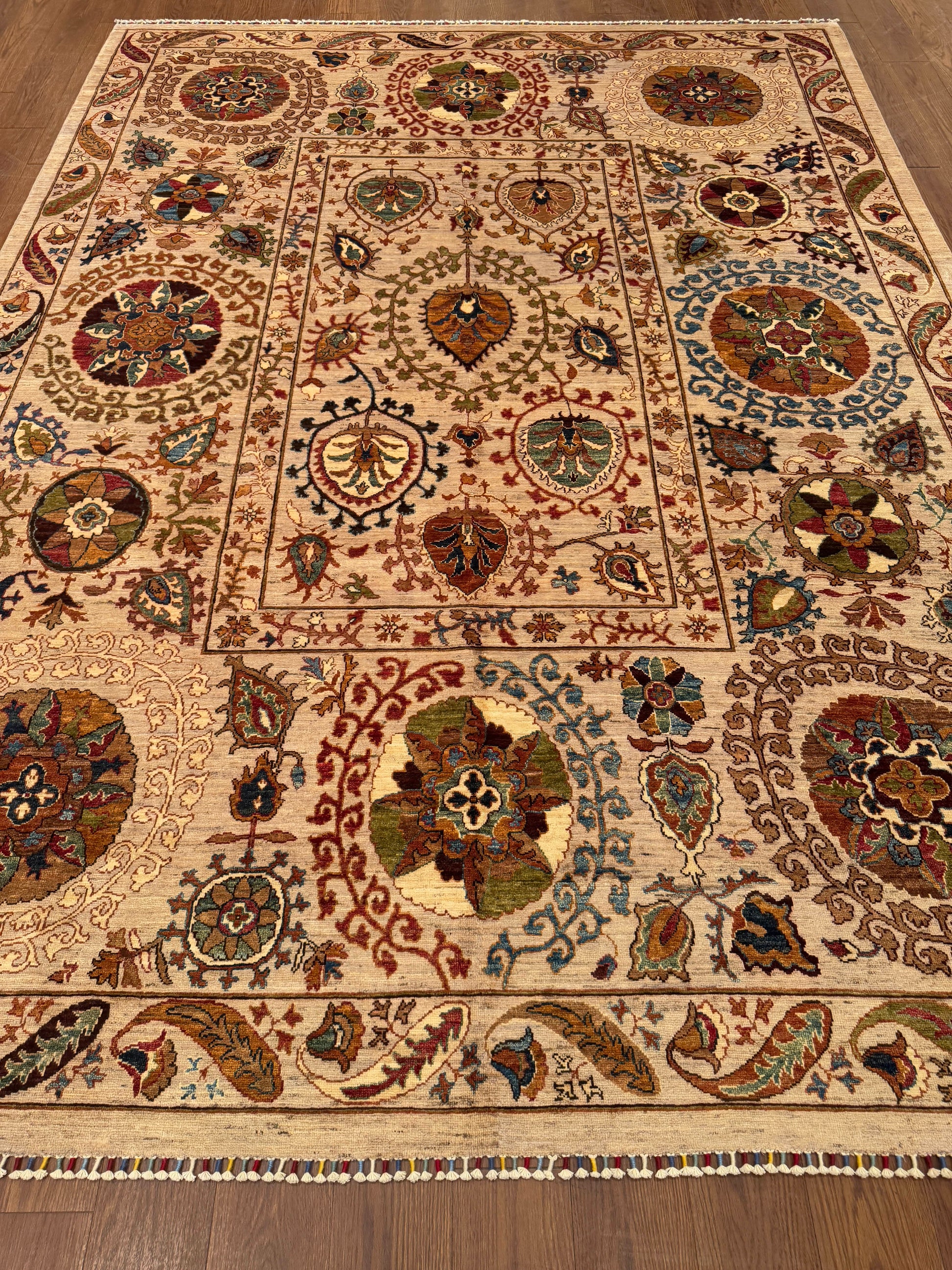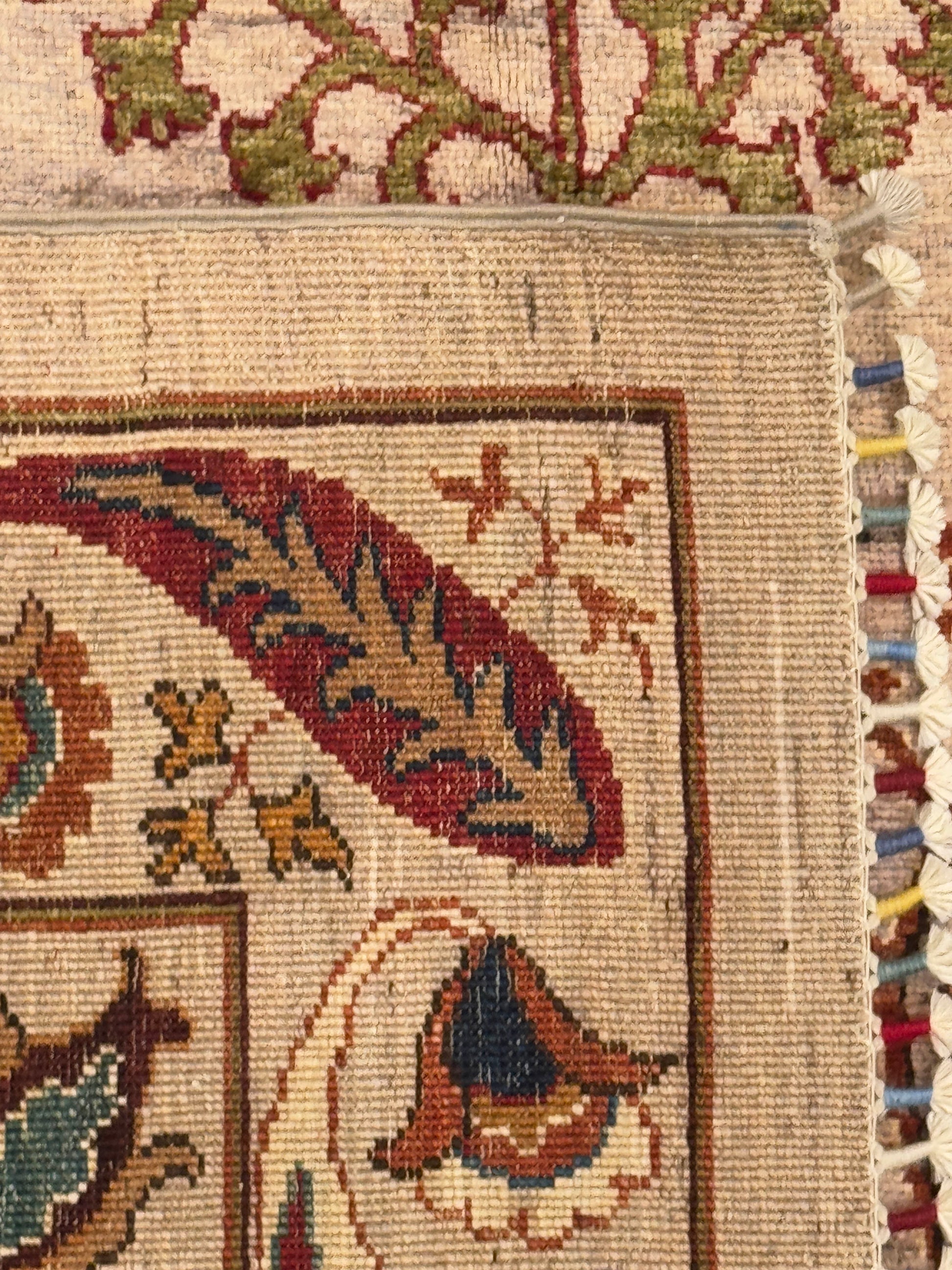 This handmade rug features a striking allover medallion and palmette pattern arranged within an elegant ivory field. The intricate motifs in shades of rust, gold, blue, olive, and soft red bring an inviting warmth balanced by refined detailing. The border showcases complementary floral and vine elements, giving the piece a timeless harmony perfect for both classic and transitional interiors.