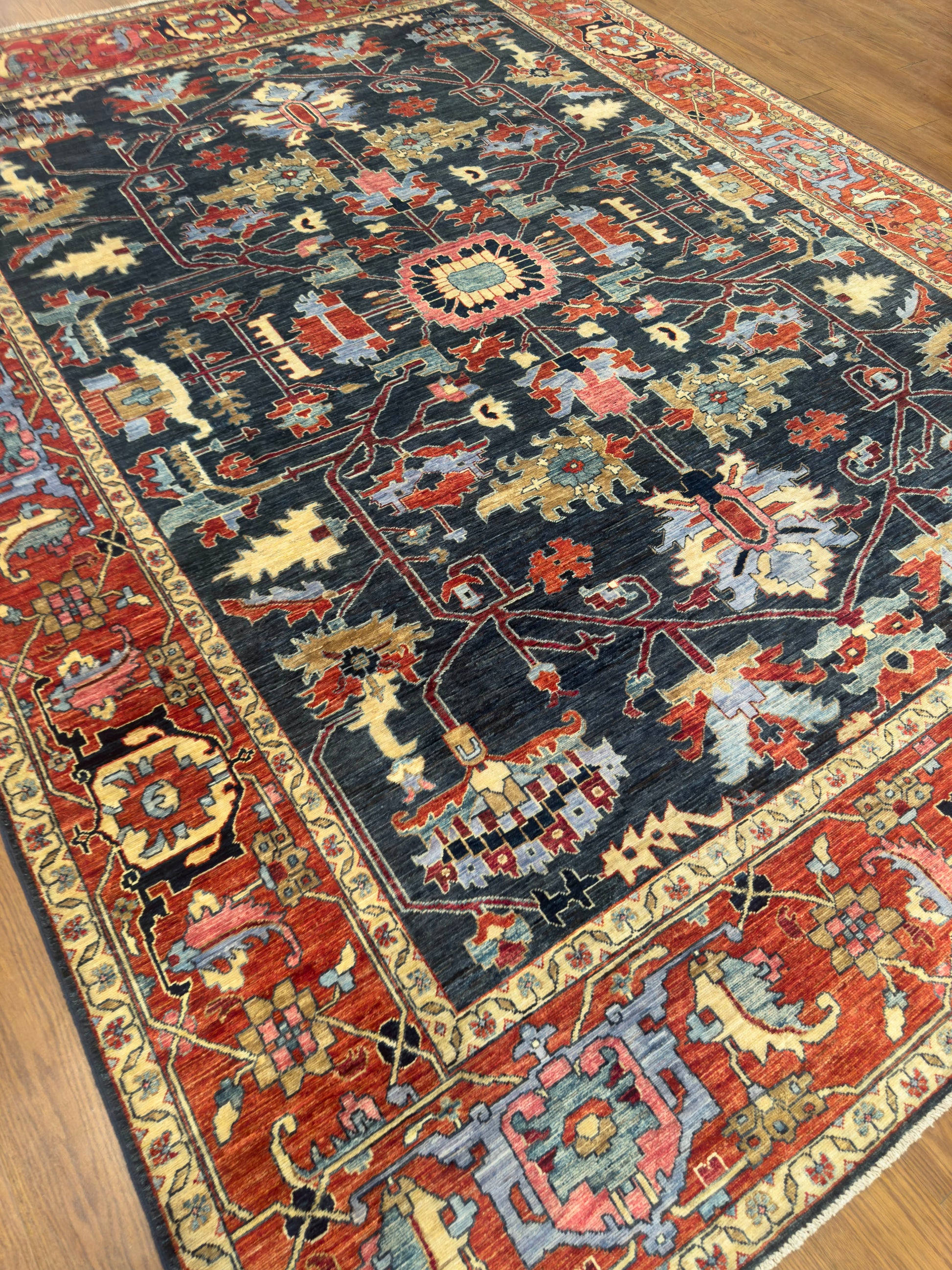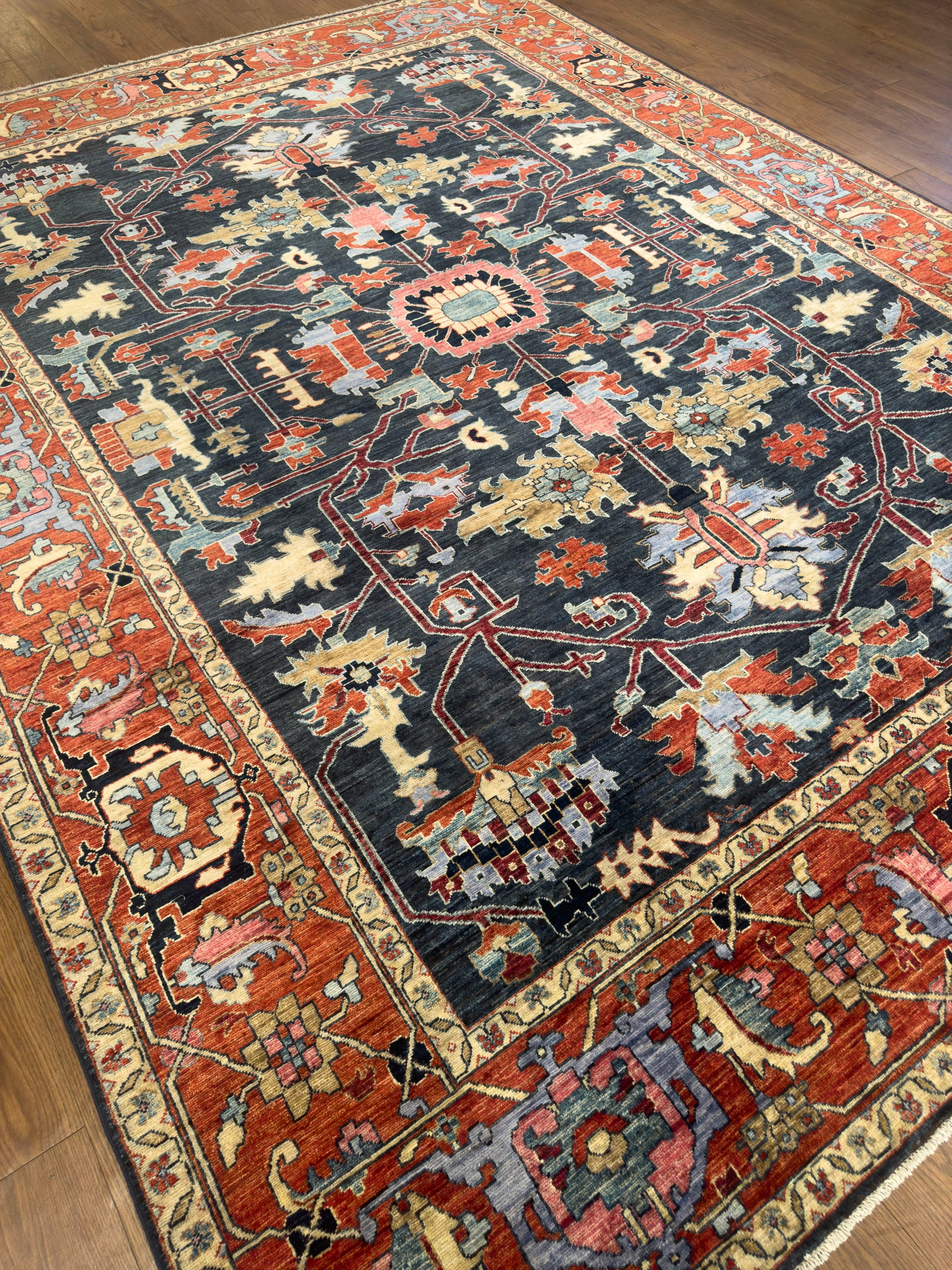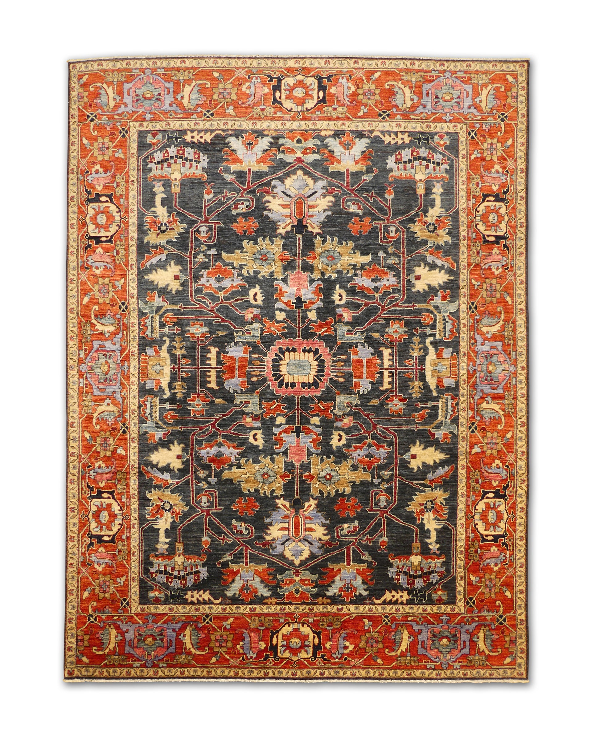 This handmade rug features an elegant central medallion and branching floral motifs across a deep navy field, complemented by a rich terracotta border. The palette of sky blue, coral, gold, and ivory creates a refined balance of warmth and contrast. Its bold, symmetrical design and masterful weaving make it a stunning focal point for sophisticated interiors.
