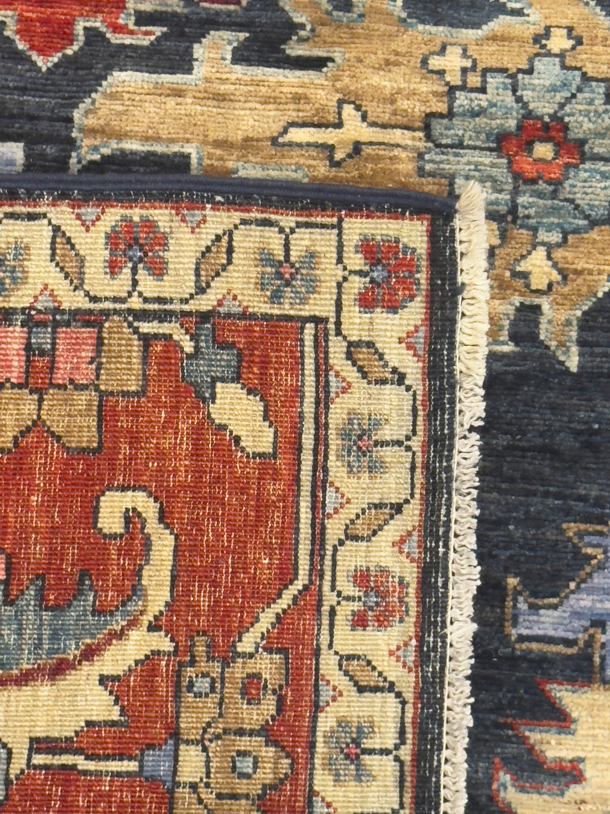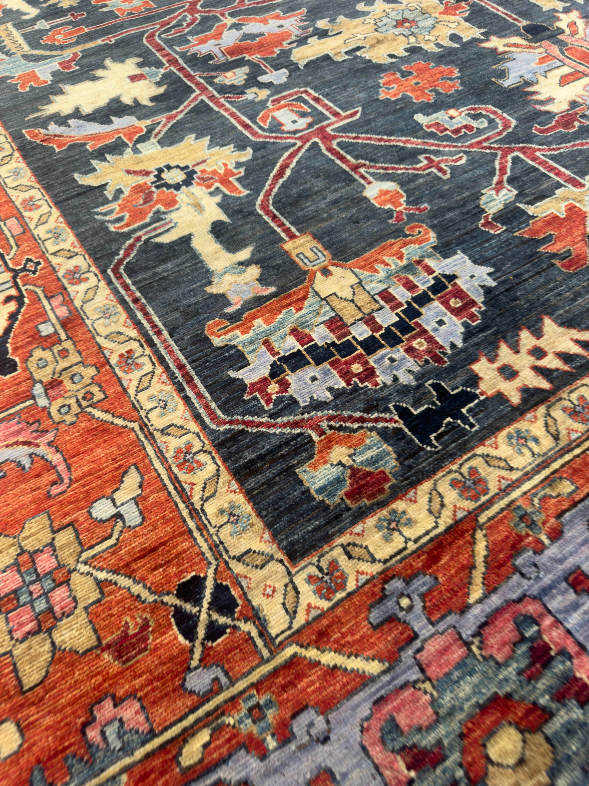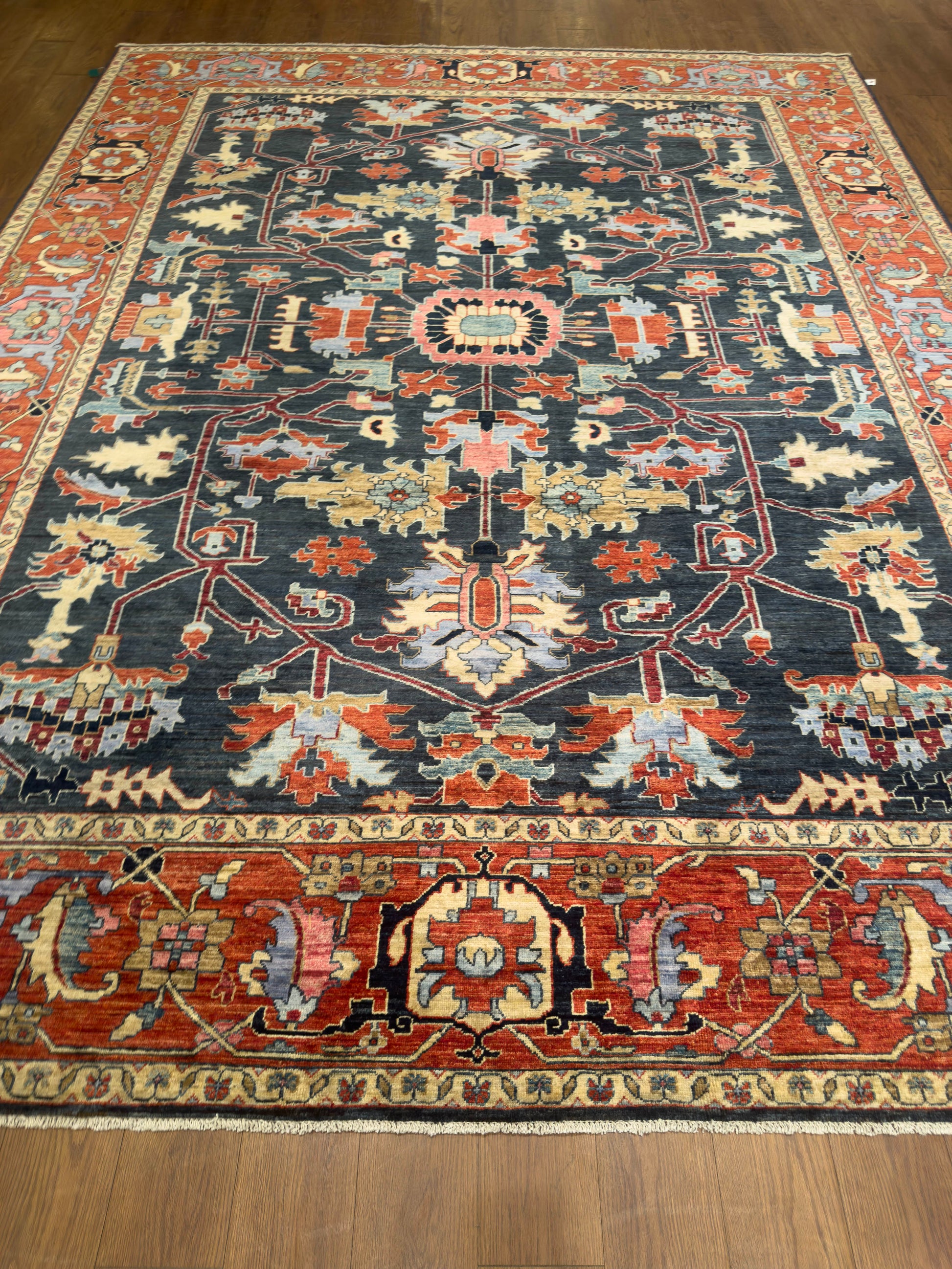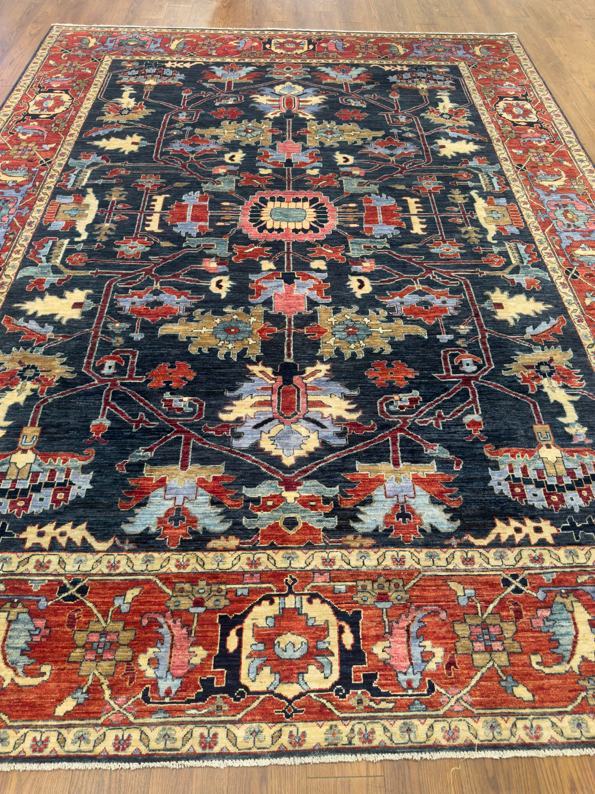 This handmade rug features an elegant central medallion and branching floral motifs across a deep navy field, complemented by a rich terracotta border. The palette of sky blue, coral, gold, and ivory creates a refined balance of warmth and contrast. Its bold, symmetrical design and masterful weaving make it a stunning focal point for sophisticated interiors.