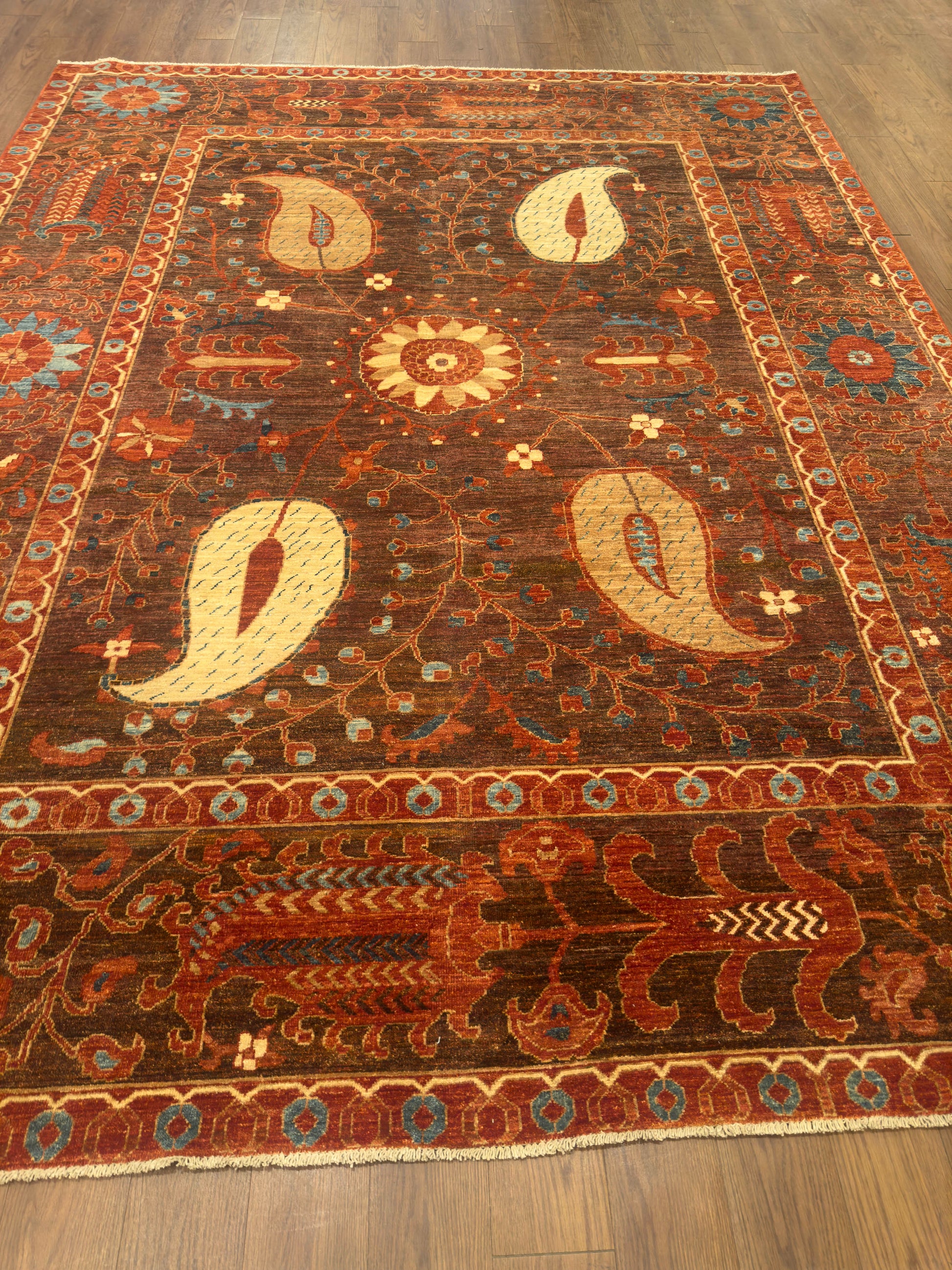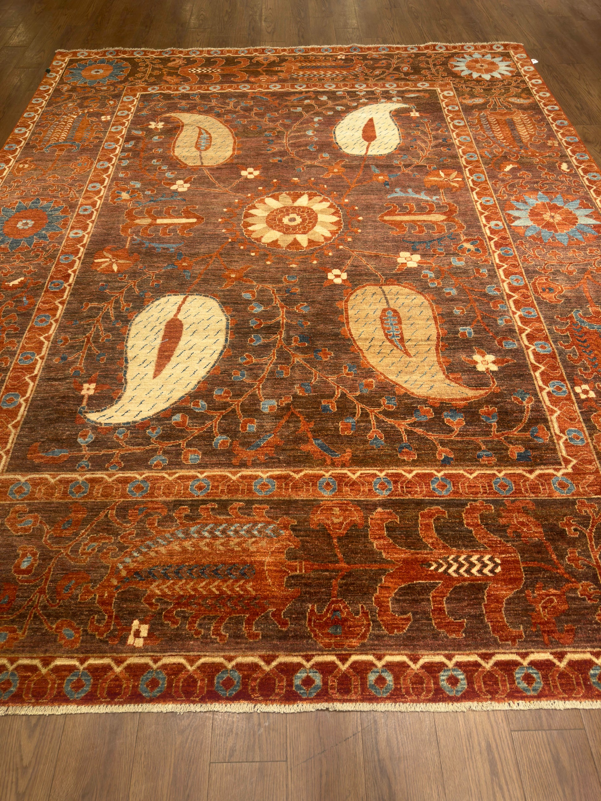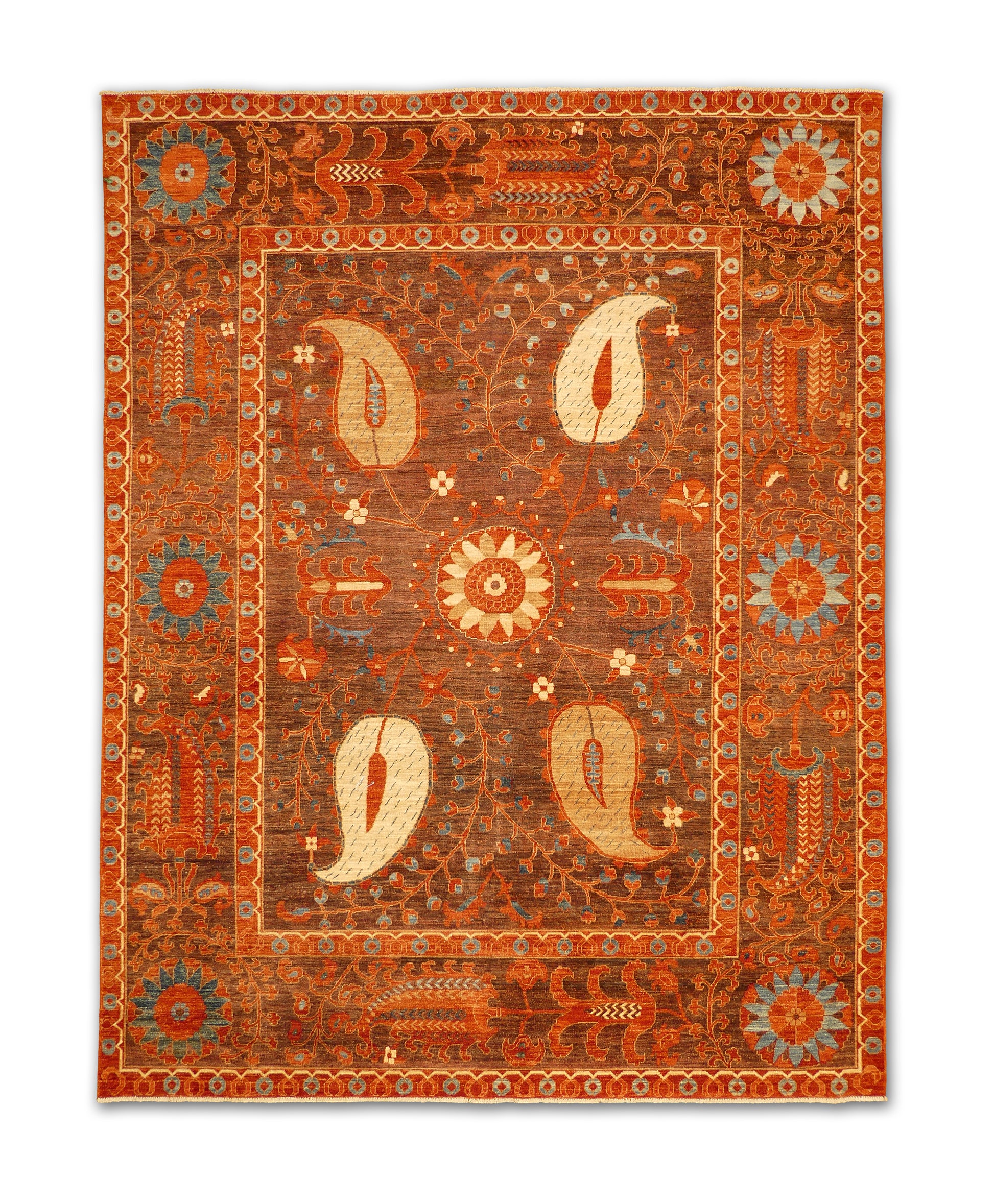 This handmade rug features a bold and artistic interpretation of the classic paisley motif, set against a rich chestnut brown field. Large ivory and terracotta boteh forms are interwoven with stylized vines and floral medallions in soft blue and gold, giving the piece a luxurious yet organic feel. The warm earth tones and fluid composition make it perfect for cozy, elegant interiors.