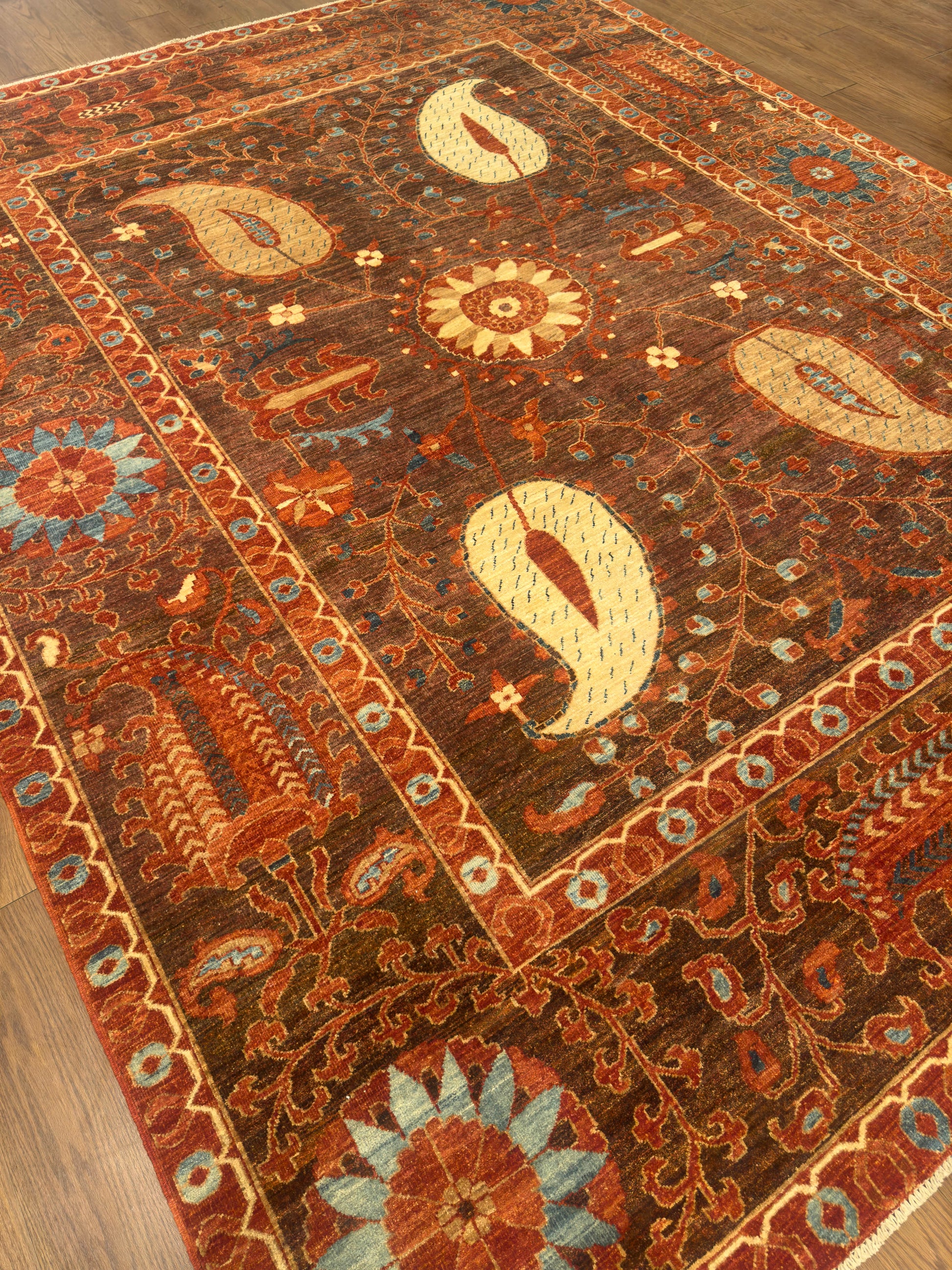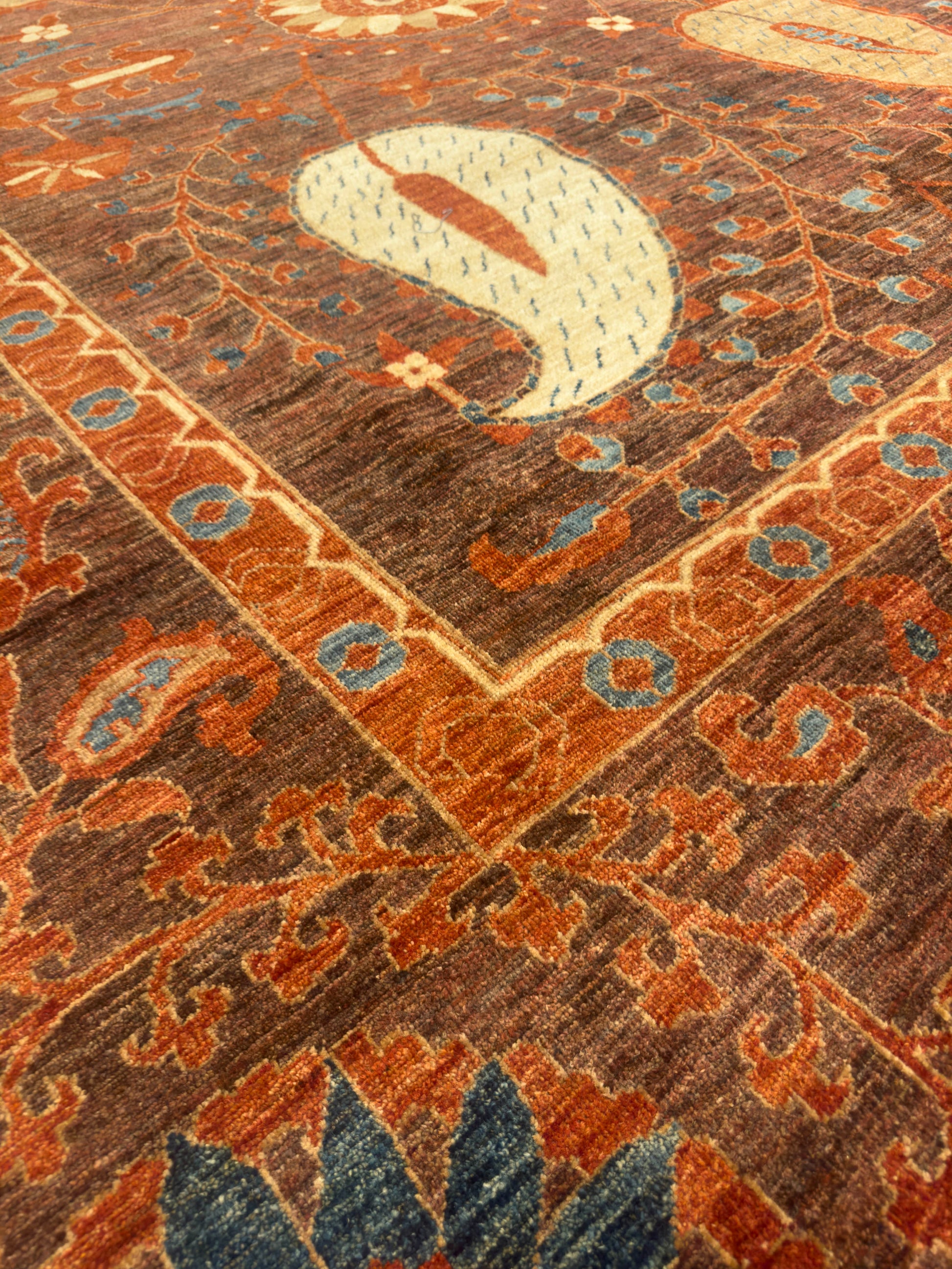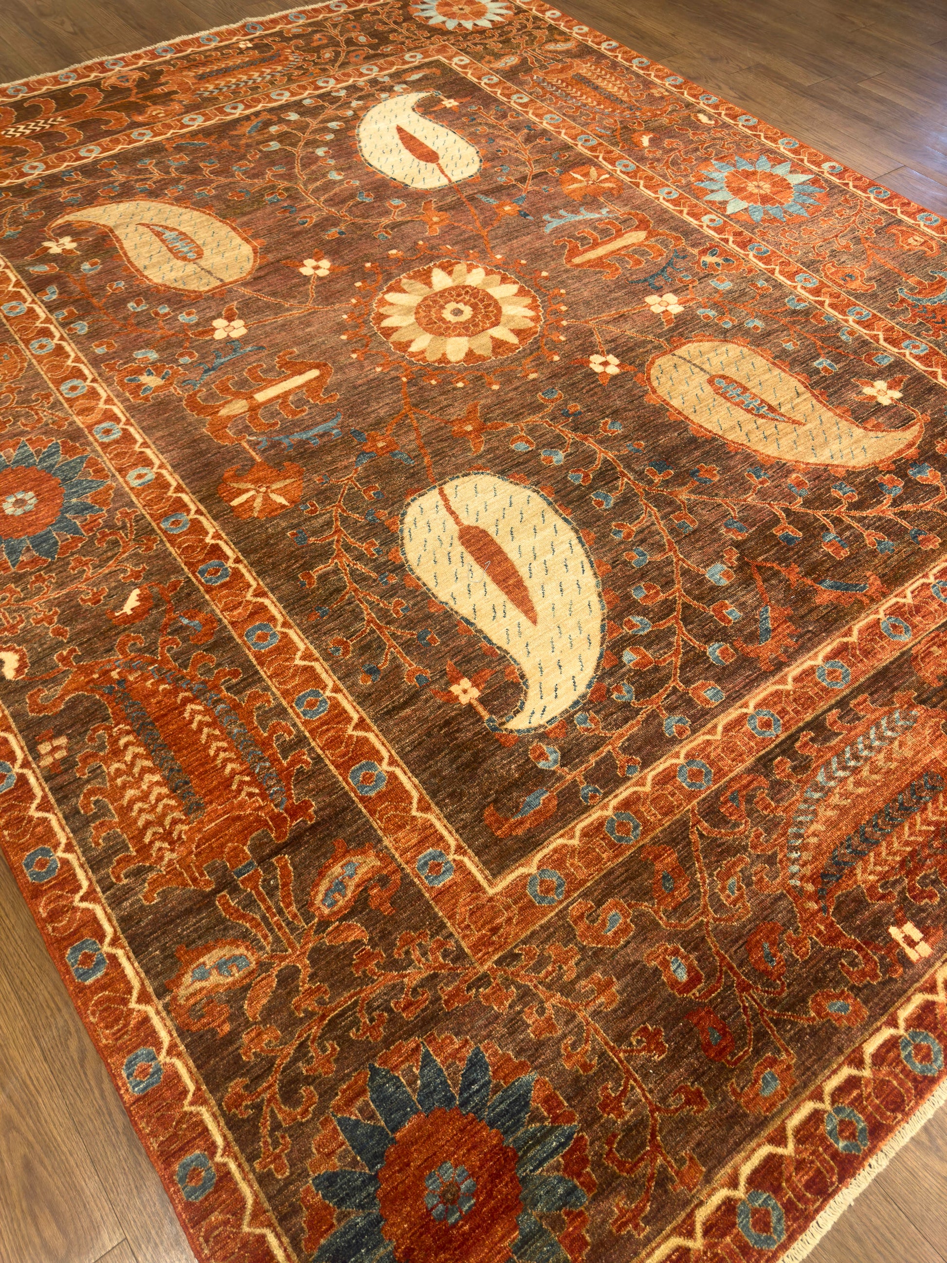 This handmade rug features a bold and artistic interpretation of the classic paisley motif, set against a rich chestnut brown field. Large ivory and terracotta boteh forms are interwoven with stylized vines and floral medallions in soft blue and gold, giving the piece a luxurious yet organic feel. The warm earth tones and fluid composition make it perfect for cozy, elegant interiors.