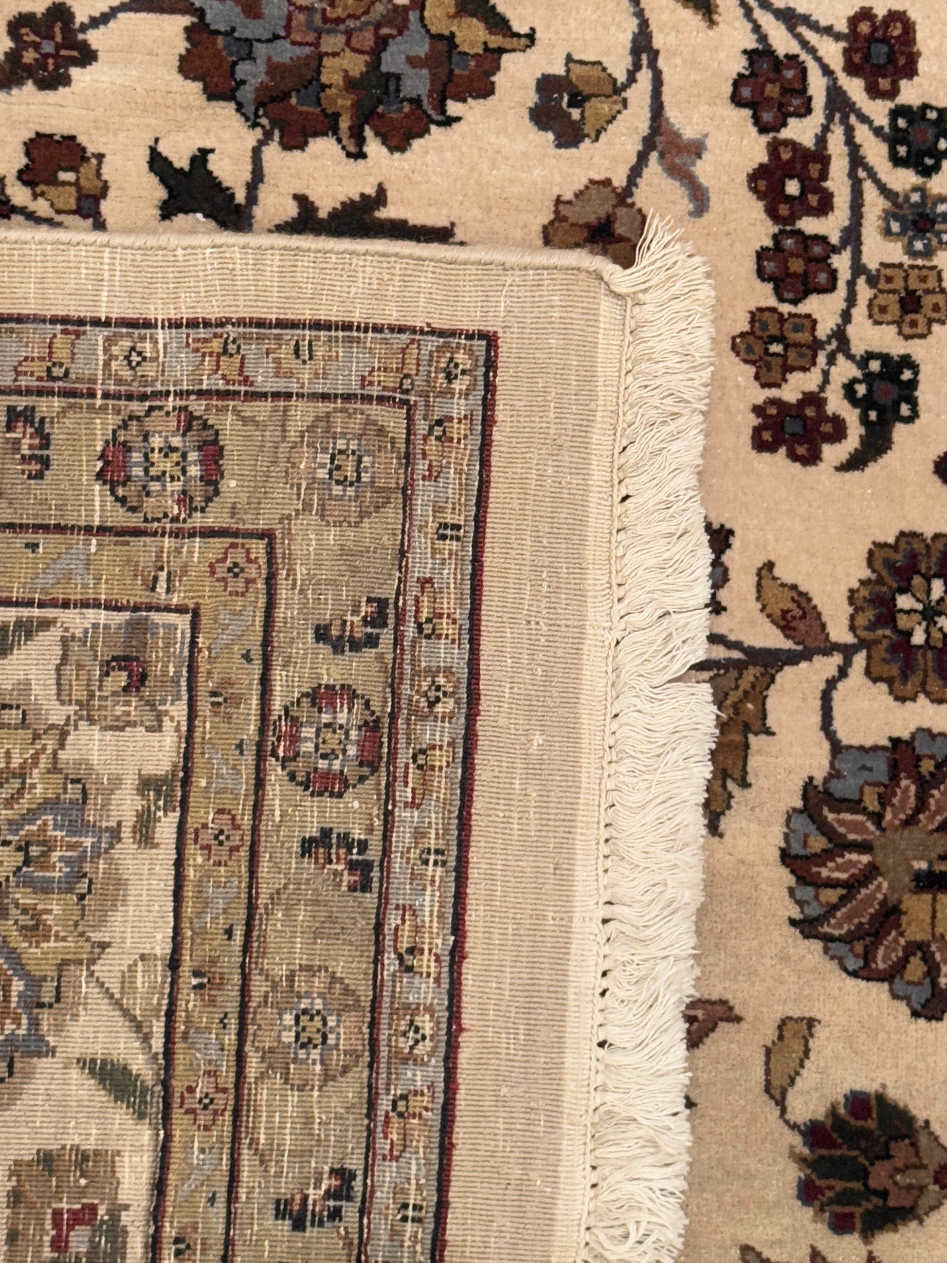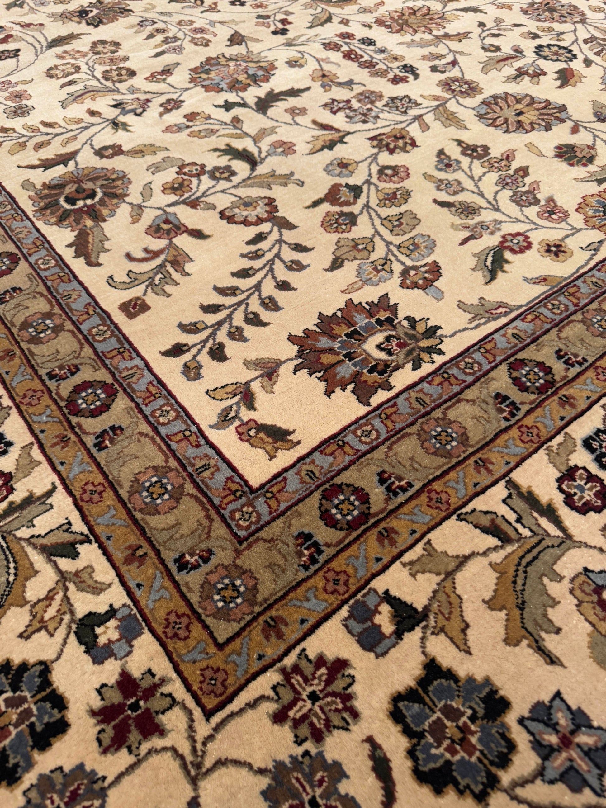 This handmade rug features an elegant allover botanical pattern woven in a graceful, symmetrical layout. The soft ivory field is adorned with intricate vines and blooming floral motifs in shades of mocha, navy, and light blue, creating a refined and timeless appearance. Its balanced palette and meticulous craftsmanship make it a perfect centerpiece for spaces that value understated luxury and harmony.