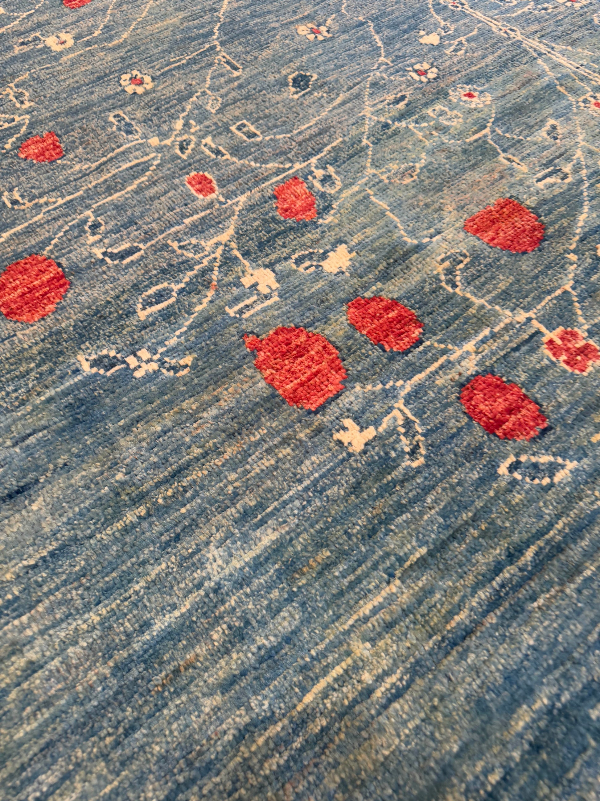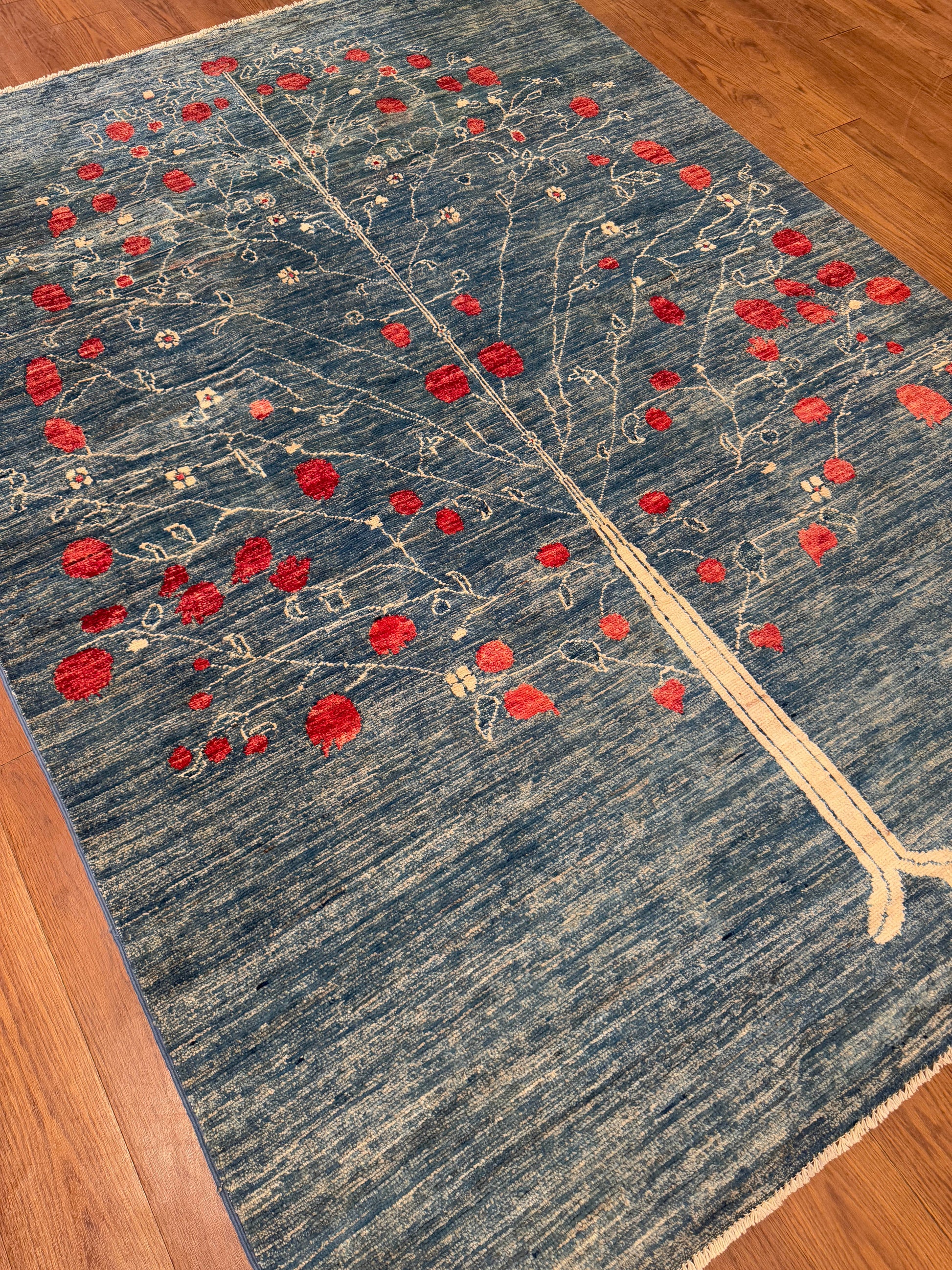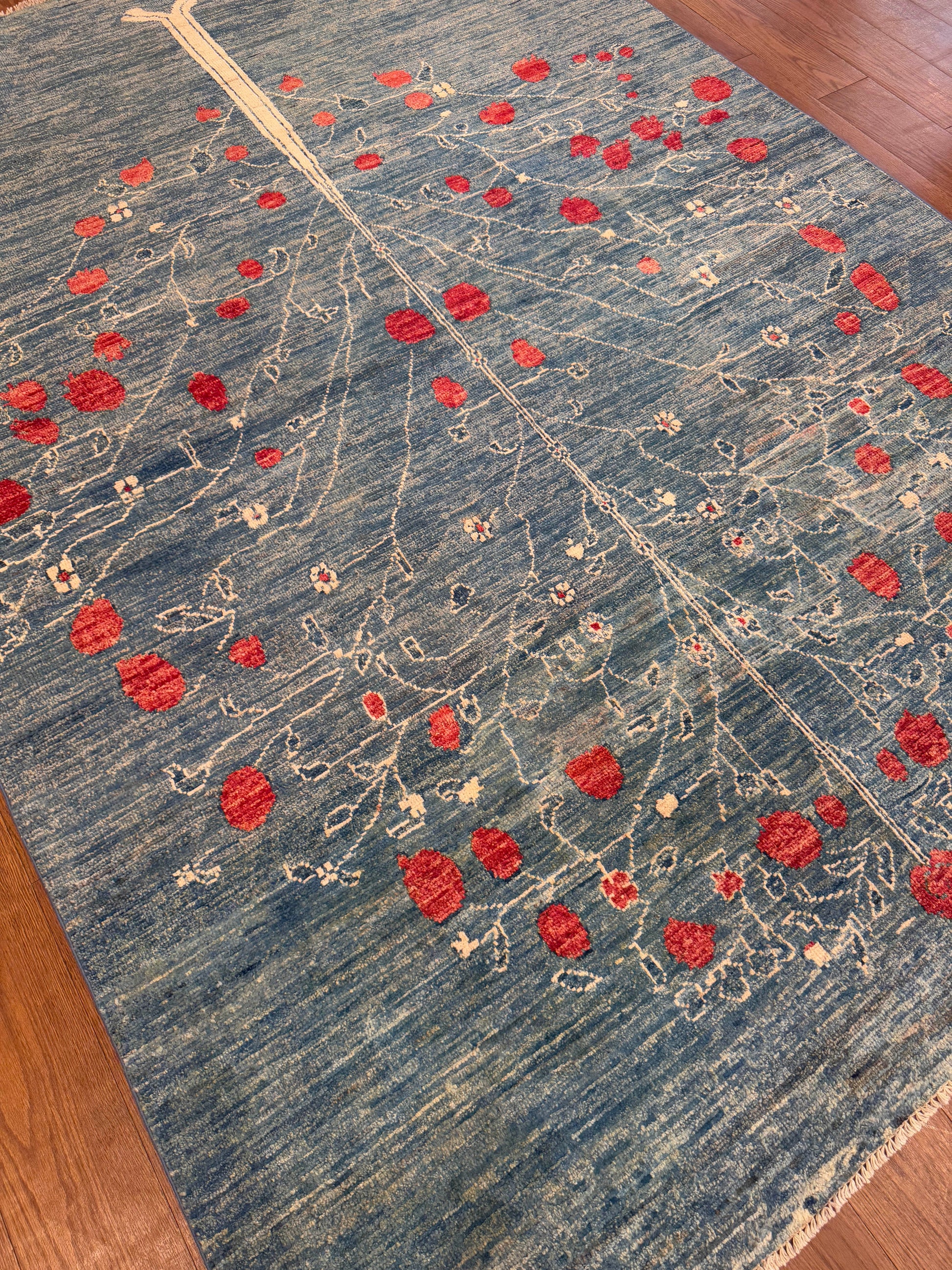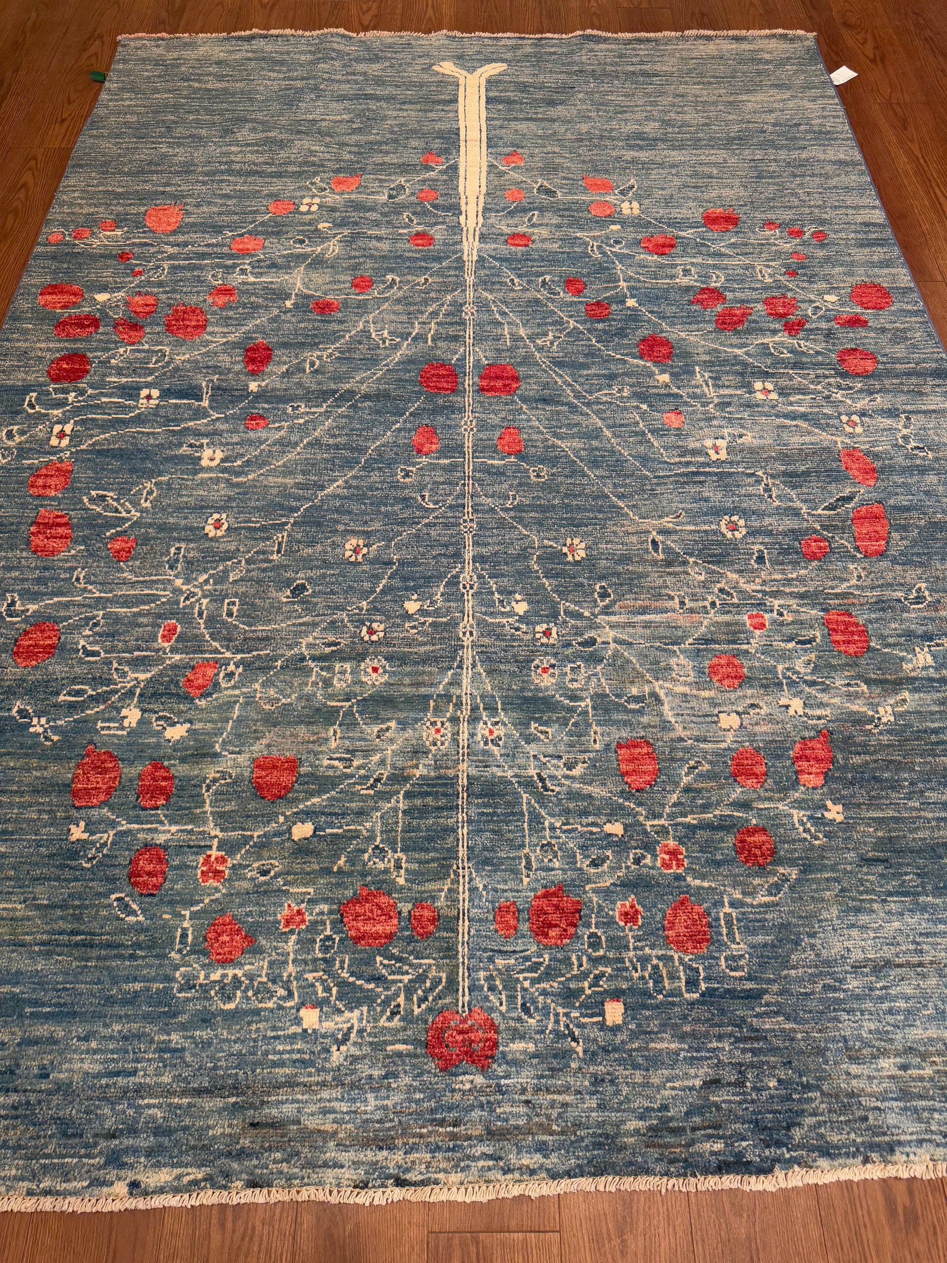 This enchanting handwoven wool rug features a serene blue field adorned with delicate ivory vines and bold red pomegranate motifs, symbolizing abundance and prosperity. The symmetrical tree-like design creates a sense of balance and harmony, making it both a statement piece and a timeless work of art. Its rich colors and meaningful pattern bring warmth and elegance to any interior.