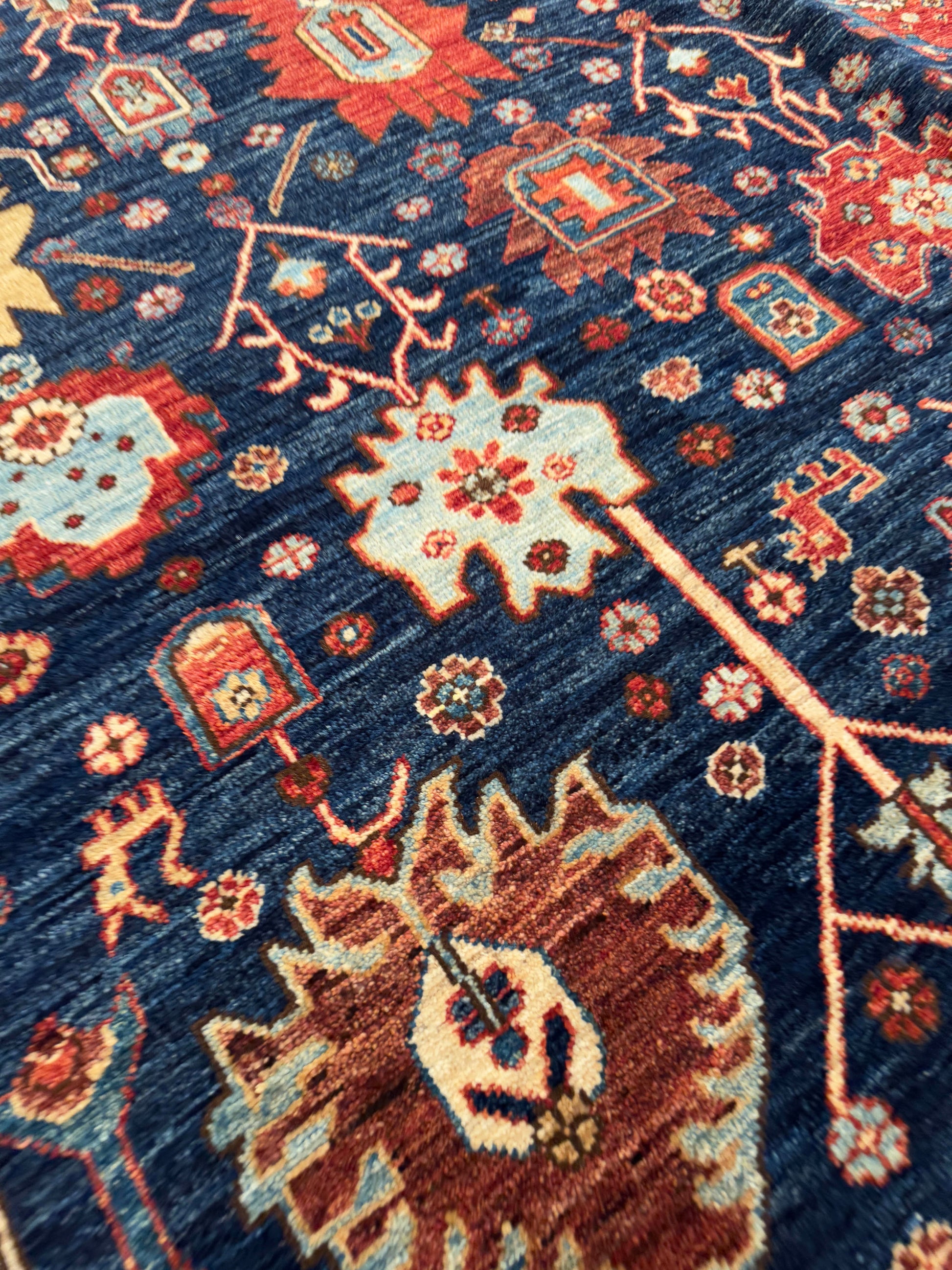 This vibrant hand-knotted rug features an allover pattern of stylized floral and tribal motifs set against a deep navy field. Accented with bold shades of red, gold, teal, ivory, and rust, the design creates a striking contrast that adds warmth and character. Its intricate detailing and balanced composition make it a versatile piece that complements both traditional and eclectic interiors.