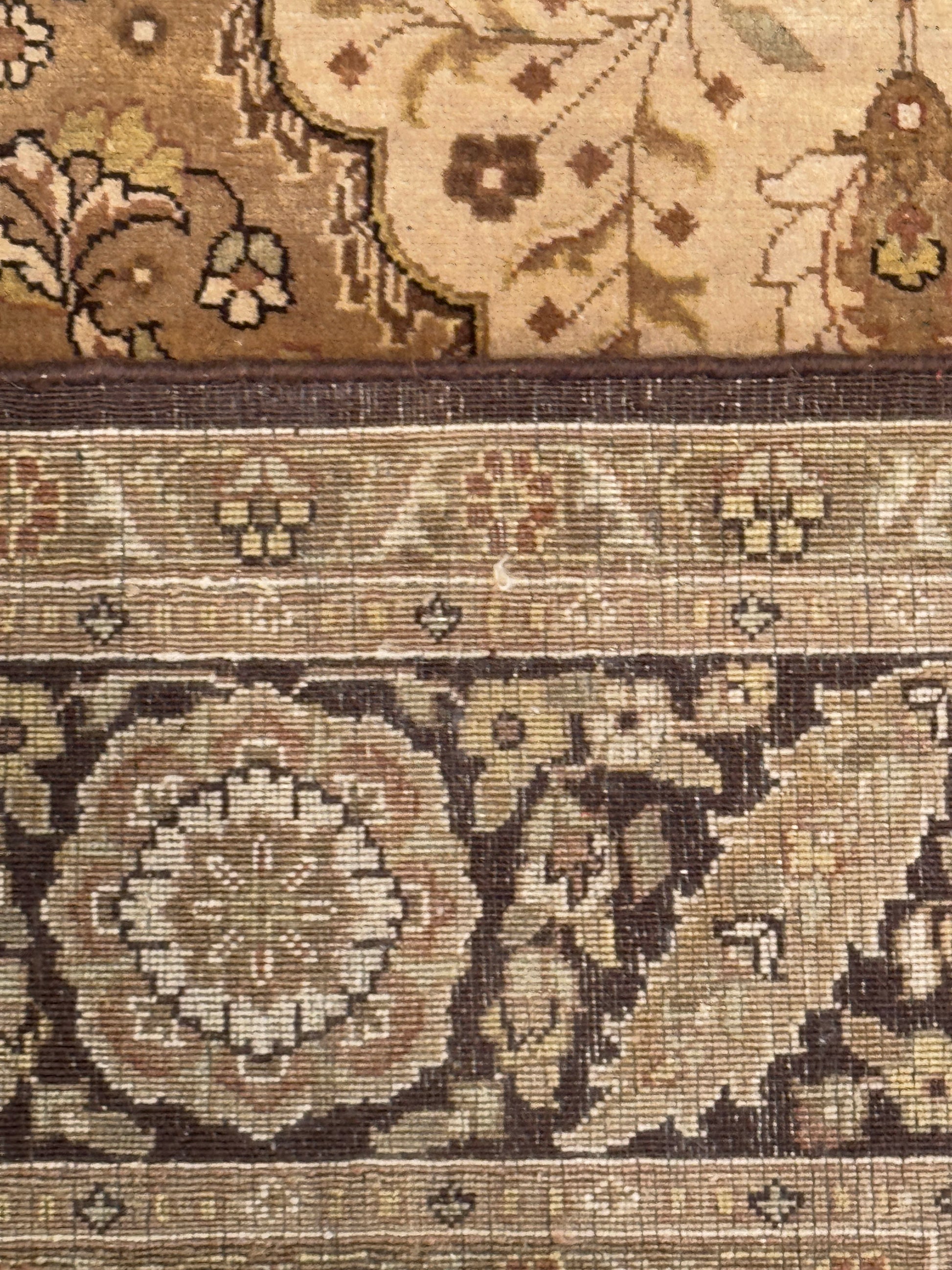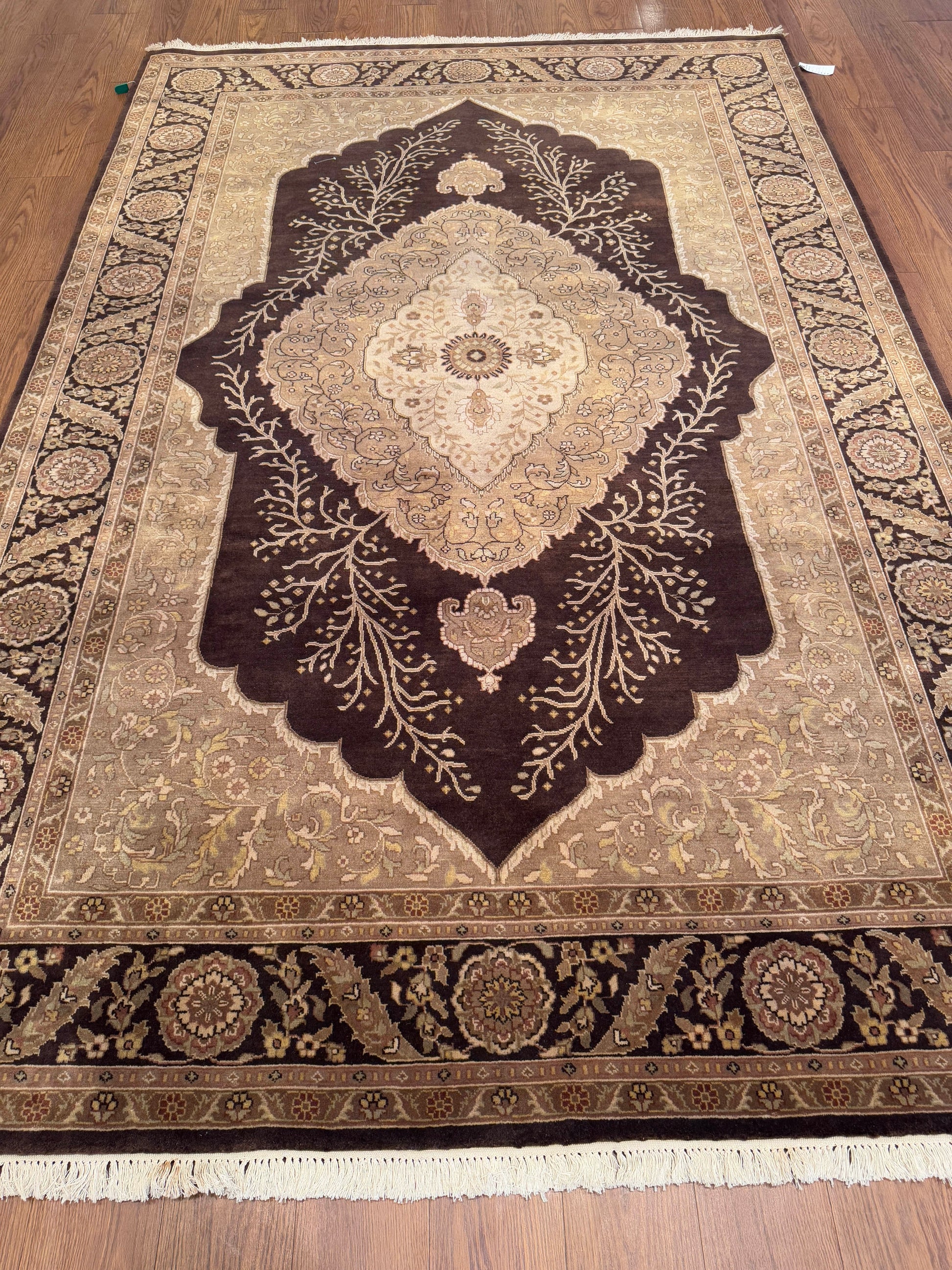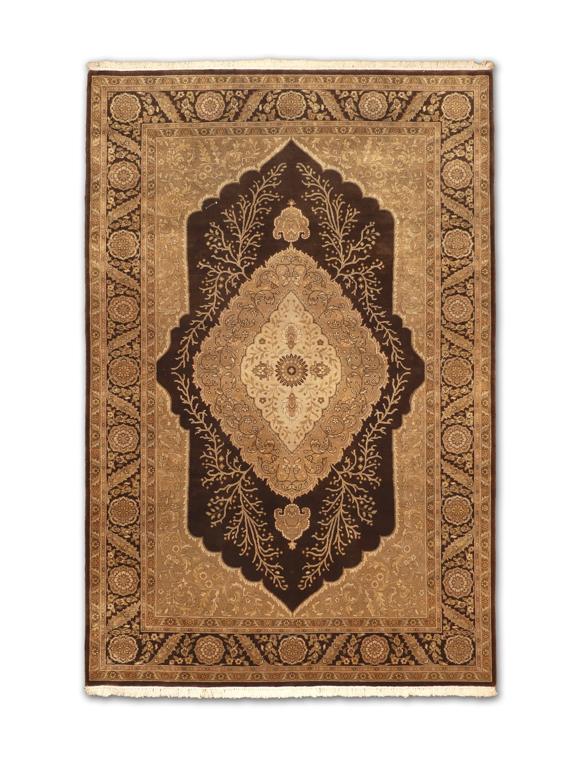 This sophisticated hand-knotted rug highlights a striking large-scale medallion set against a rich chocolate-brown field, framed by delicate vine and floral motifs. The warm beige and taupe tones in the border create a soft balance, enhancing the depth and elegance of the central design. Its refined detailing and harmonious palette make it a statement piece with timeless appeal.