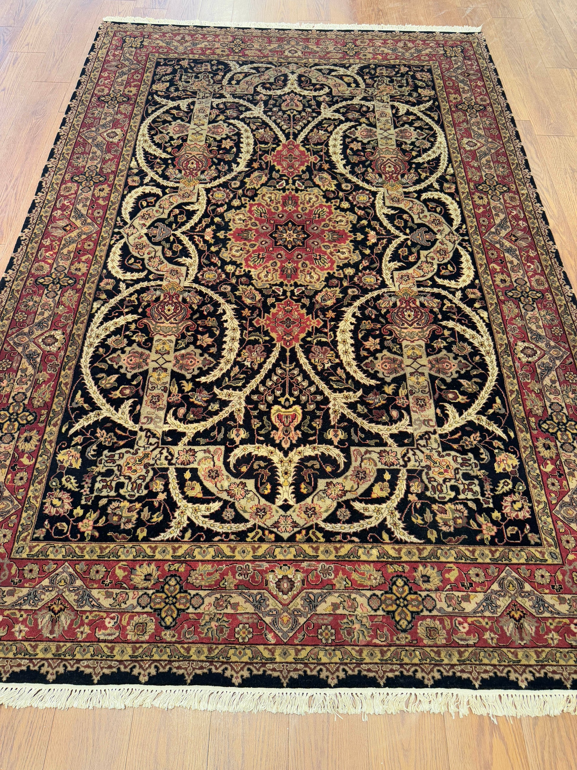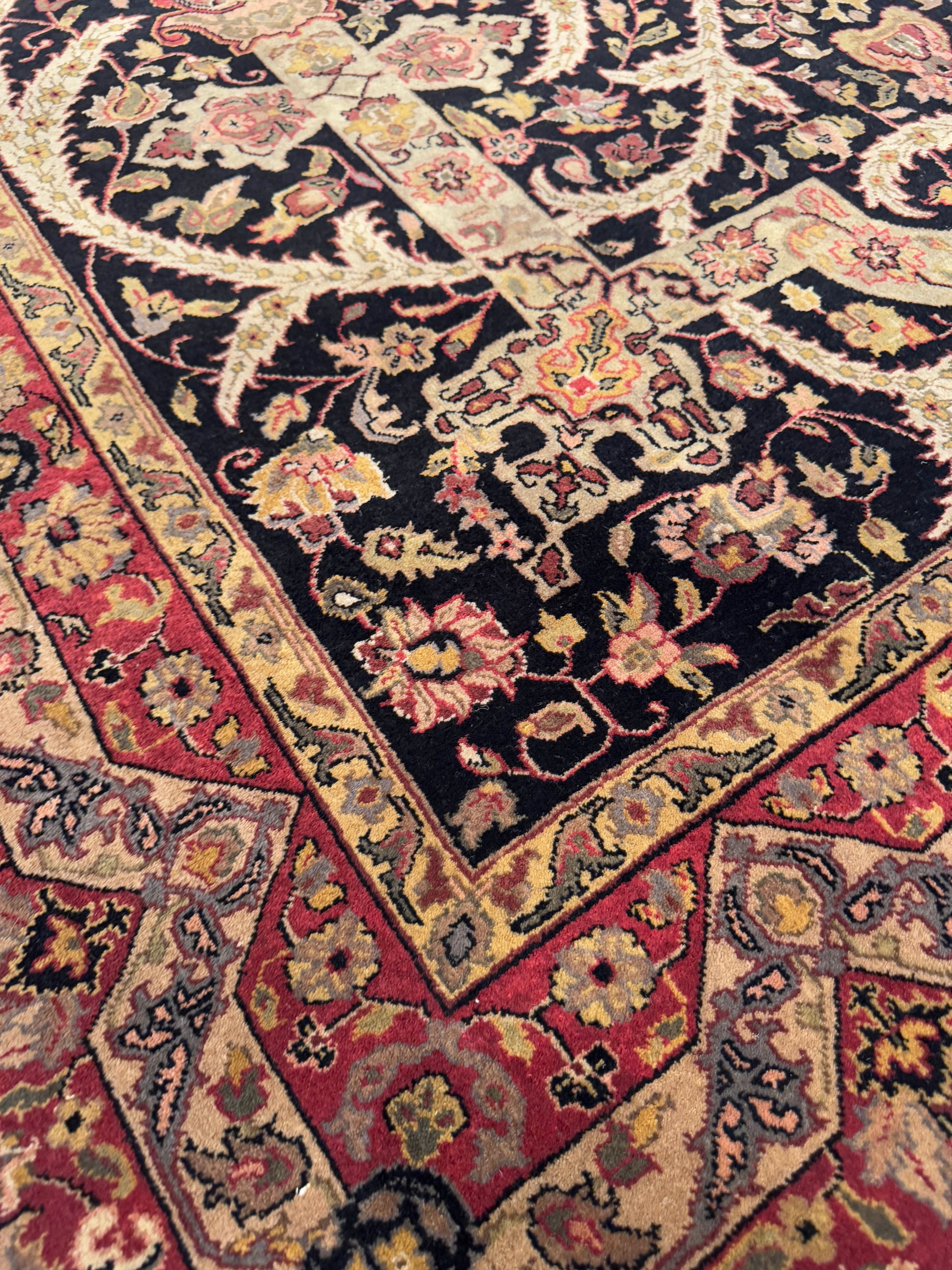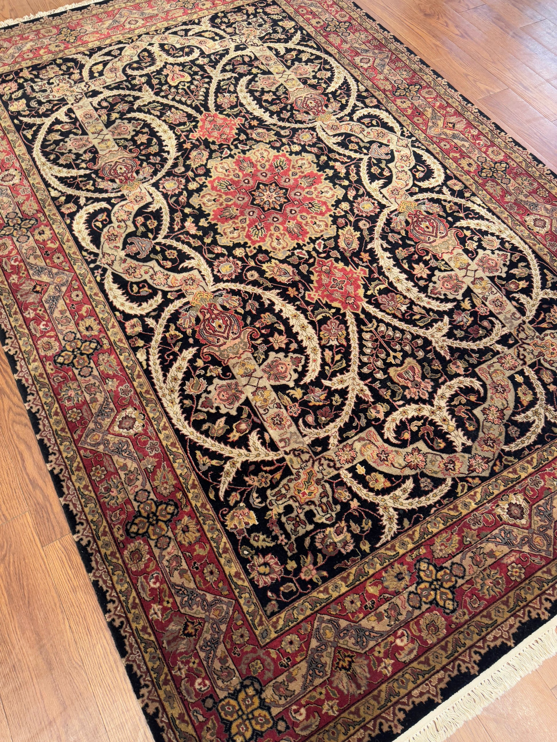 This elegant hand-knotted rug showcases a dramatic black field adorned with scrolling vine motifs, floral rosettes, and an intricate central medallion. The deep red and gold accents add richness, while the detailed border frames the design with a sense of harmony and refinement. Its balance of bold contrast and graceful ornamentation makes it a luxurious addition to any space.