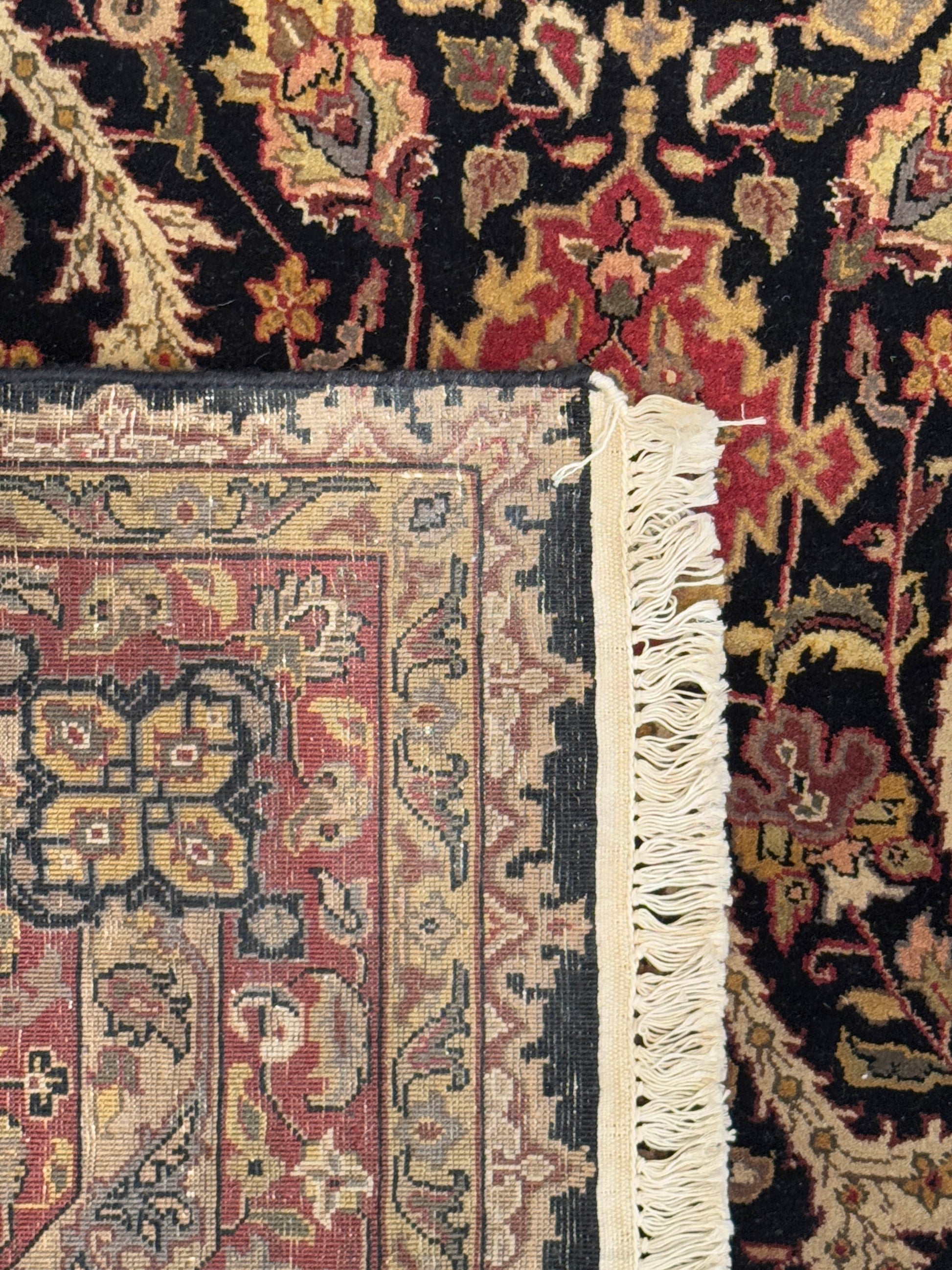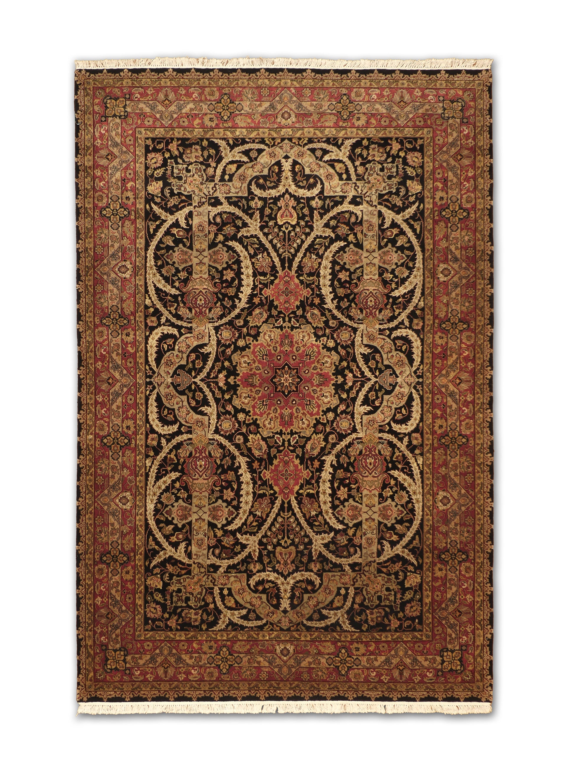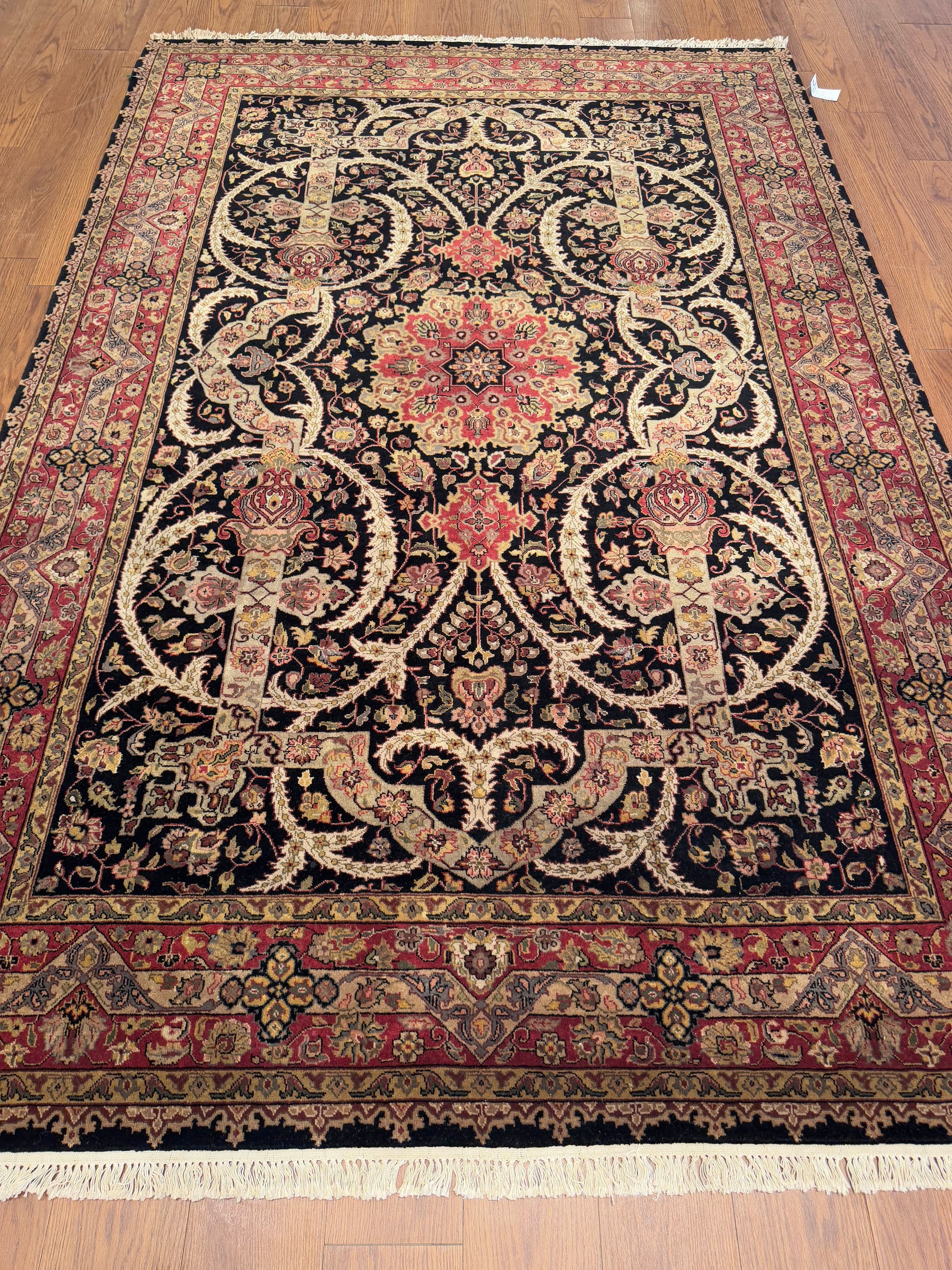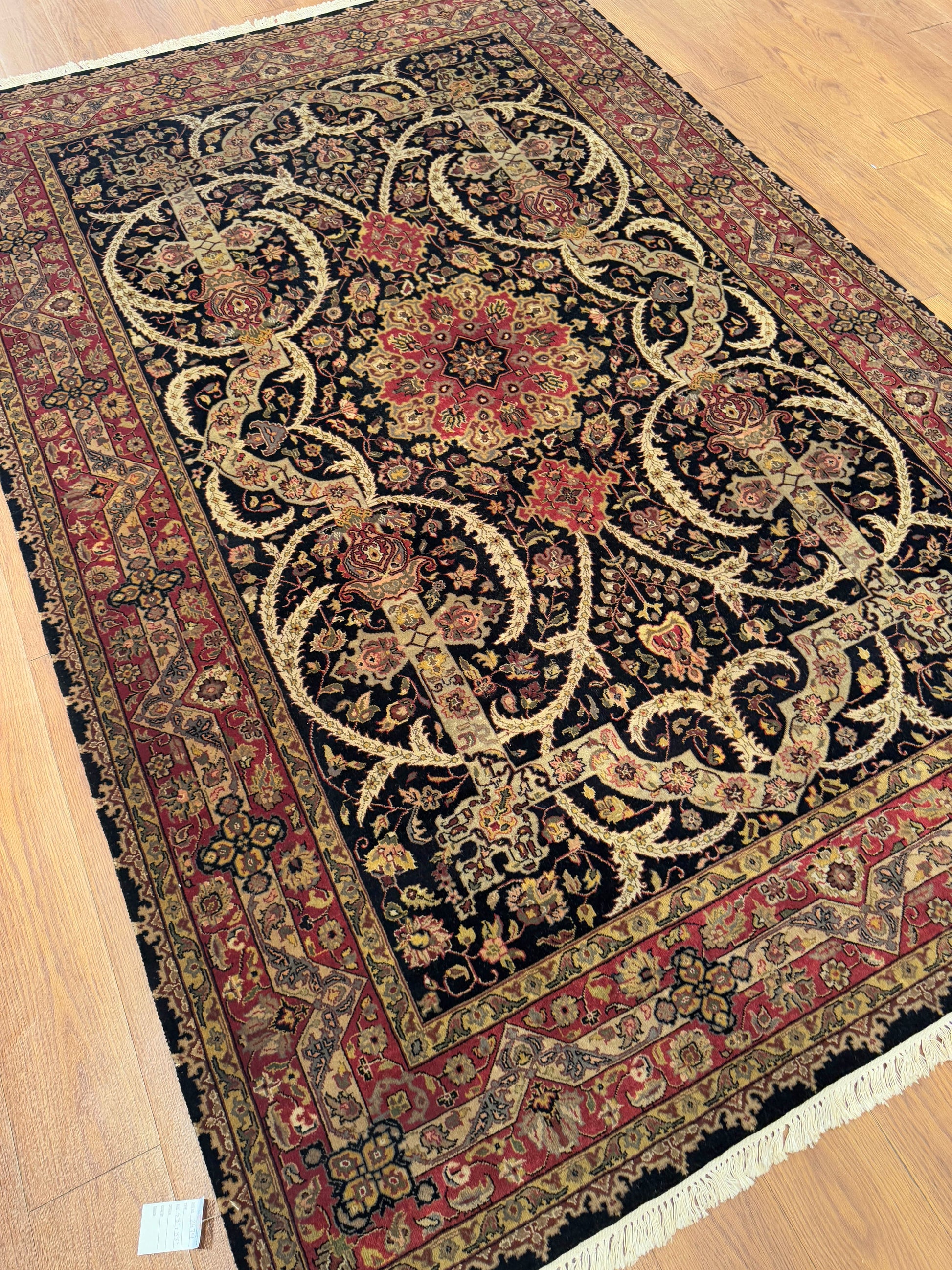 This elegant hand-knotted rug showcases a dramatic black field adorned with scrolling vine motifs, floral rosettes, and an intricate central medallion. The deep red and gold accents add richness, while the detailed border frames the design with a sense of harmony and refinement. Its balance of bold contrast and graceful ornamentation makes it a luxurious addition to any space.