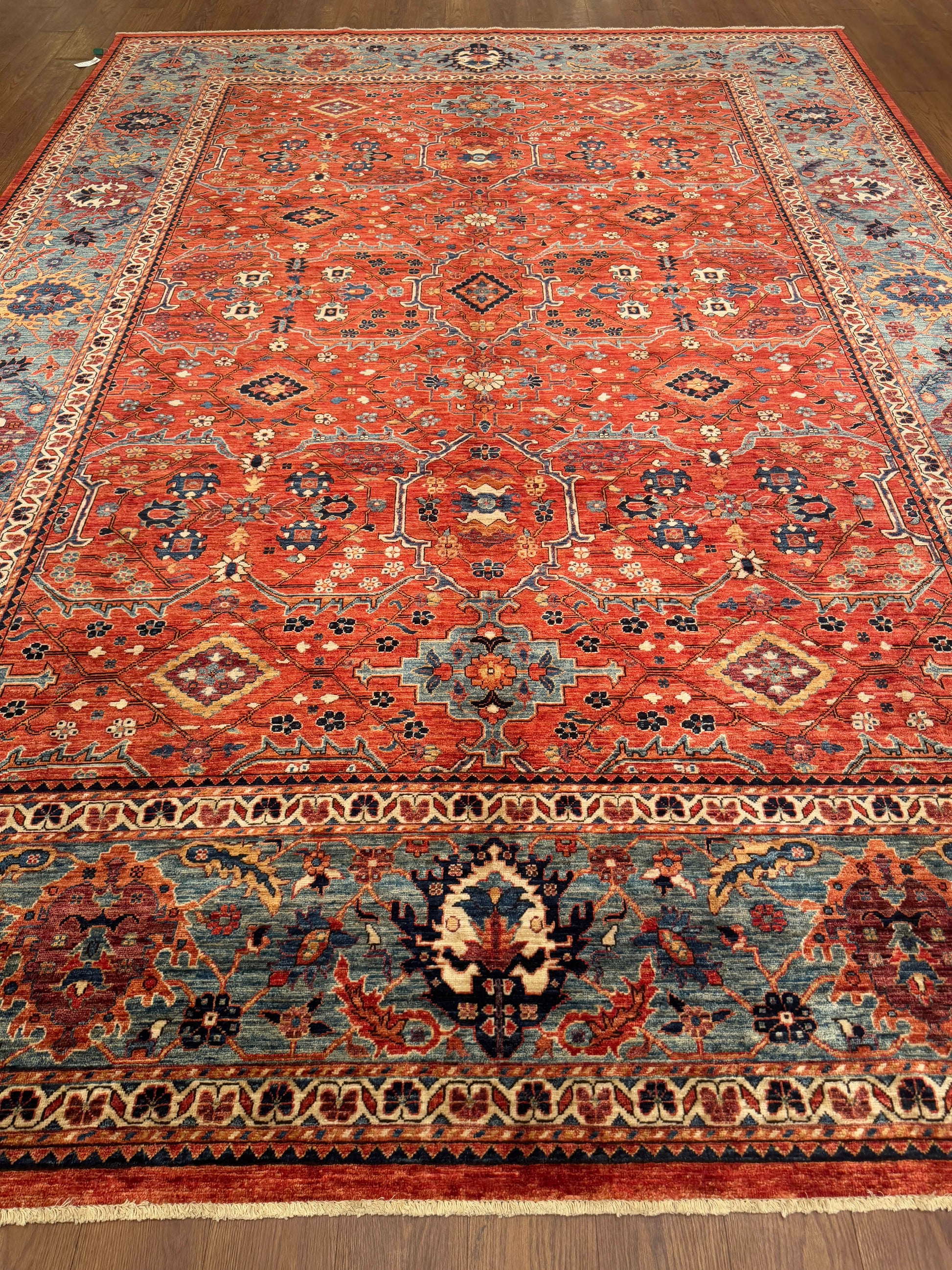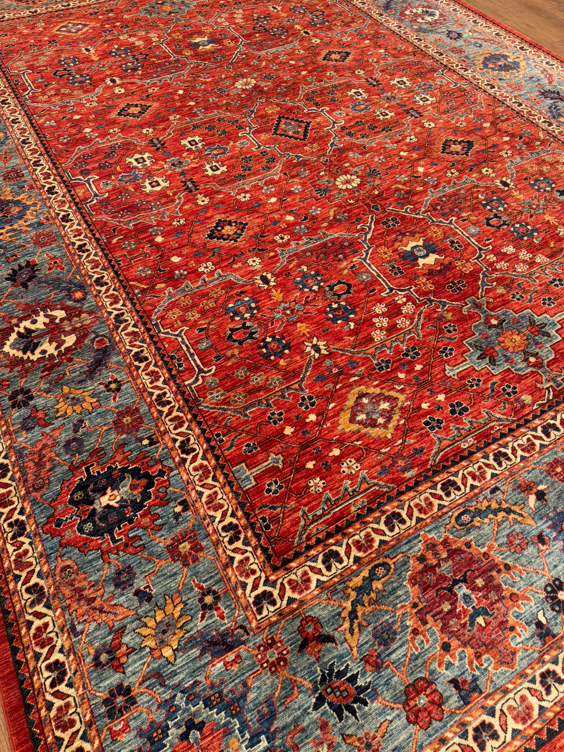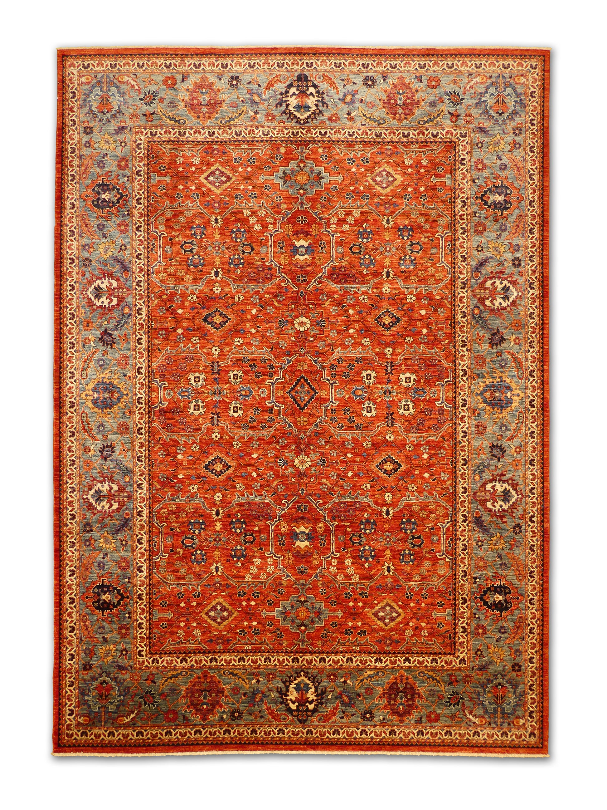 This exquisite handwoven piece radiates warmth and grandeur through its rich terracotta field, adorned with an intricate arrangement of floral and geometric motifs. Accents of navy, ivory, and soft blue bring balance and depth, while the finely detailed border adds a regal frame. Its elegant palette and timeless craftsmanship make it a striking centerpiece for refined interiors.