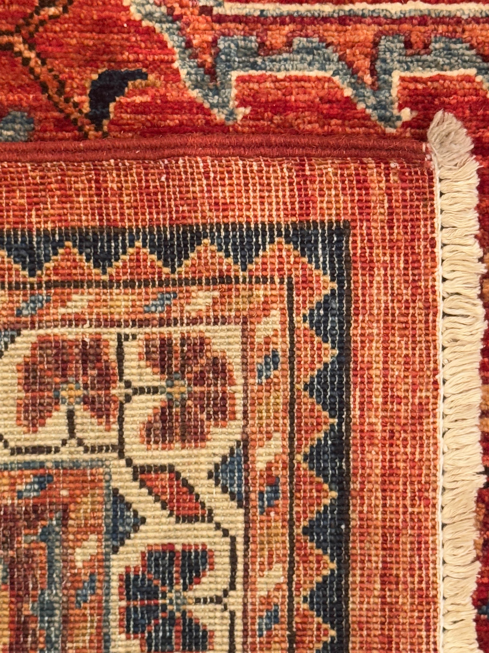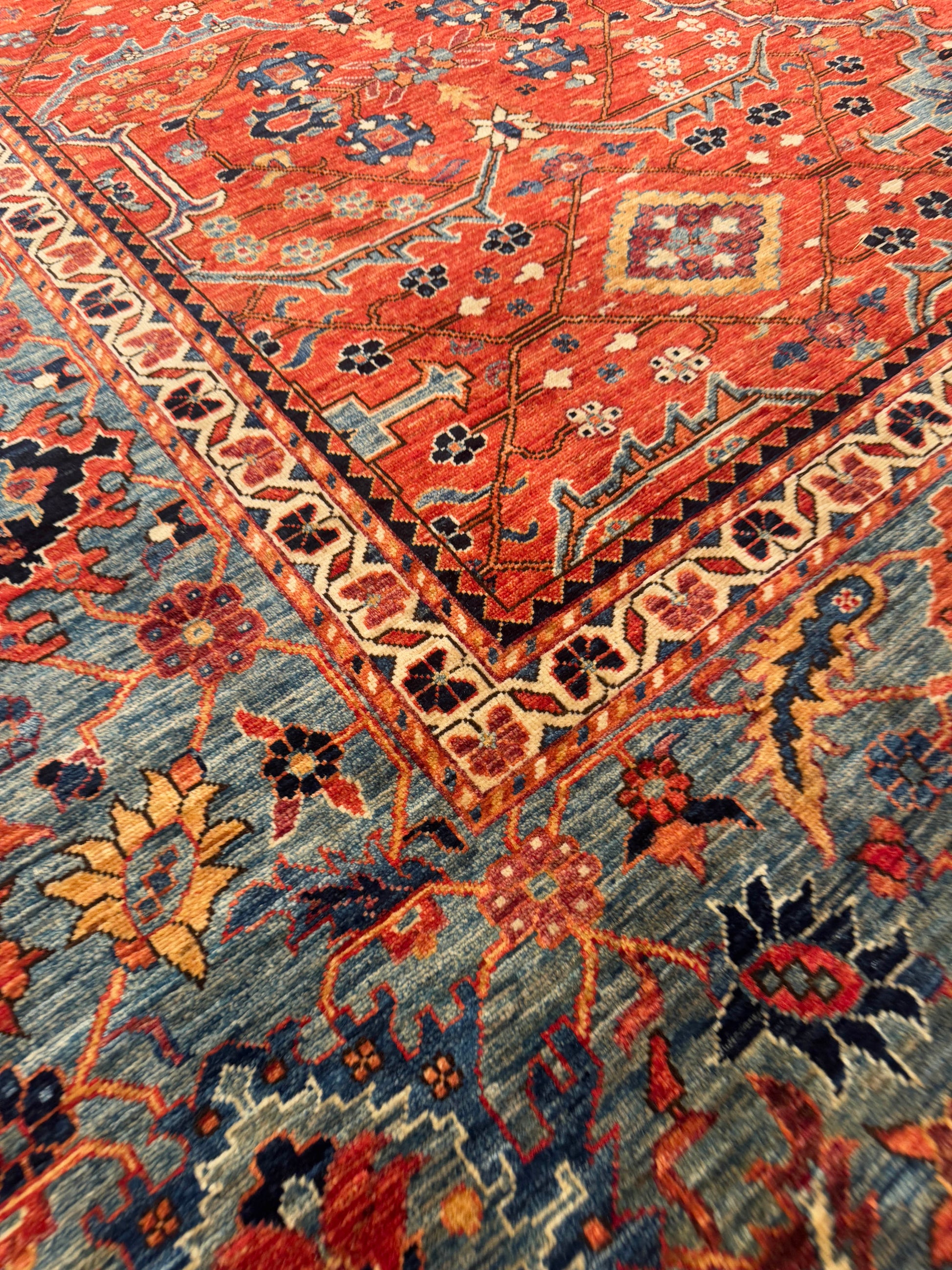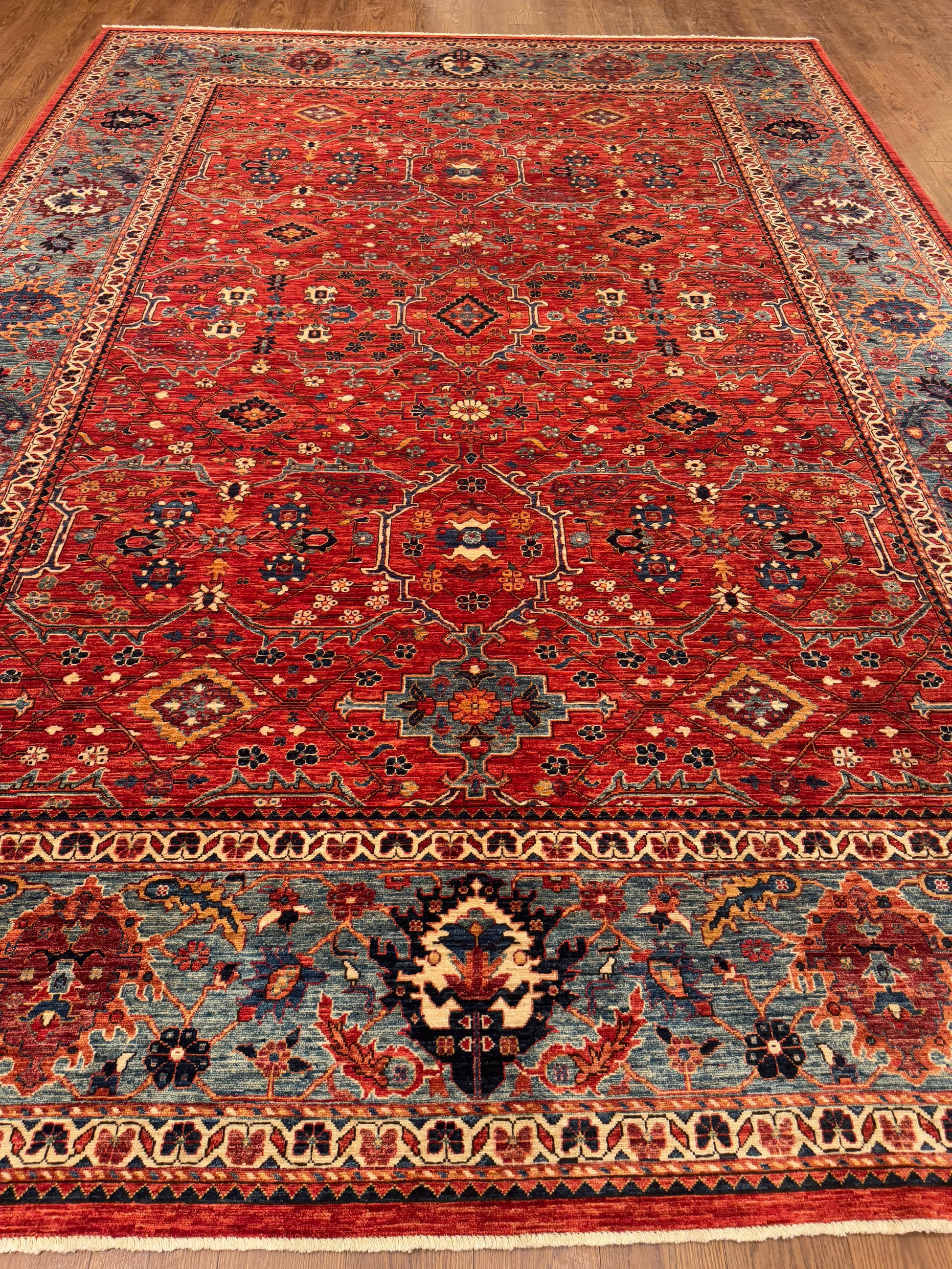 This exquisite handwoven piece radiates warmth and grandeur through its rich terracotta field, adorned with an intricate arrangement of floral and geometric motifs. Accents of navy, ivory, and soft blue bring balance and depth, while the finely detailed border adds a regal frame. Its elegant palette and timeless craftsmanship make it a striking centerpiece for refined interiors.