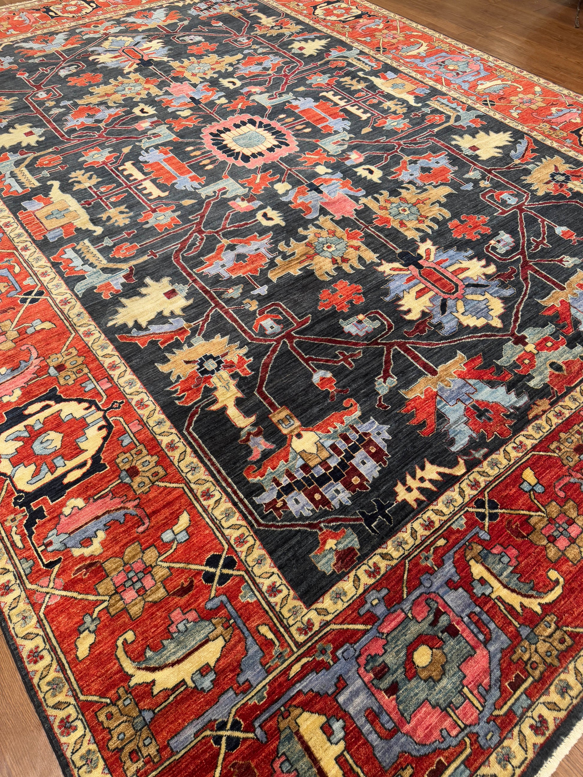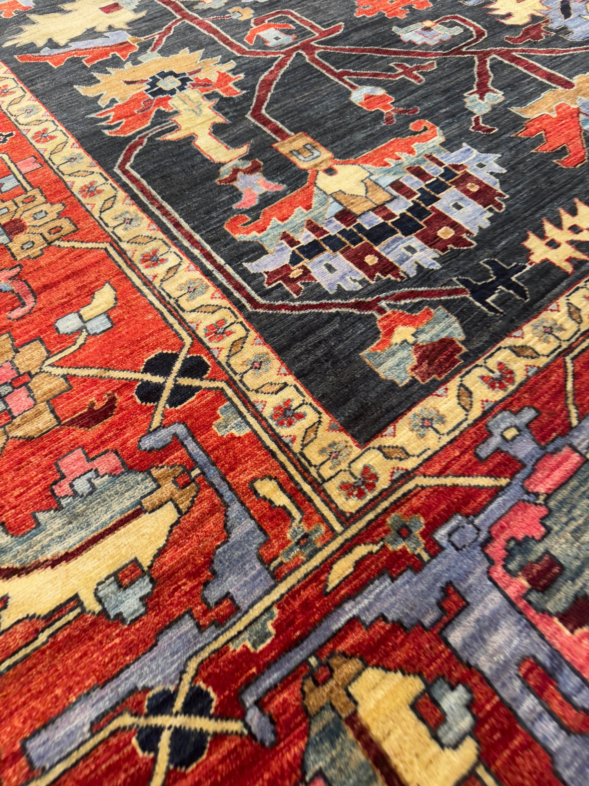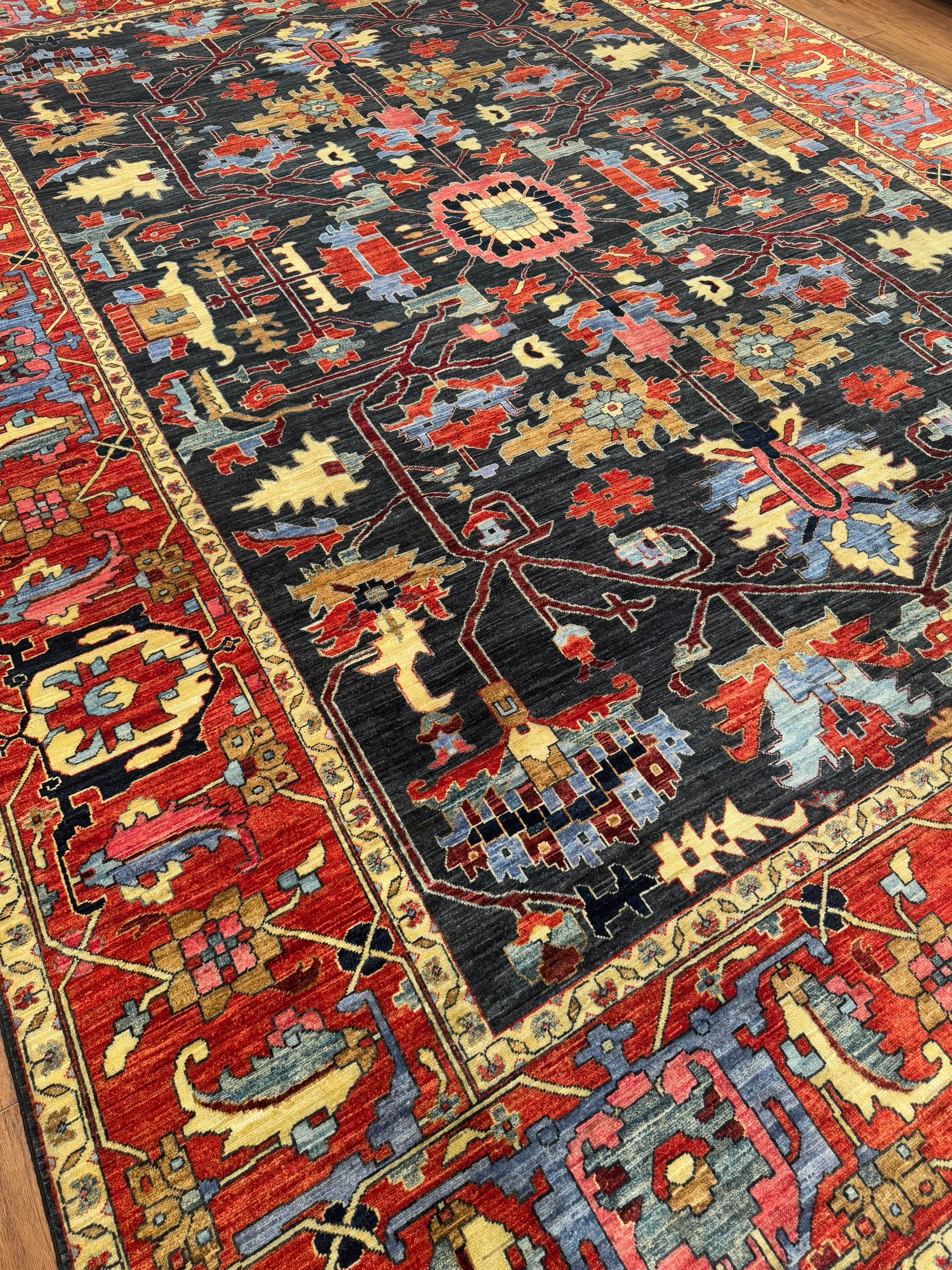 This magnificent handwoven piece showcases a dramatic interplay of colors, featuring a deep charcoal field beautifully contrasted with bold red, gold, and ivory motifs. The oversized floral and geometric medallions are symmetrically arranged, creating an impression of grandeur and movement. Its richly detailed border in vibrant red completes the composition with striking elegance, making it ideal for statement interiors.