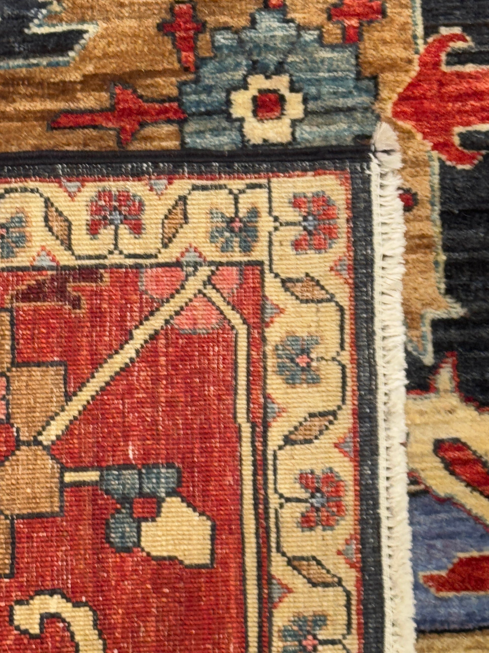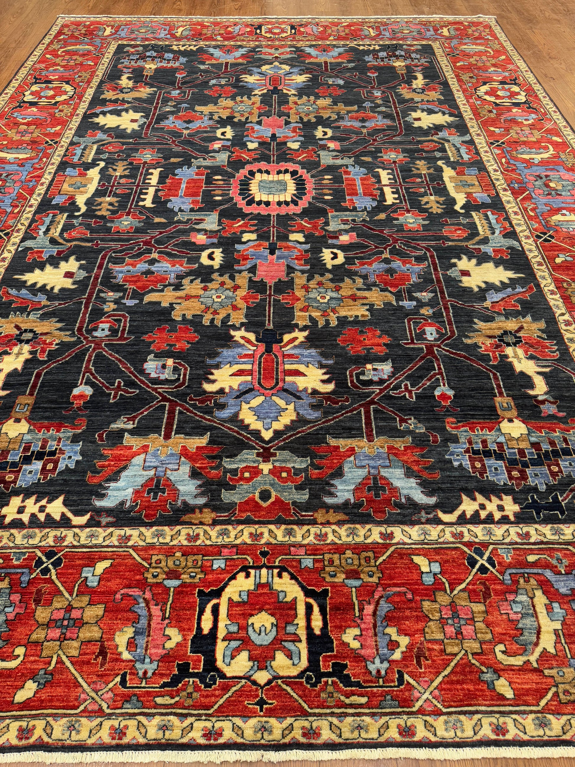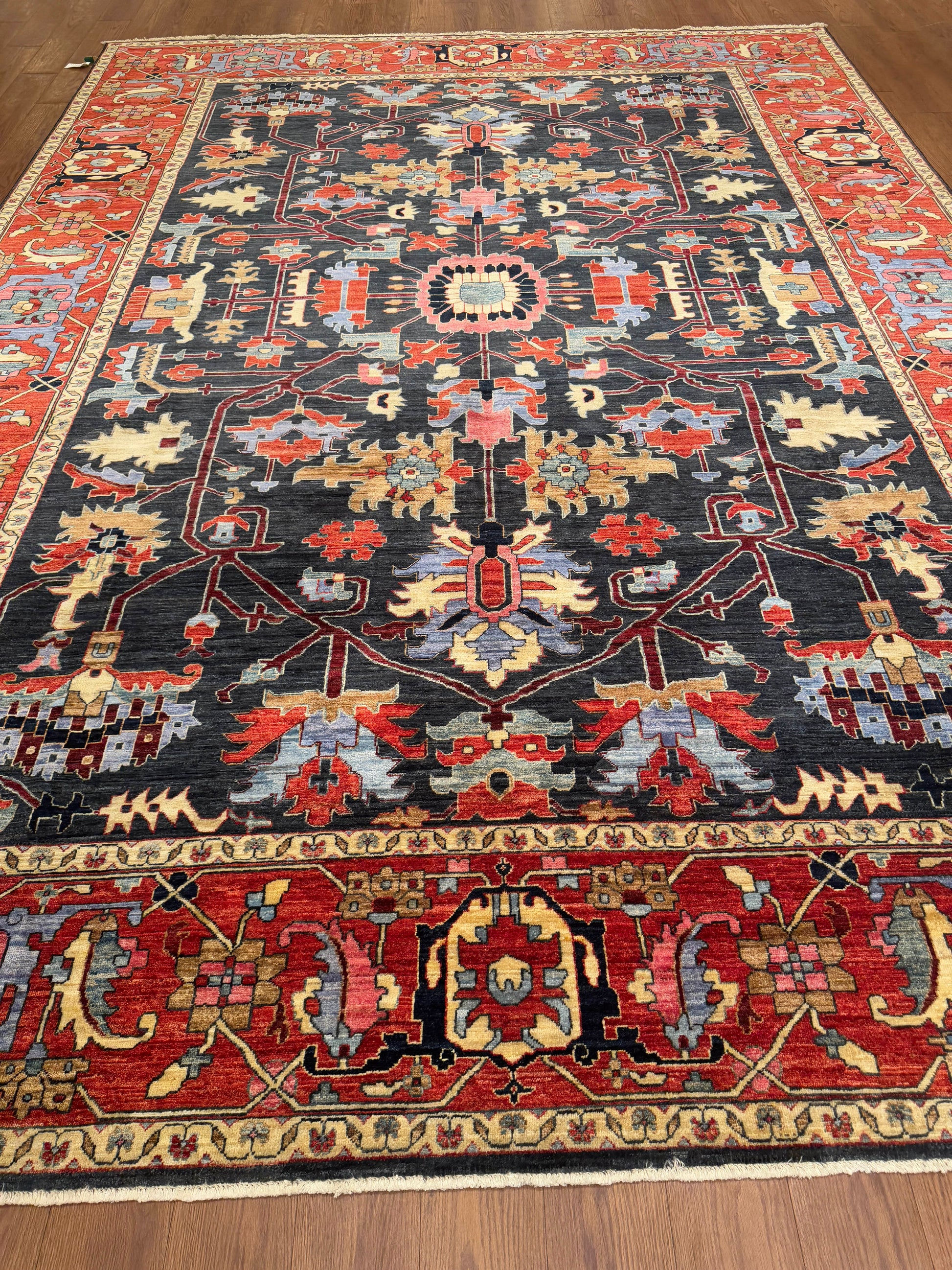 This magnificent handwoven piece showcases a dramatic interplay of colors, featuring a deep charcoal field beautifully contrasted with bold red, gold, and ivory motifs. The oversized floral and geometric medallions are symmetrically arranged, creating an impression of grandeur and movement. Its richly detailed border in vibrant red completes the composition with striking elegance, making it ideal for statement interiors.